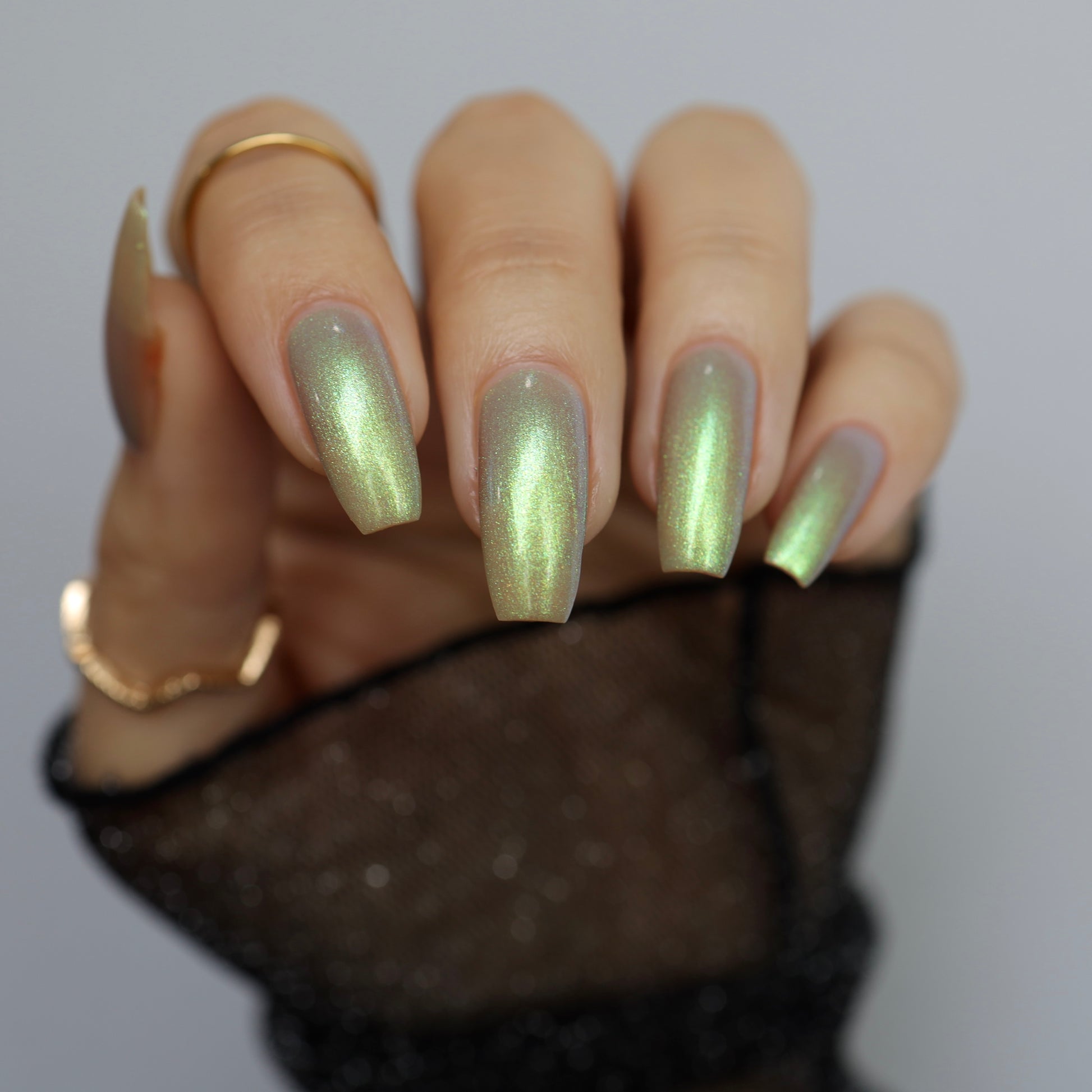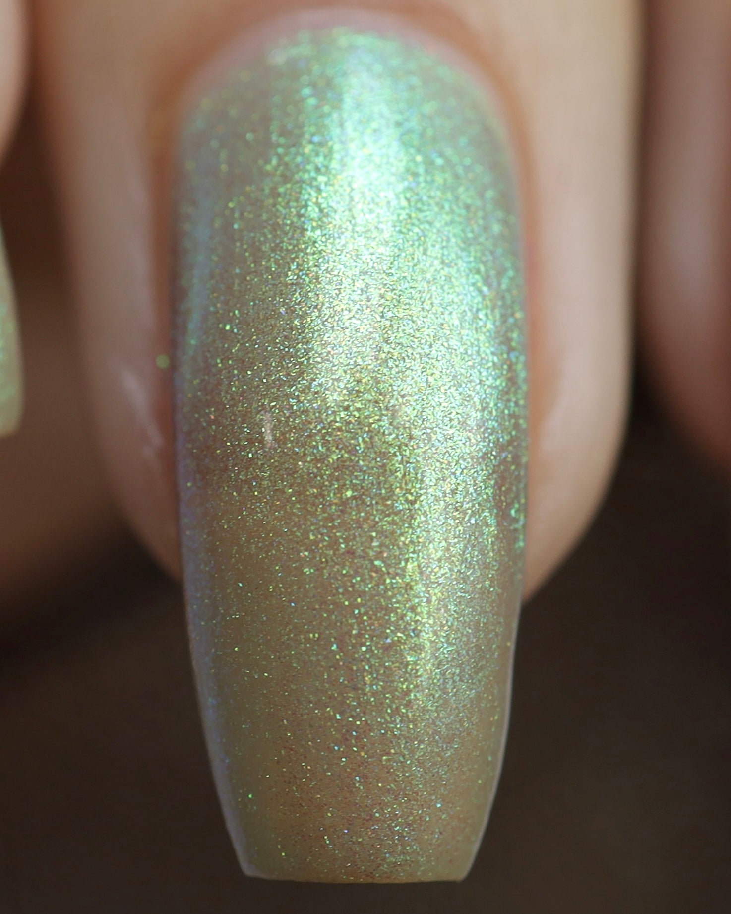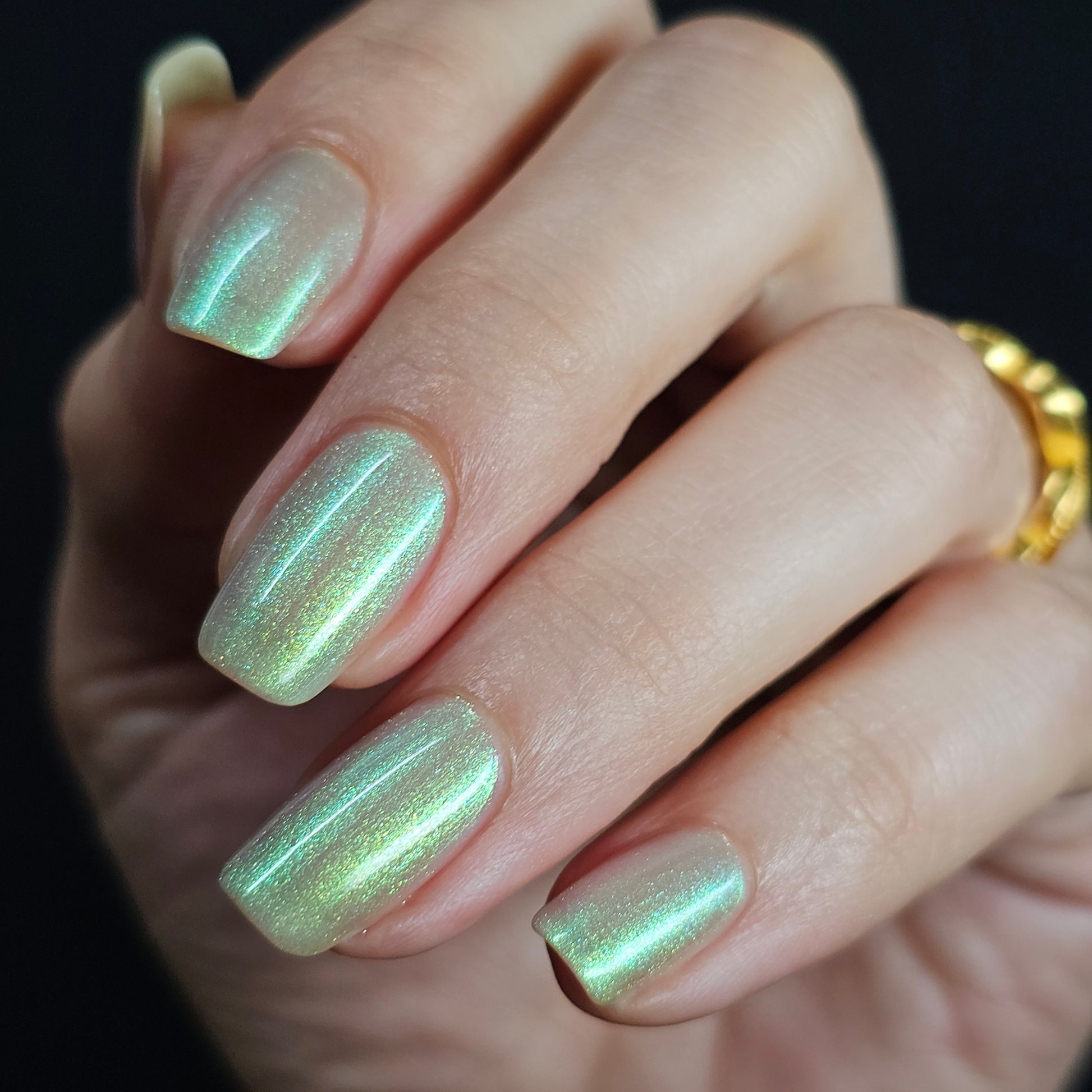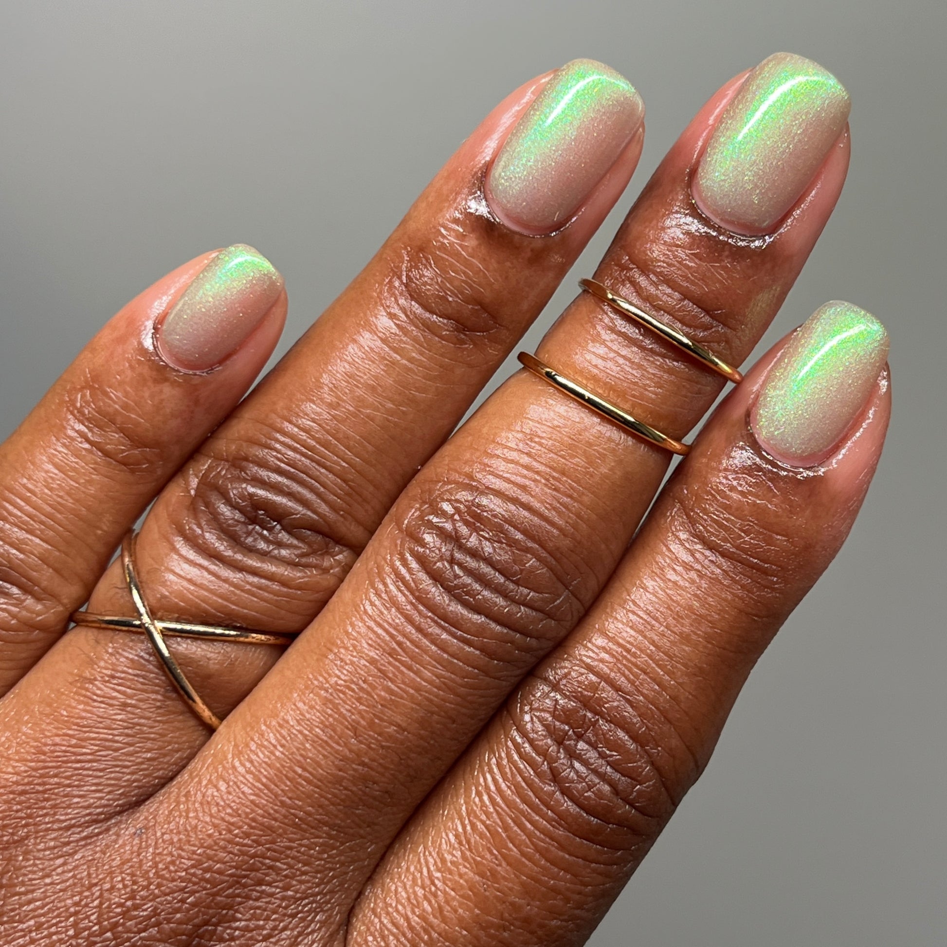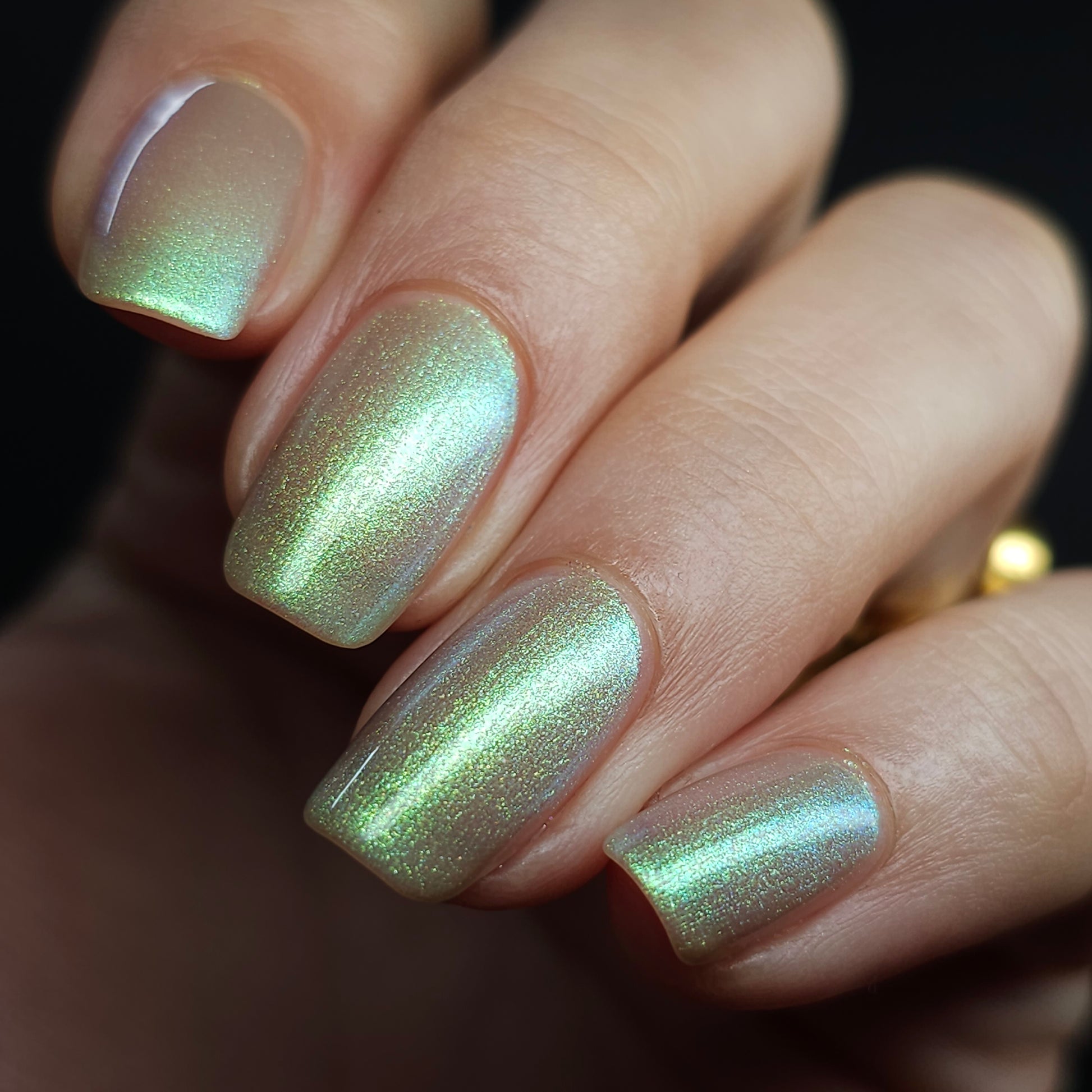 A semi-sheer taupe base with warm-toned green aurora shimmer that shifts to blue