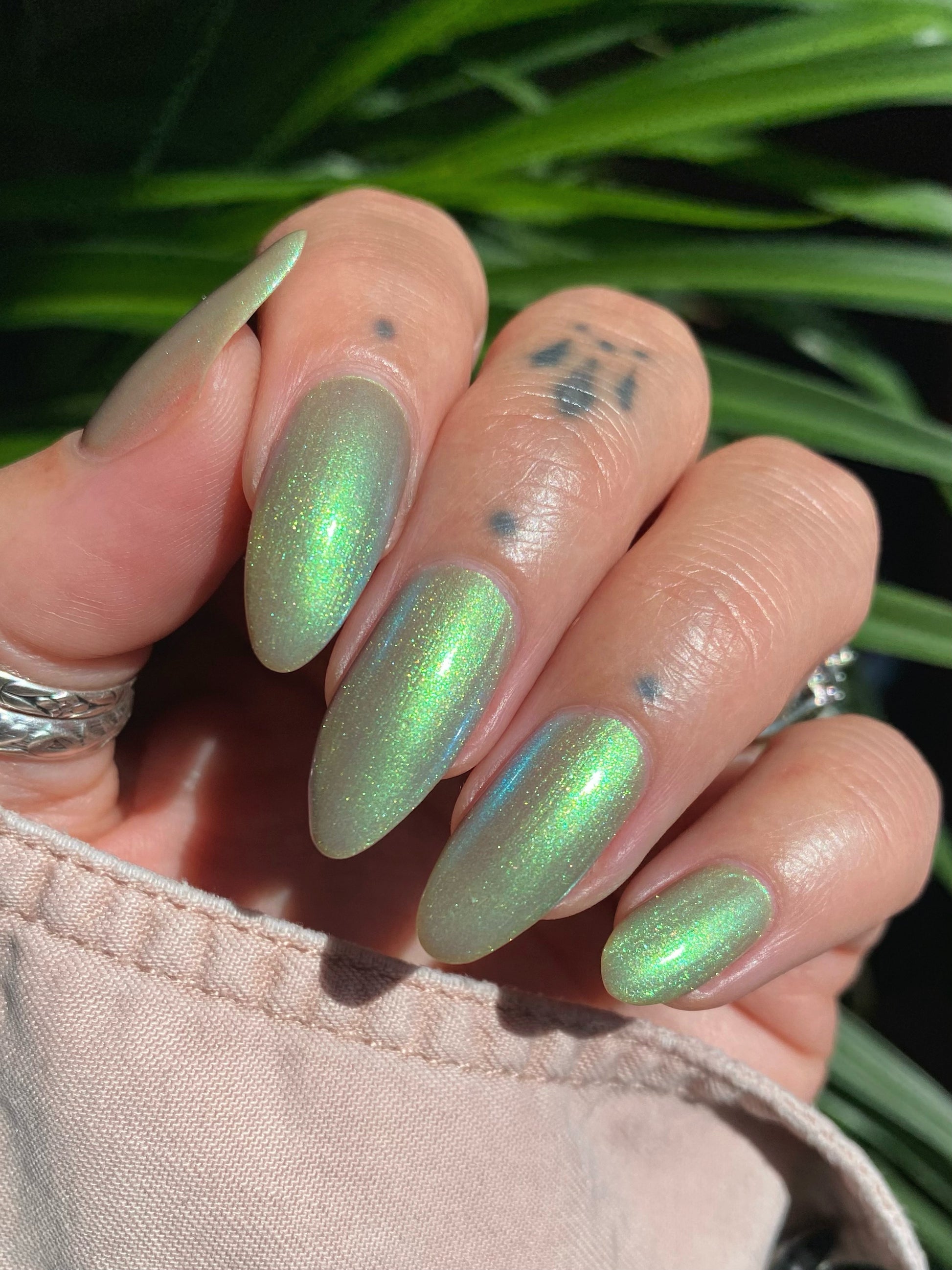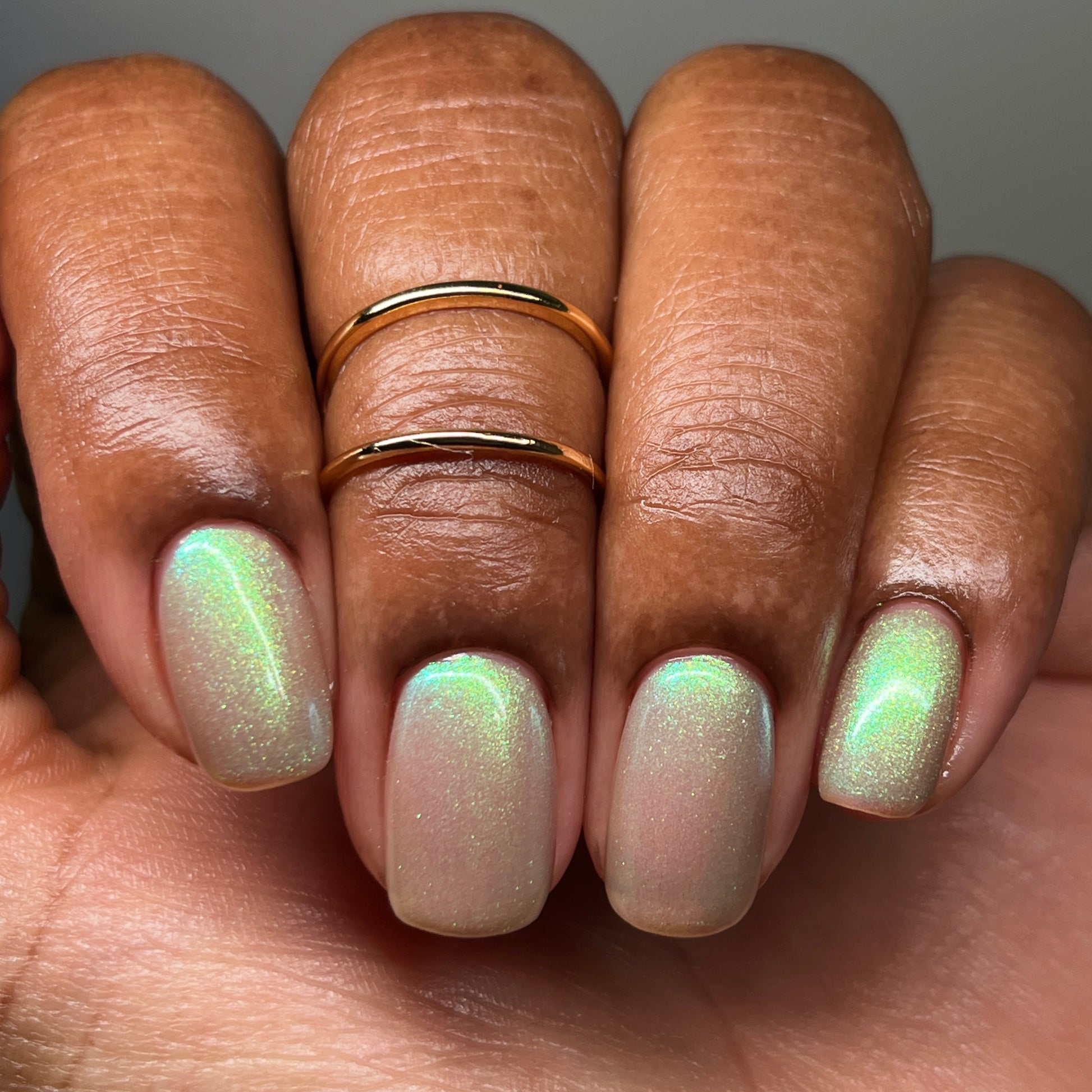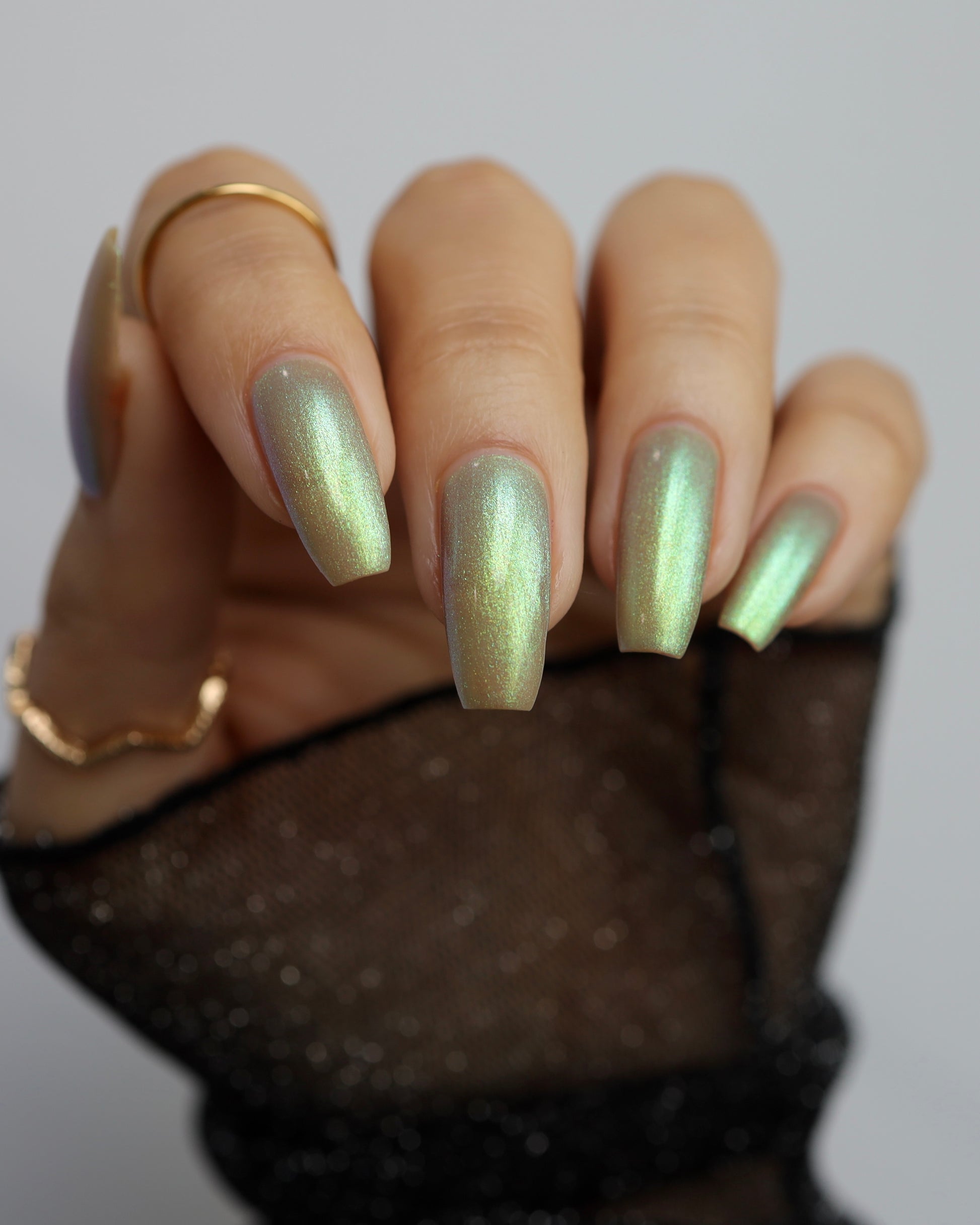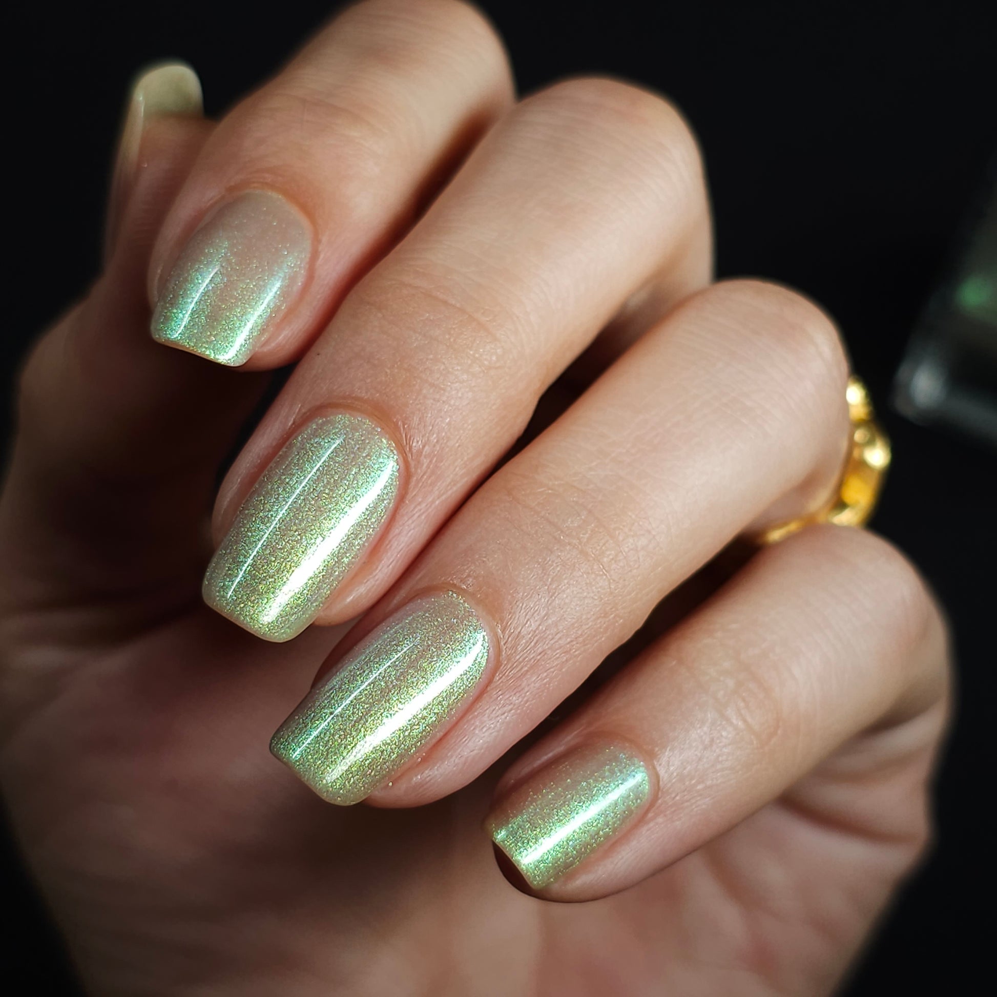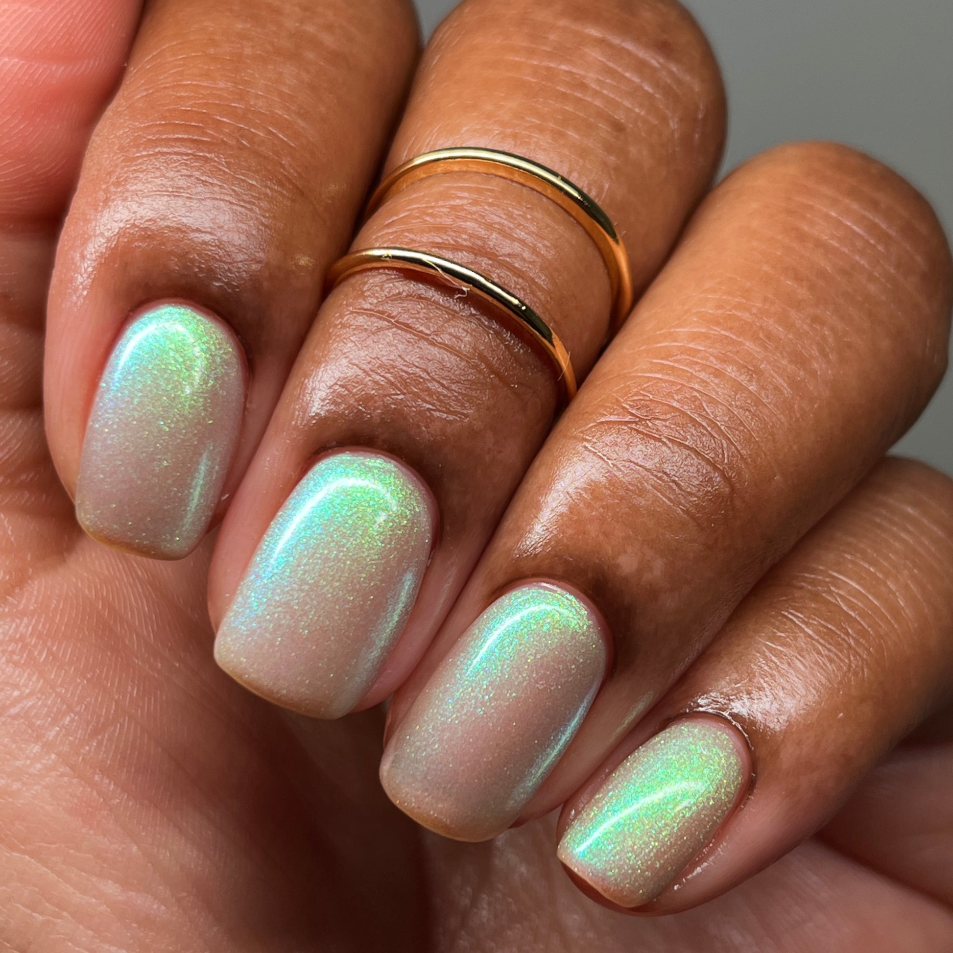 A semi-sheer taupe base with warm-toned green aurora shimmer that shifts to blue