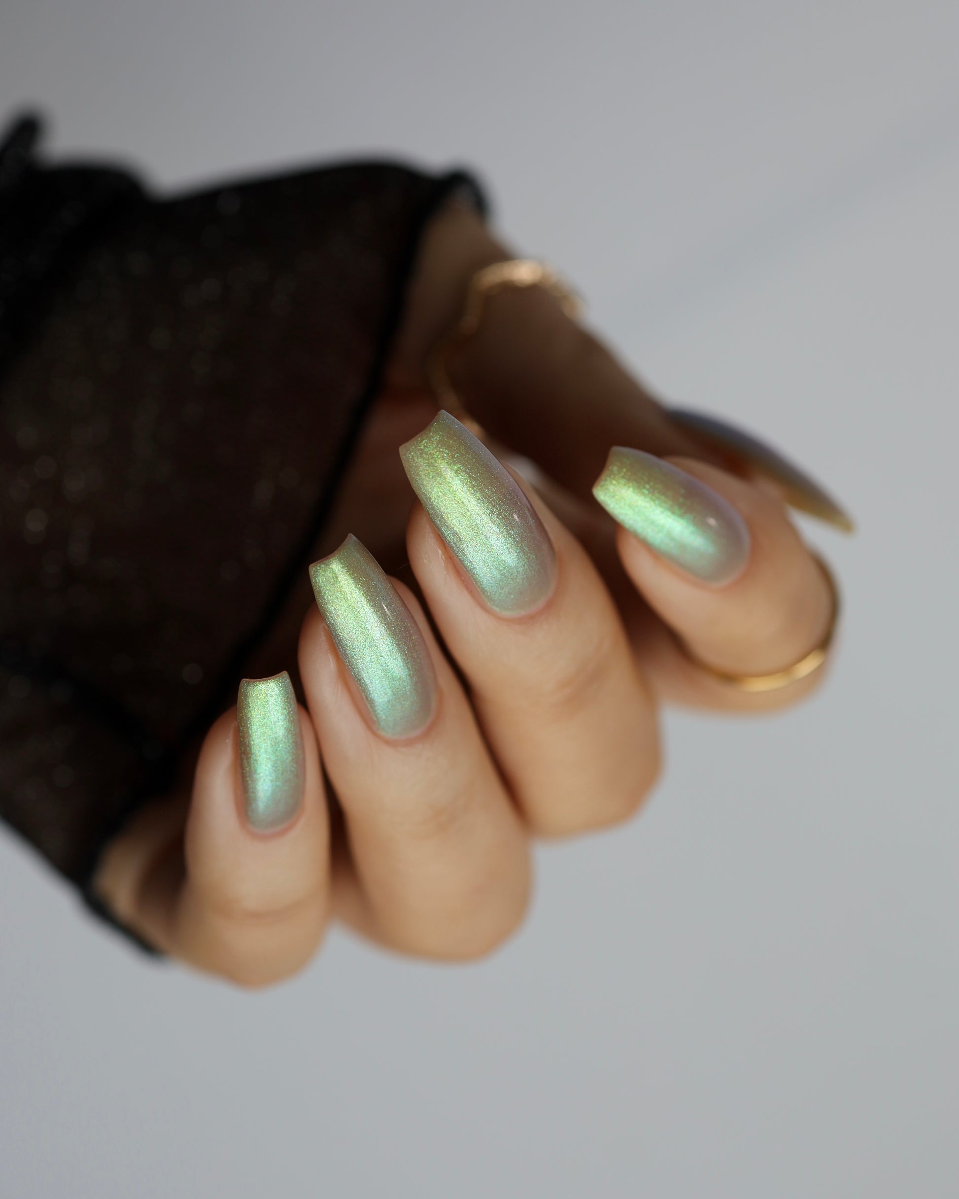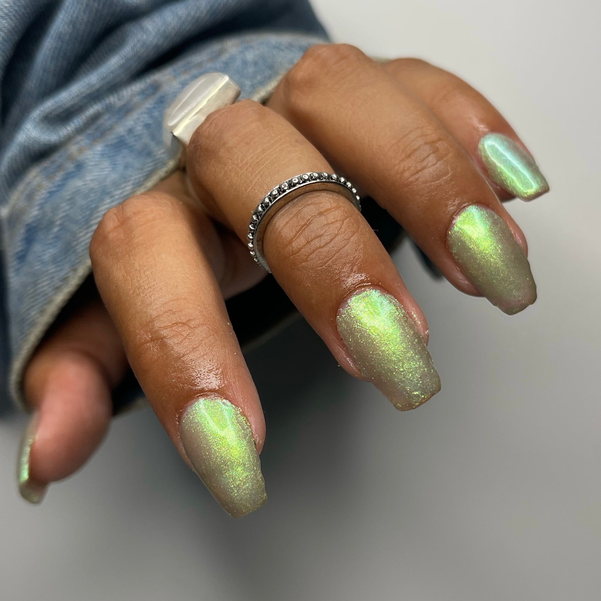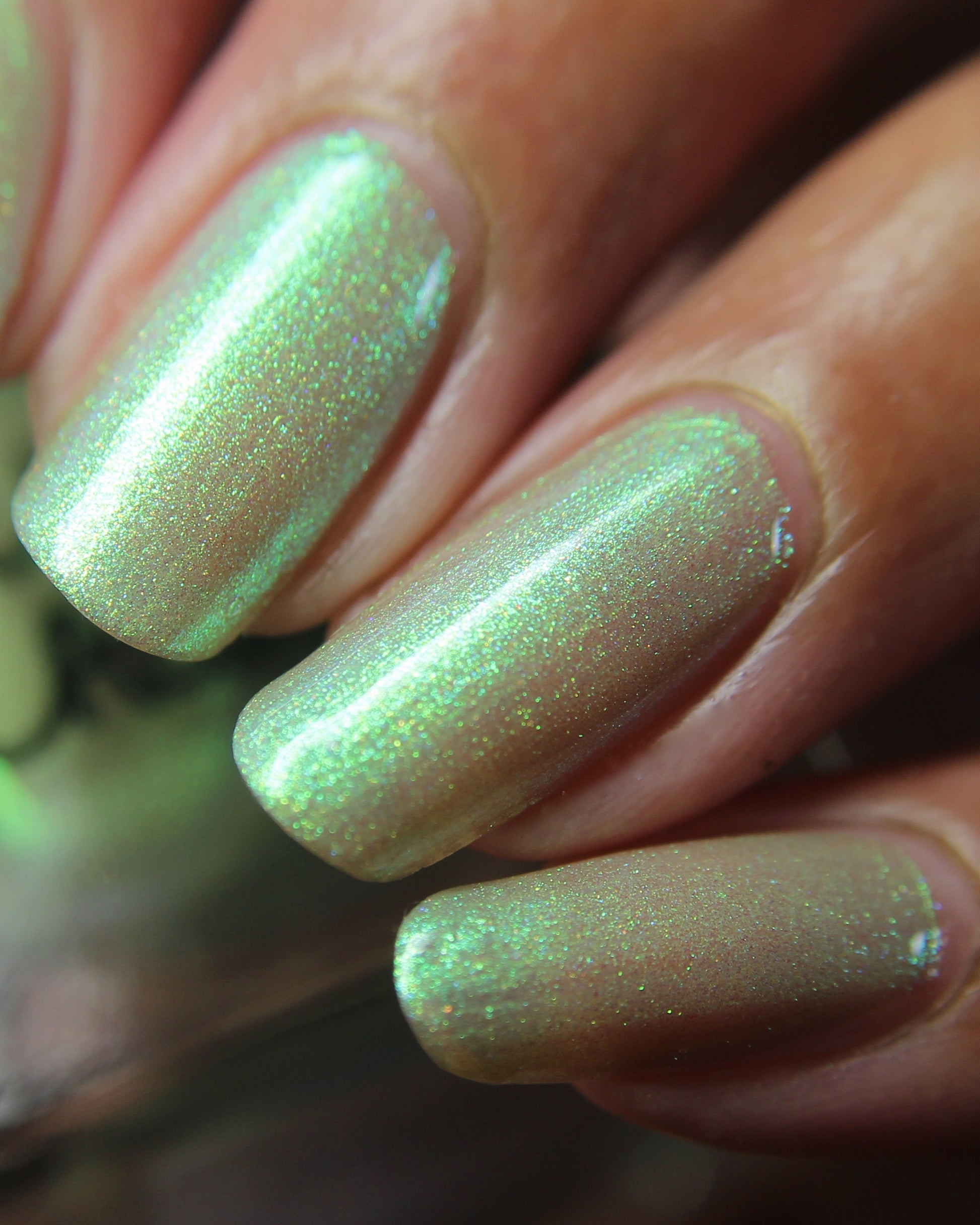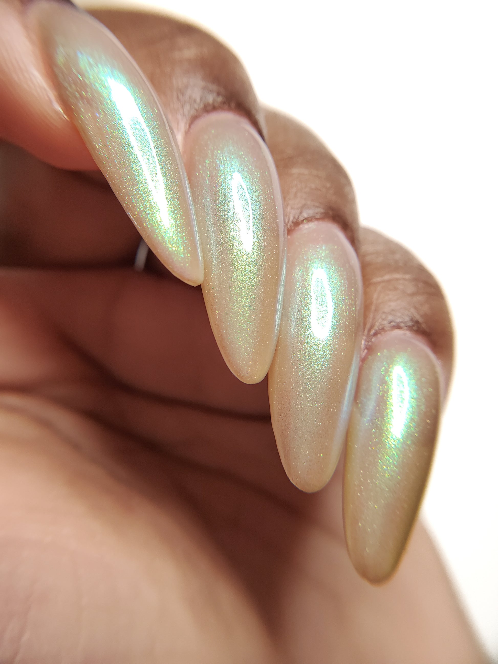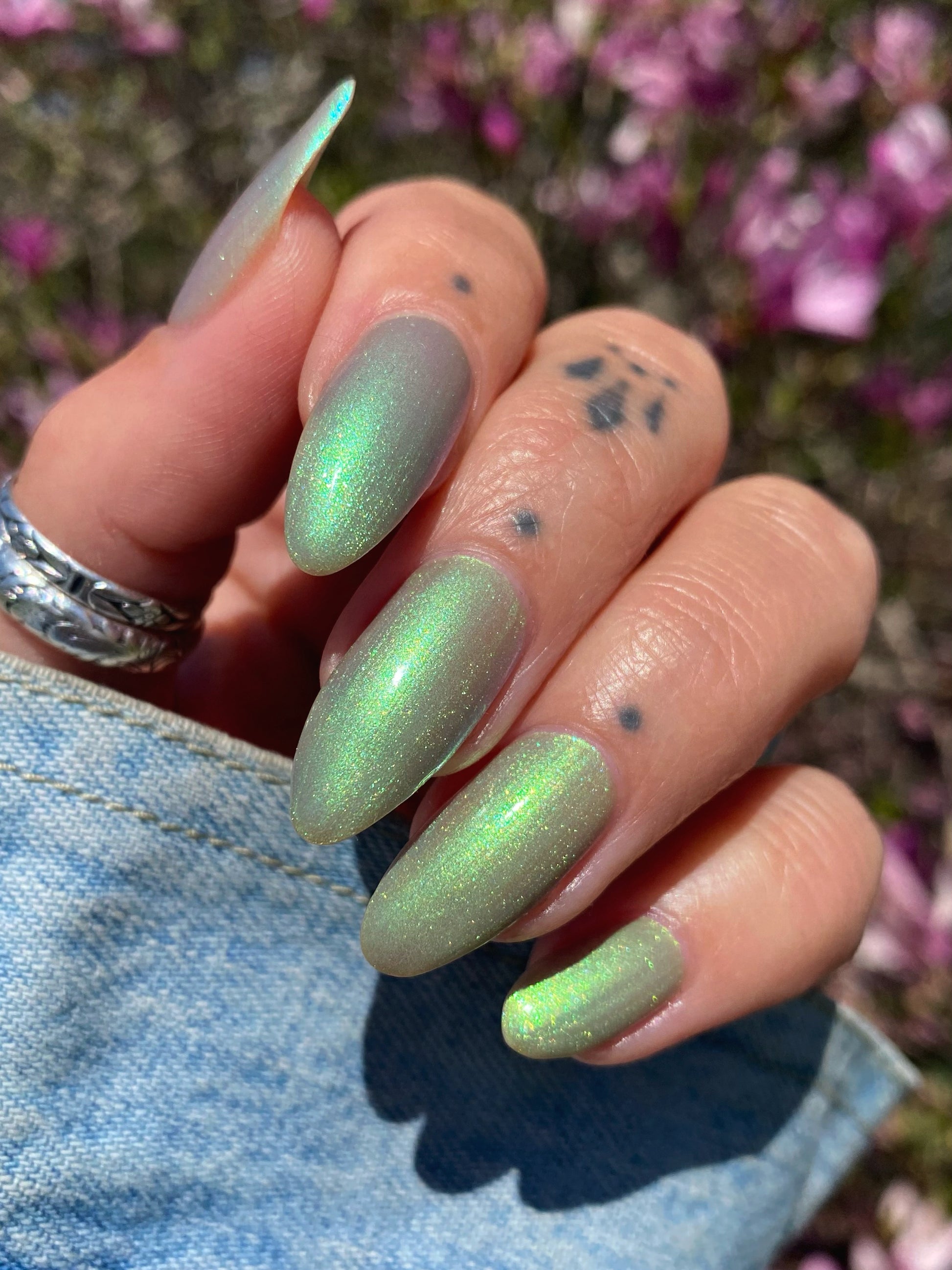 A semi-sheer taupe base with warm-toned green aurora shimmer that shifts to blue