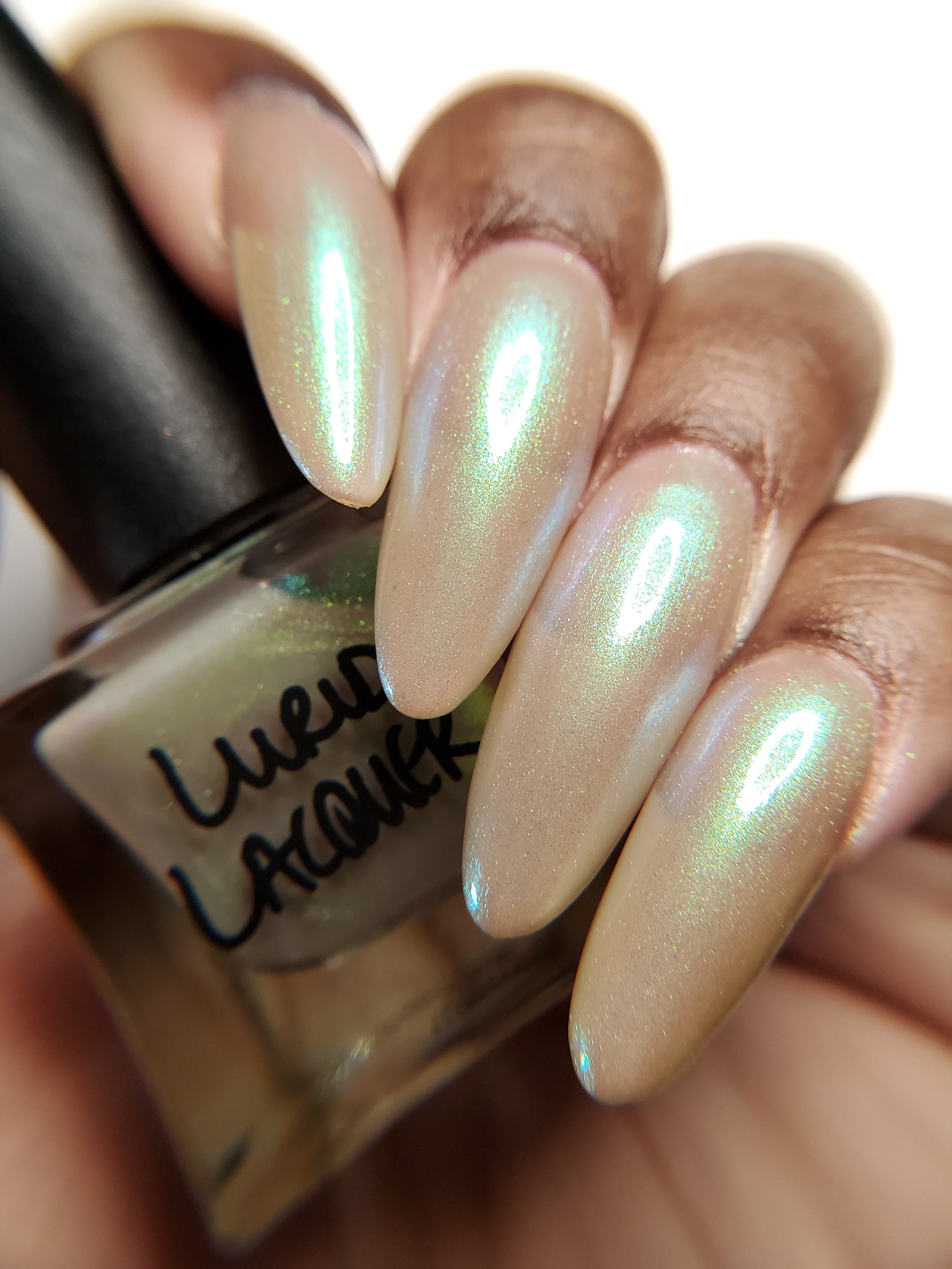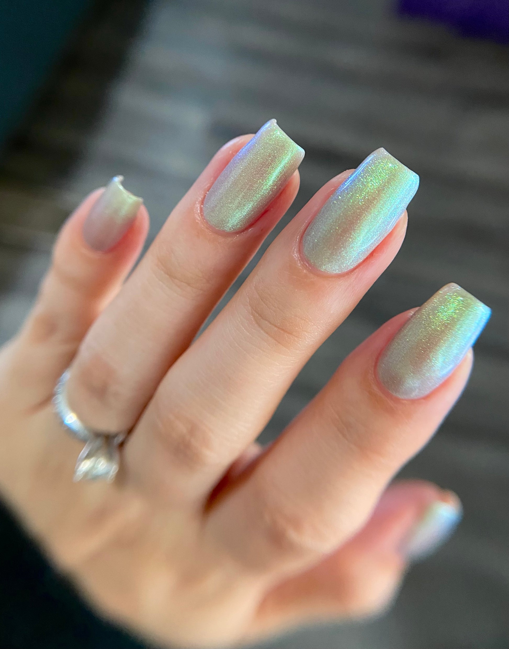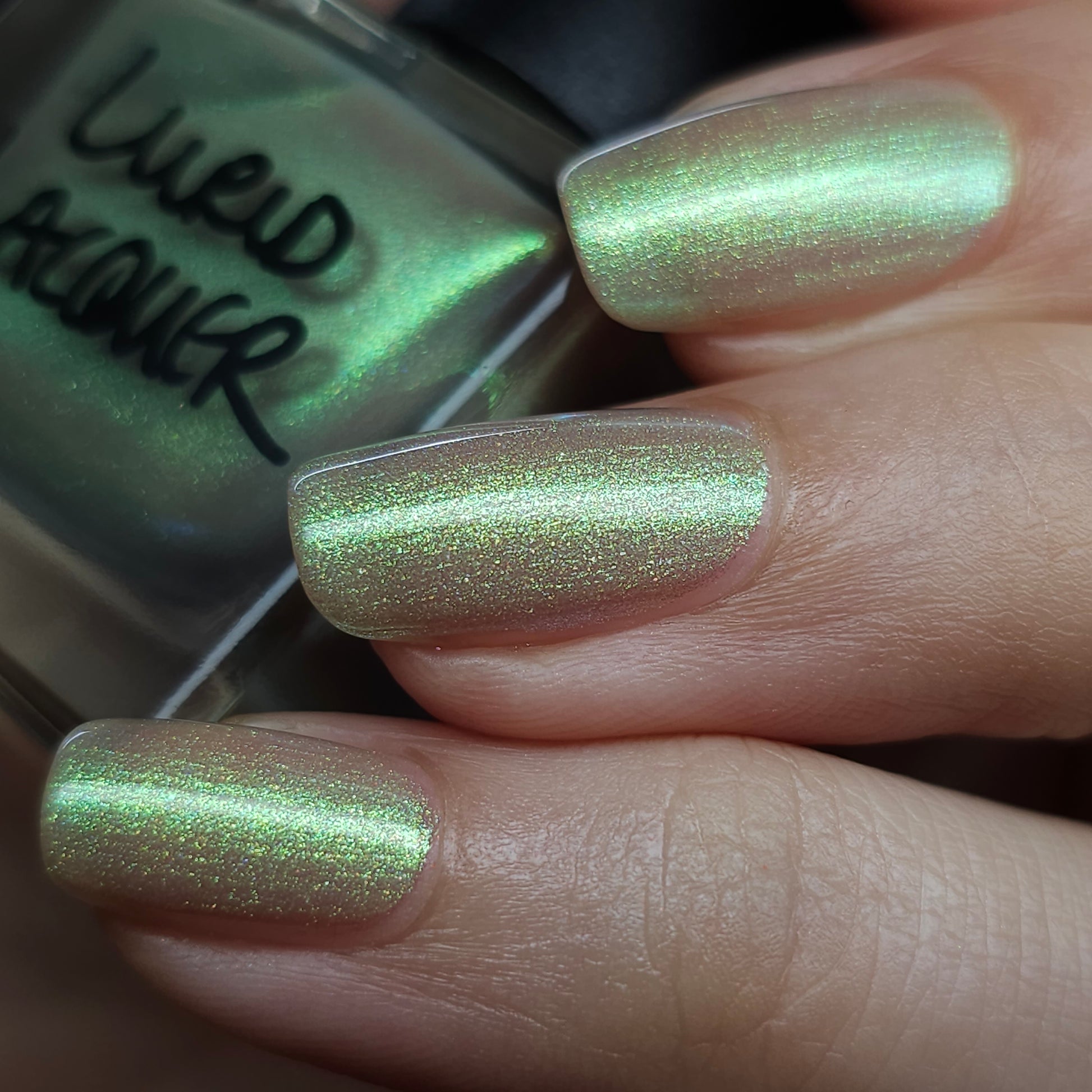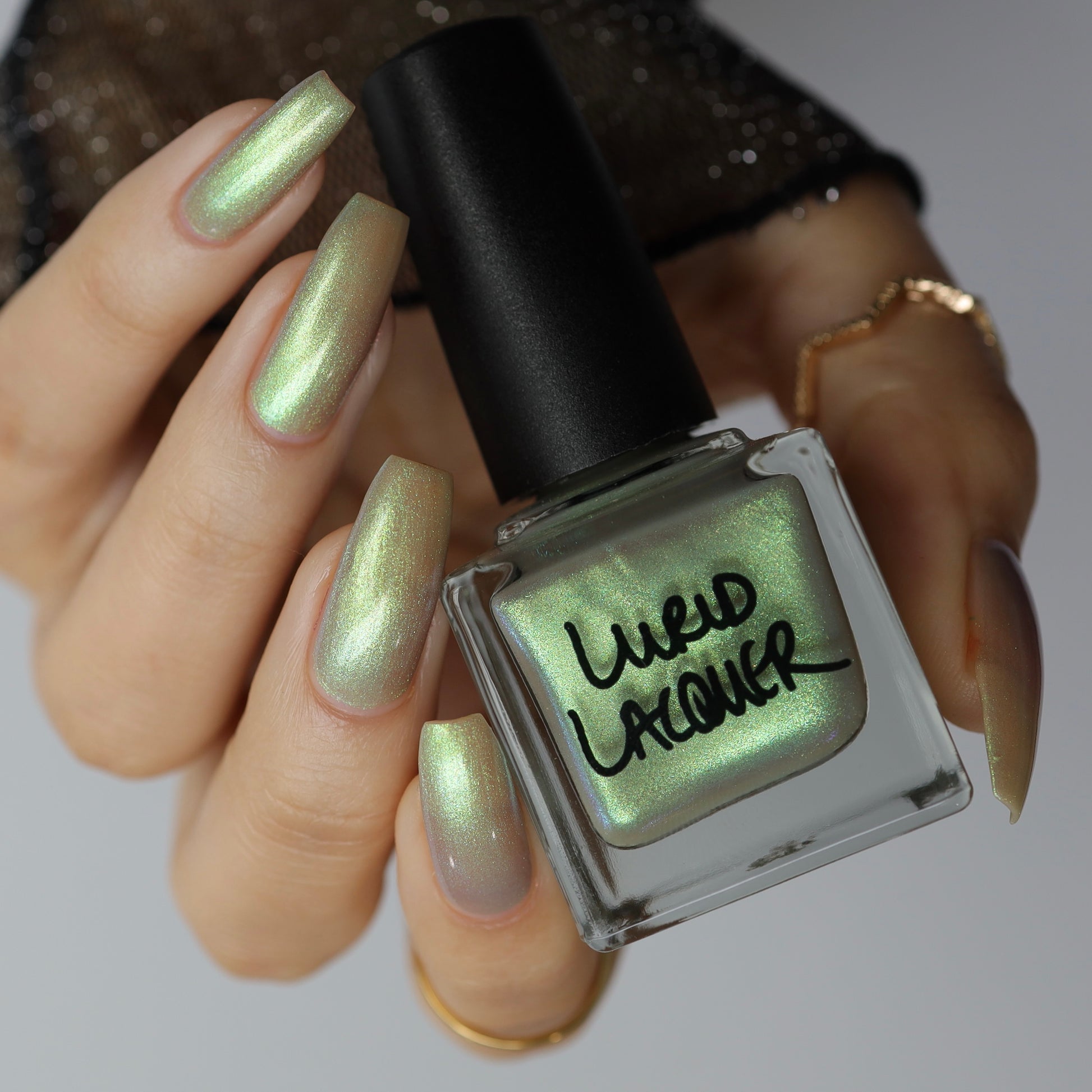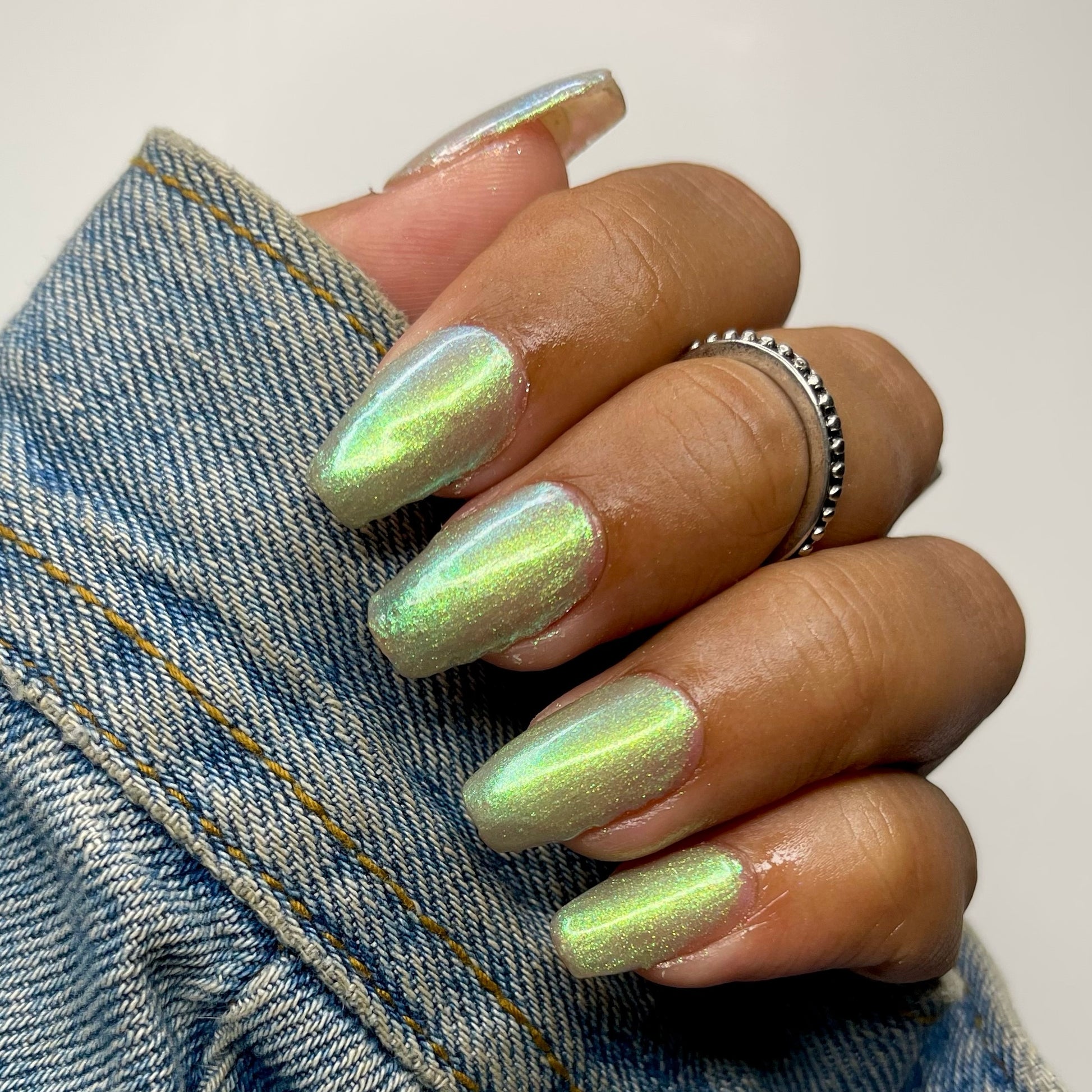 A semi-sheer taupe base with warm-toned green aurora shimmer that shifts to blue