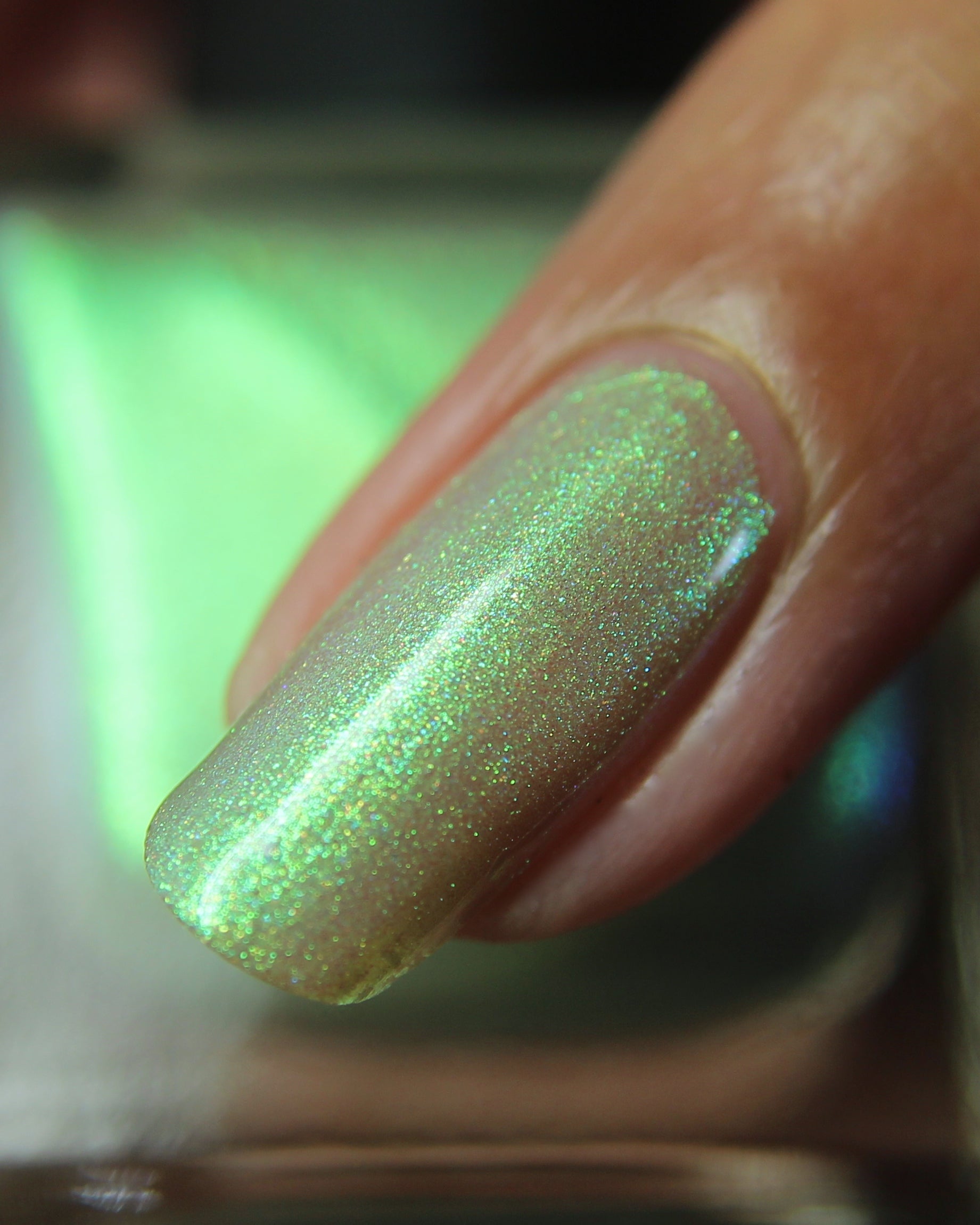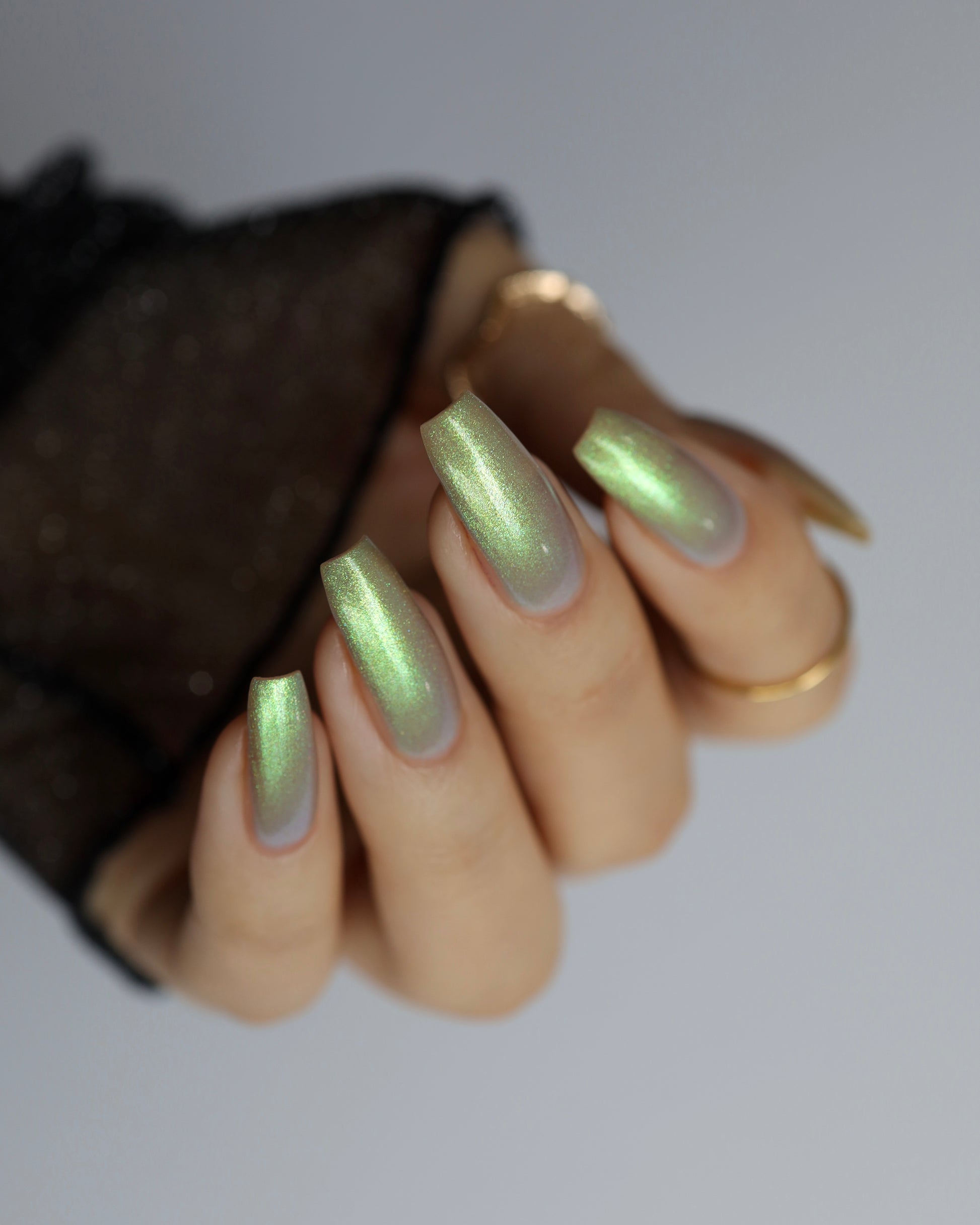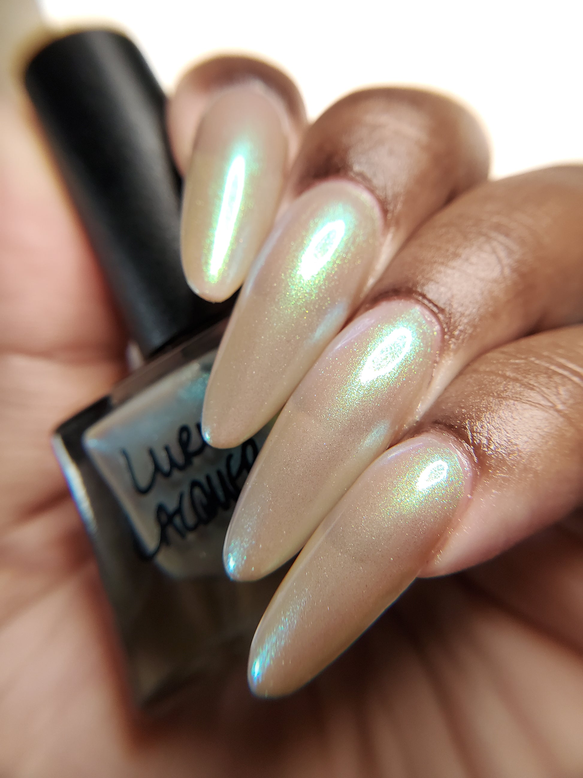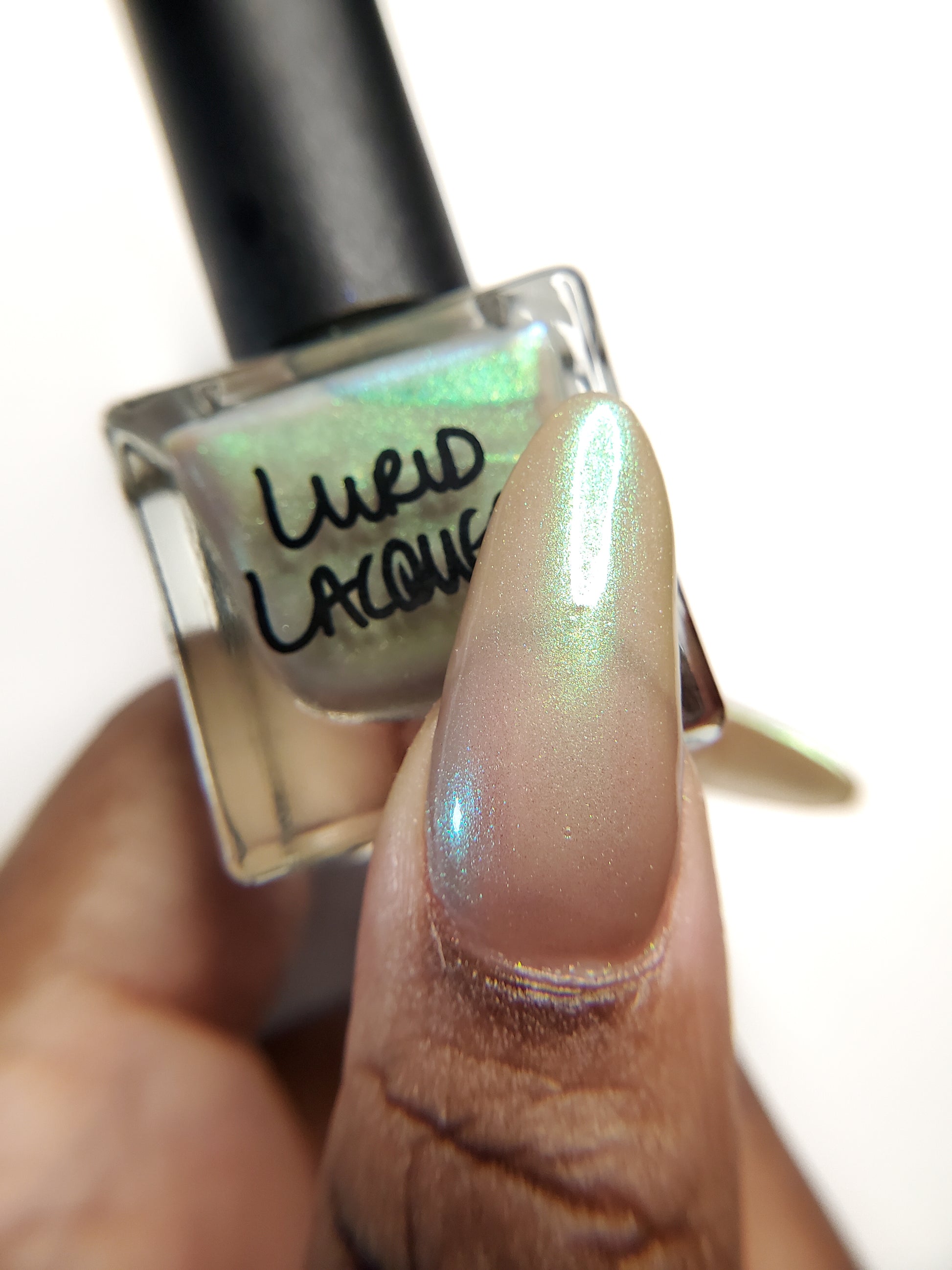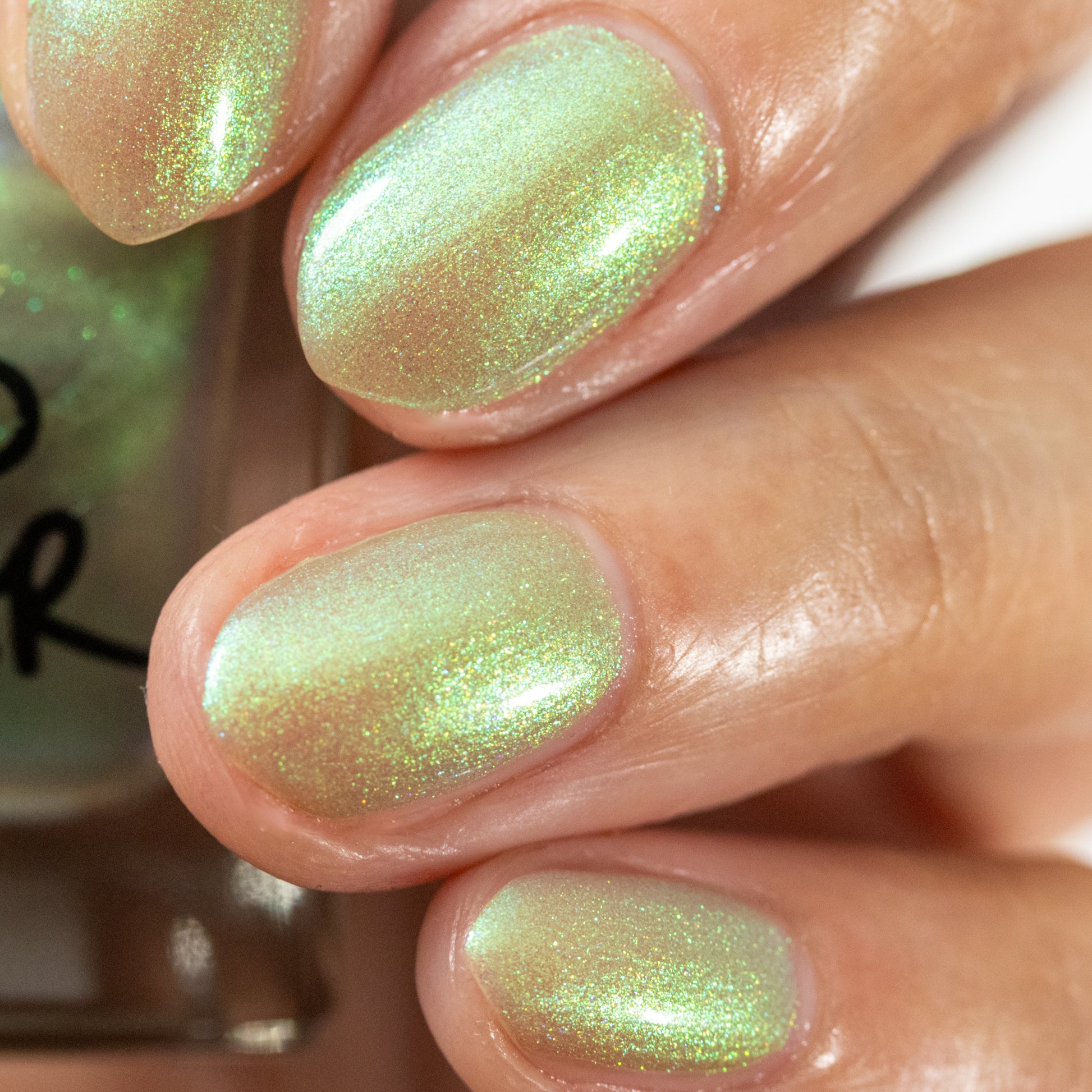 A semi-sheer taupe base with warm-toned green aurora shimmer that shifts to blue