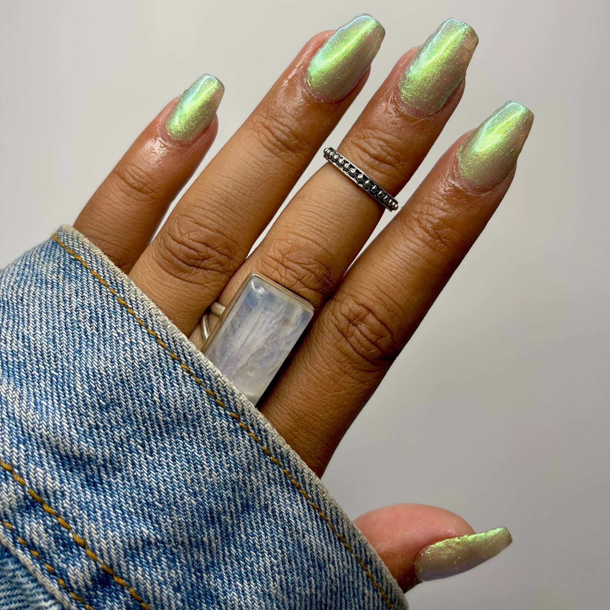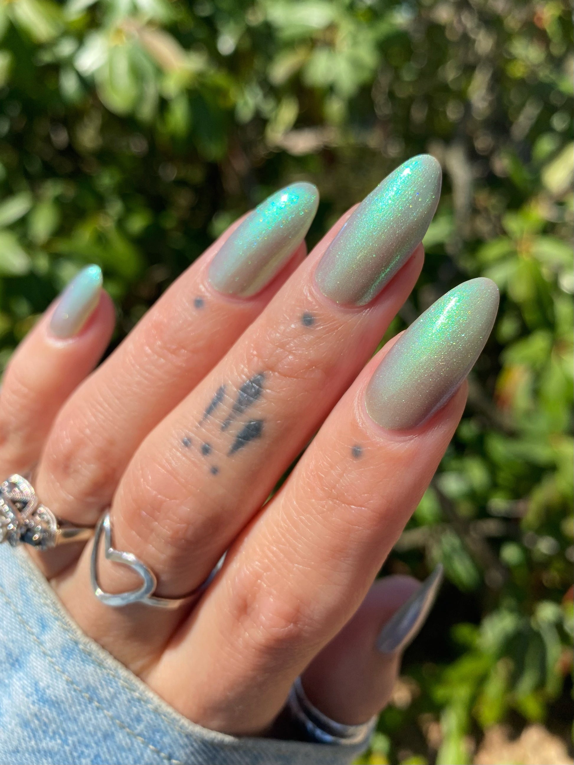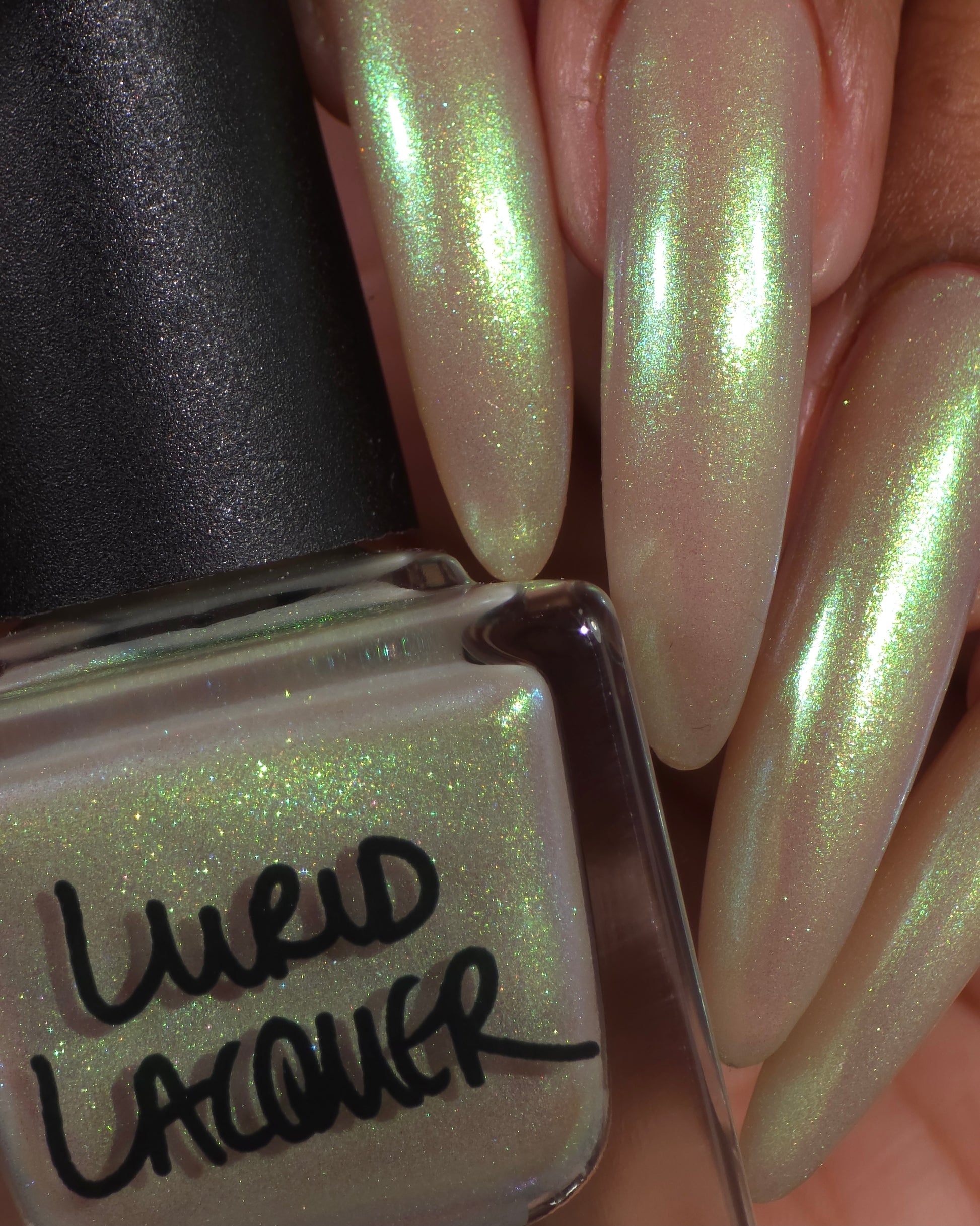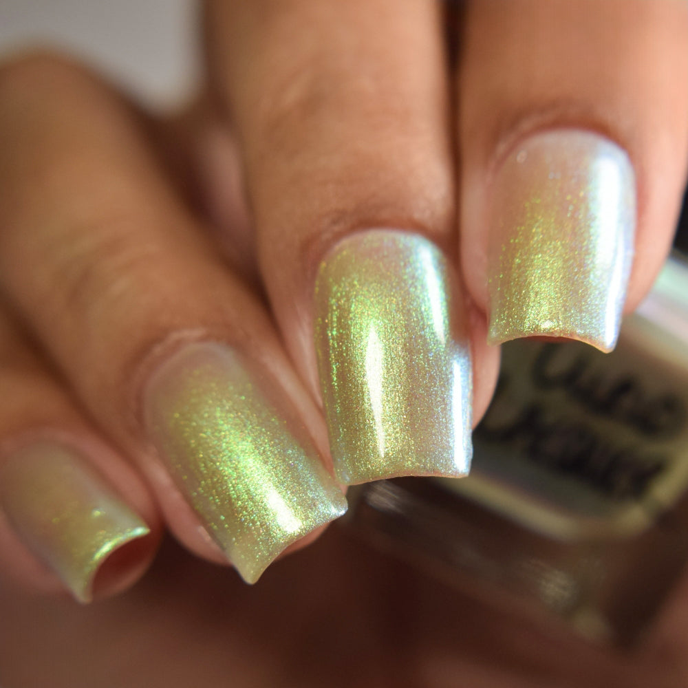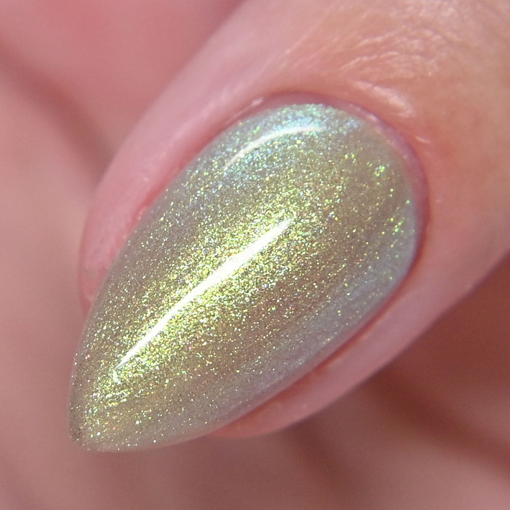 A semi-sheer taupe base with warm-toned green aurora shimmer that shifts to blue