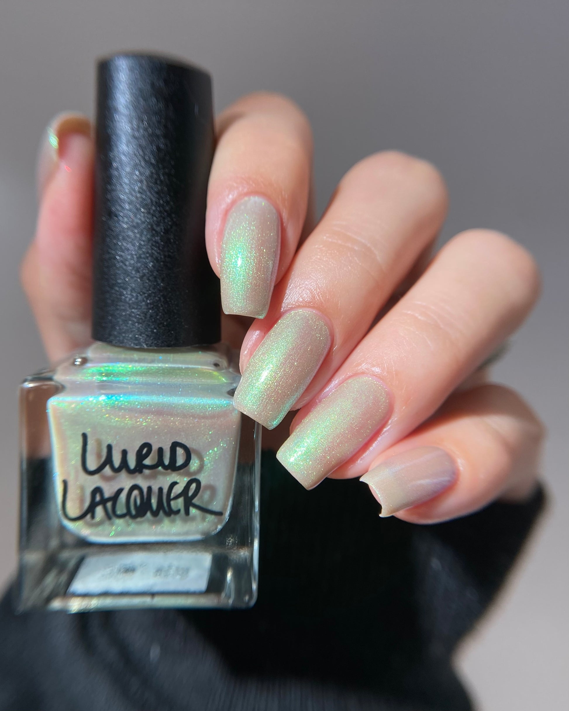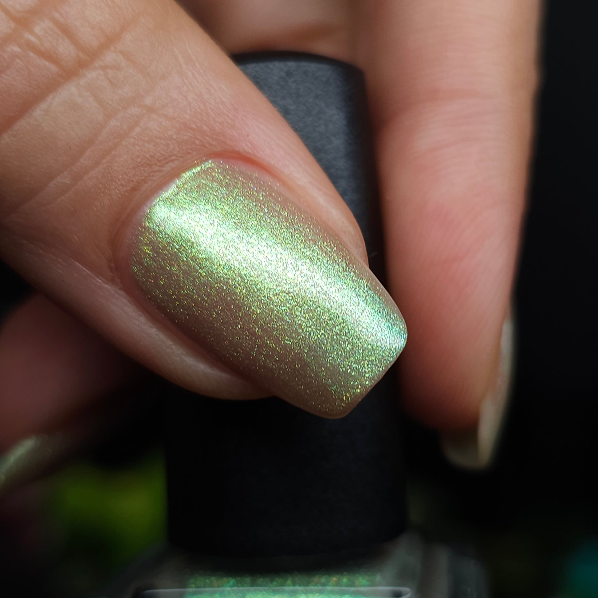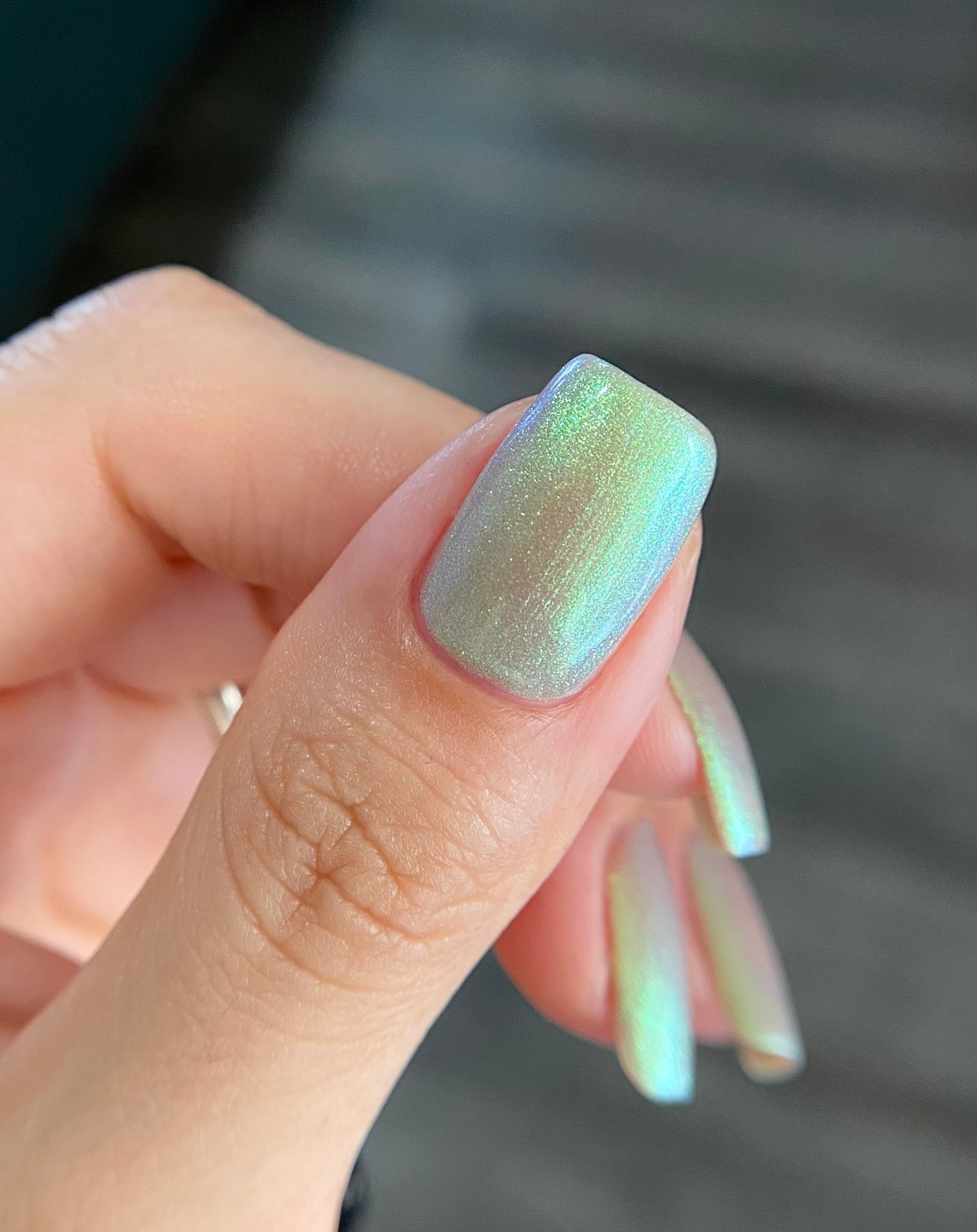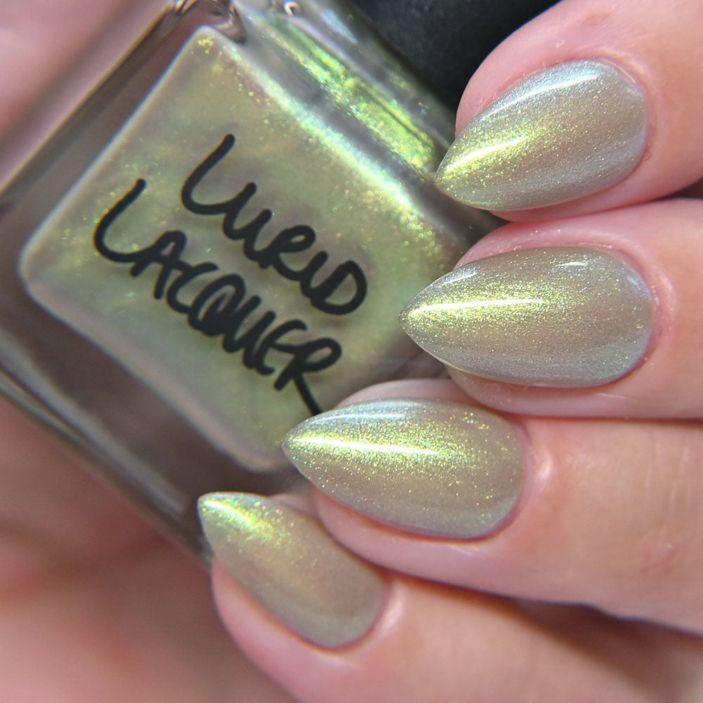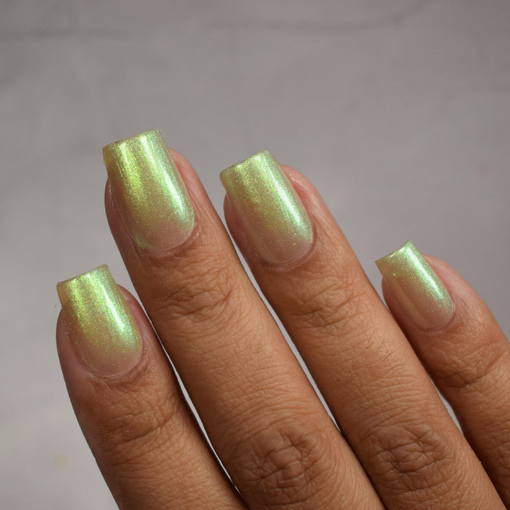 A semi-sheer taupe base with warm-toned green aurora shimmer that shifts to blue