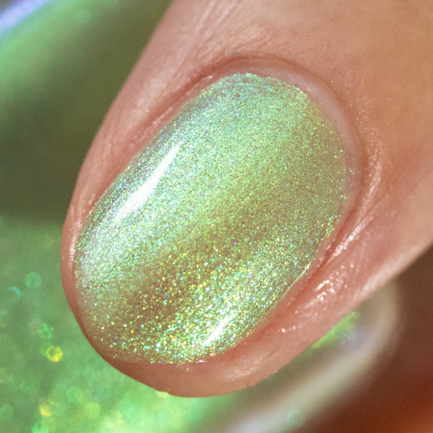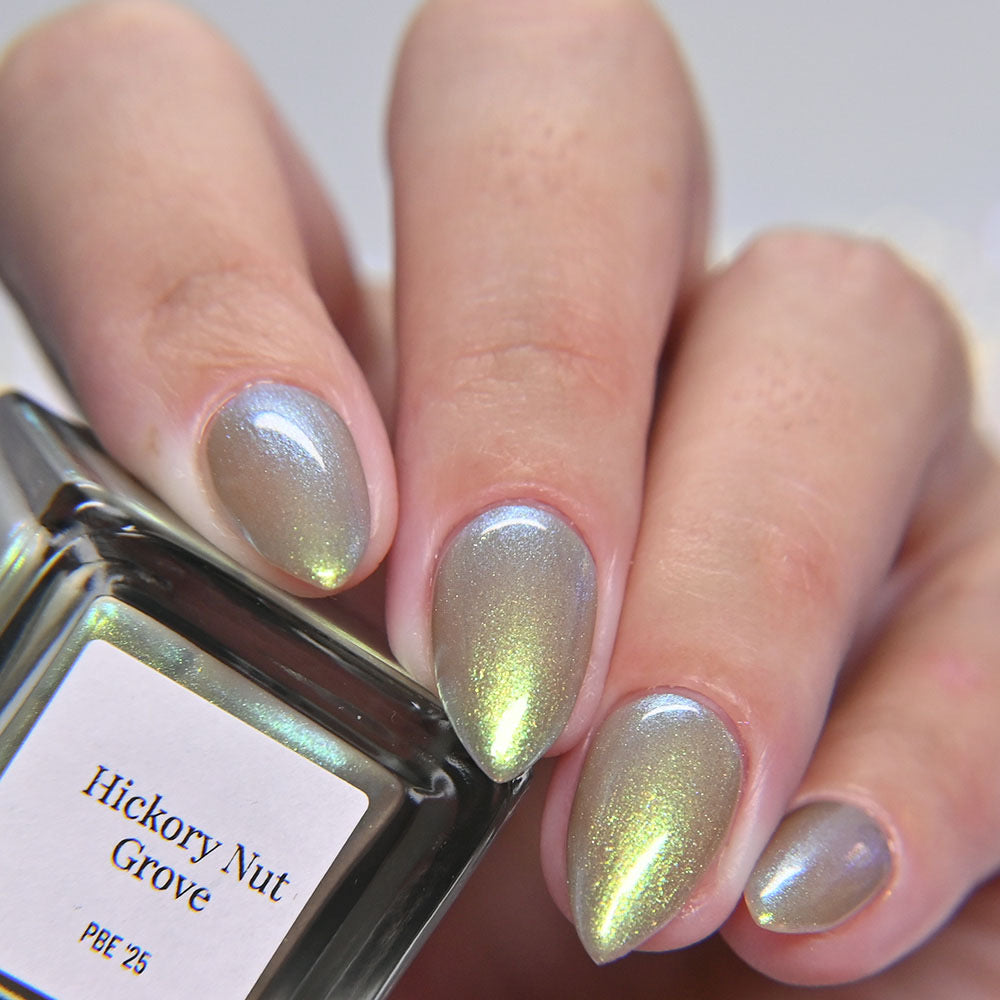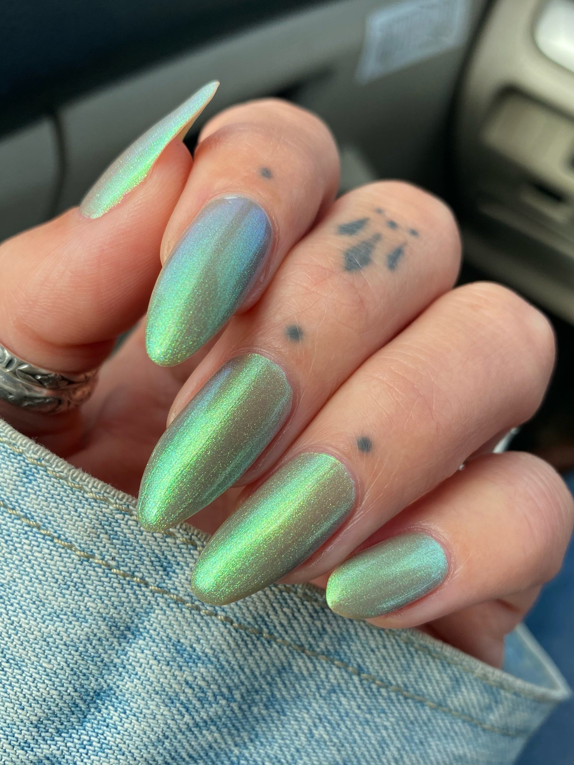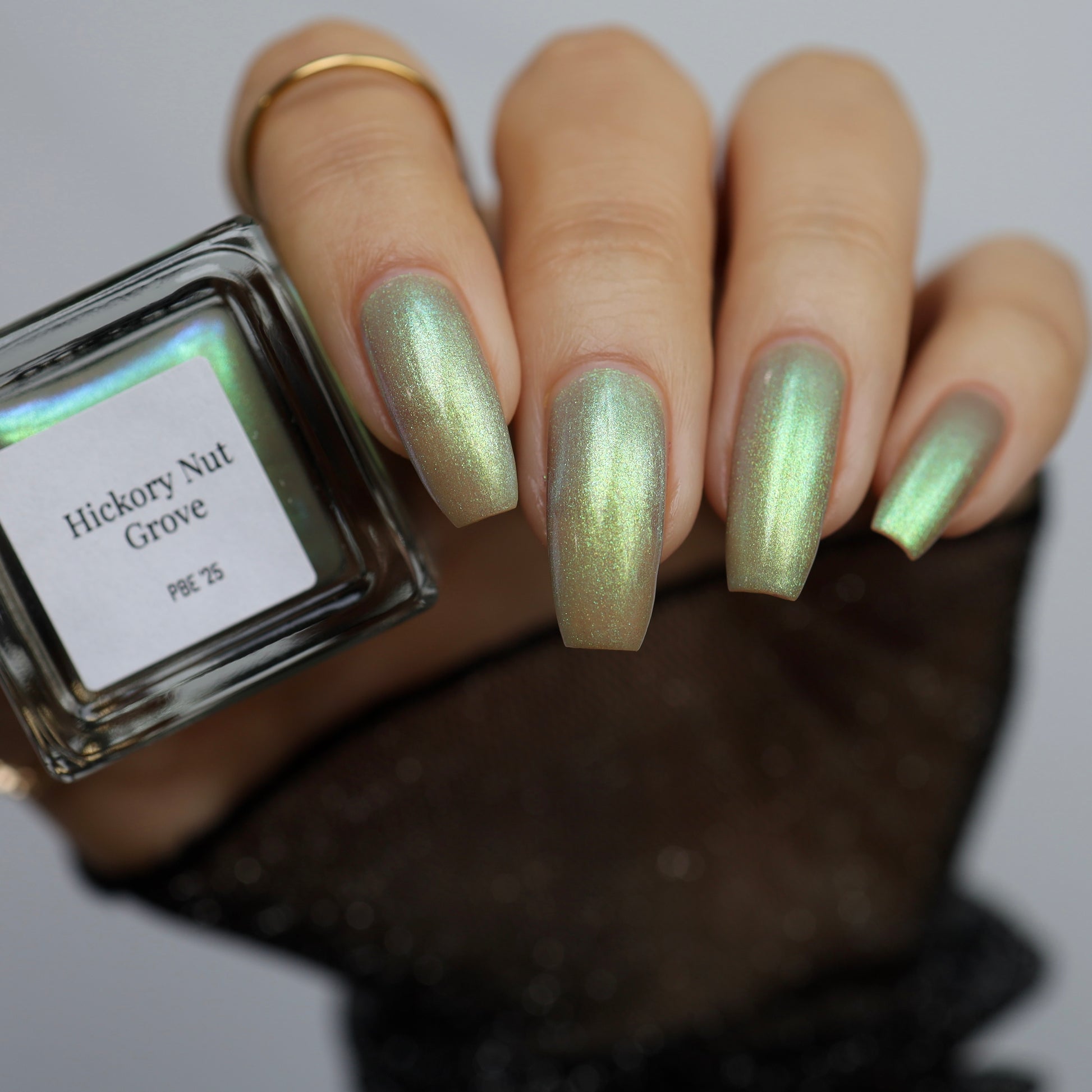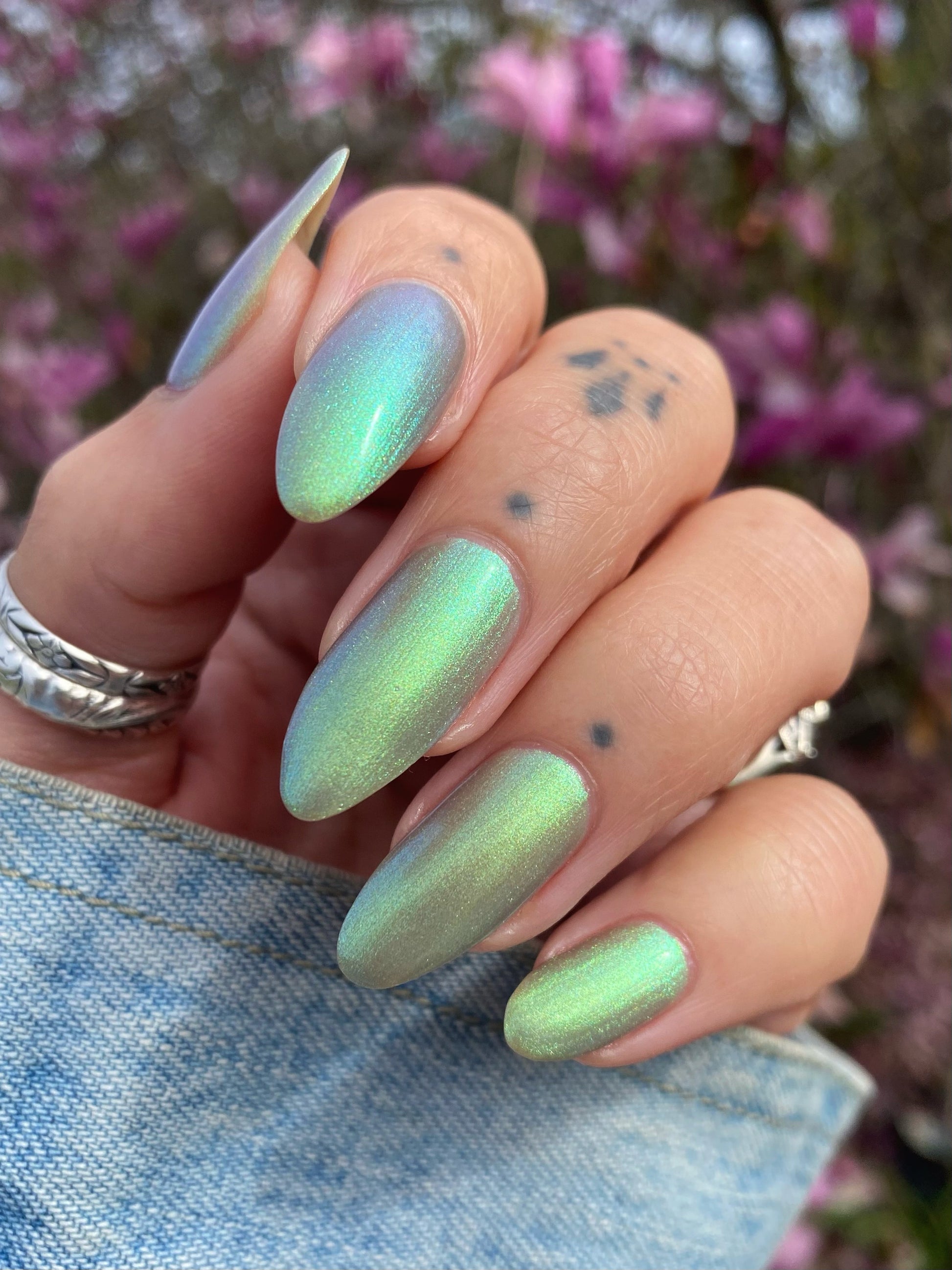 A semi-sheer taupe base with warm-toned green aurora shimmer that shifts to blue