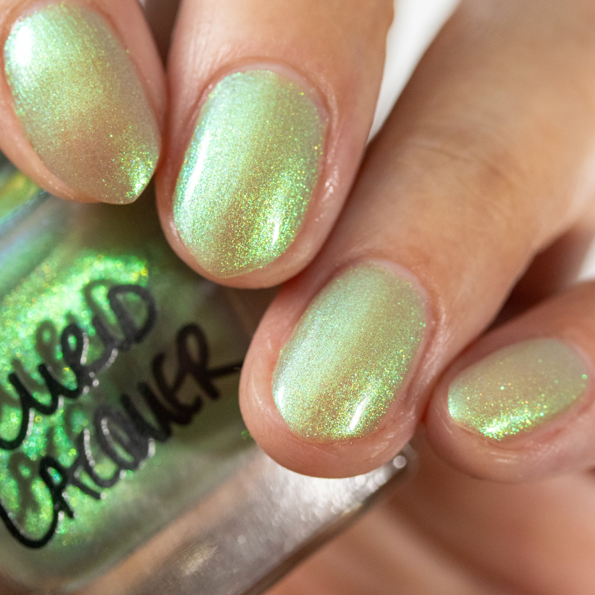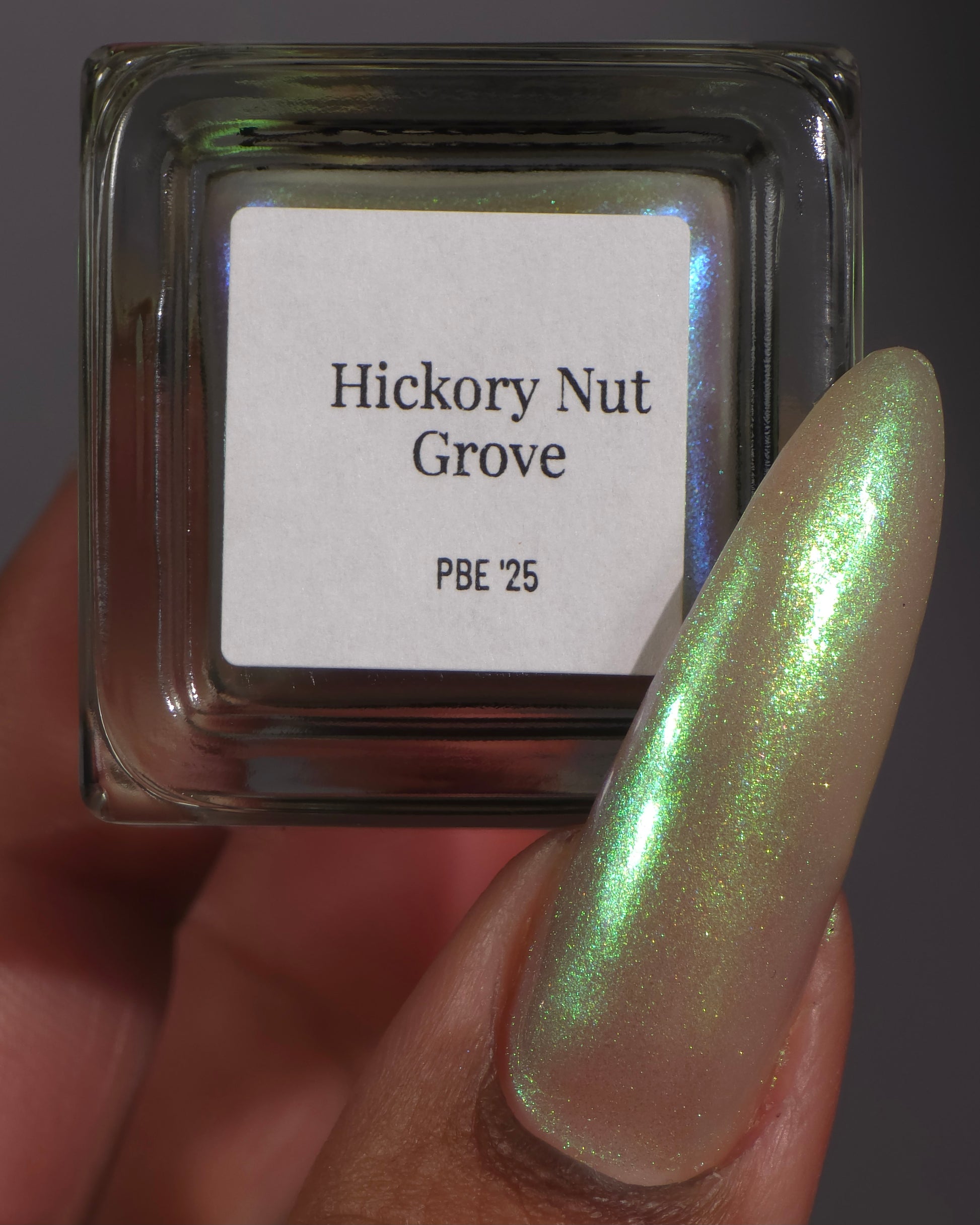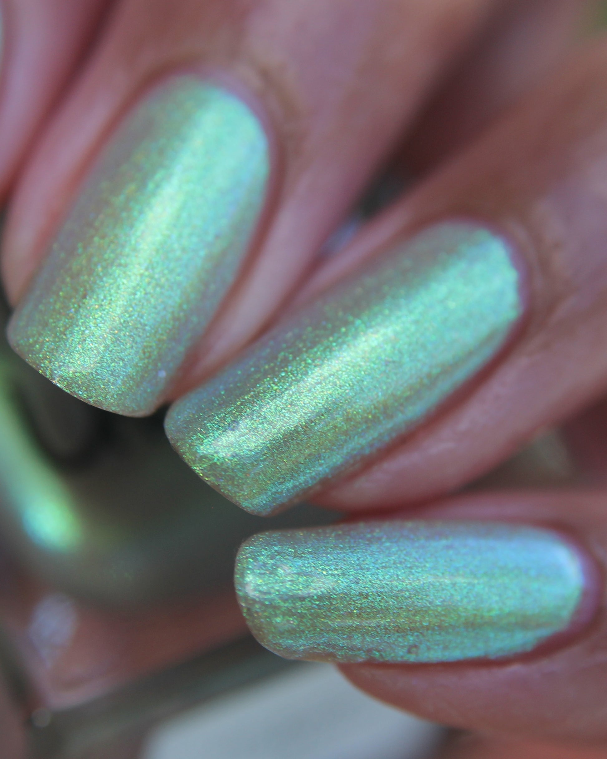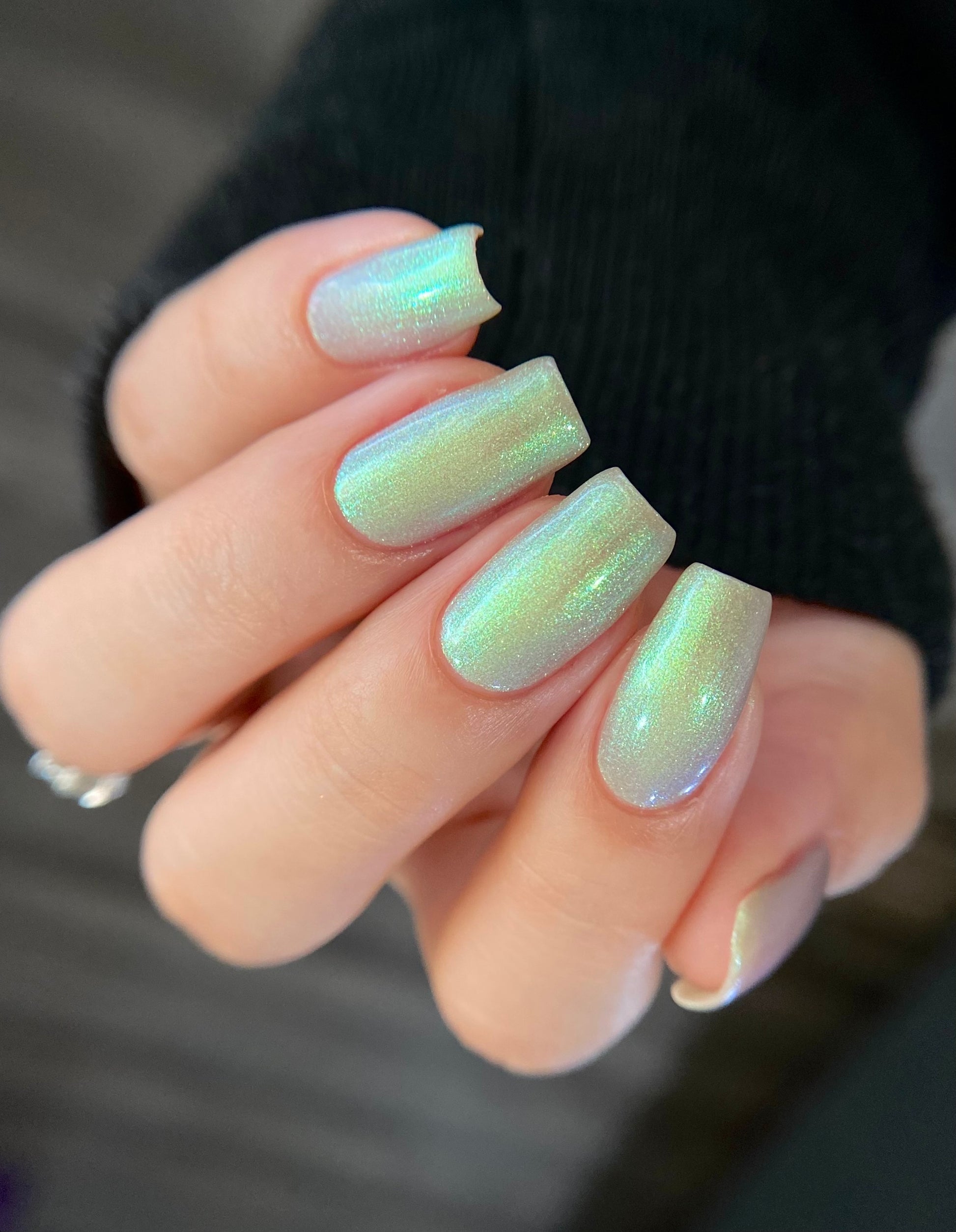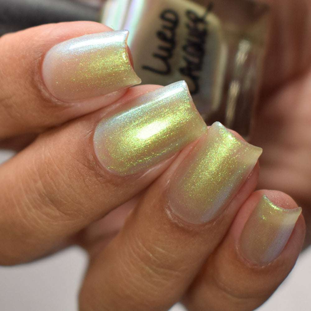 A semi-sheer taupe base with warm-toned green aurora shimmer that shifts to blue