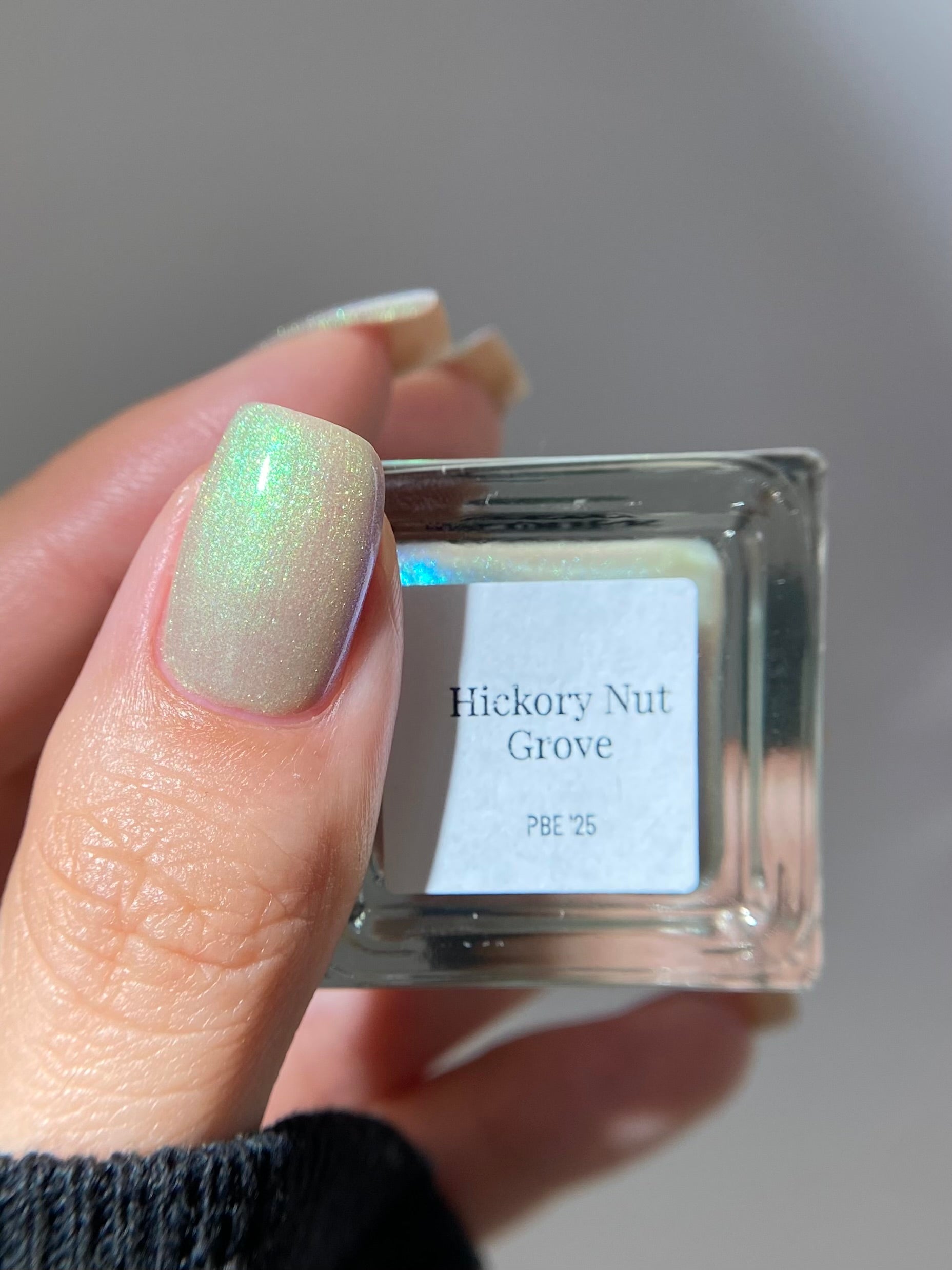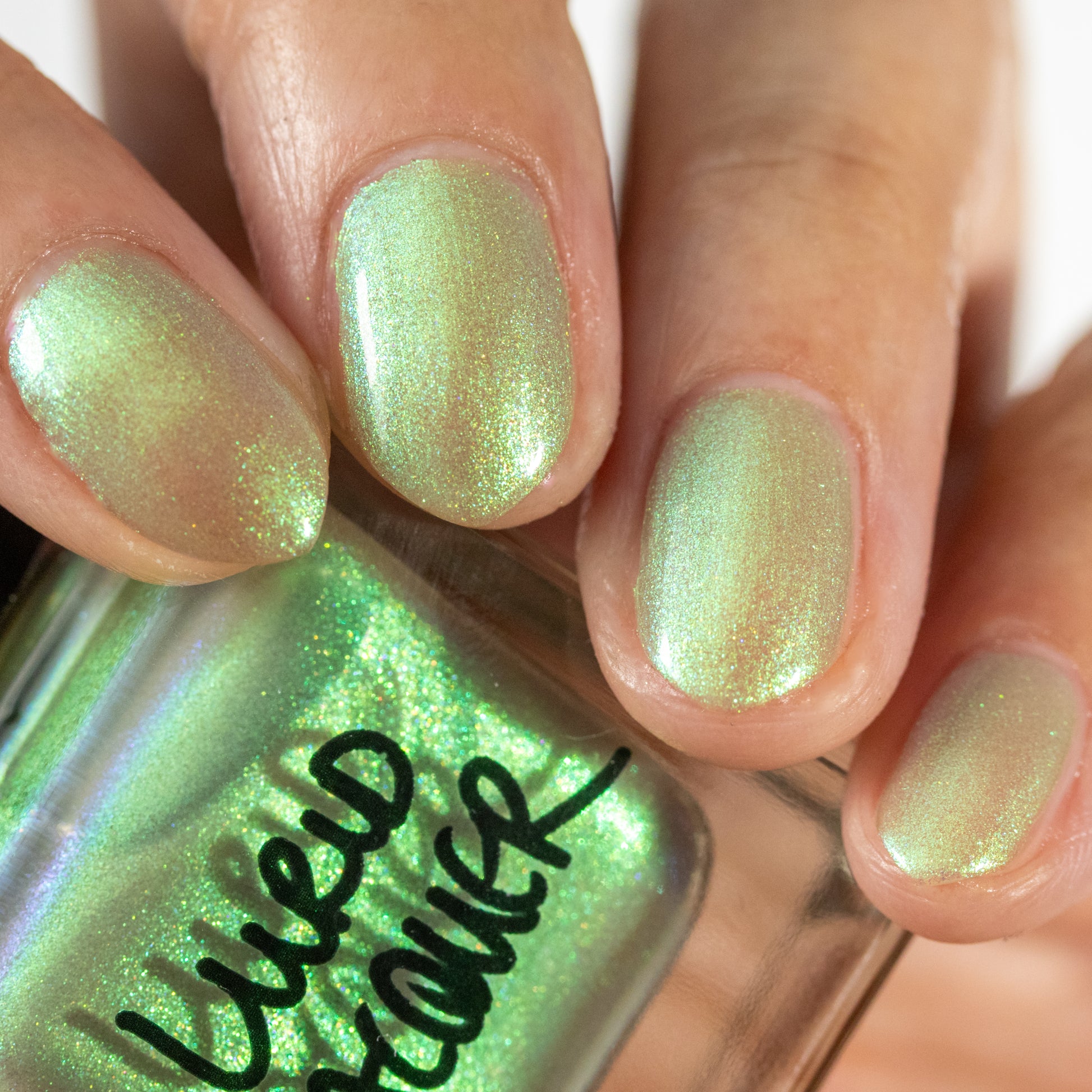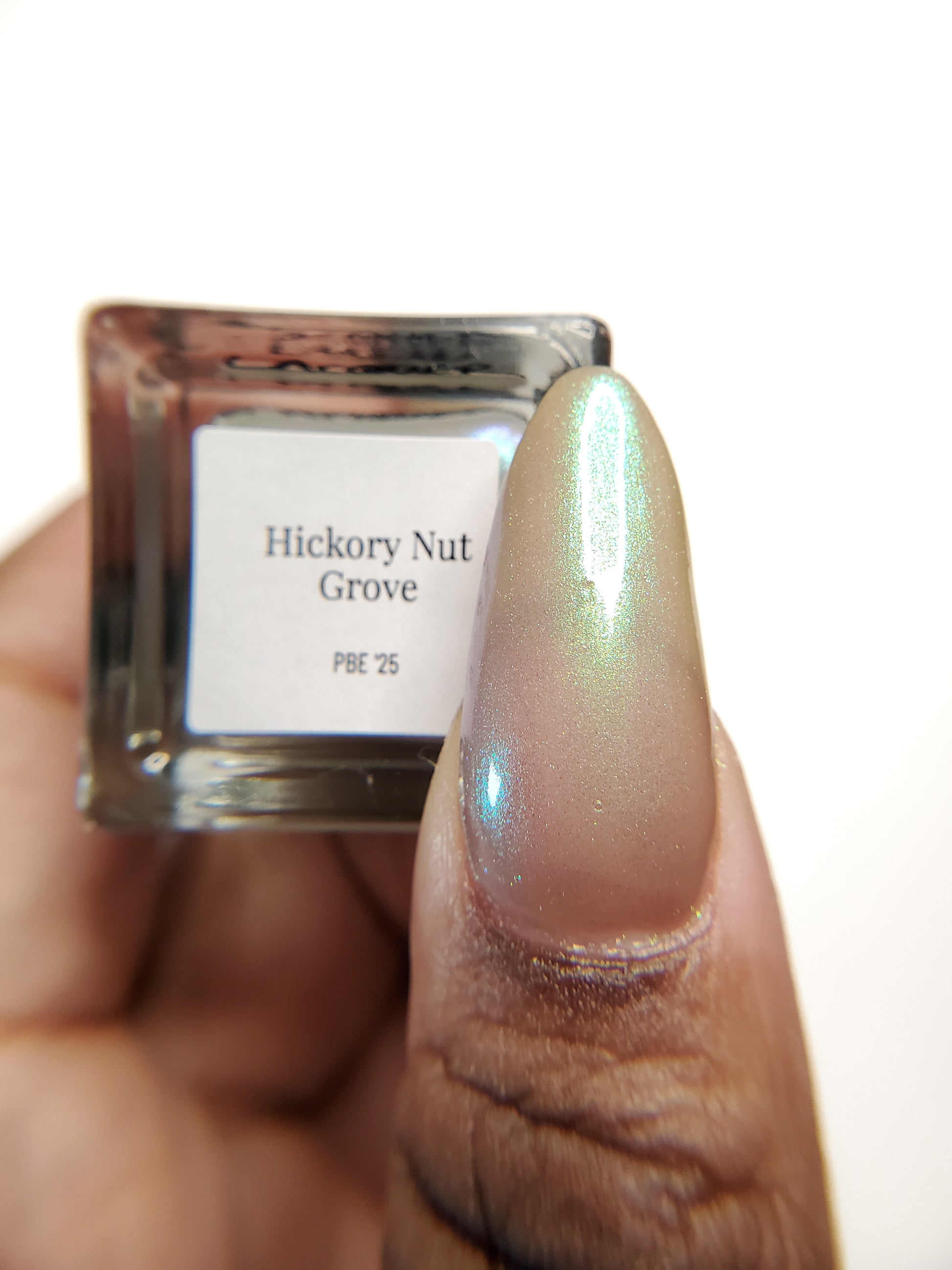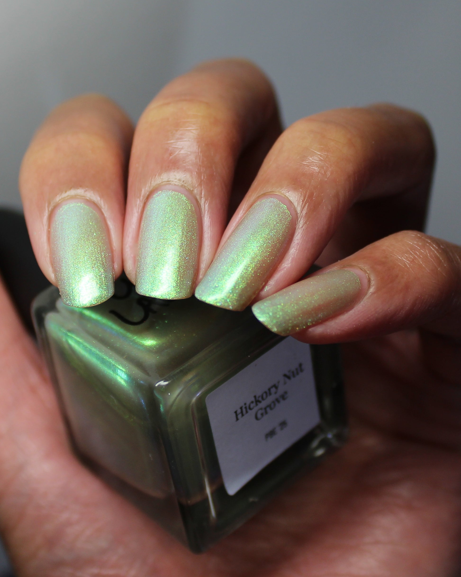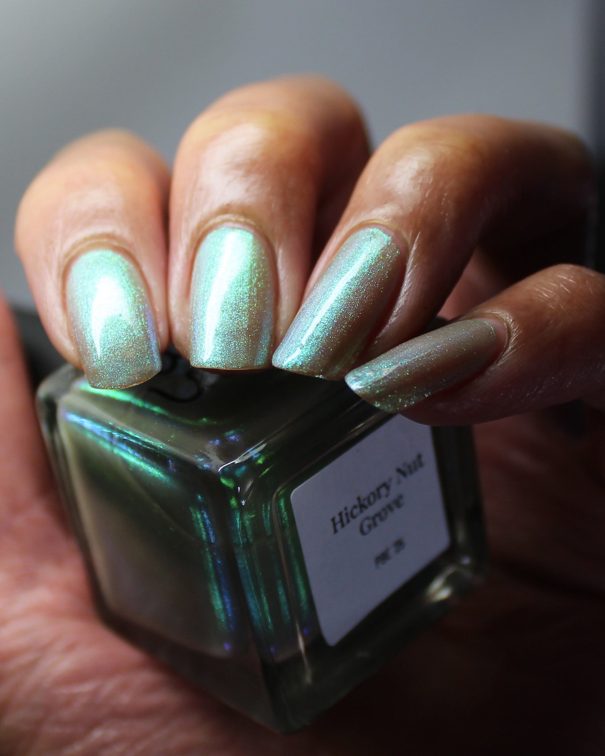 A semi-sheer taupe base with warm-toned green aurora shimmer that shifts to blue