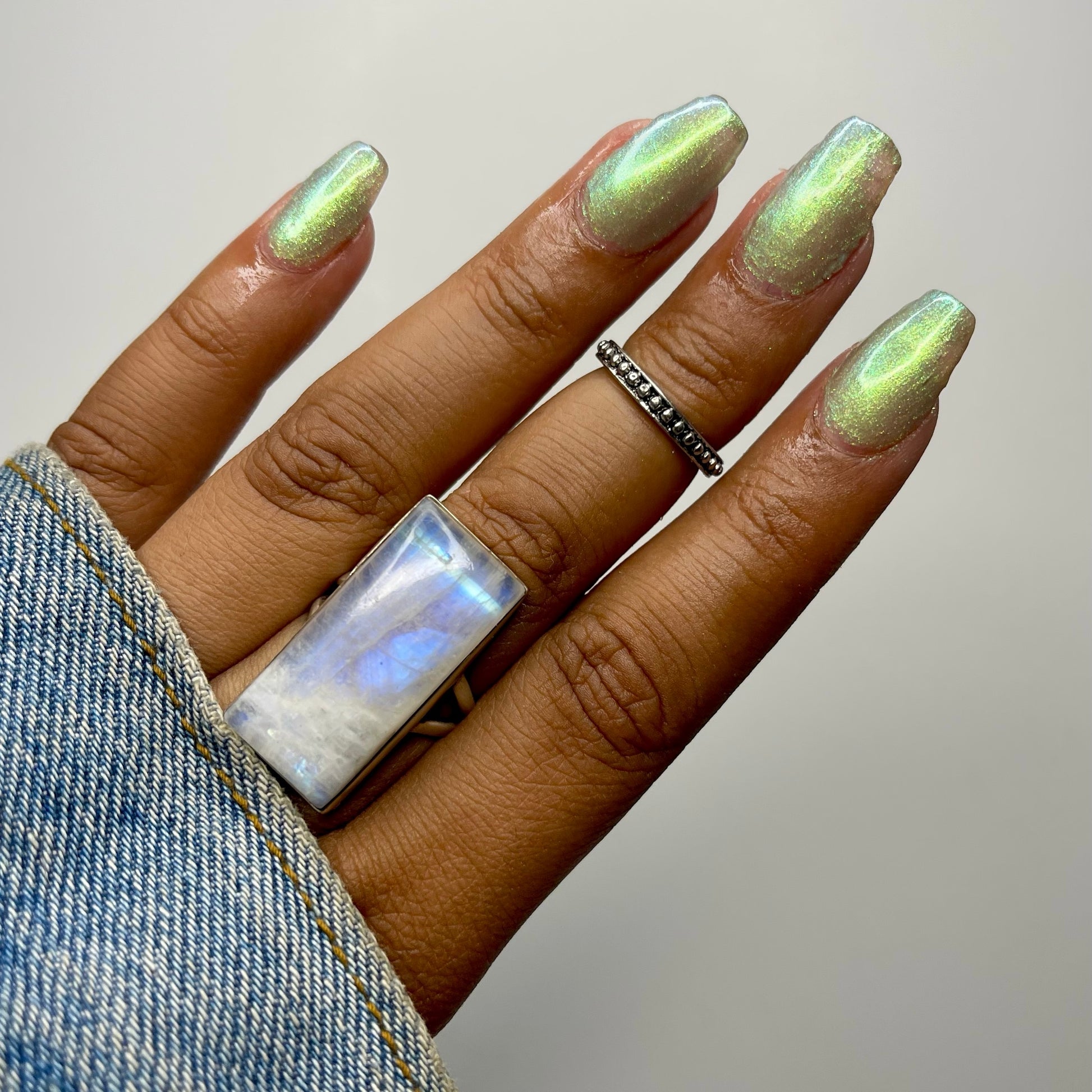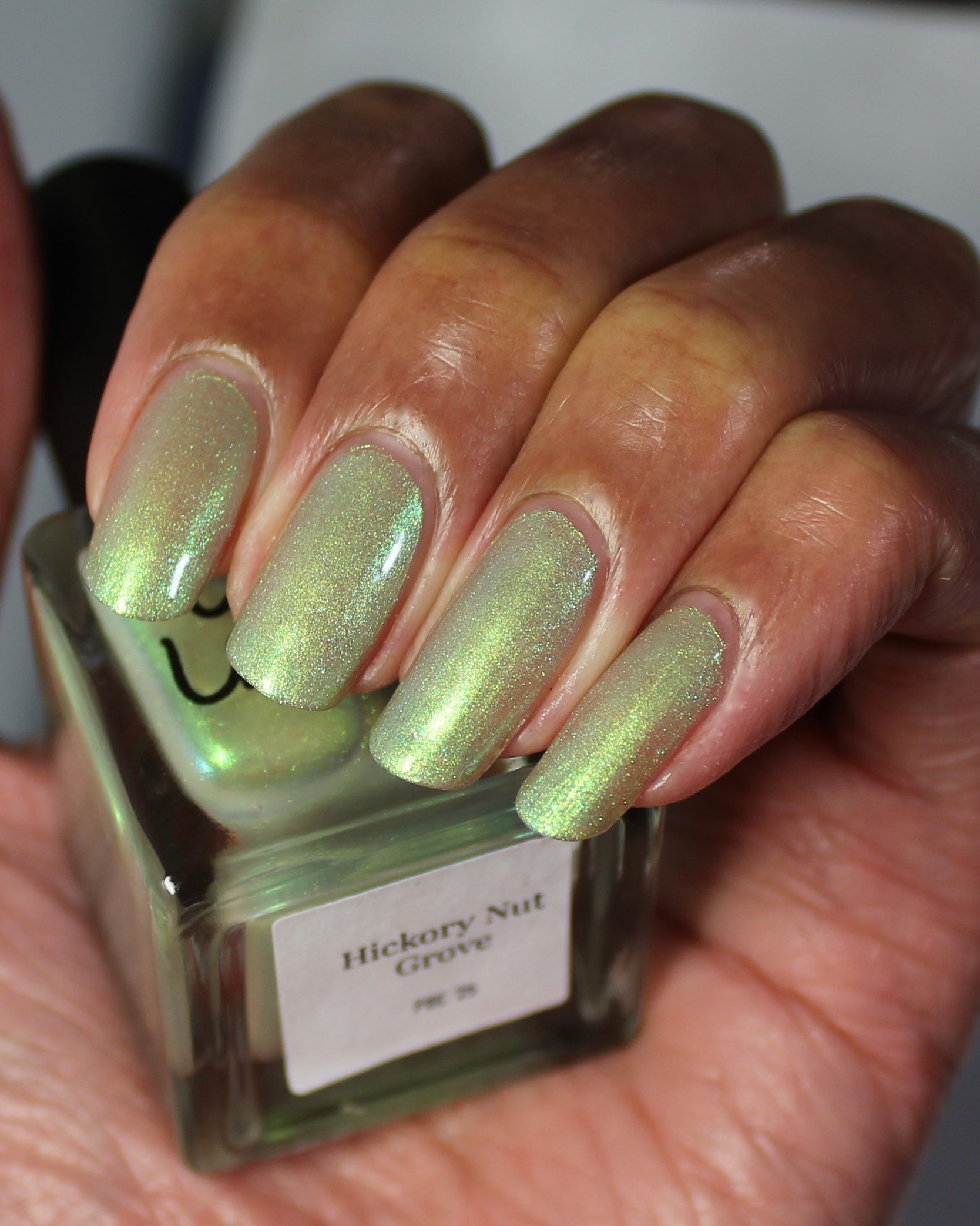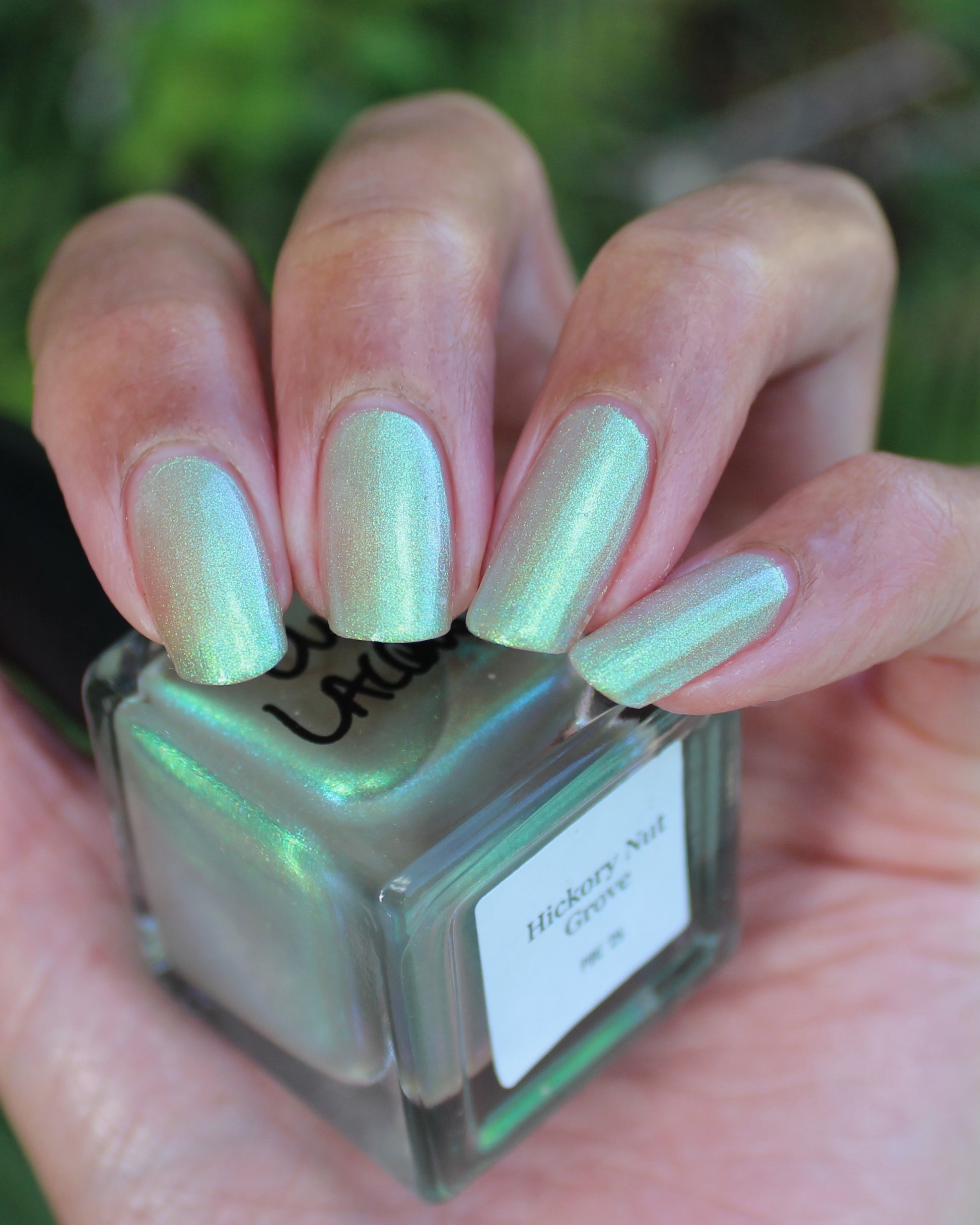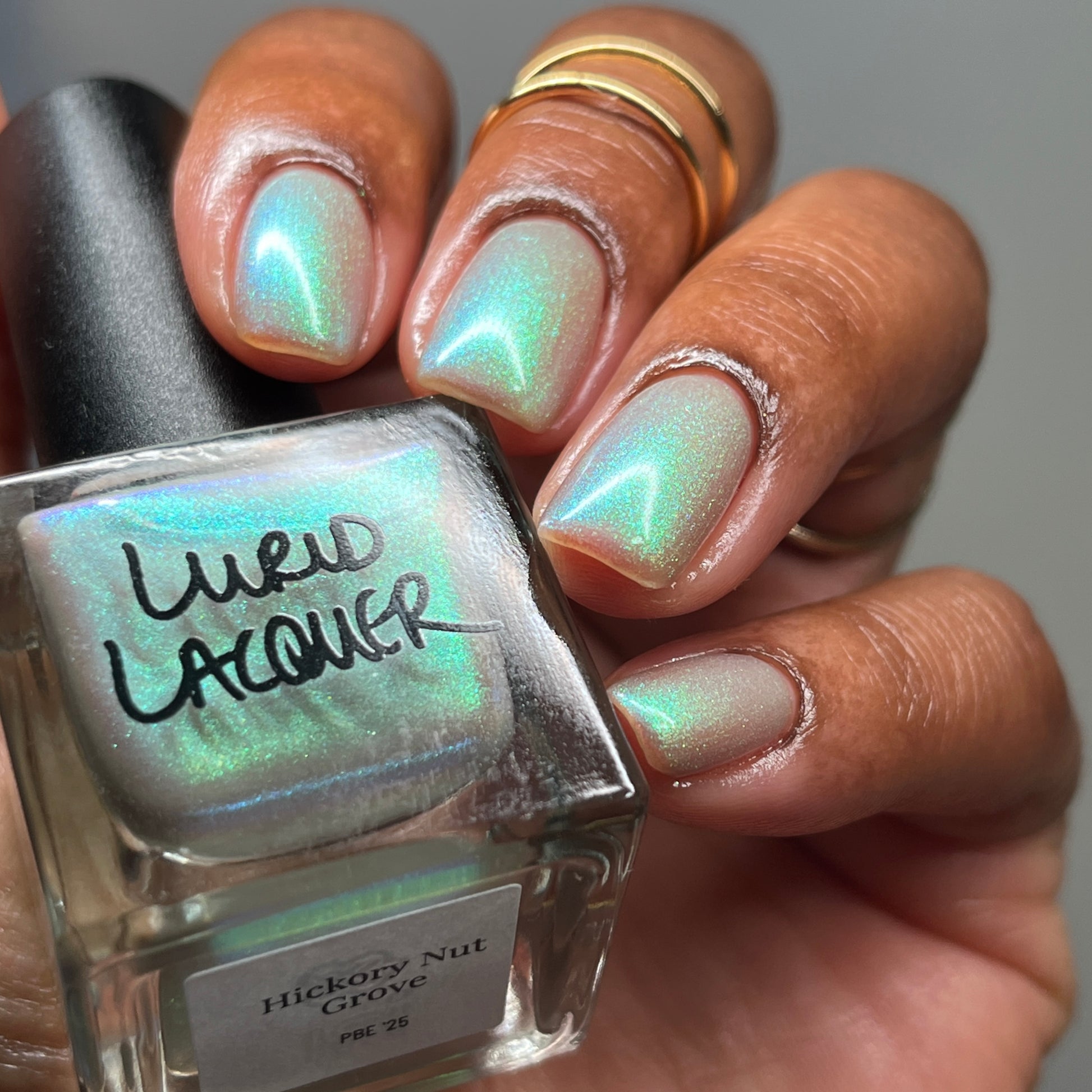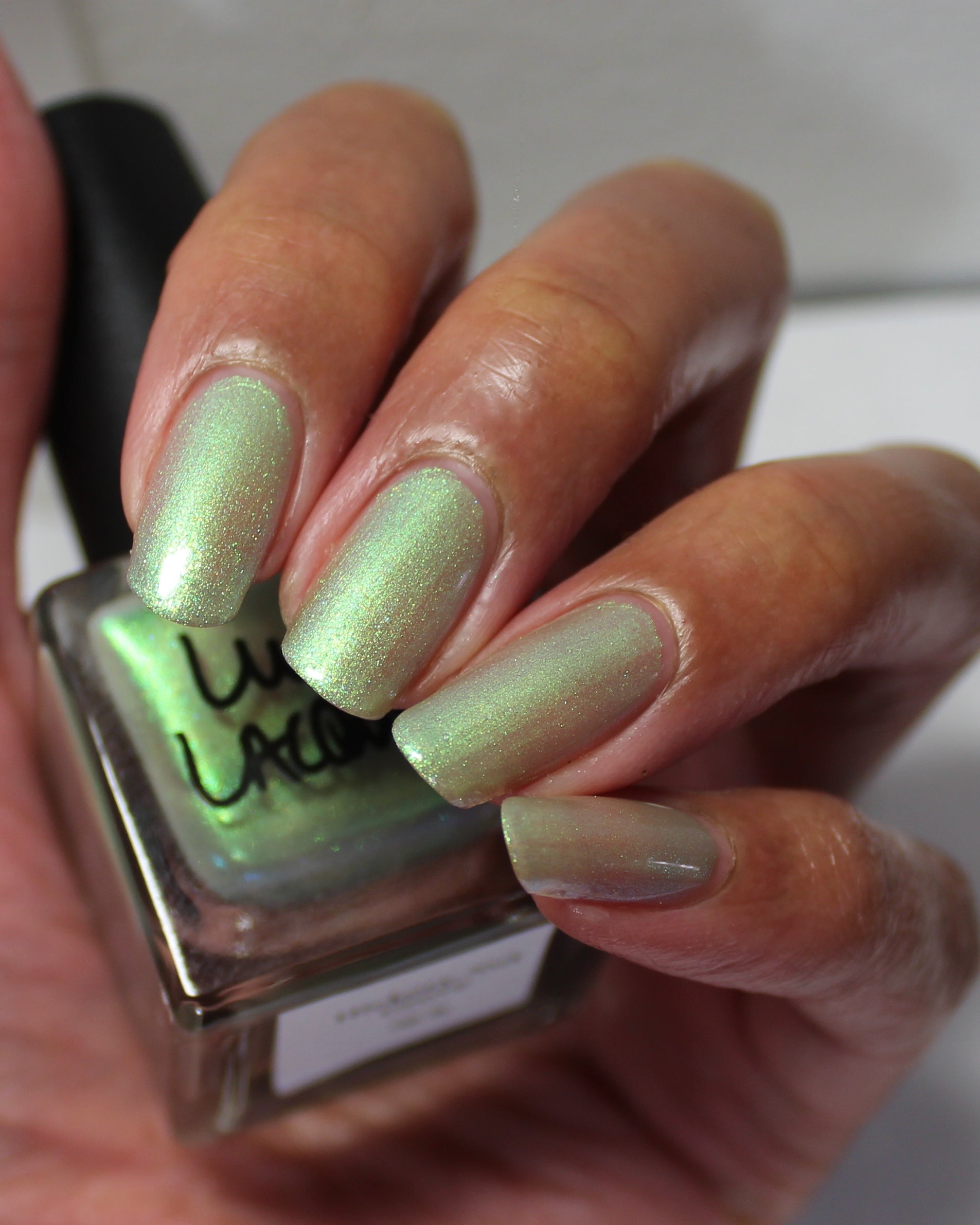 A semi-sheer taupe base with warm-toned green aurora shimmer that shifts to blue