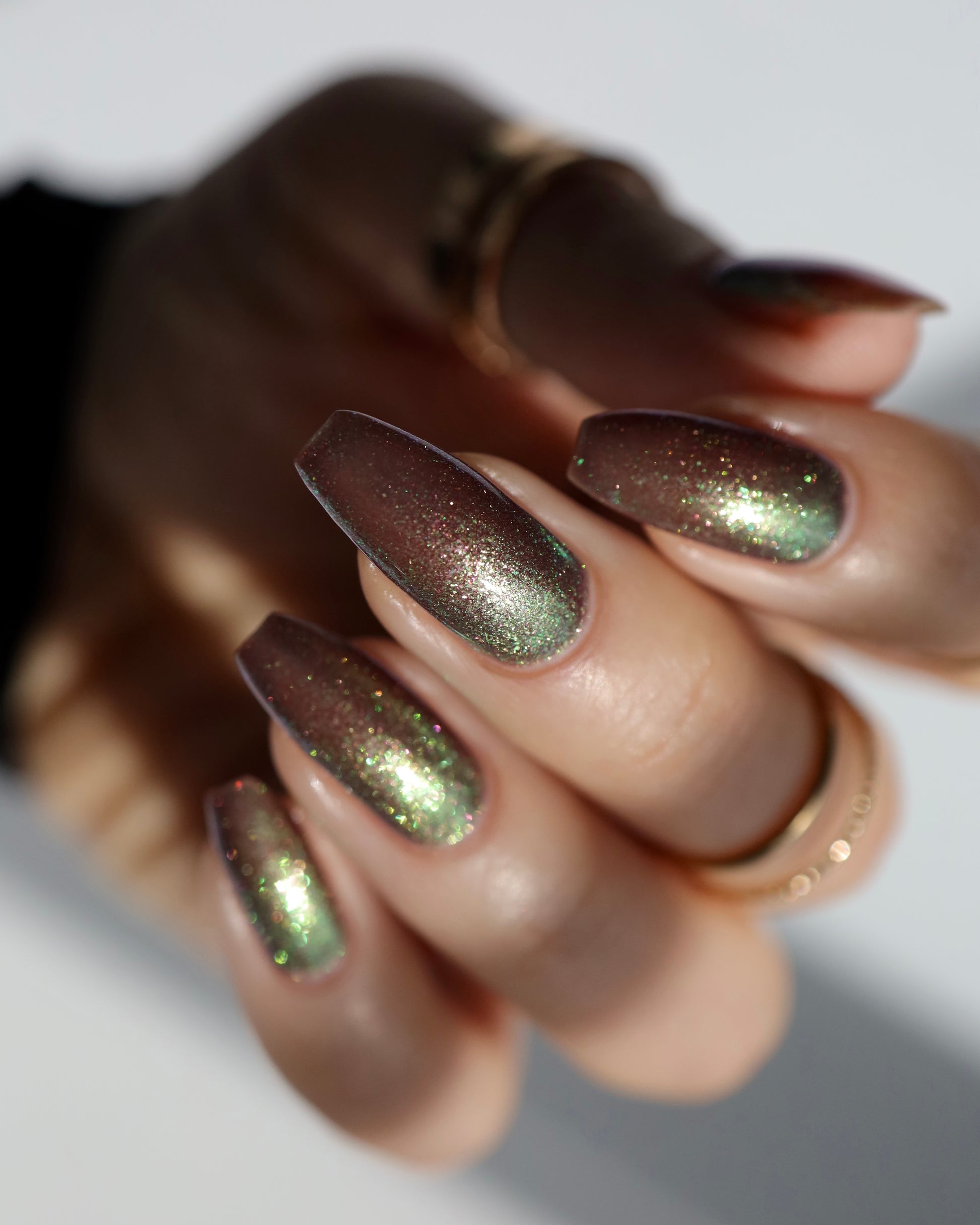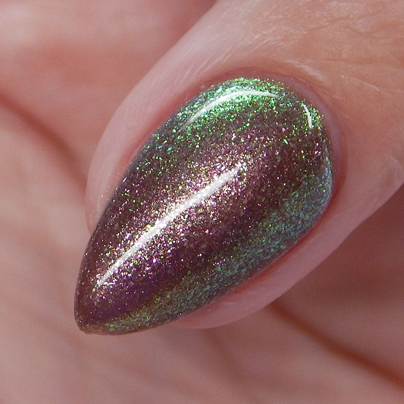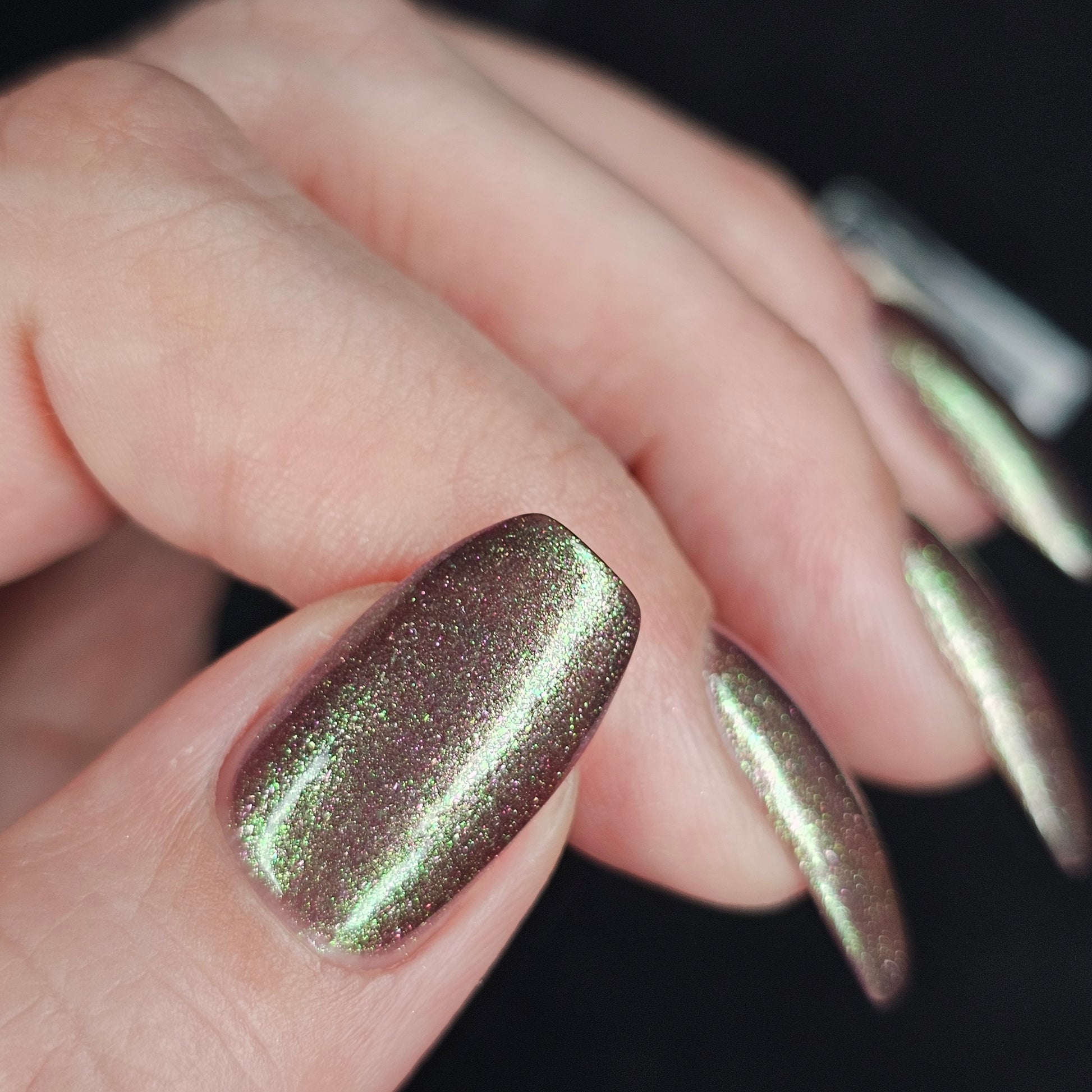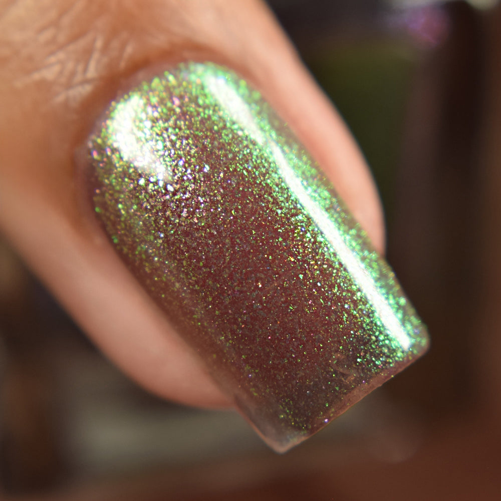 A cool-toned brown jelly base with a large particle aurora shimmer that shifts from silvery pink to green