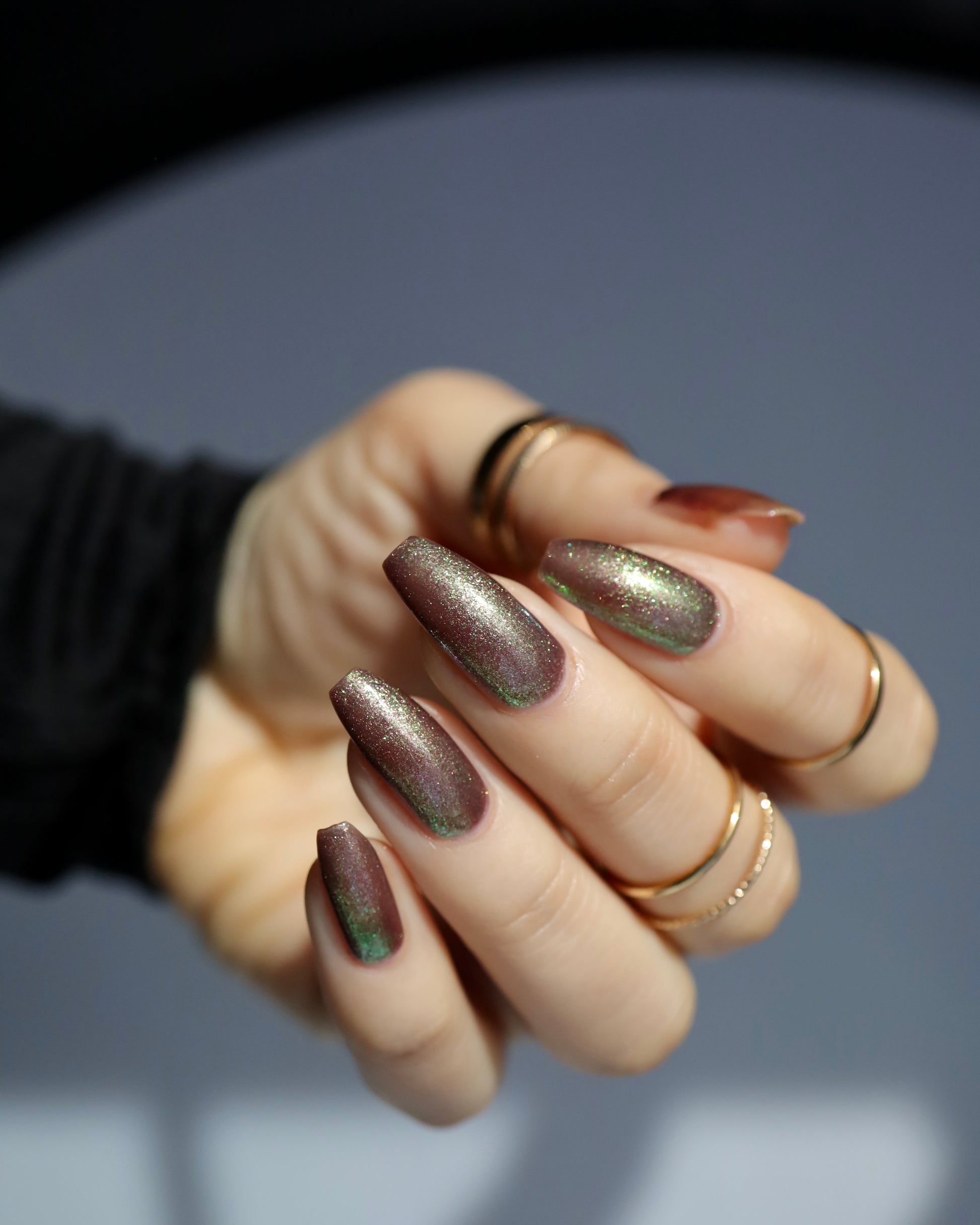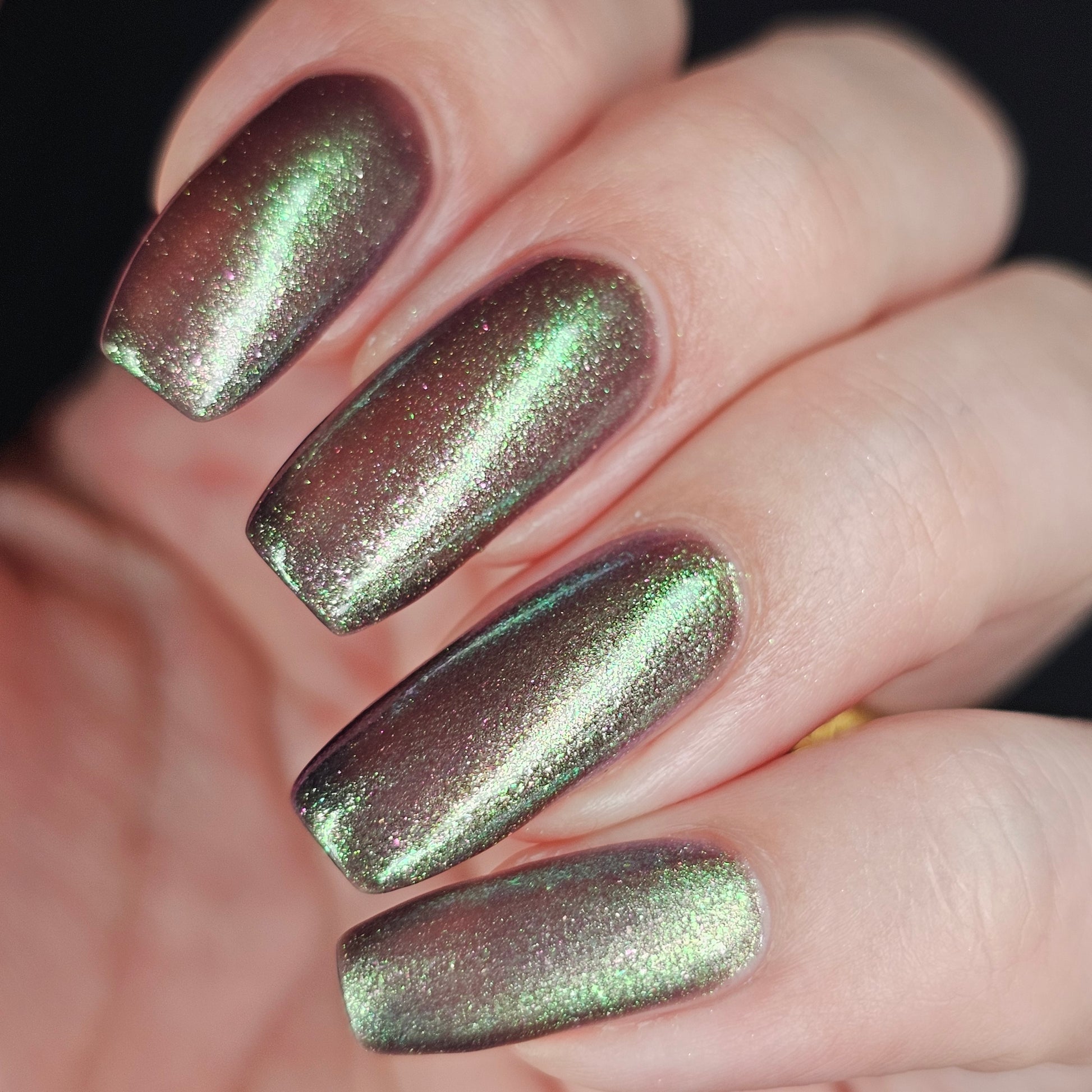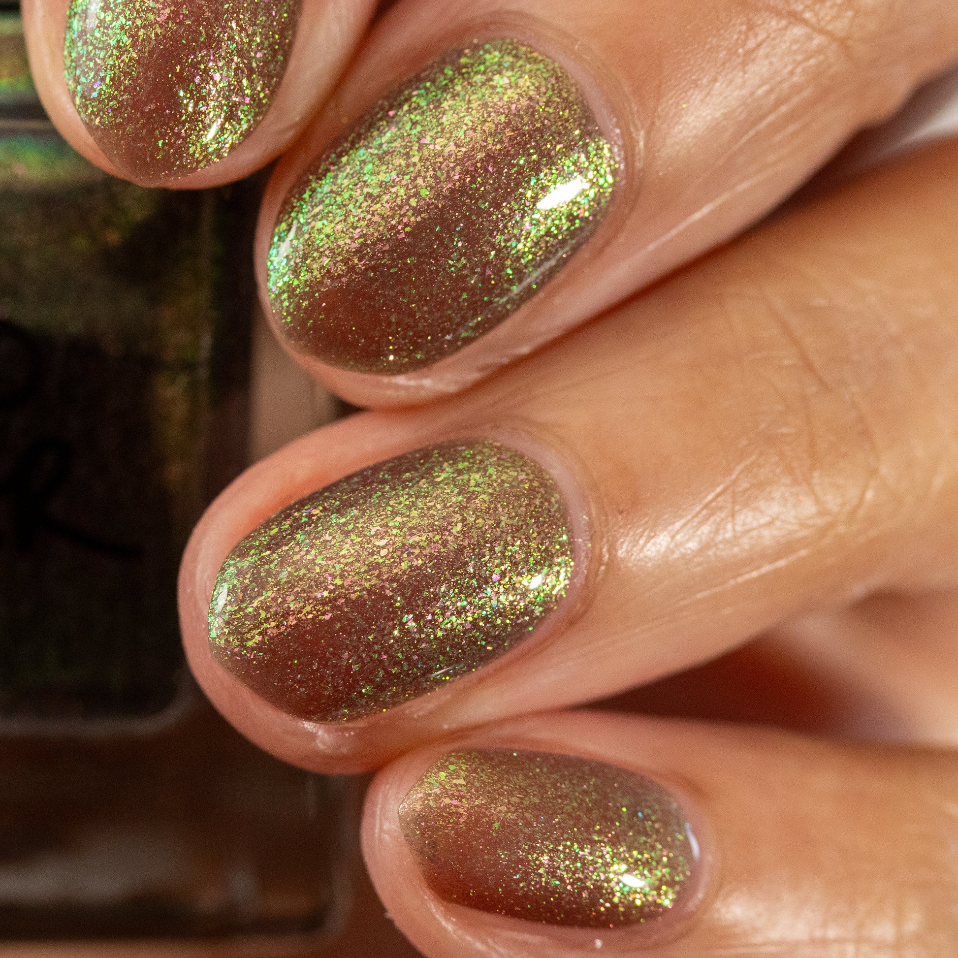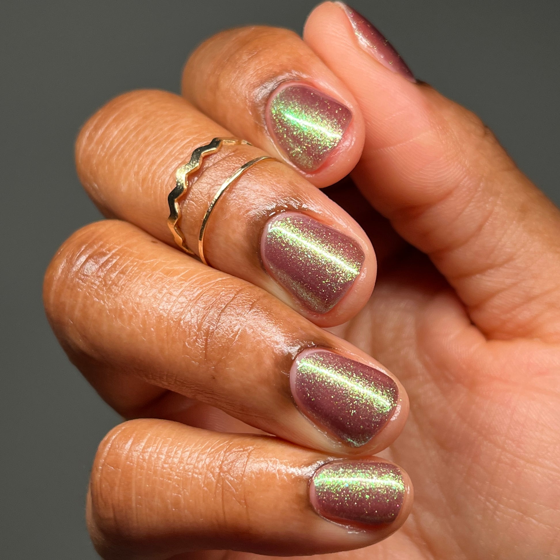 A cool-toned brown jelly base with a large particle aurora shimmer that shifts from silvery pink to green