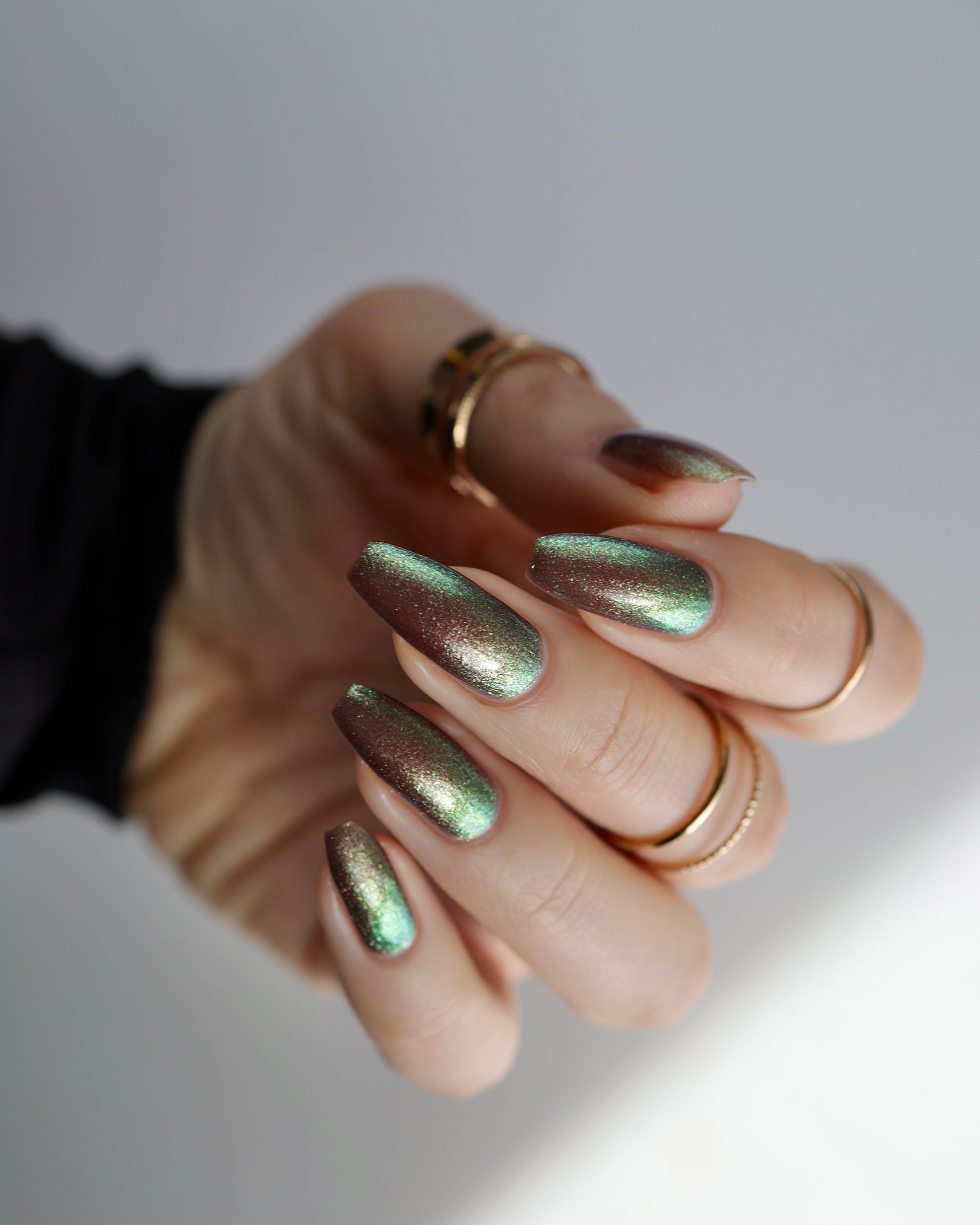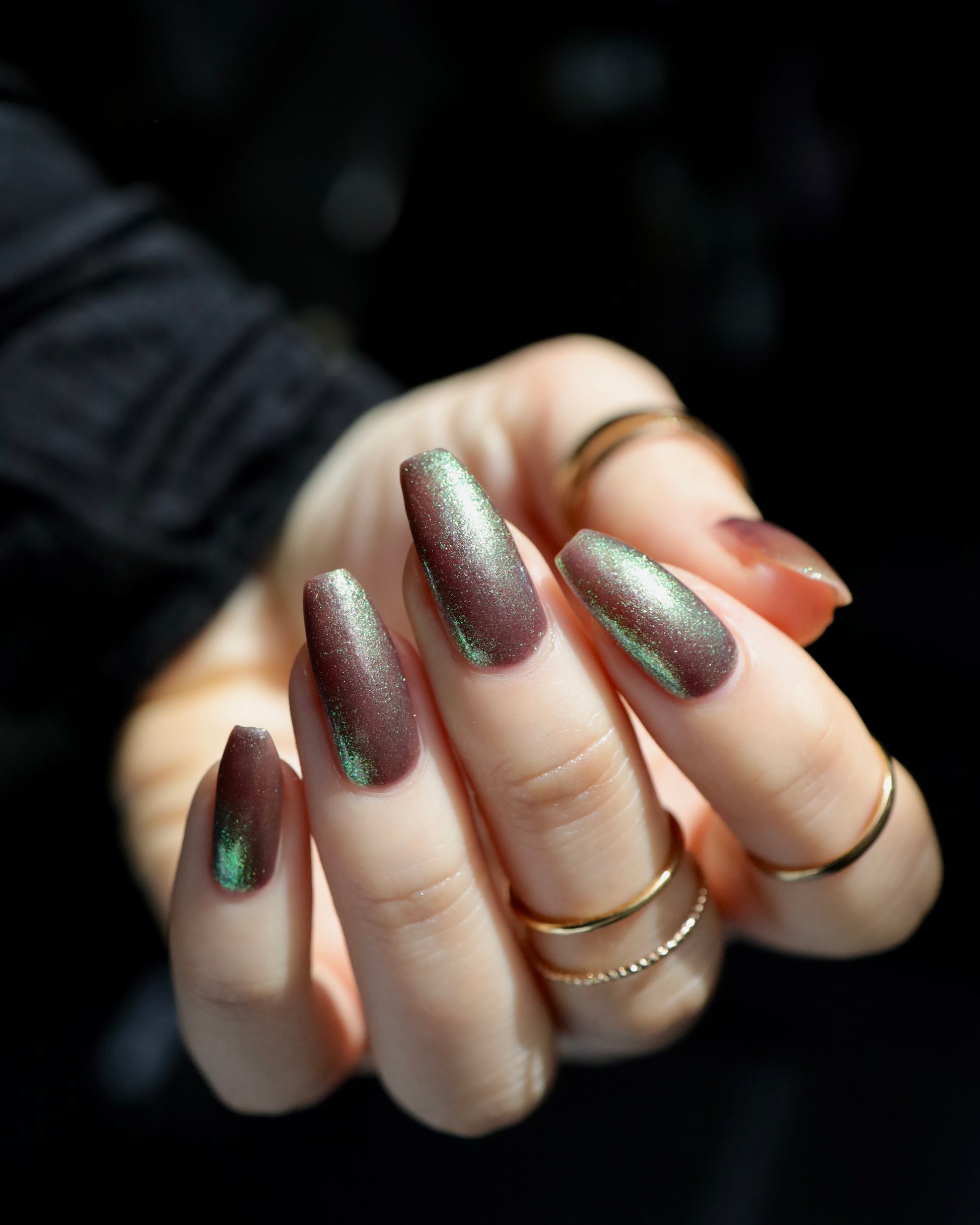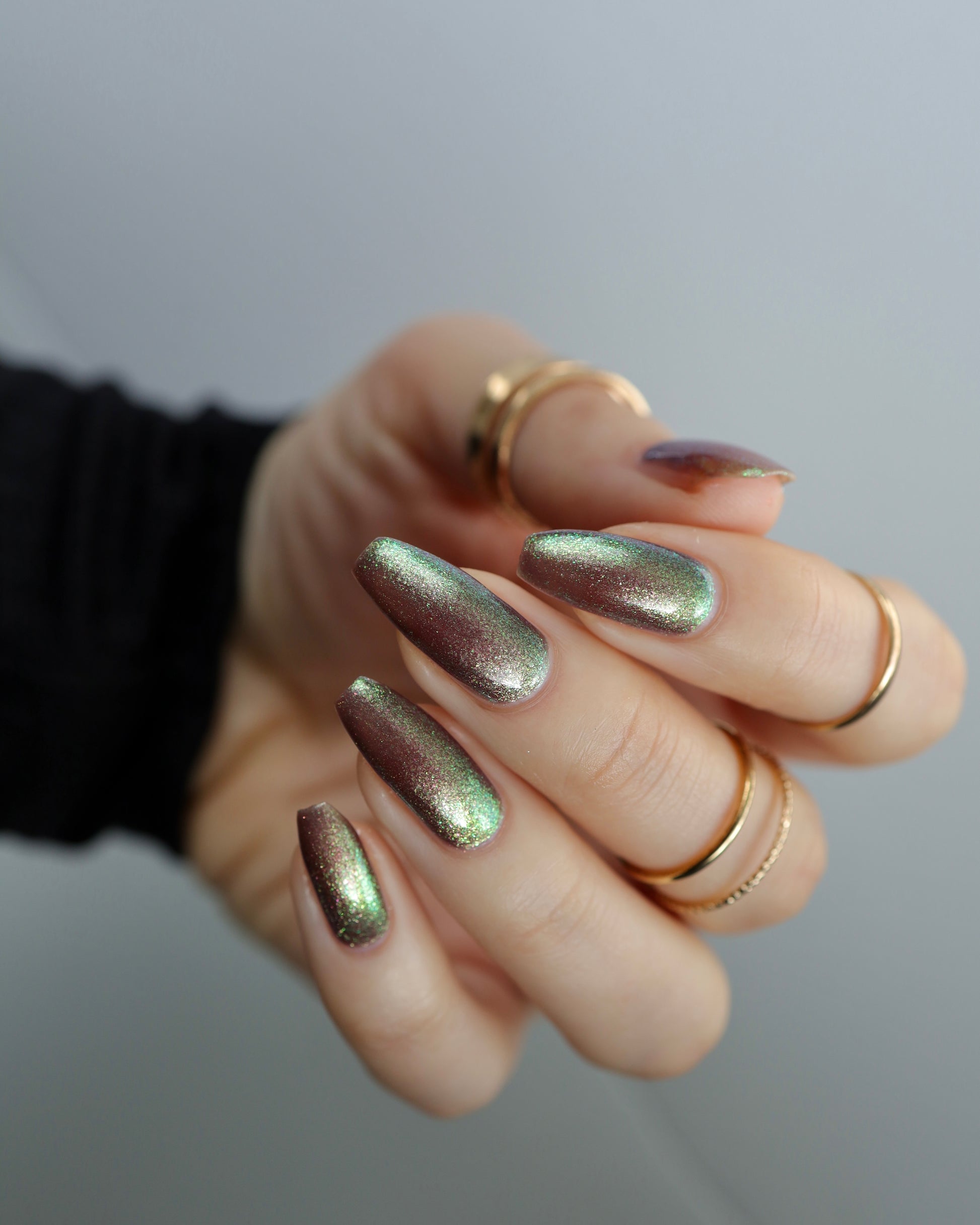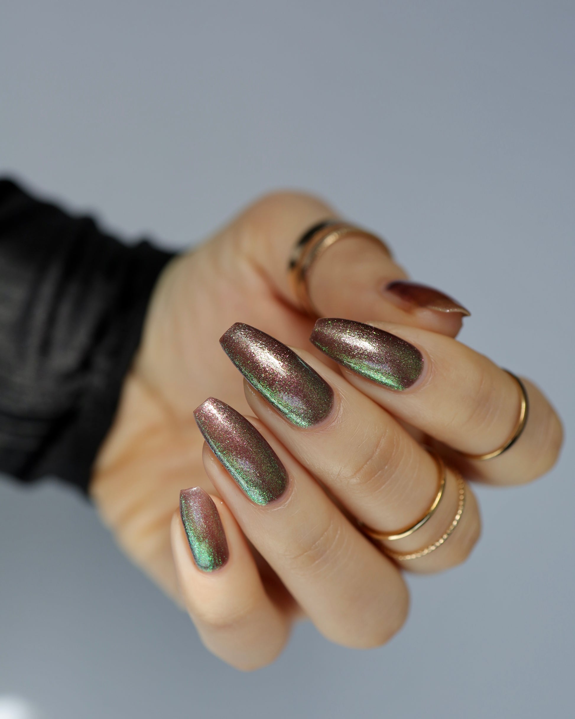 A cool-toned brown jelly base with a large particle aurora shimmer that shifts from silvery pink to green