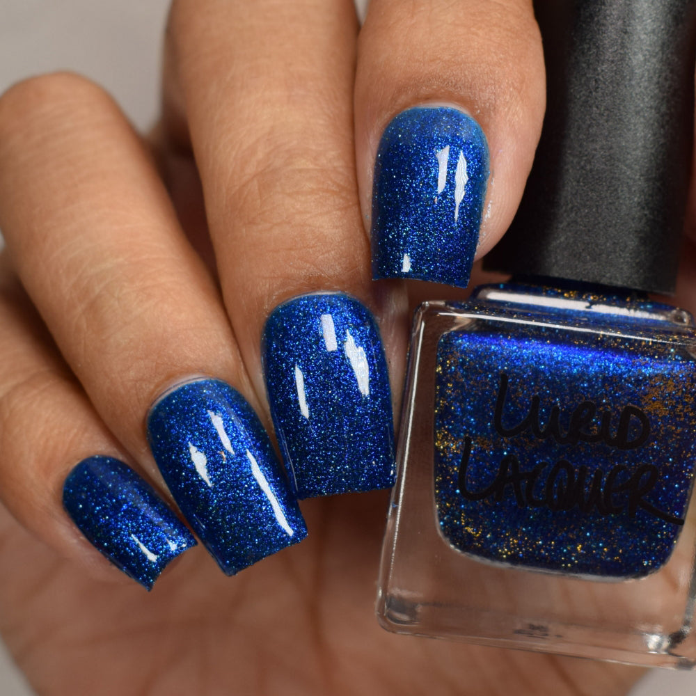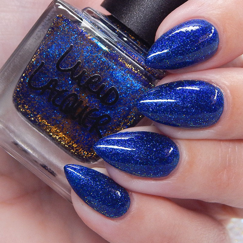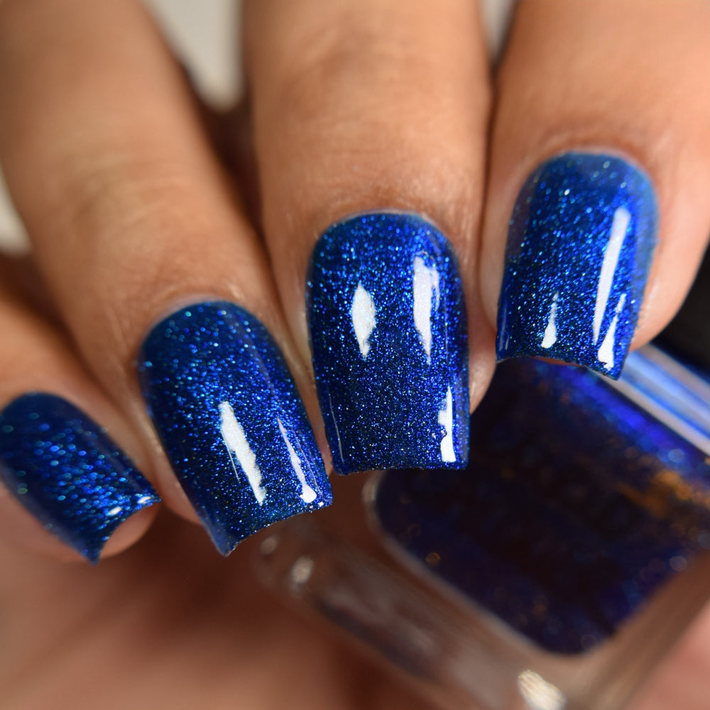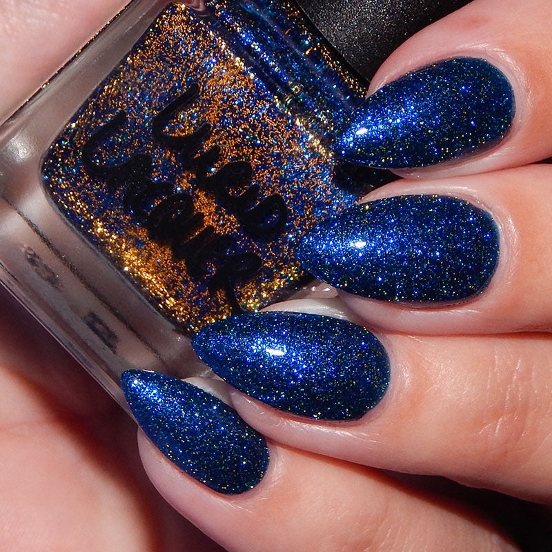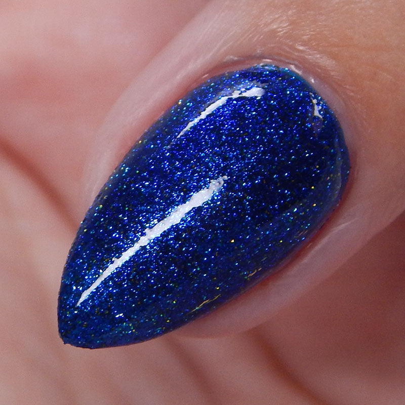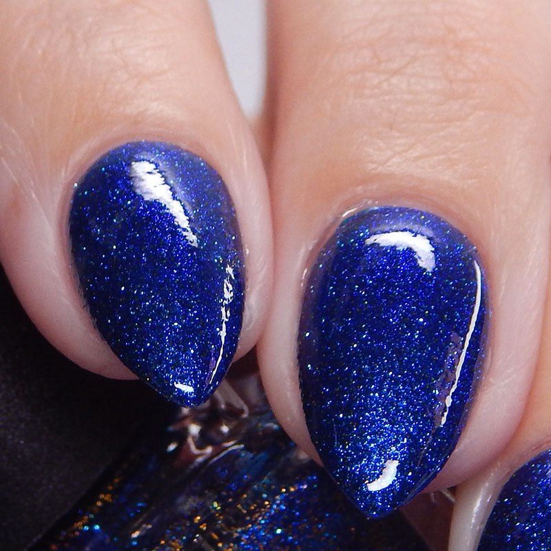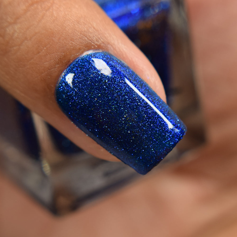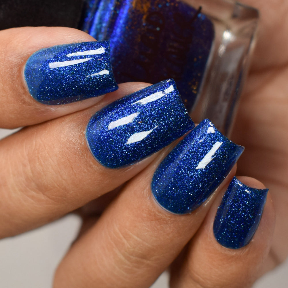 A rich cobalt base with a warm blue aurora shimmer that shifts to purple and bronze light reflective glitter