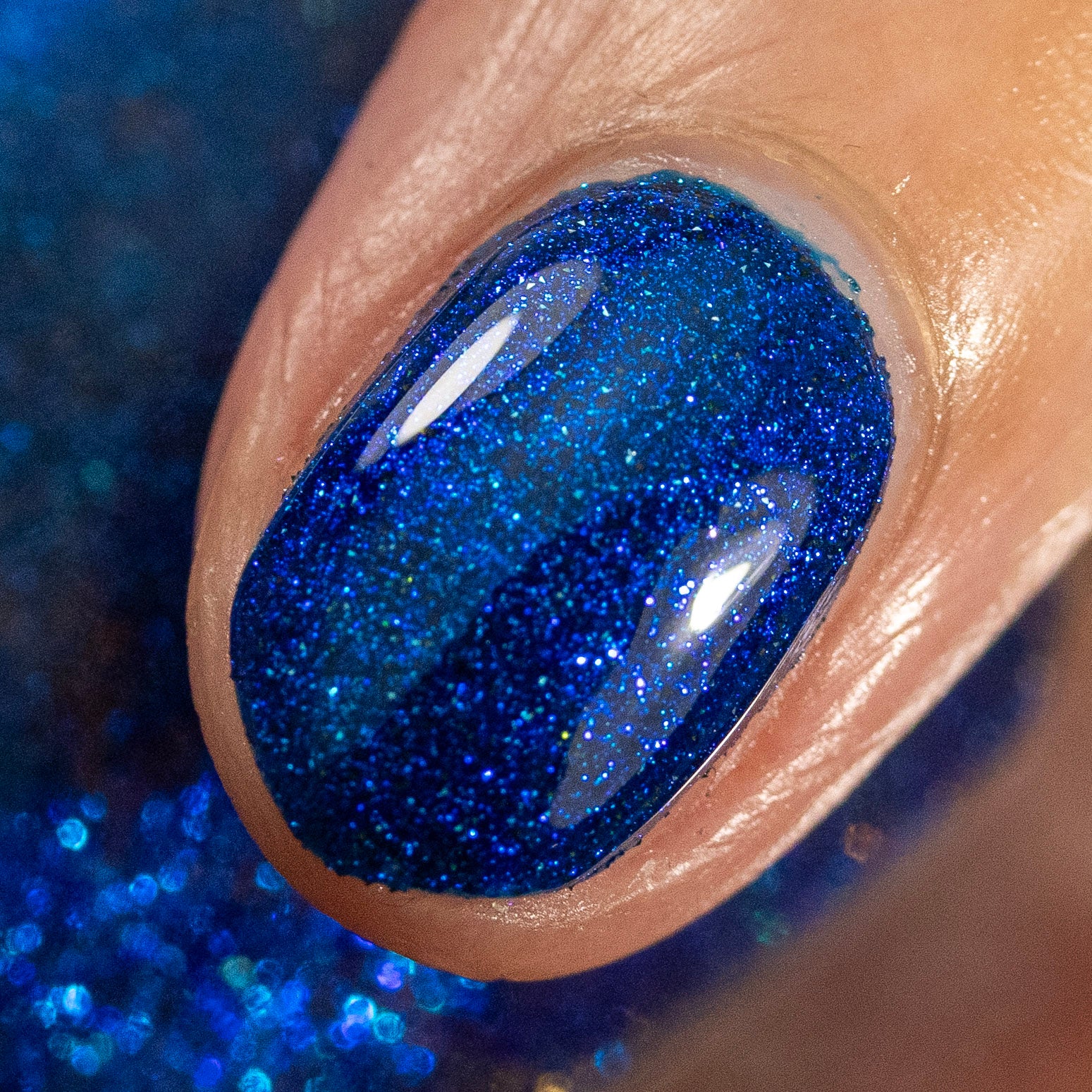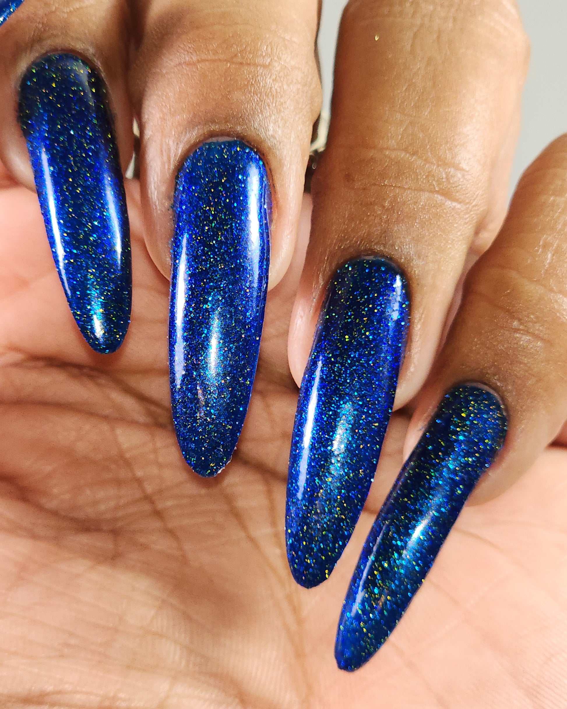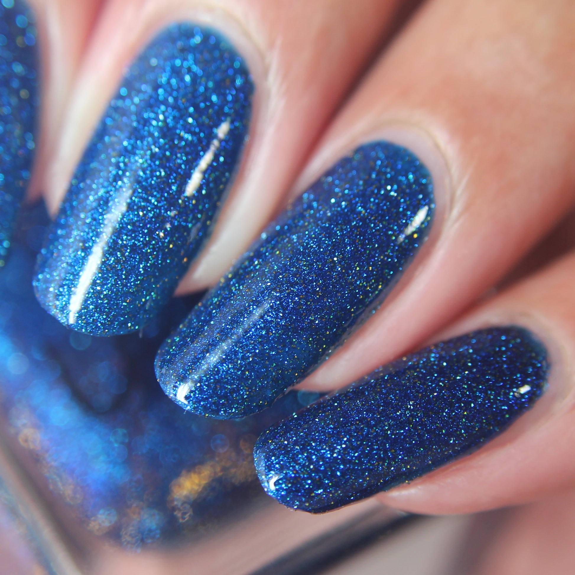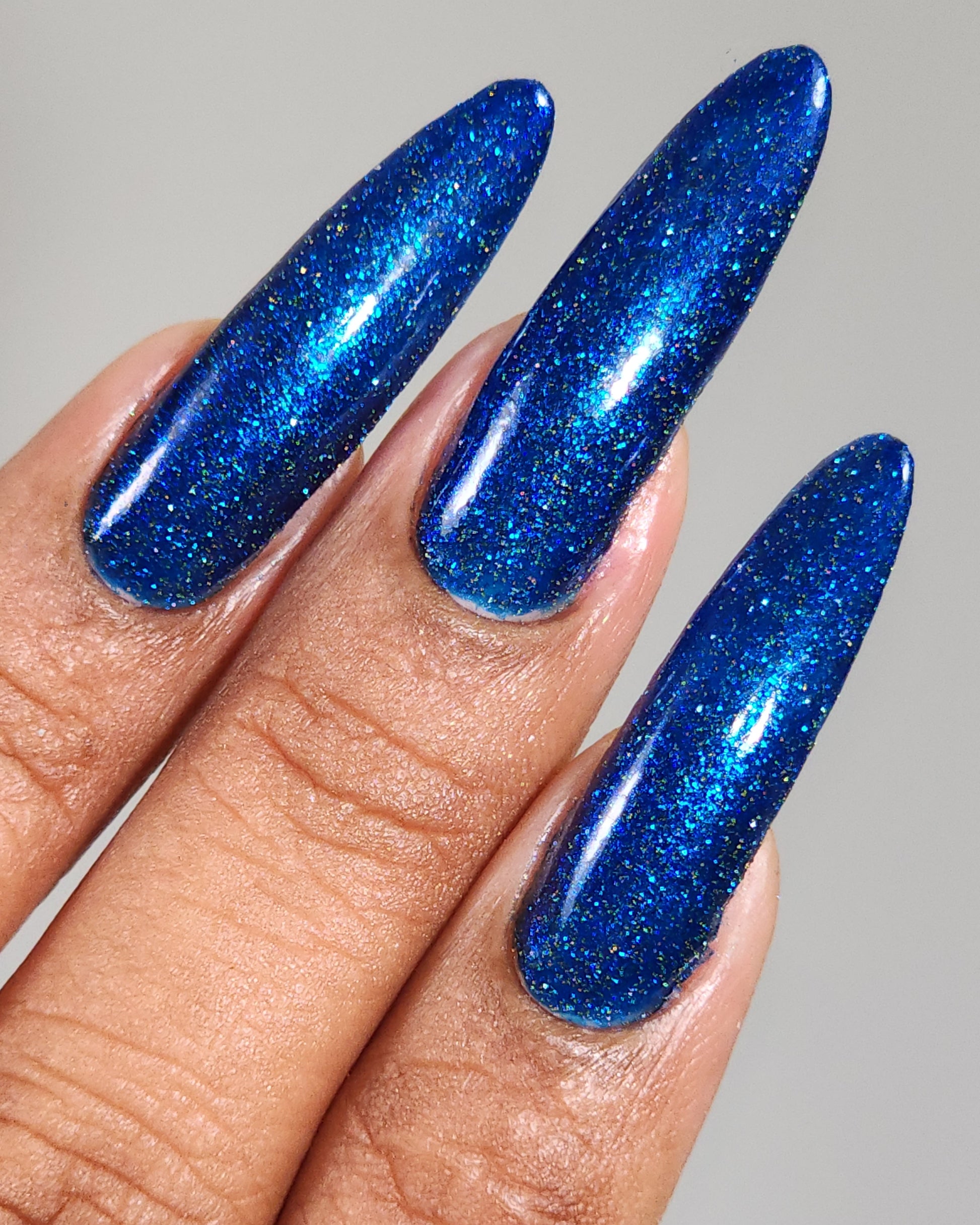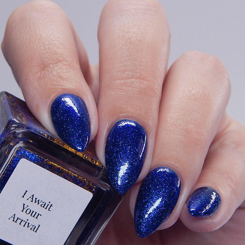A rich cobalt base with a warm blue aurora shimmer that shifts to purple and bronze light reflective glitter