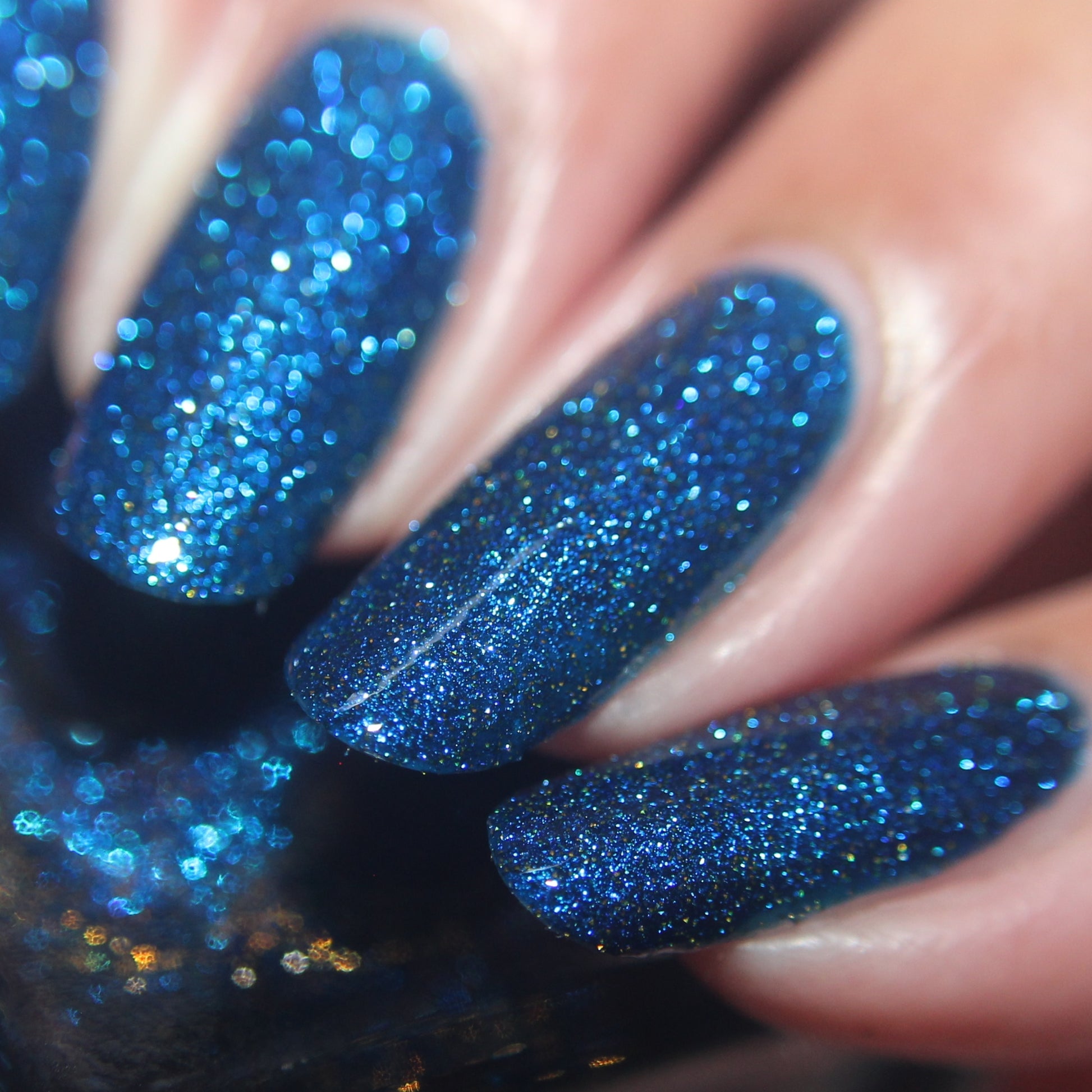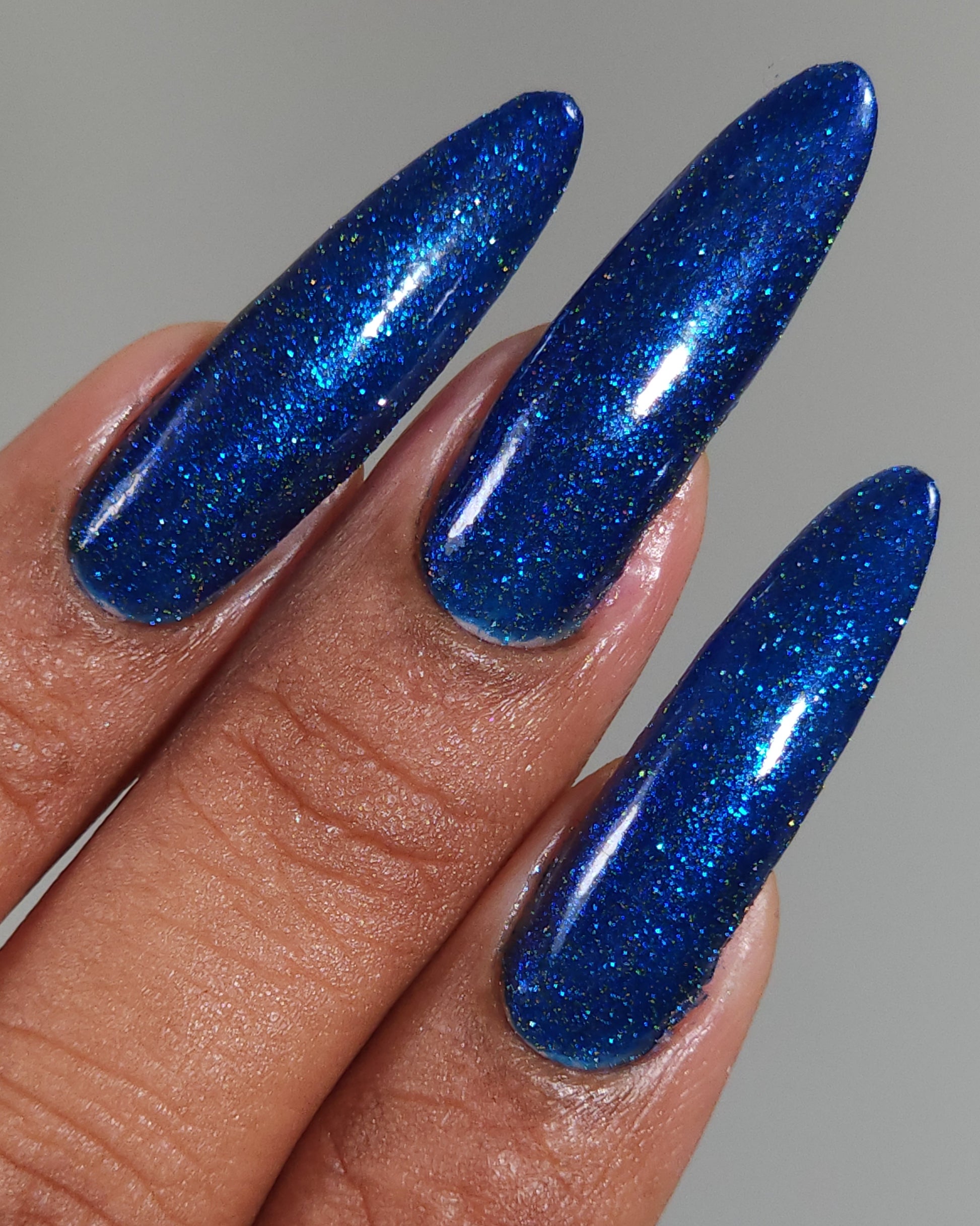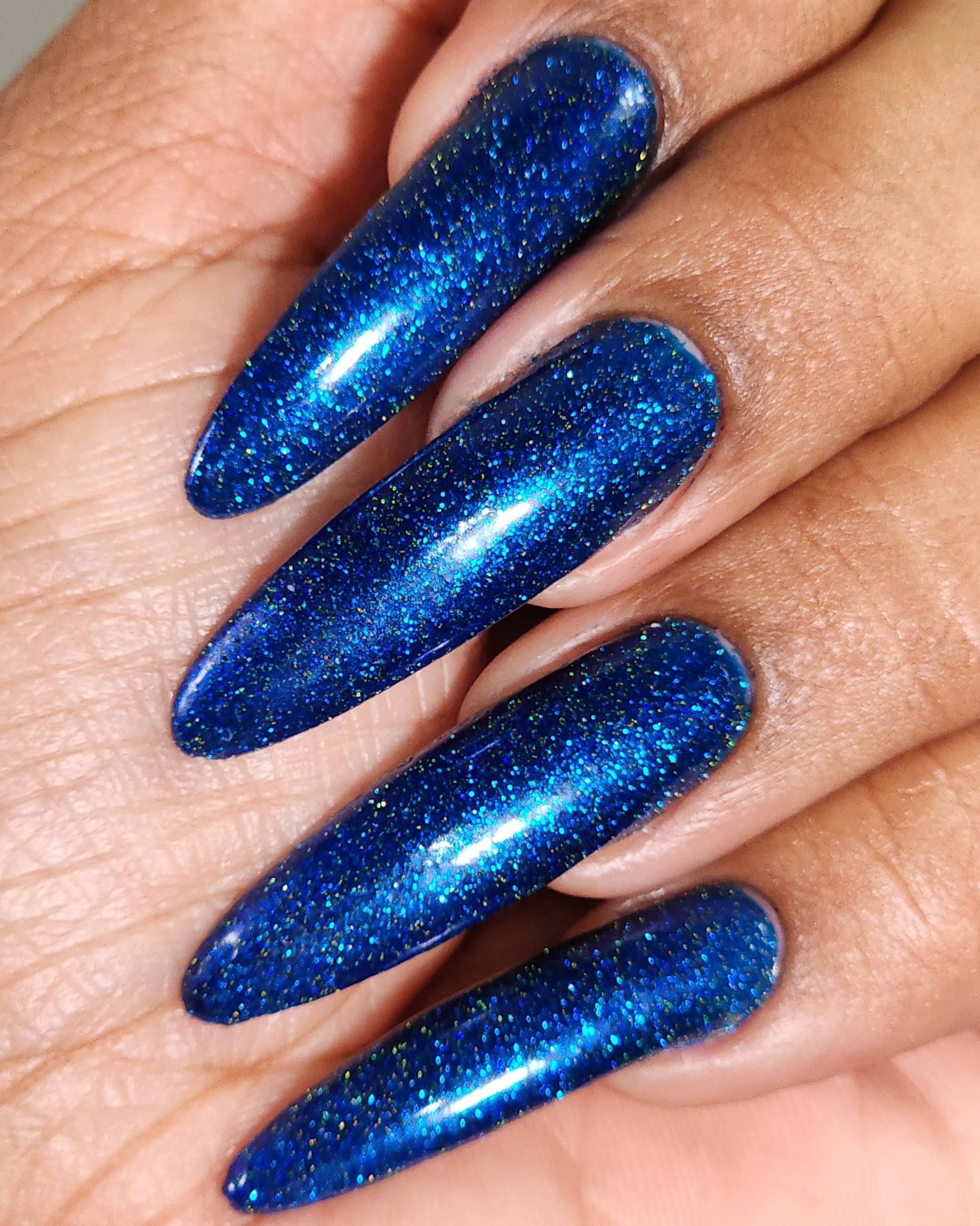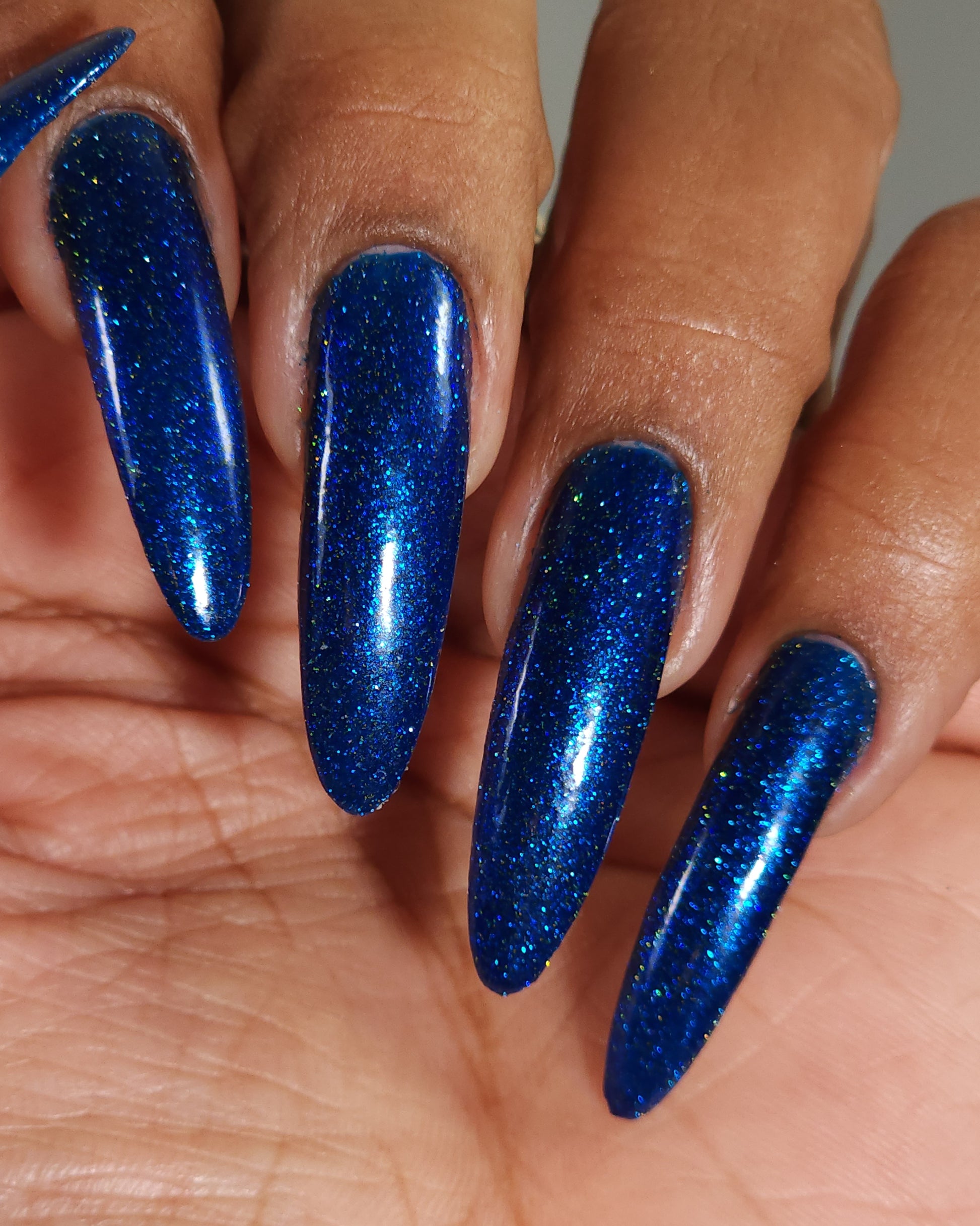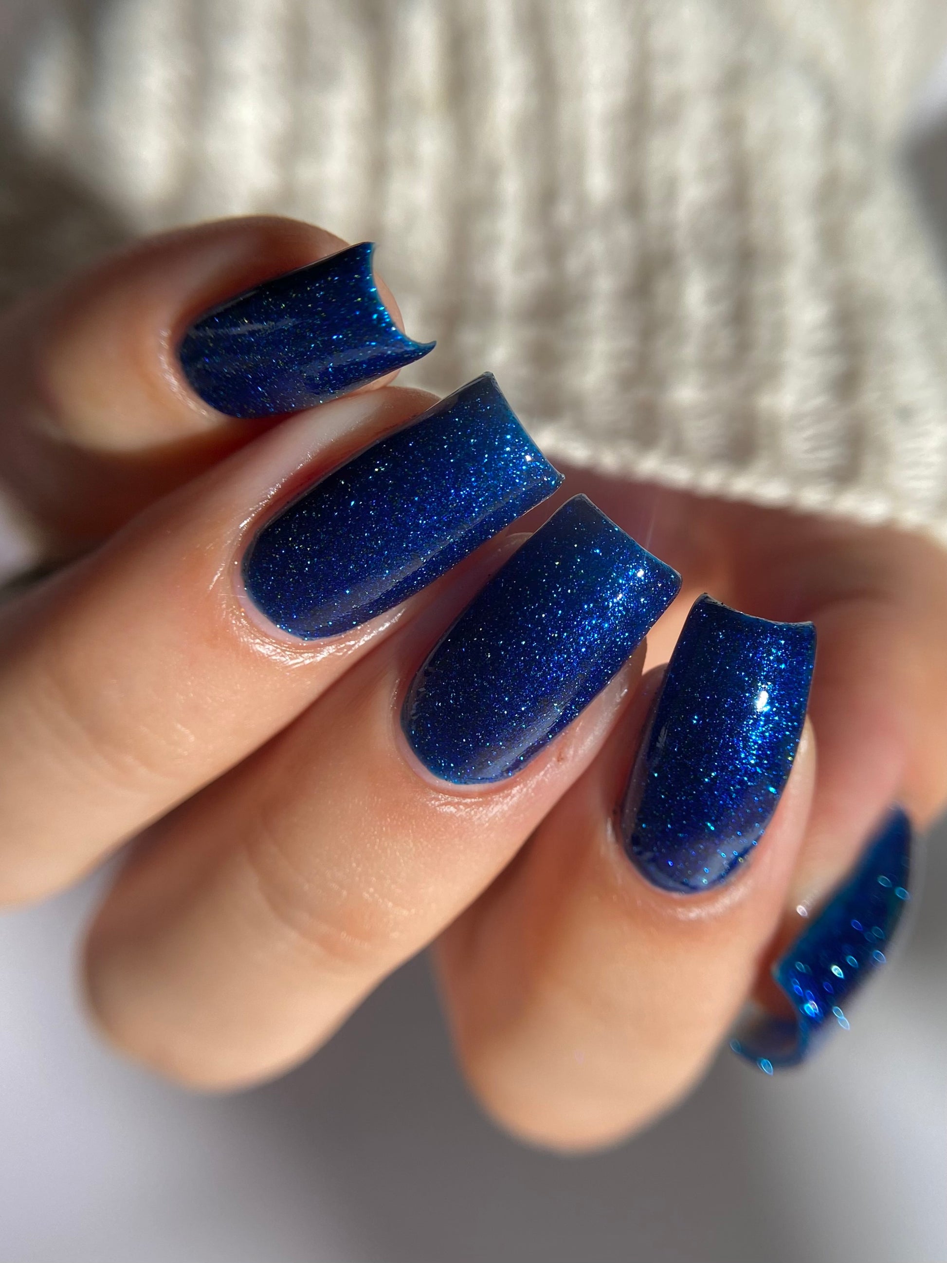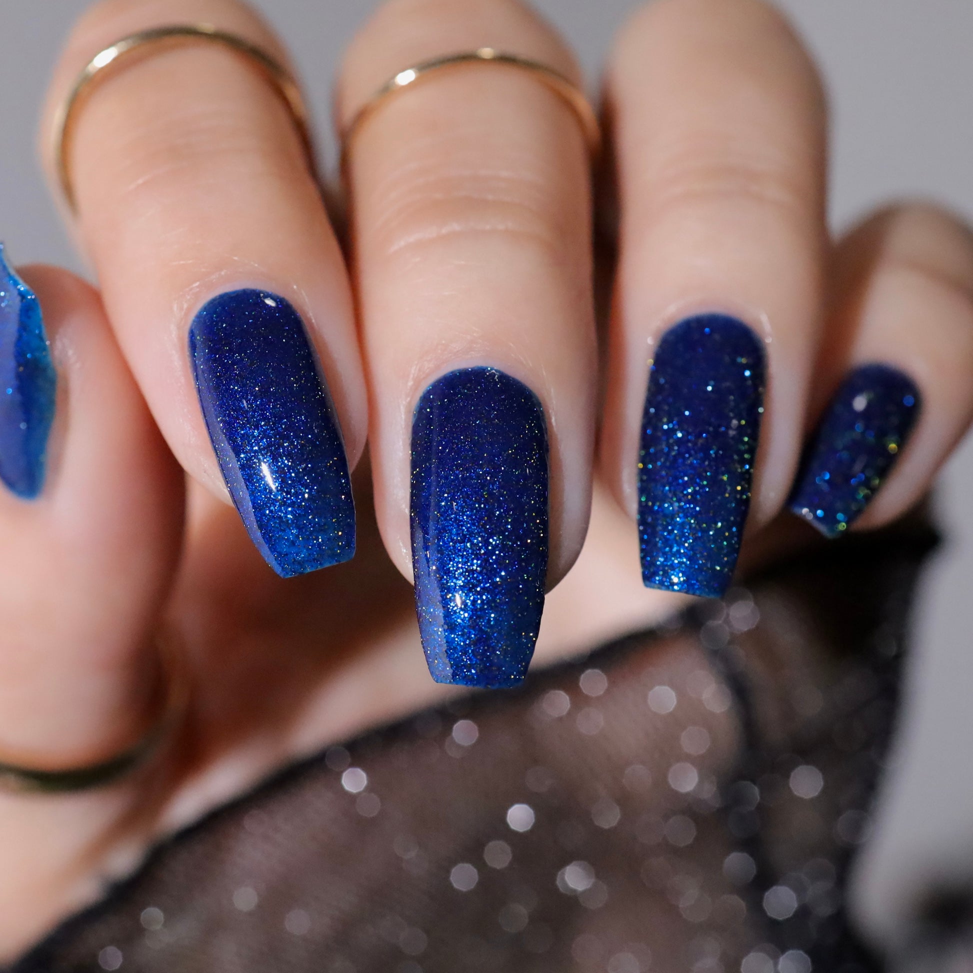A rich cobalt base with a warm blue aurora shimmer that shifts to purple and bronze light reflective glitter