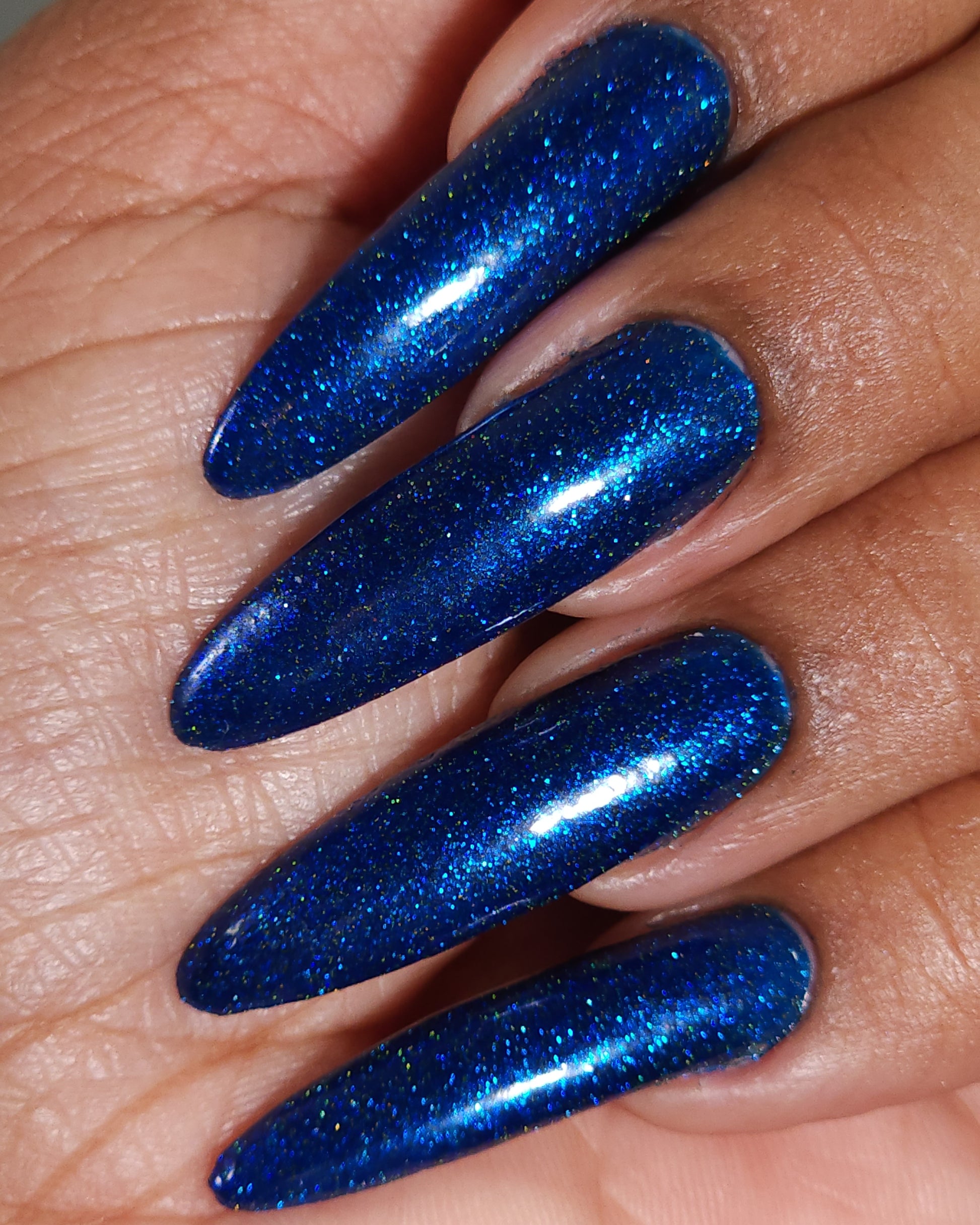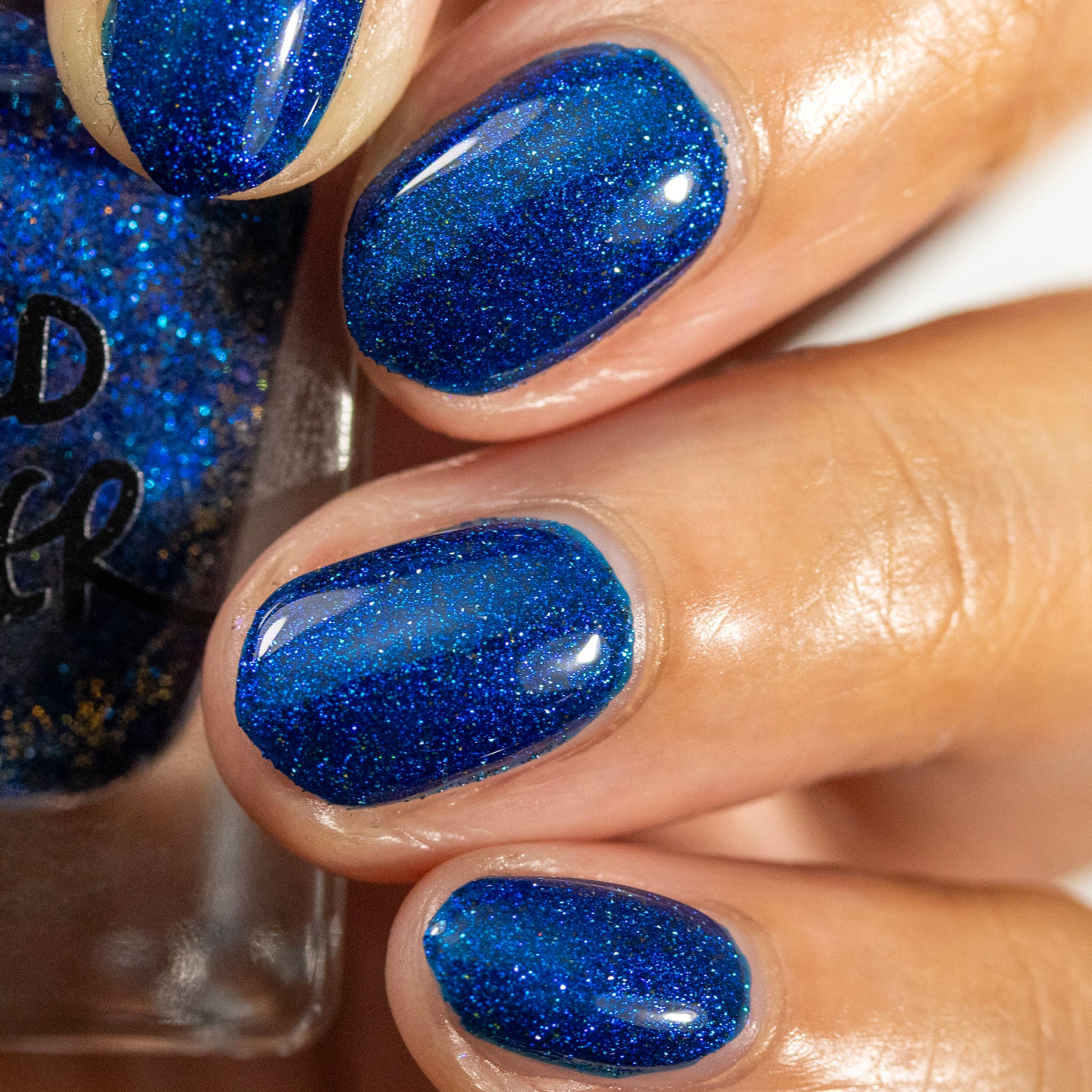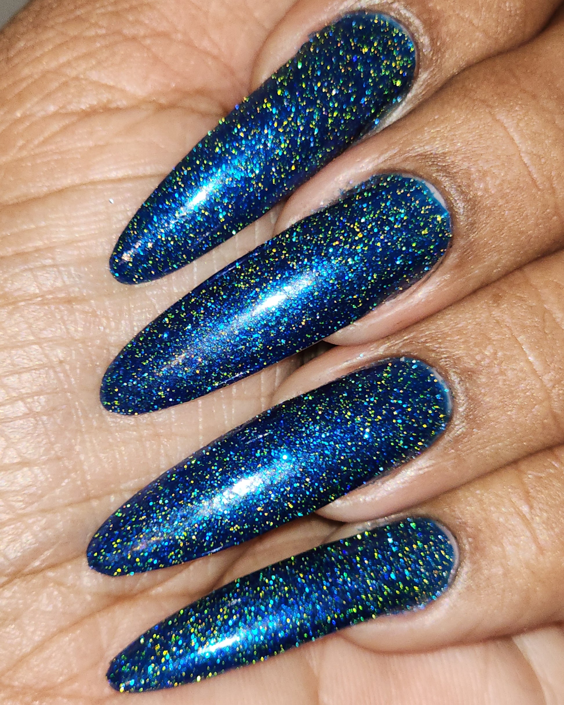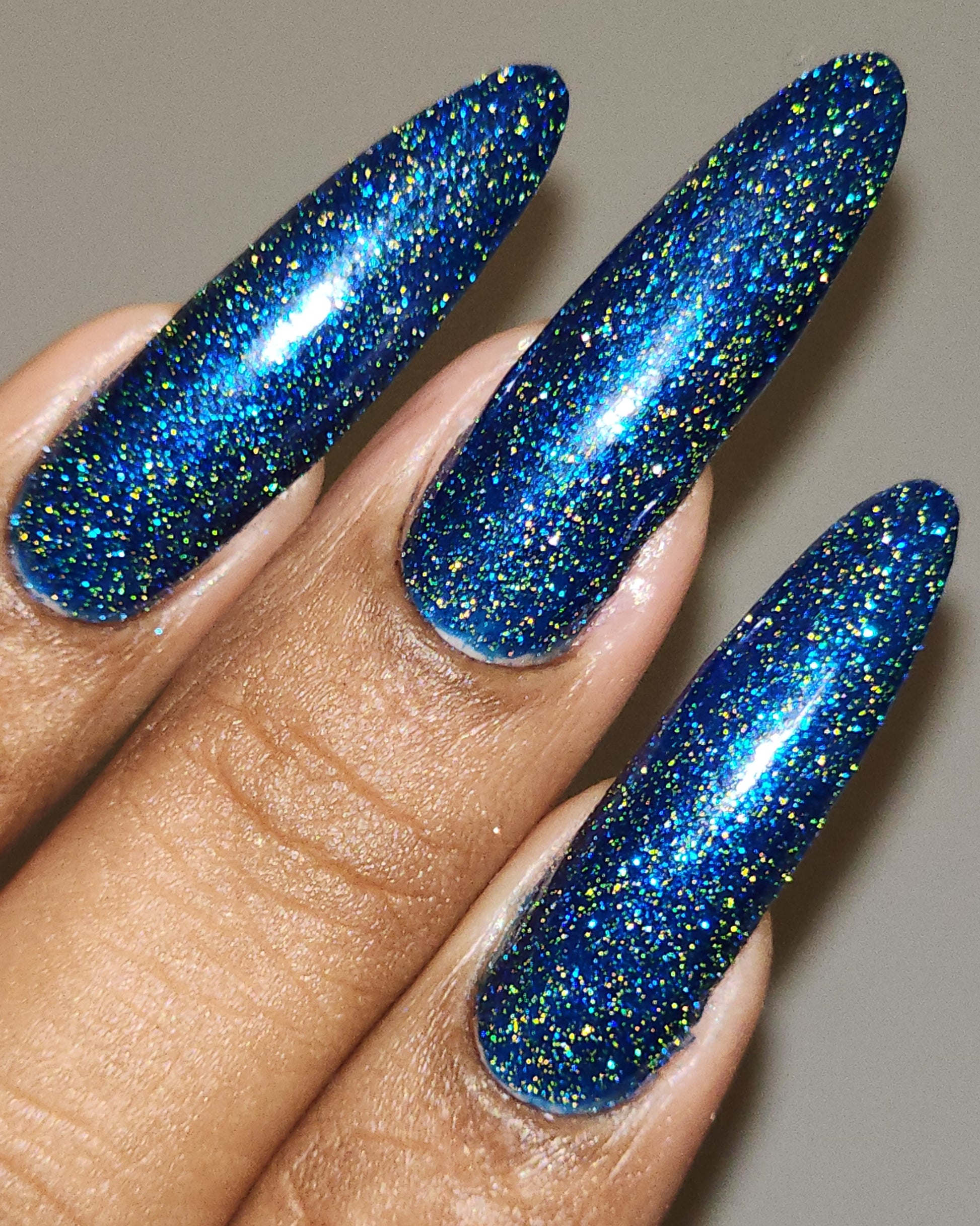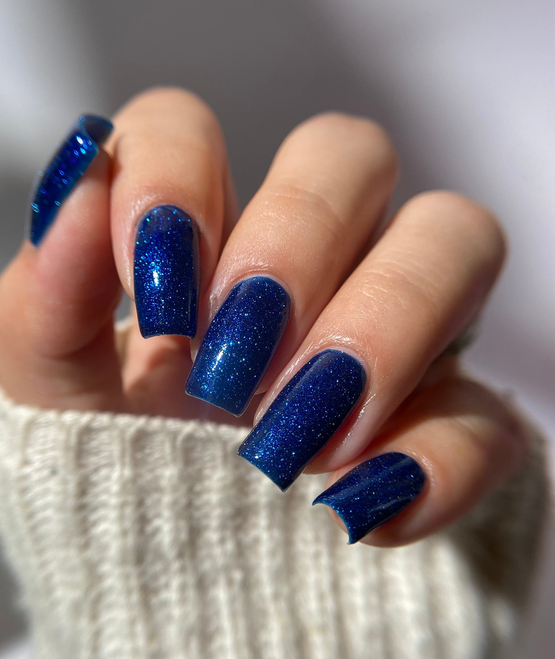 A rich cobalt base with a warm blue aurora shimmer that shifts to purple and bronze light reflective glitter