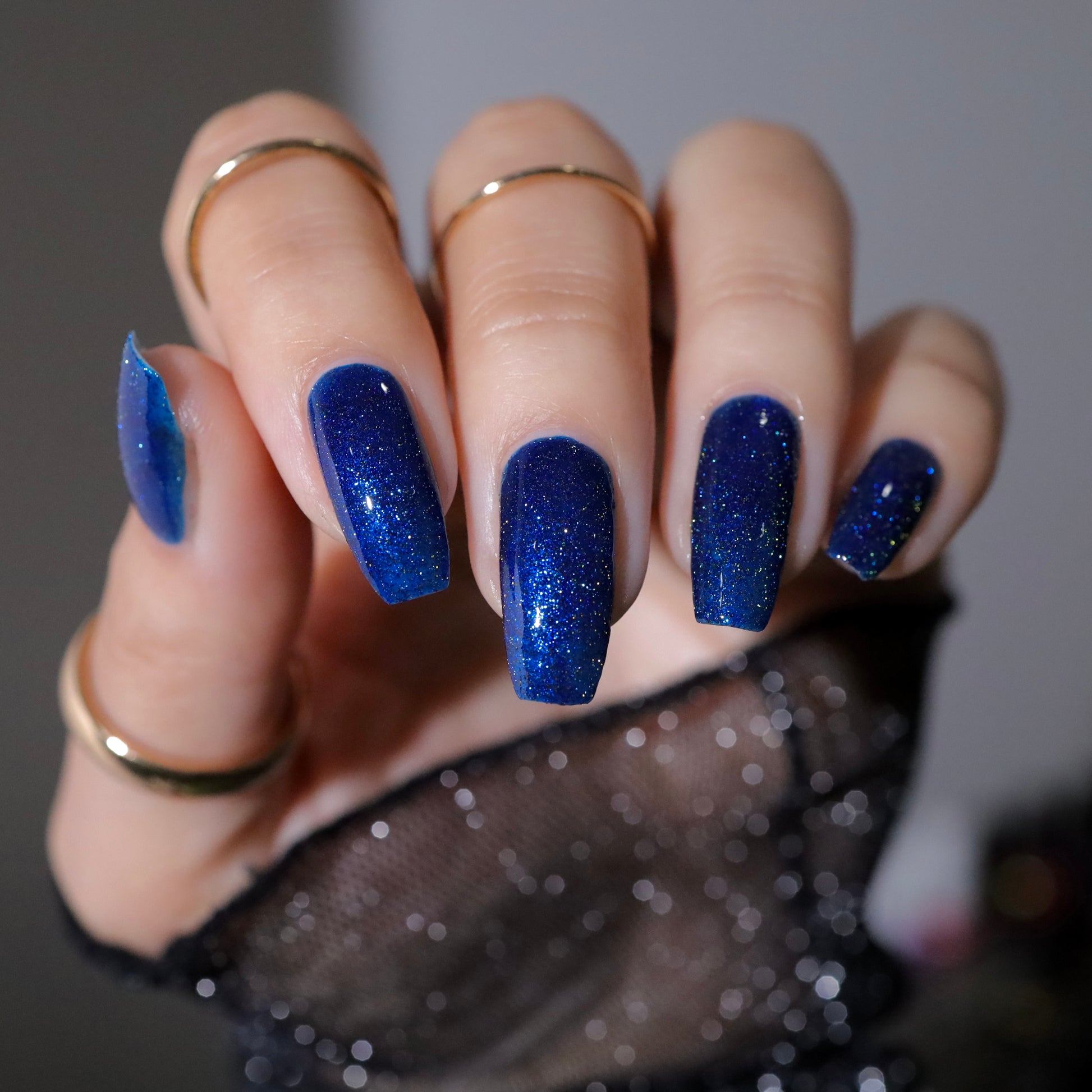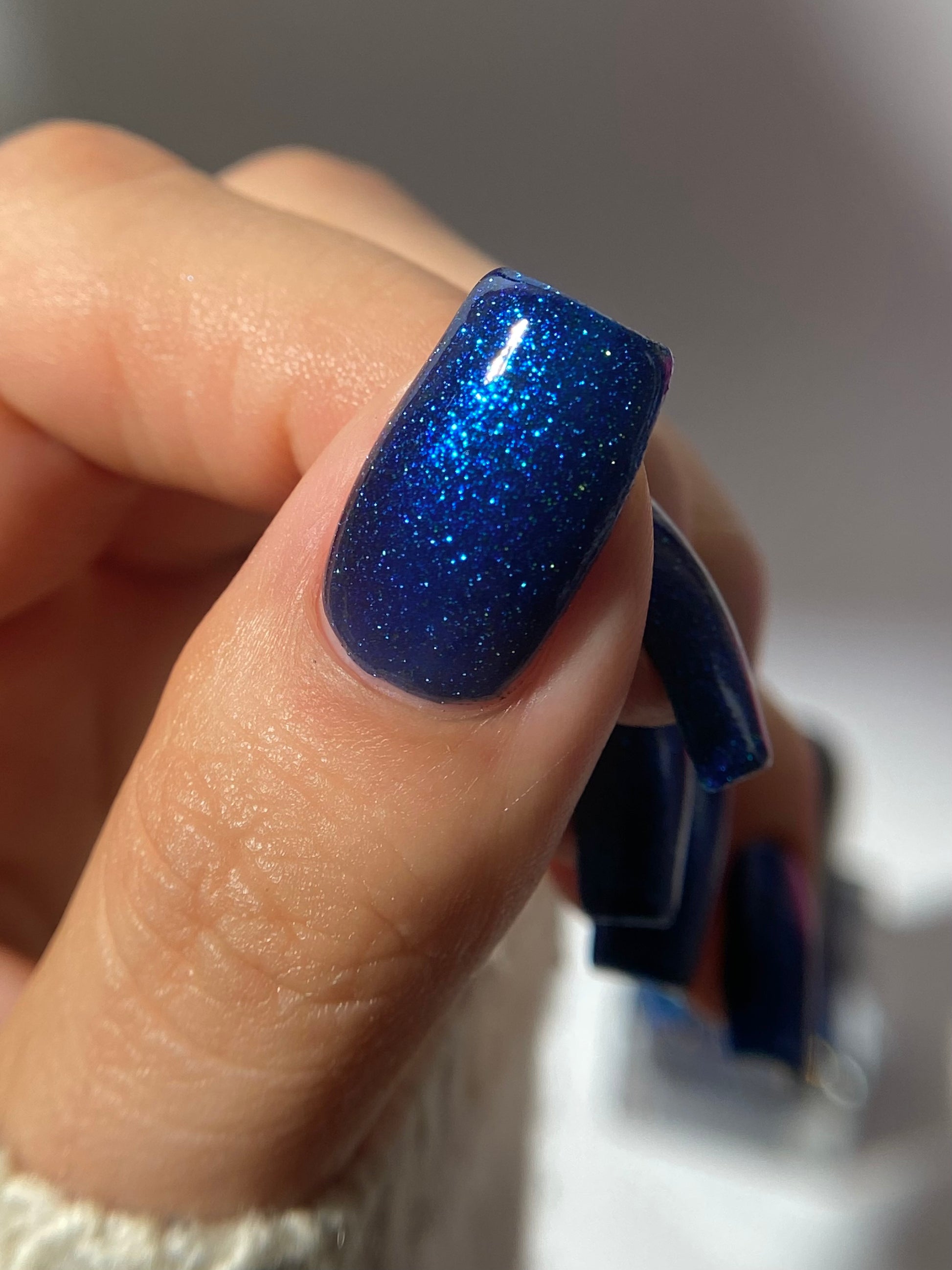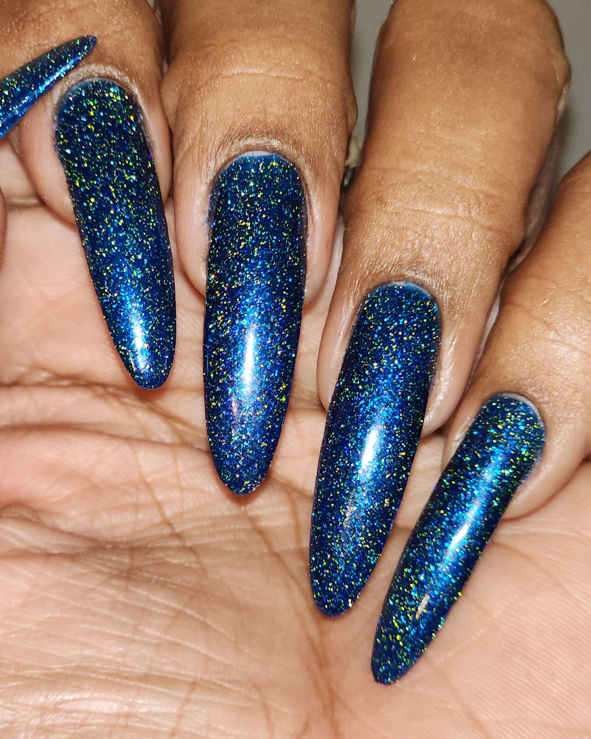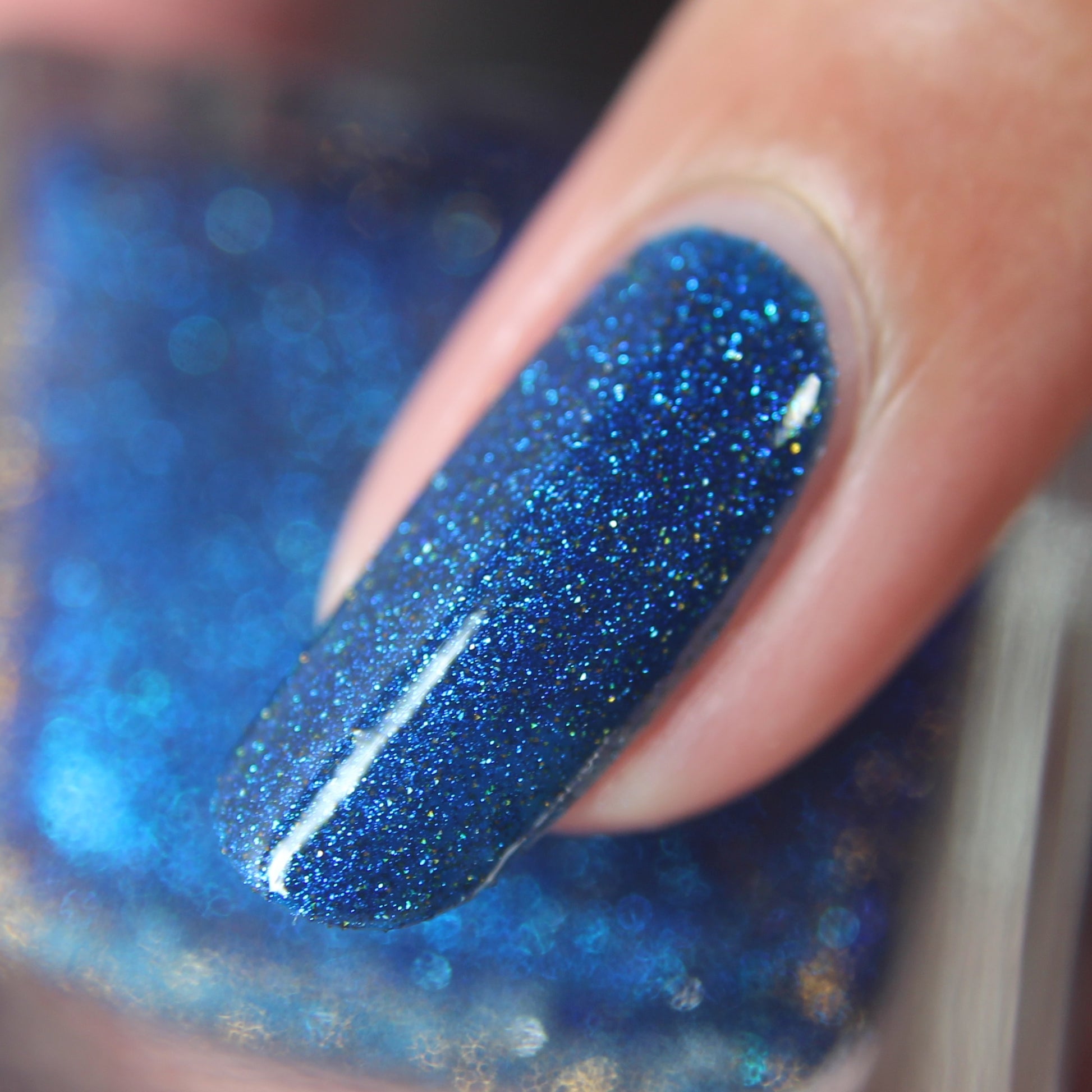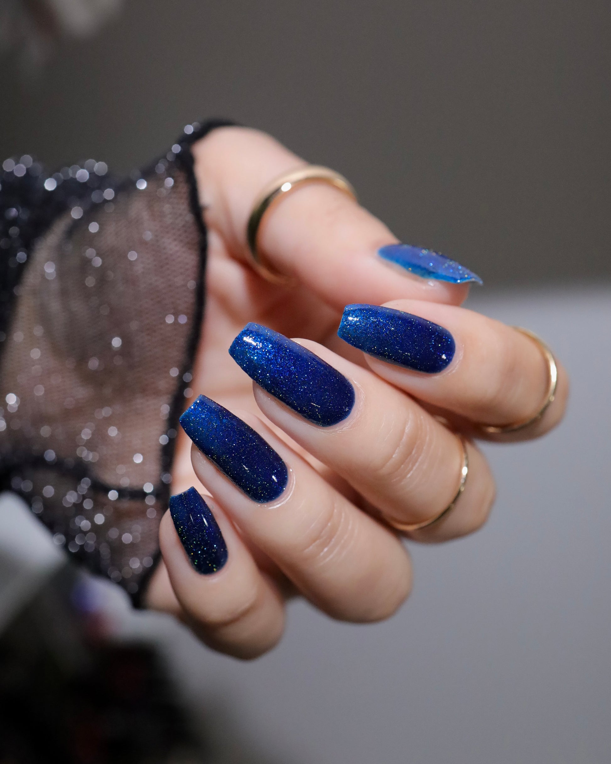 A rich cobalt base with a warm blue aurora shimmer that shifts to purple and bronze light reflective glitter