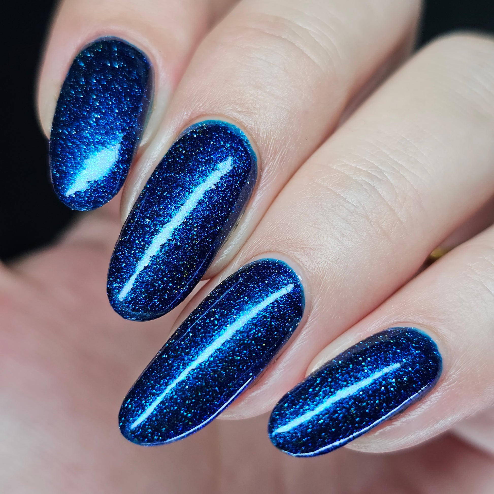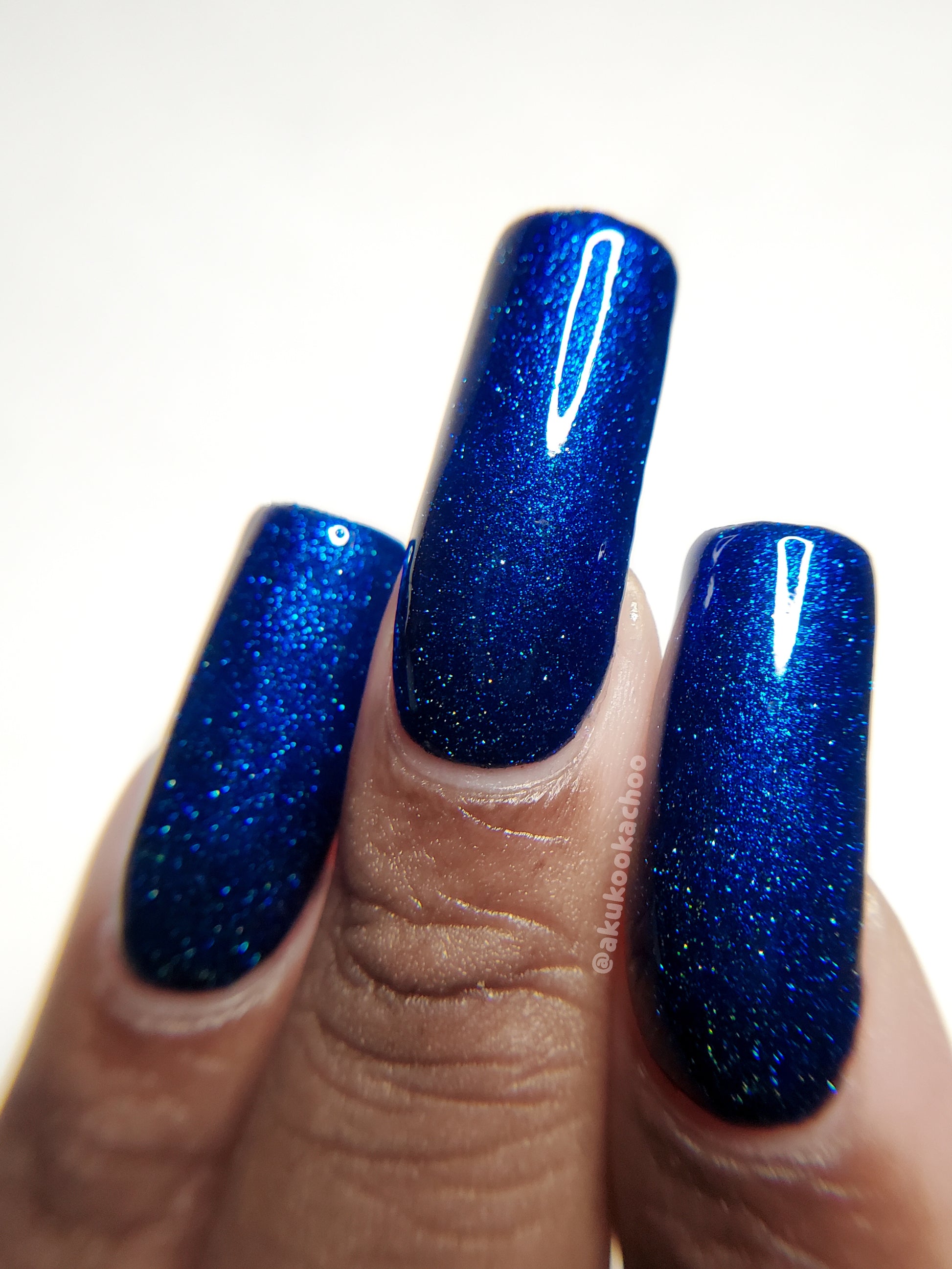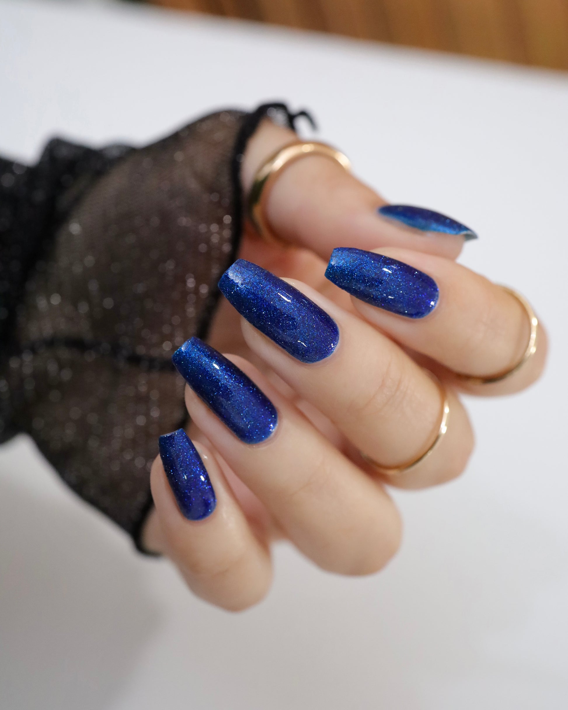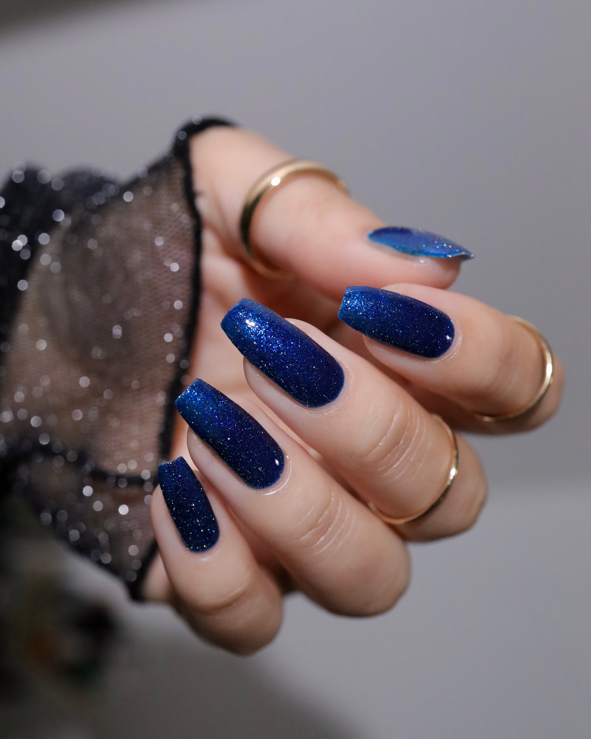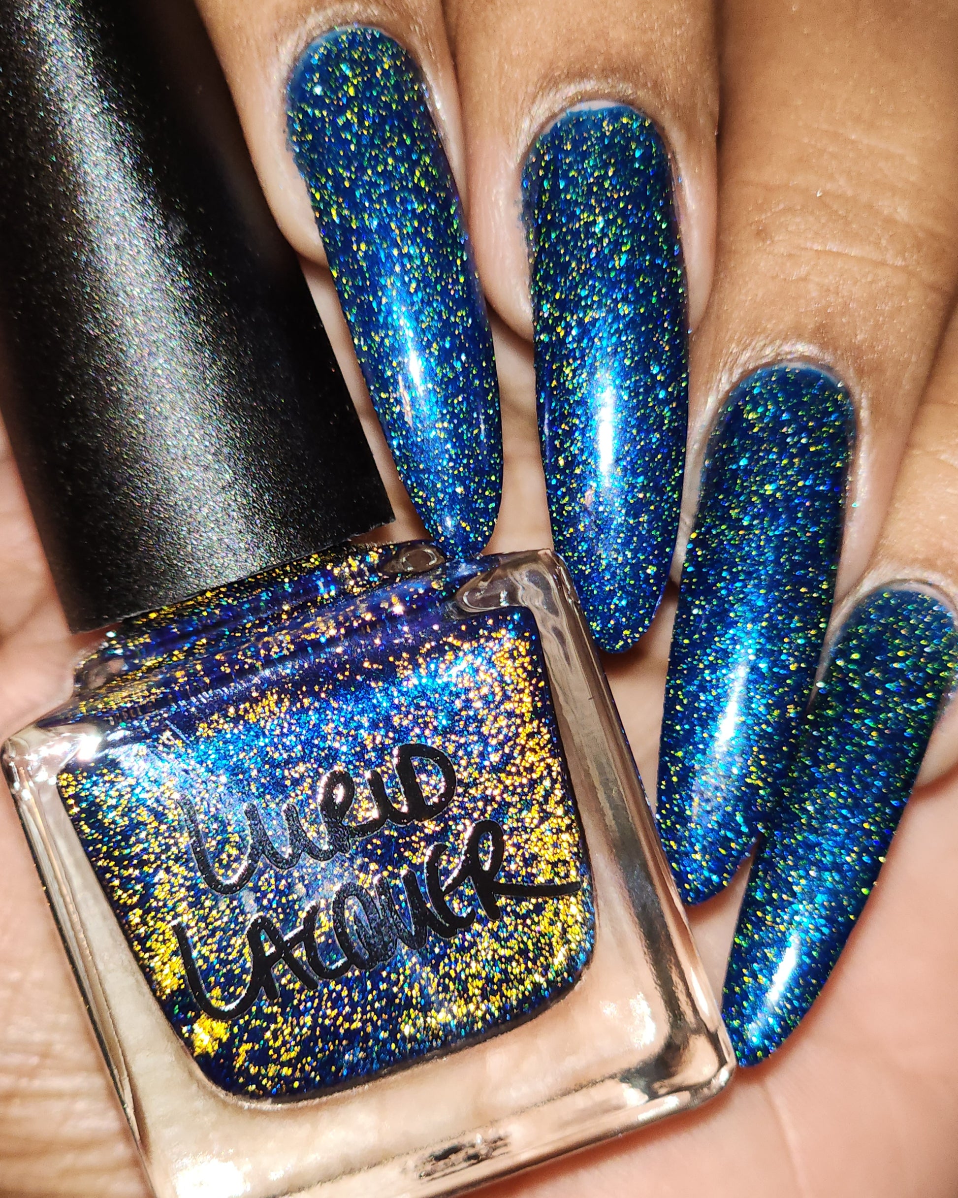 A rich cobalt base with a warm blue aurora shimmer that shifts to purple and bronze light reflective glitter