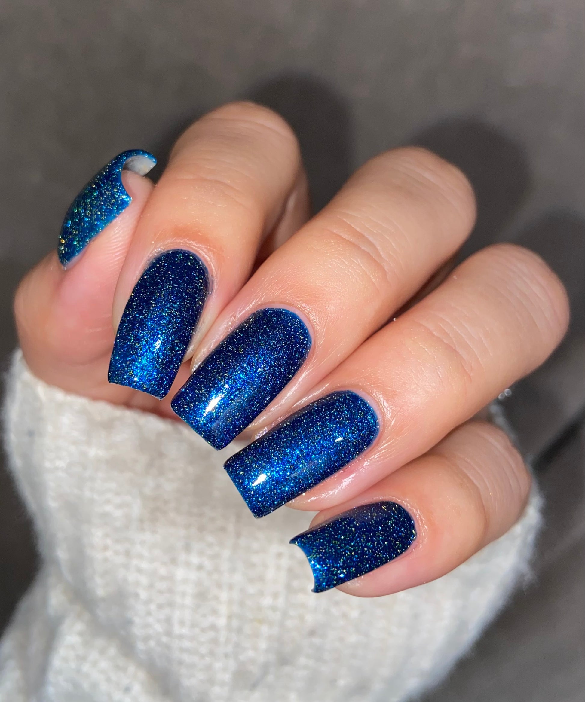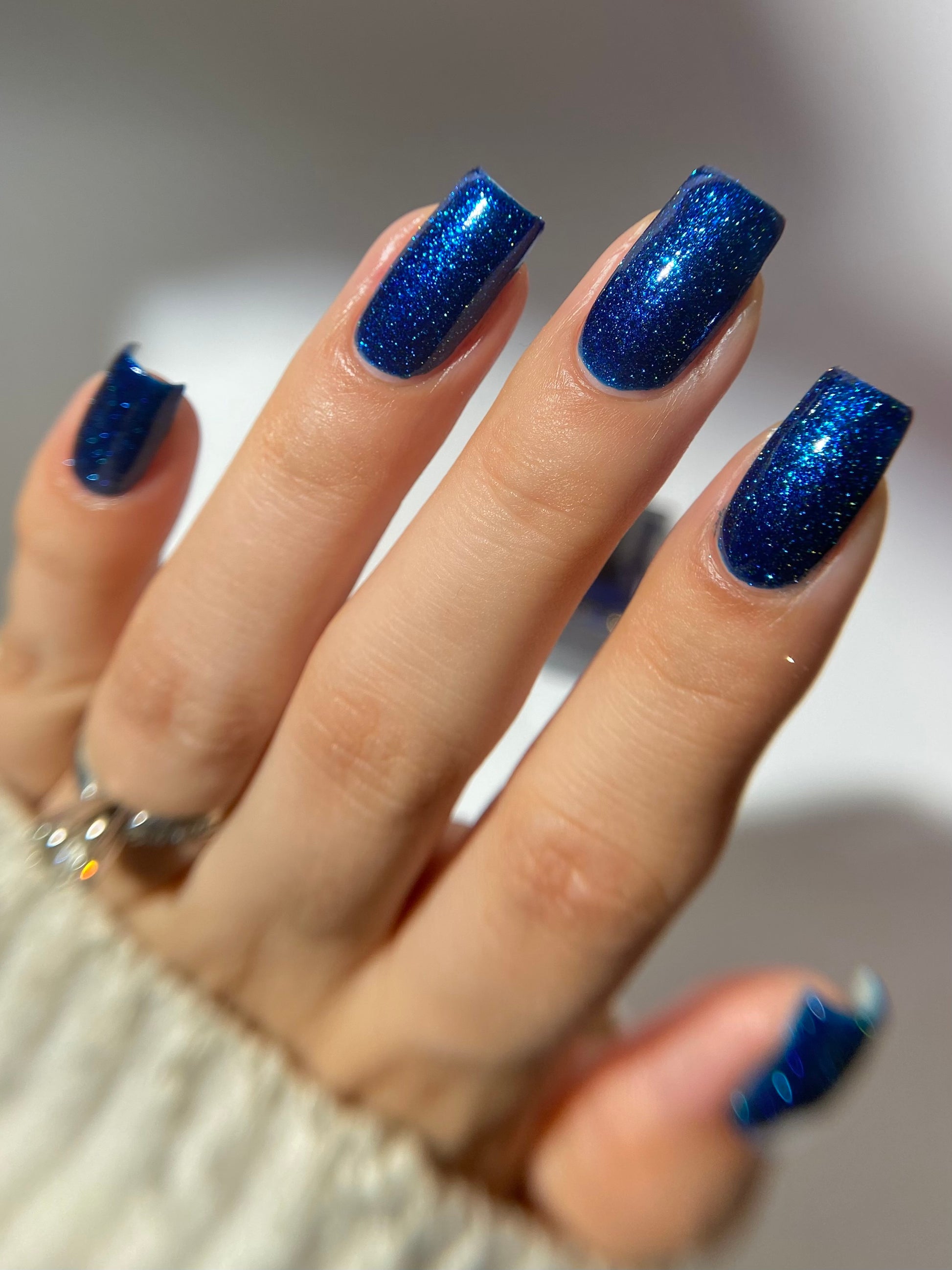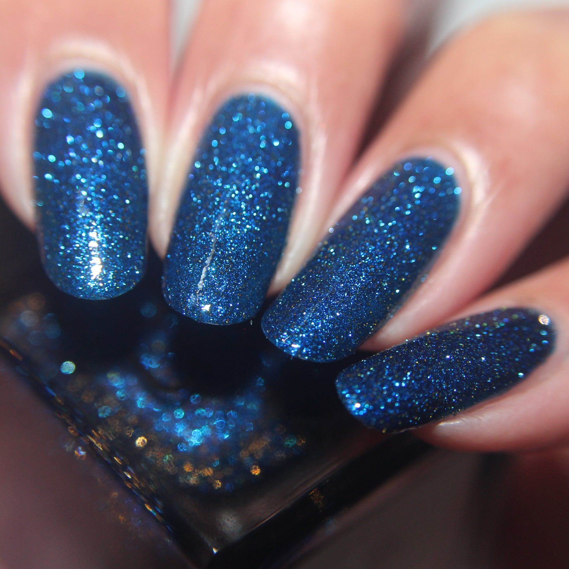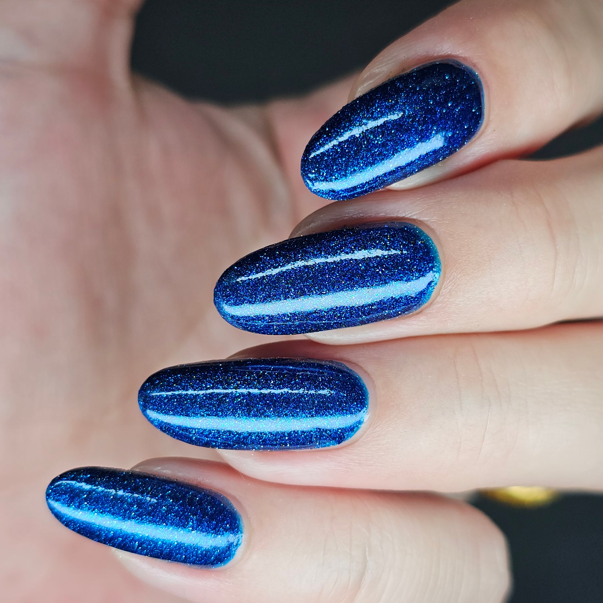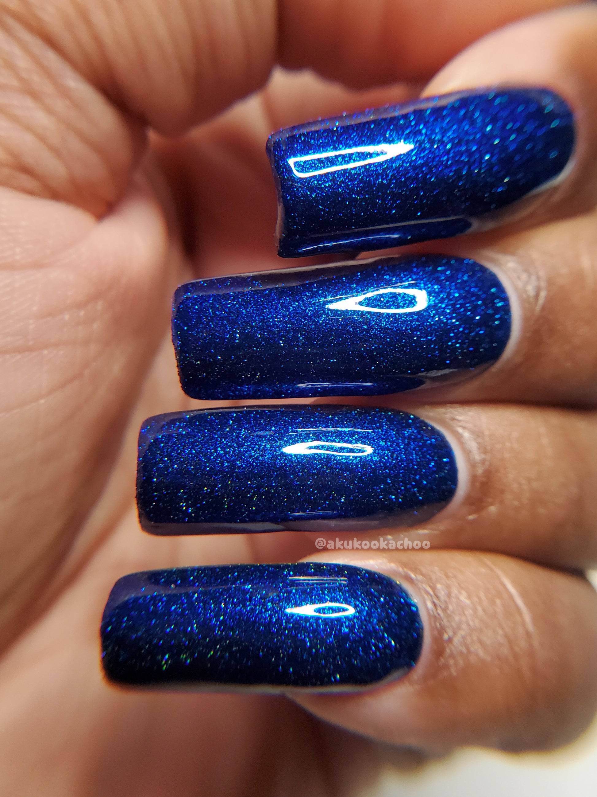 A rich cobalt base with a warm blue aurora shimmer that shifts to purple and bronze light reflective glitter