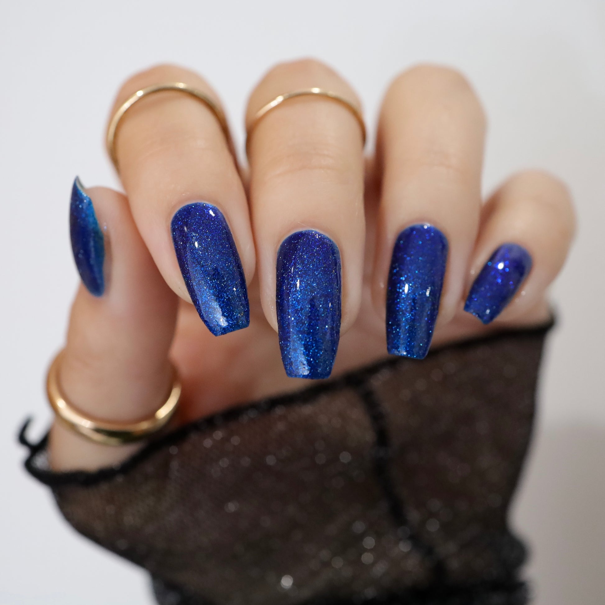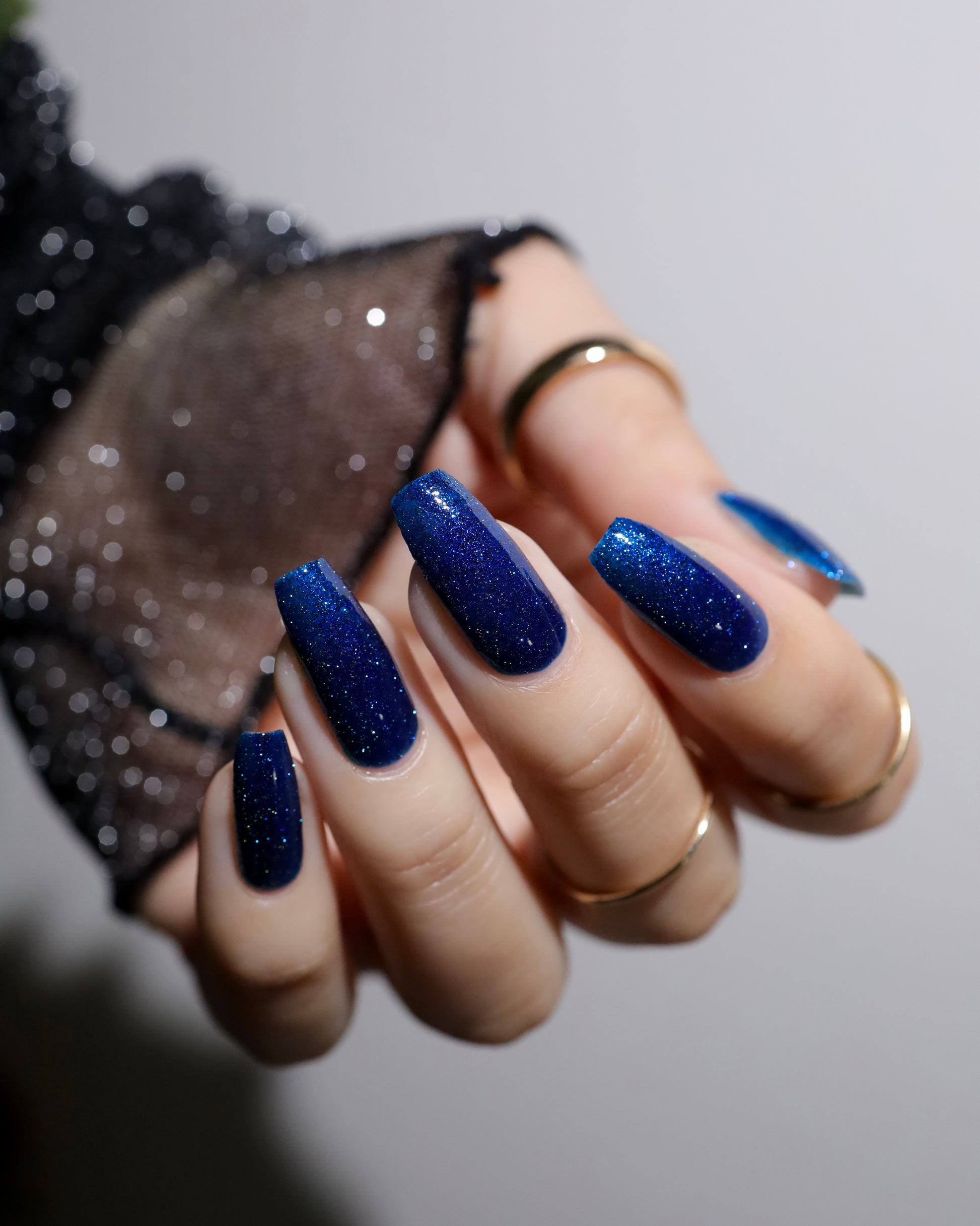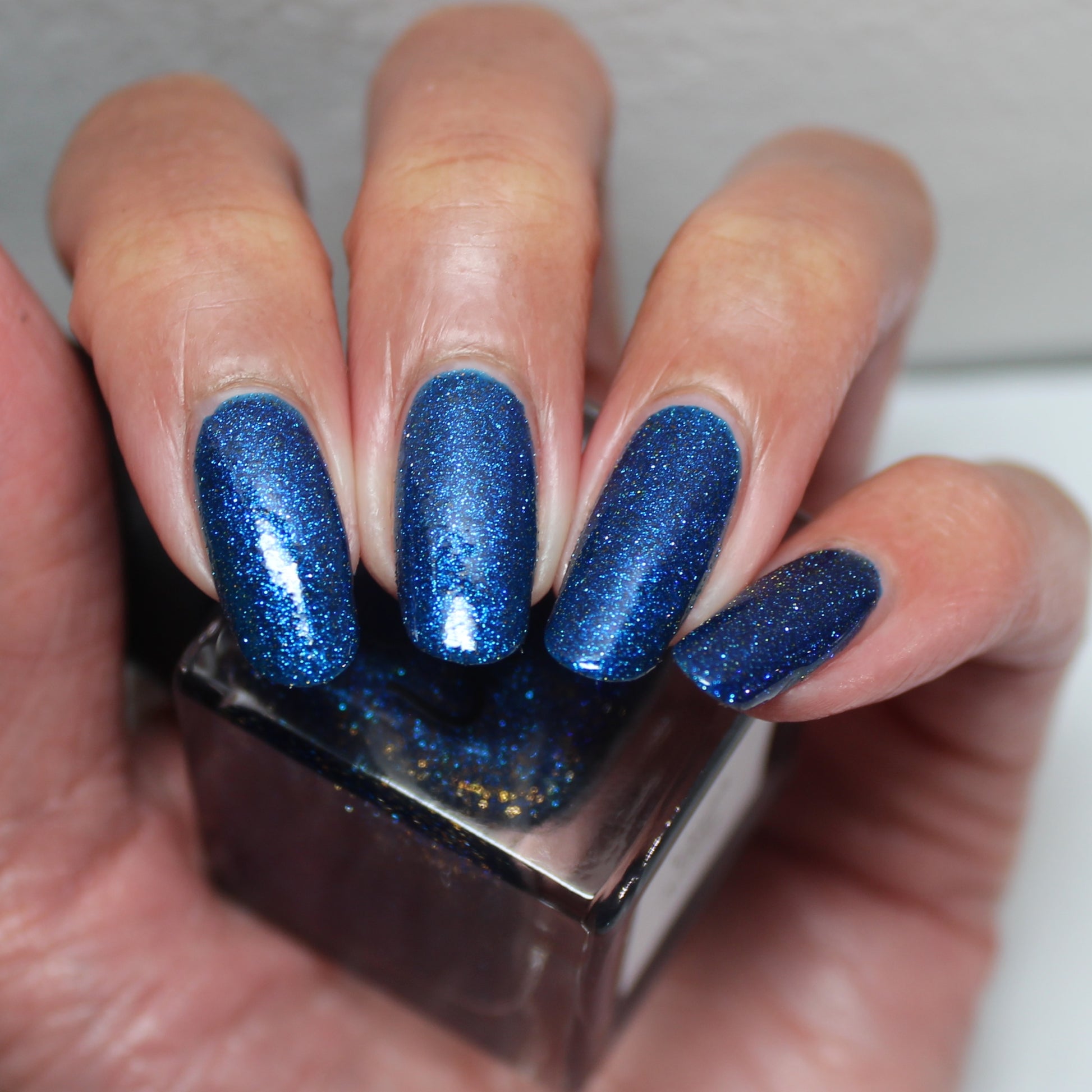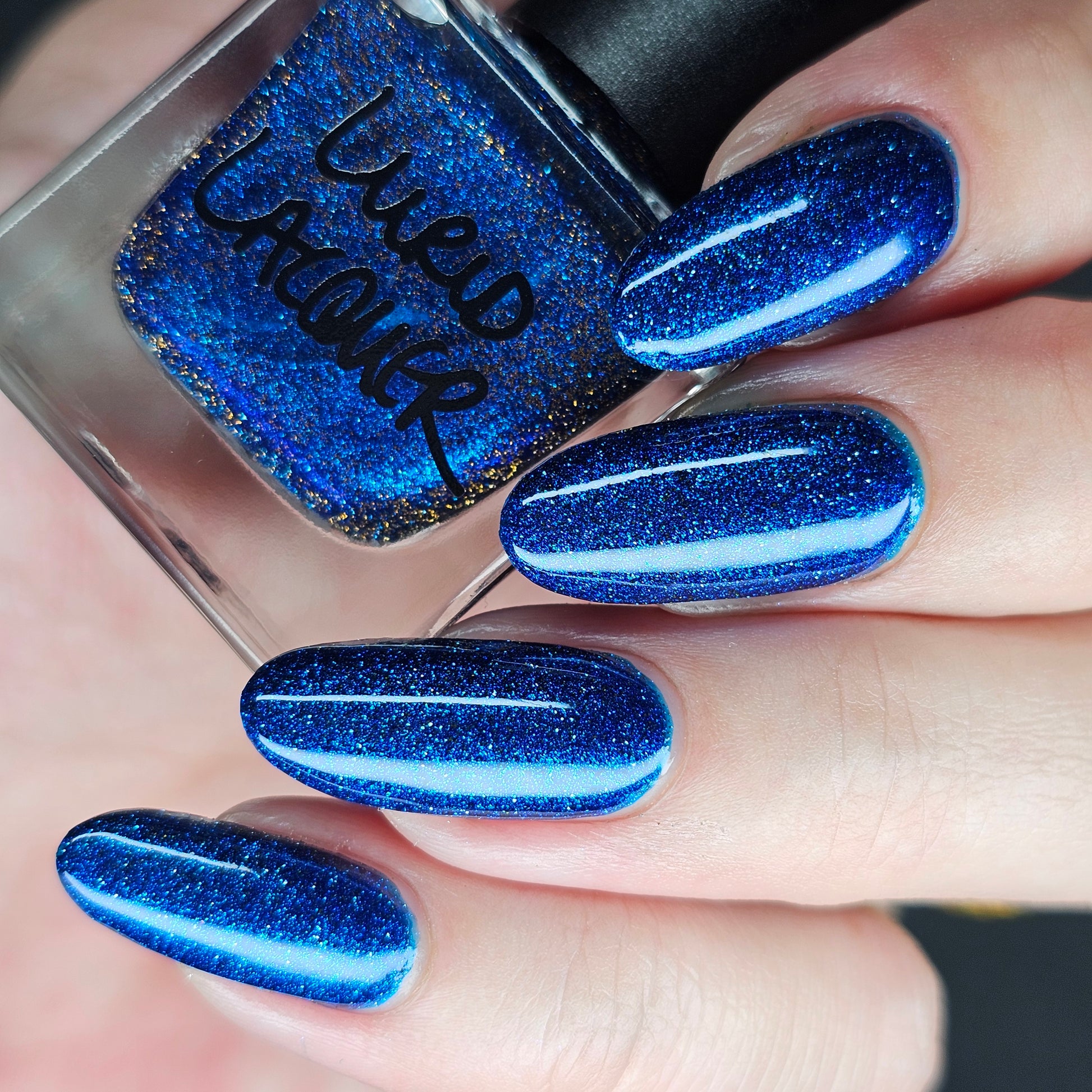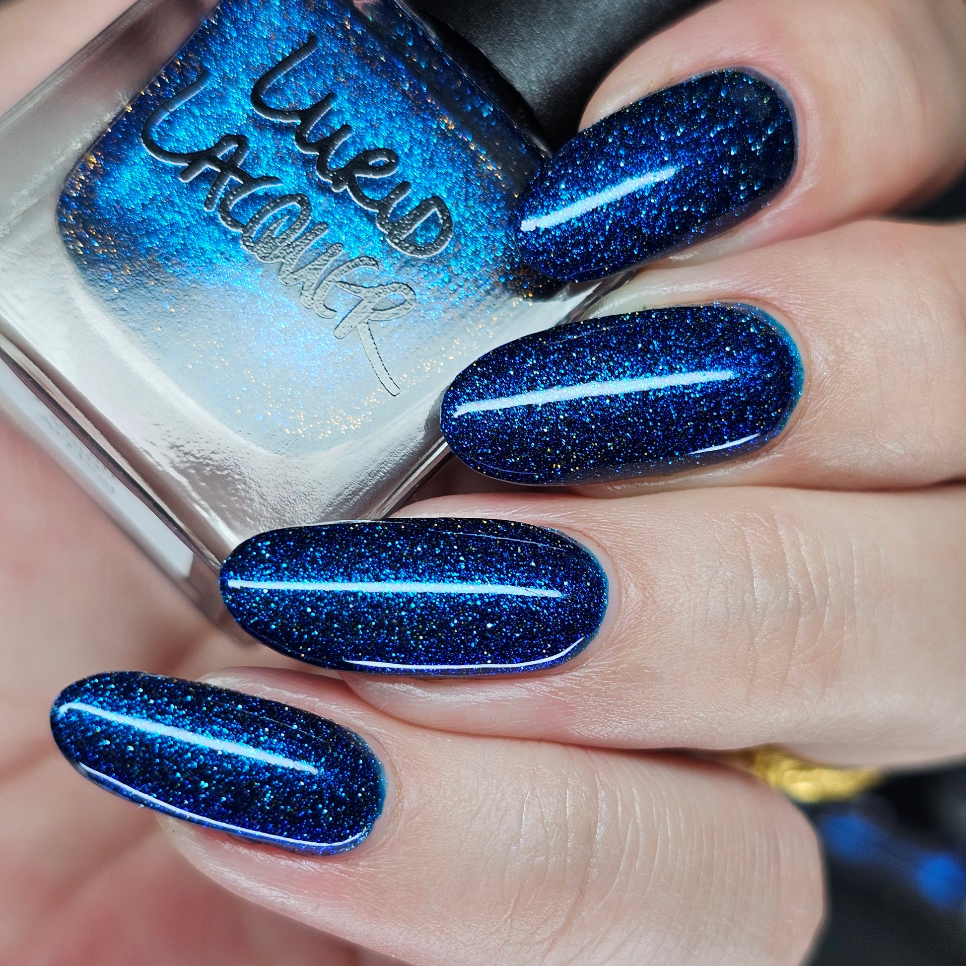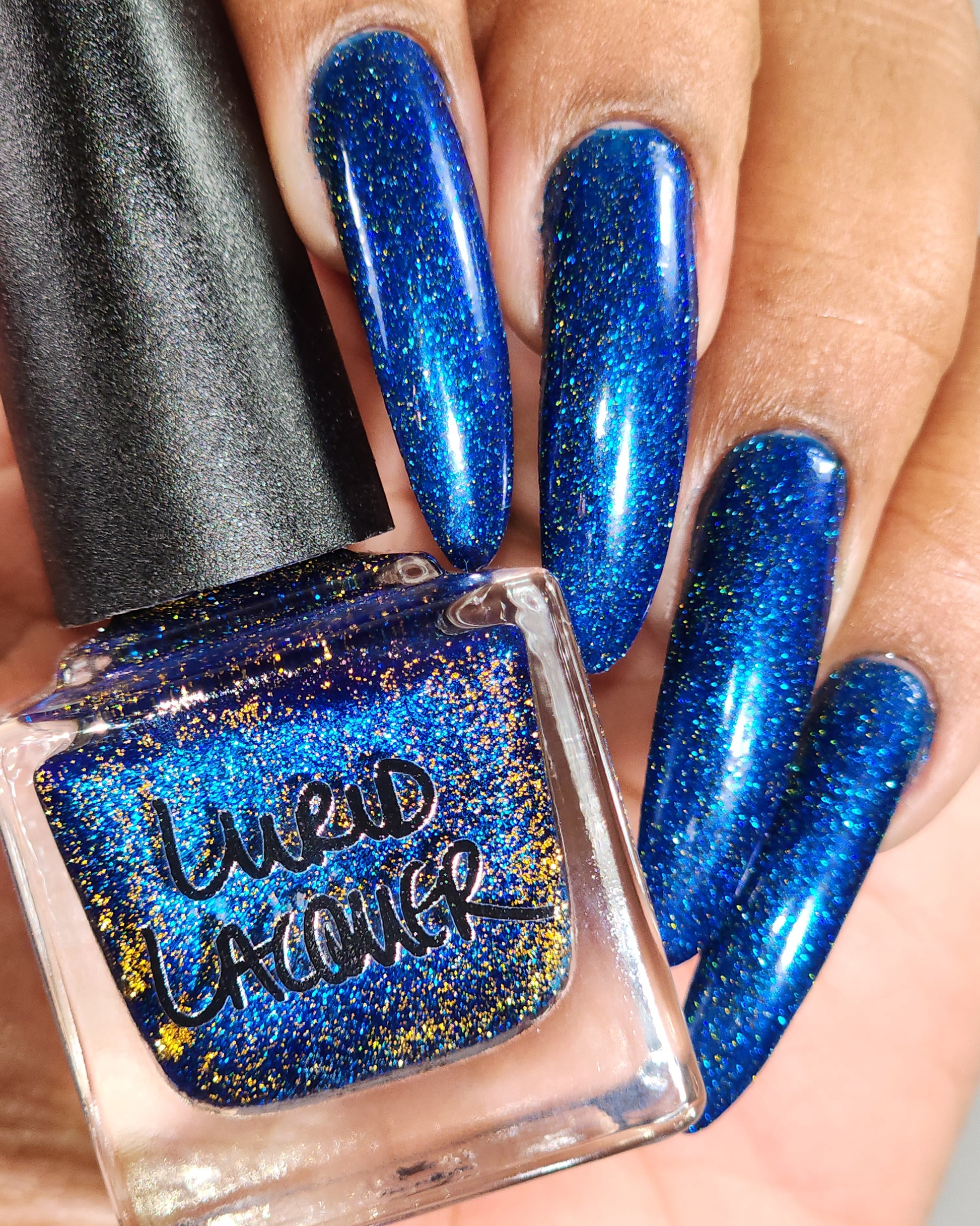 A rich cobalt base with a warm blue aurora shimmer that shifts to purple and bronze light reflective glitter