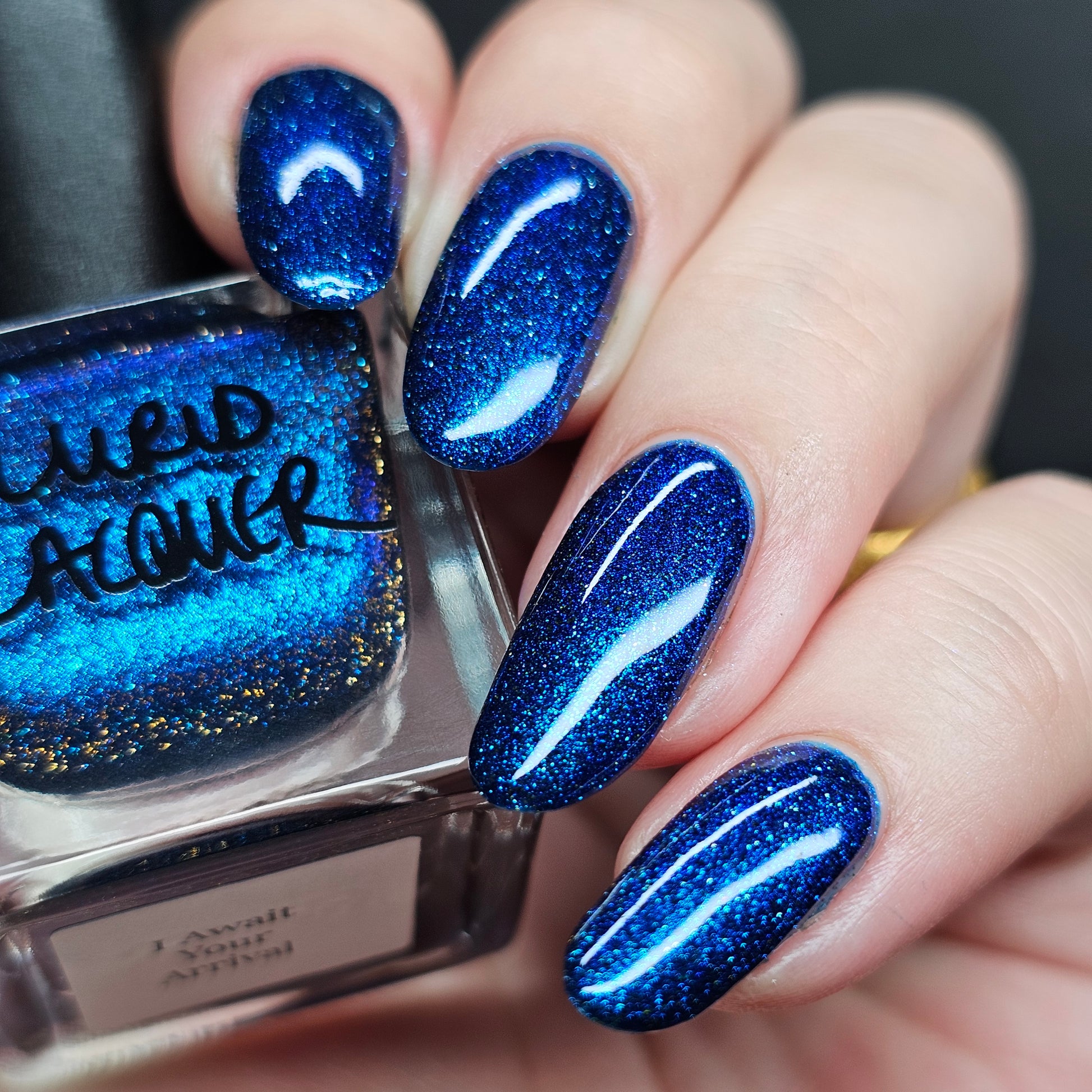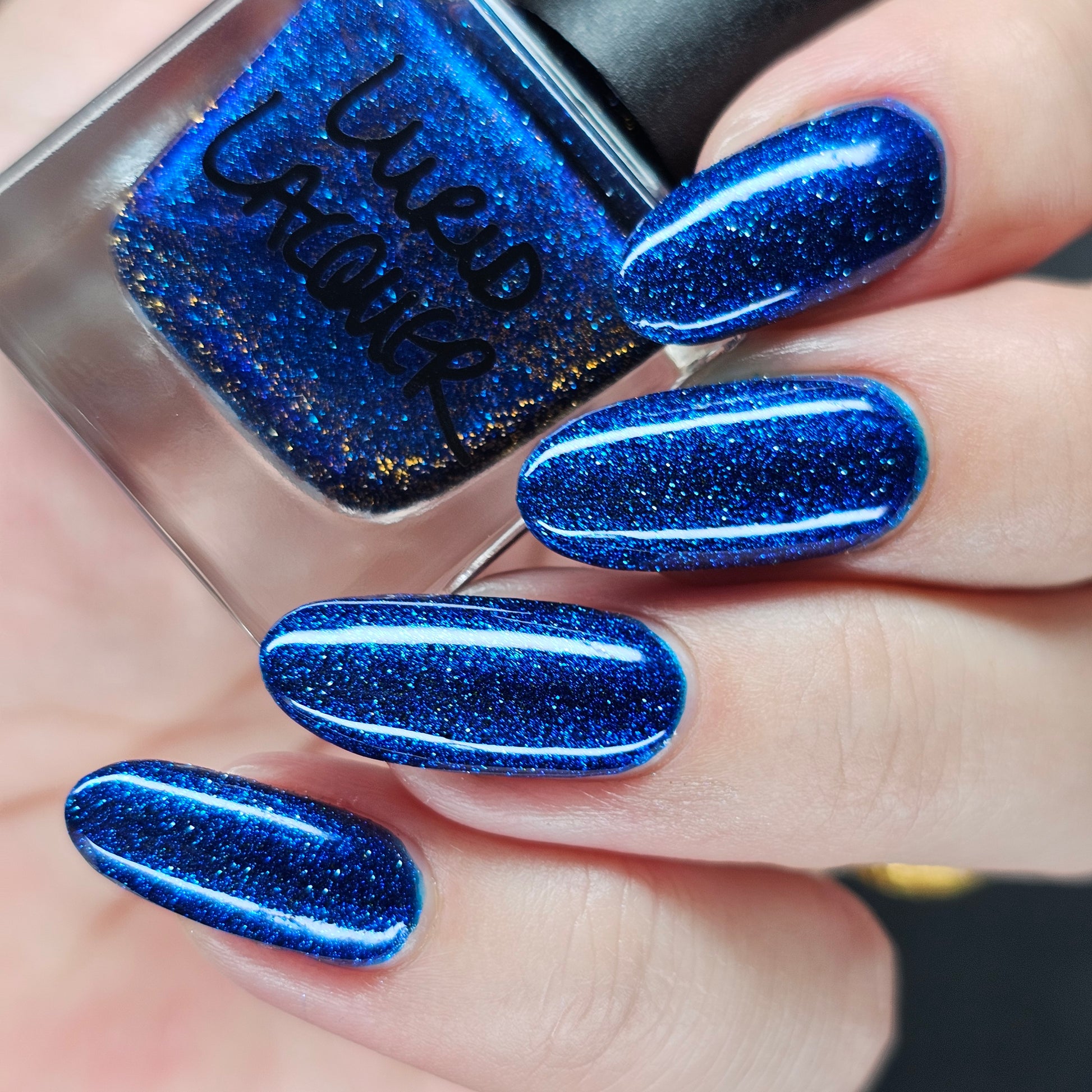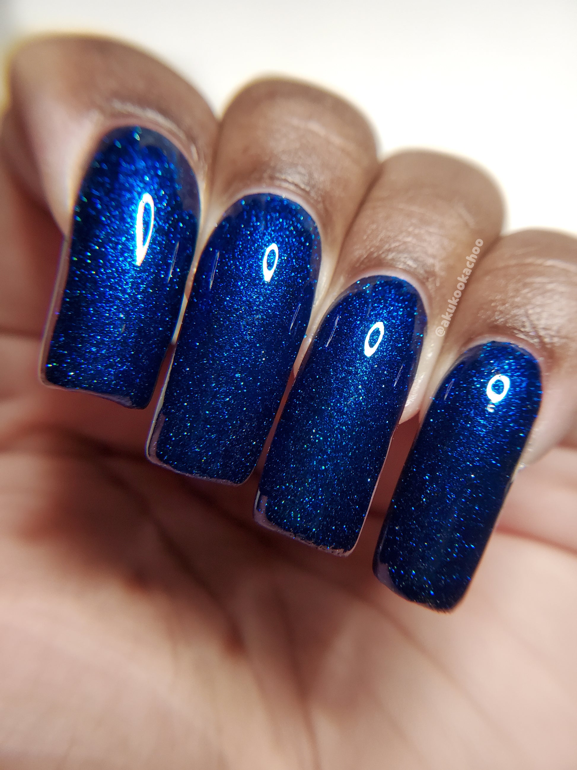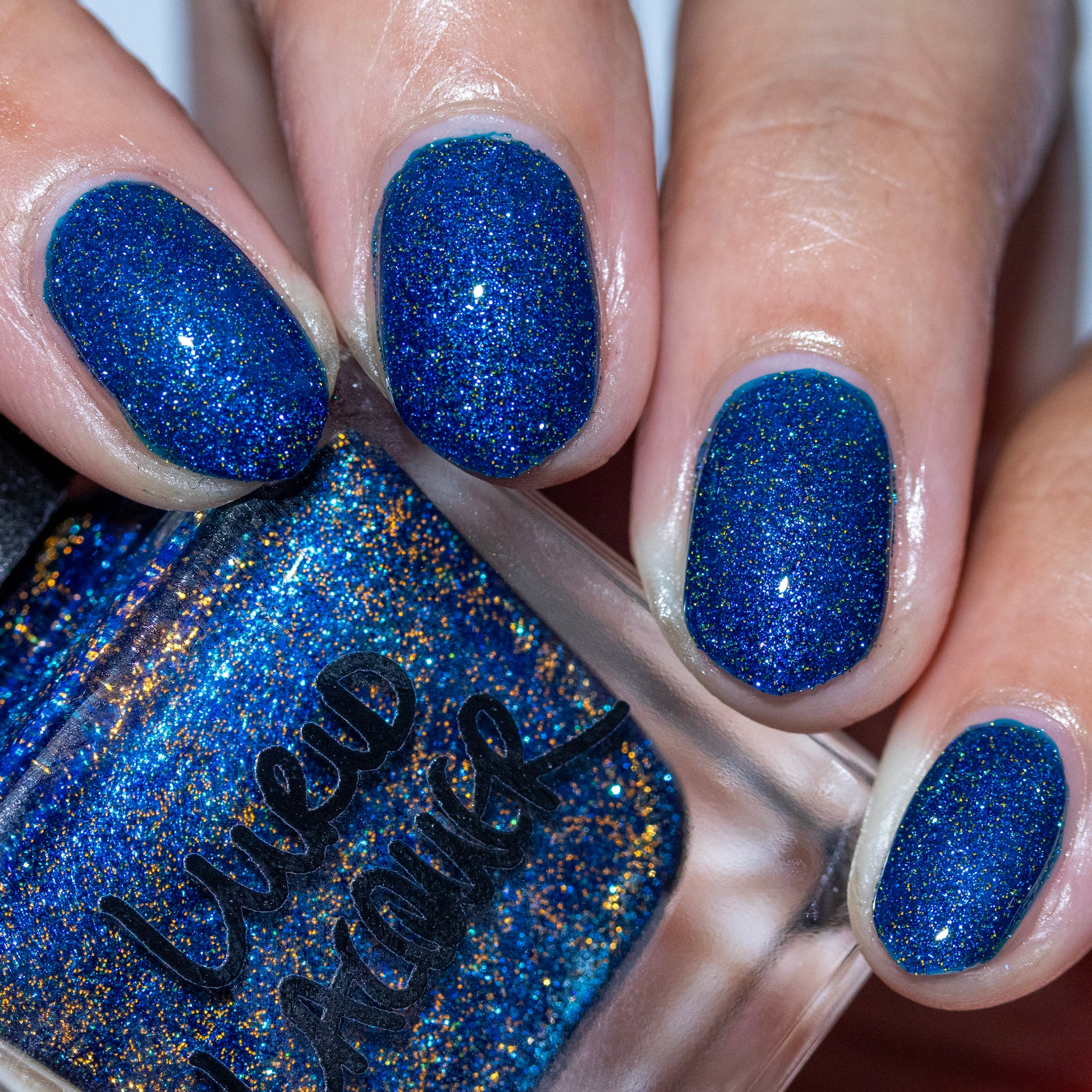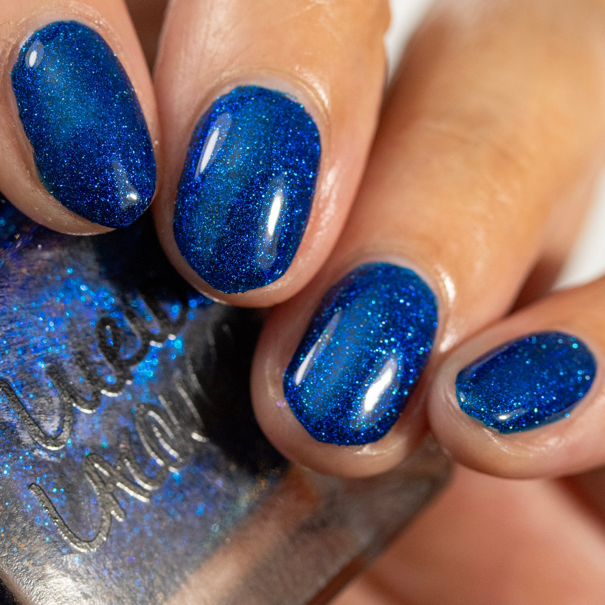 A rich cobalt base with a warm blue aurora shimmer that shifts to purple and bronze light reflective glitter