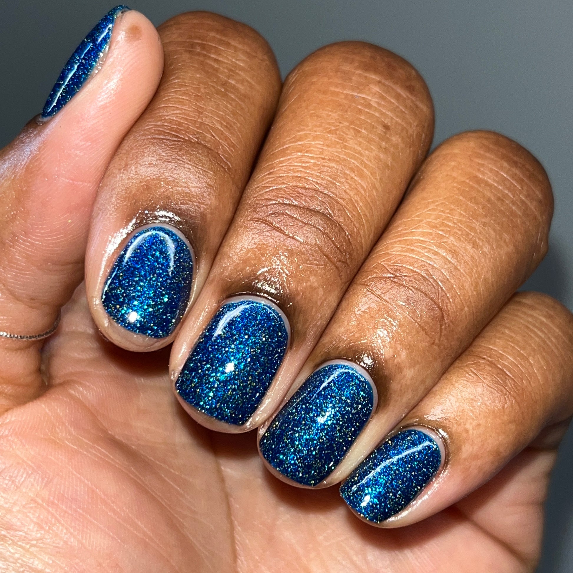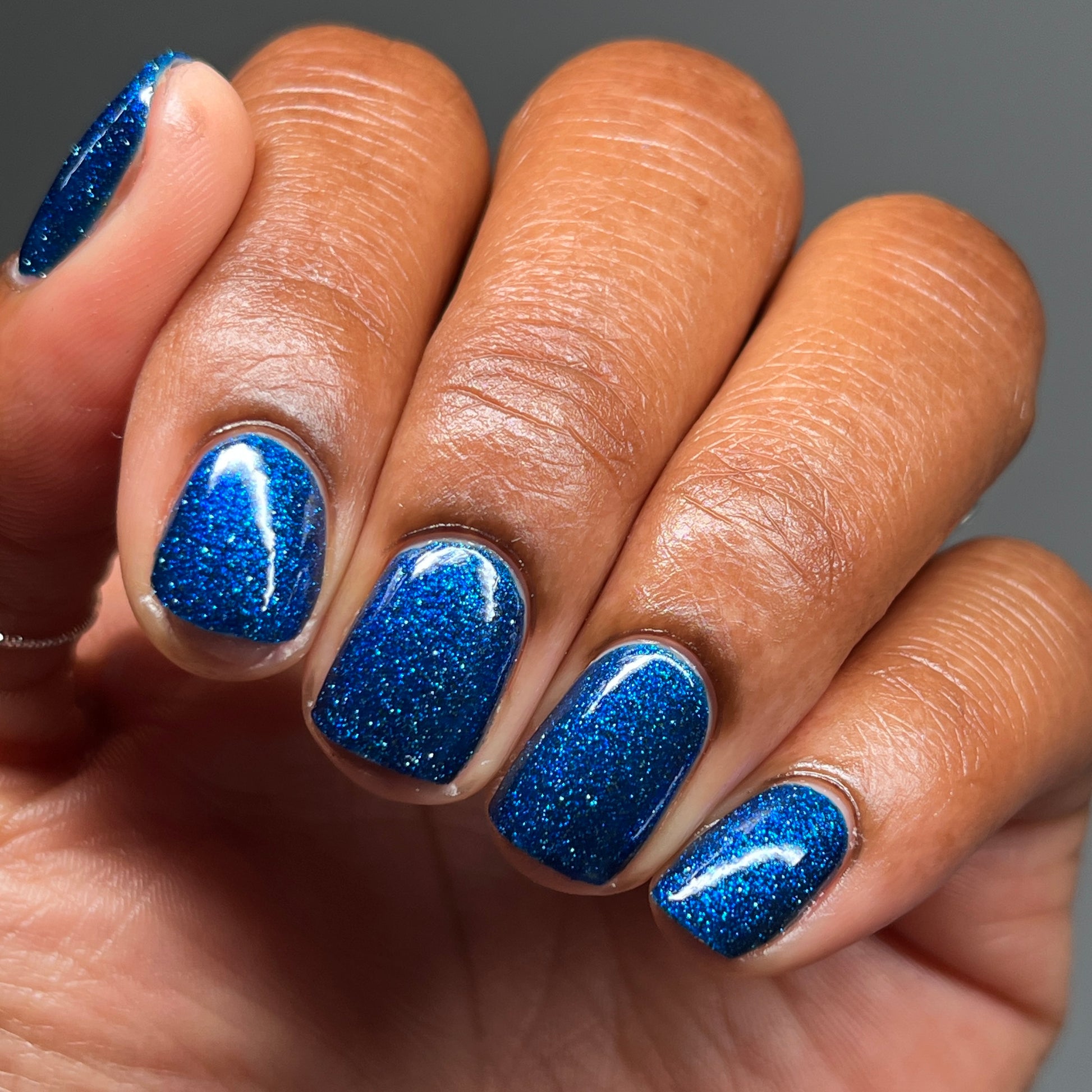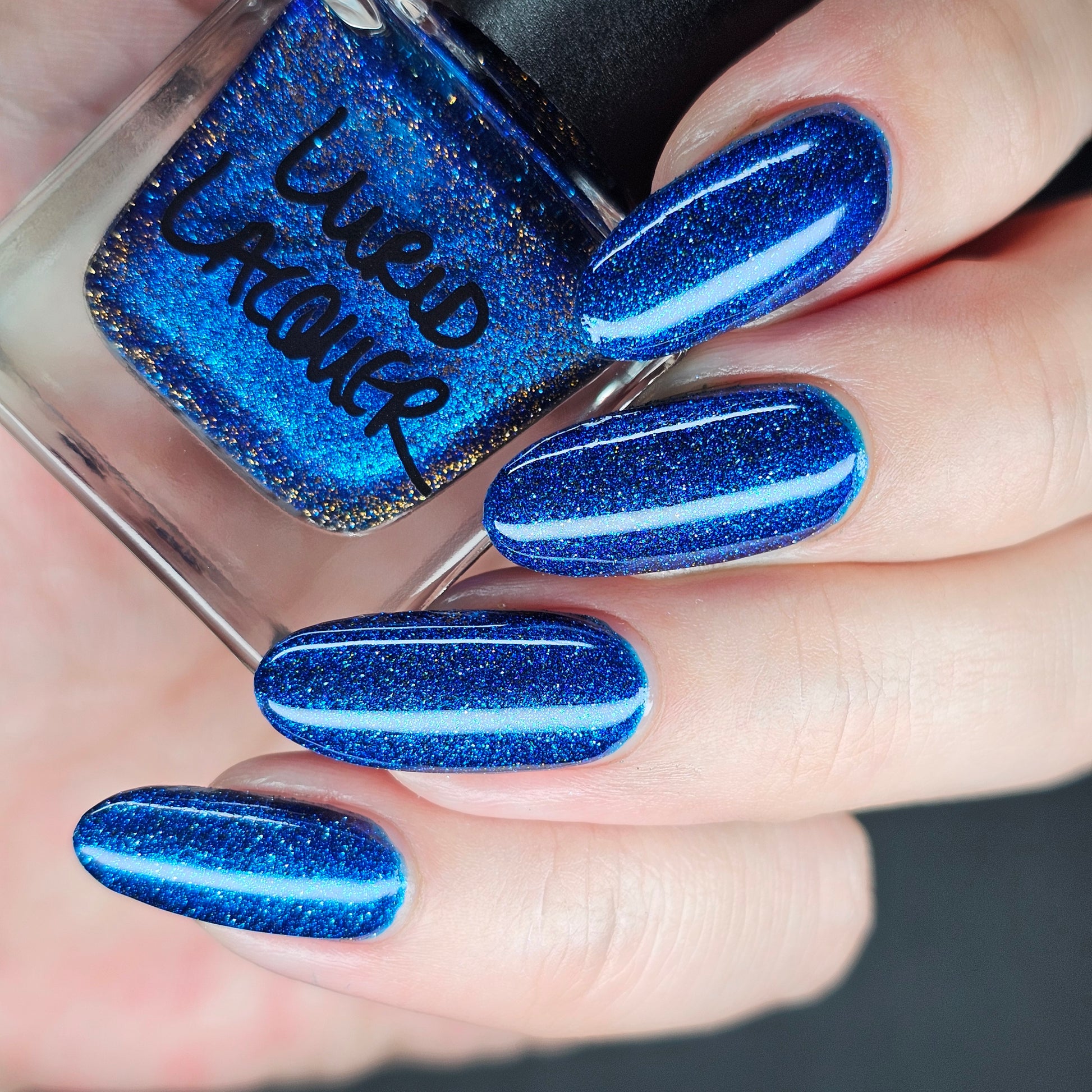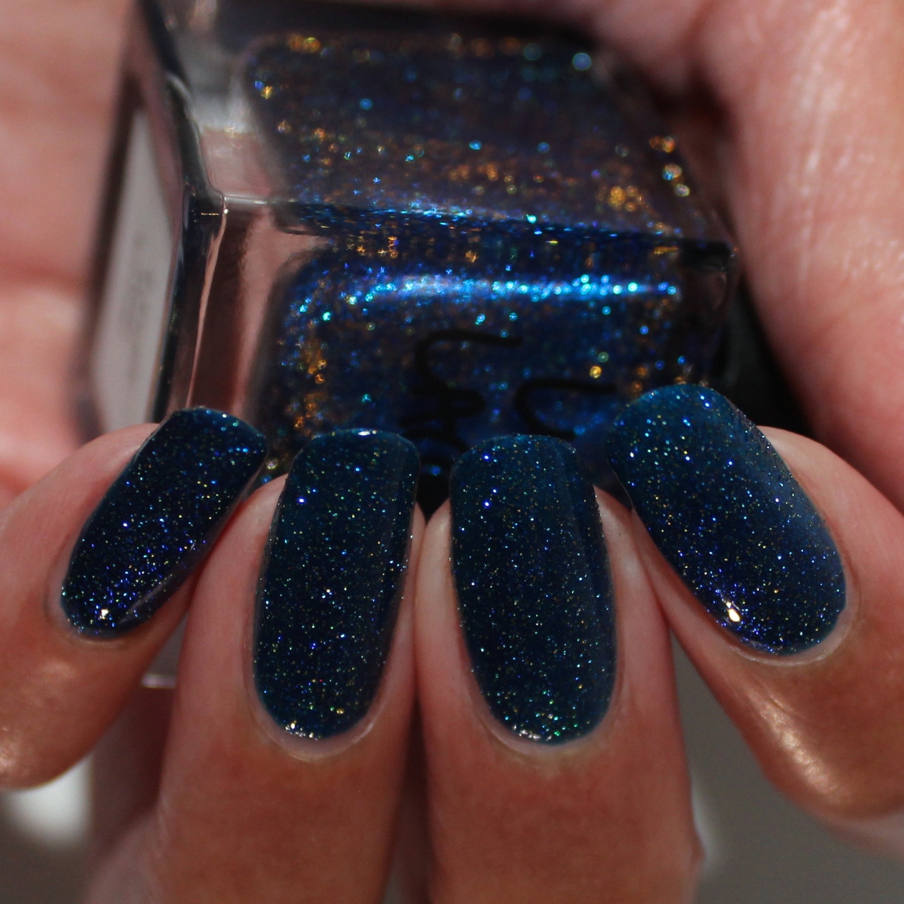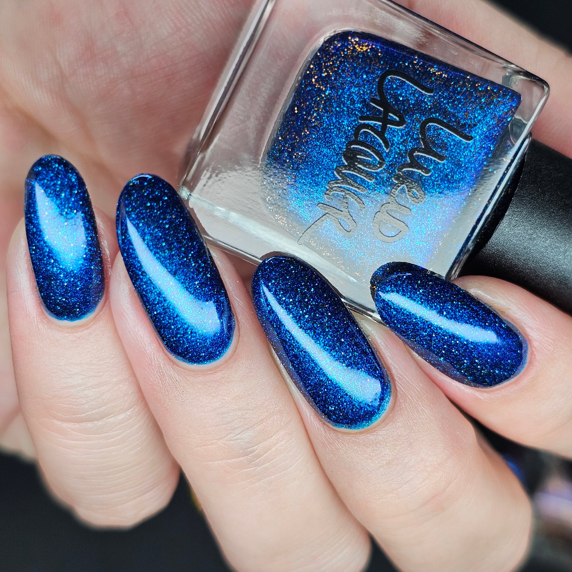 A rich cobalt base with a warm blue aurora shimmer that shifts to purple and bronze light reflective glitter