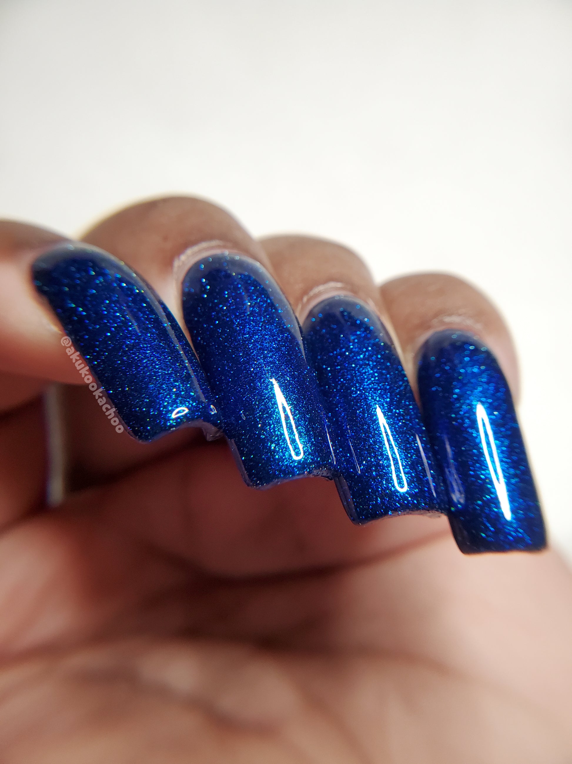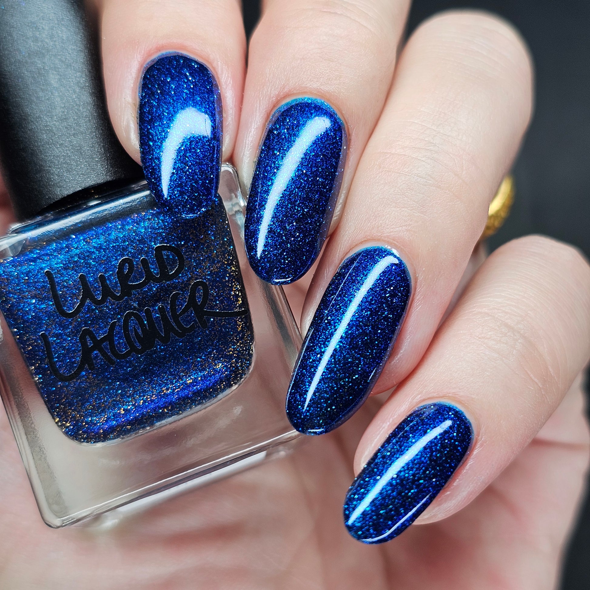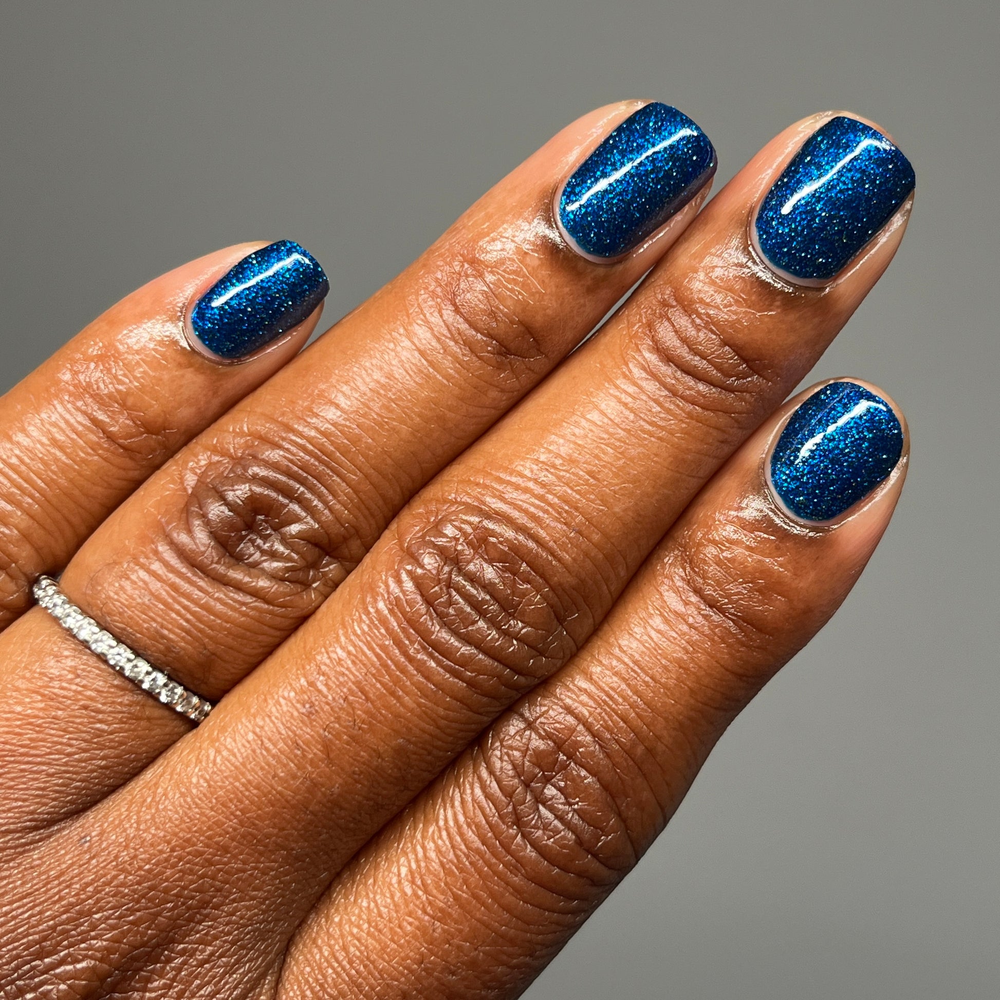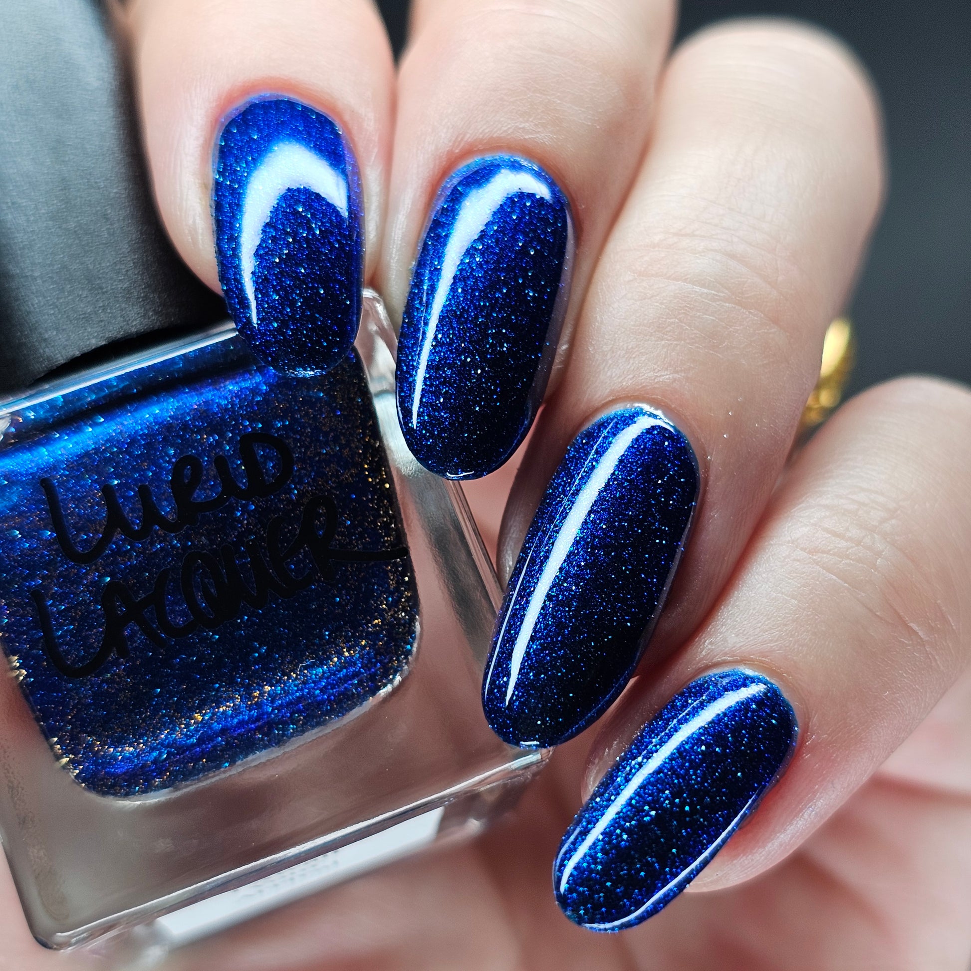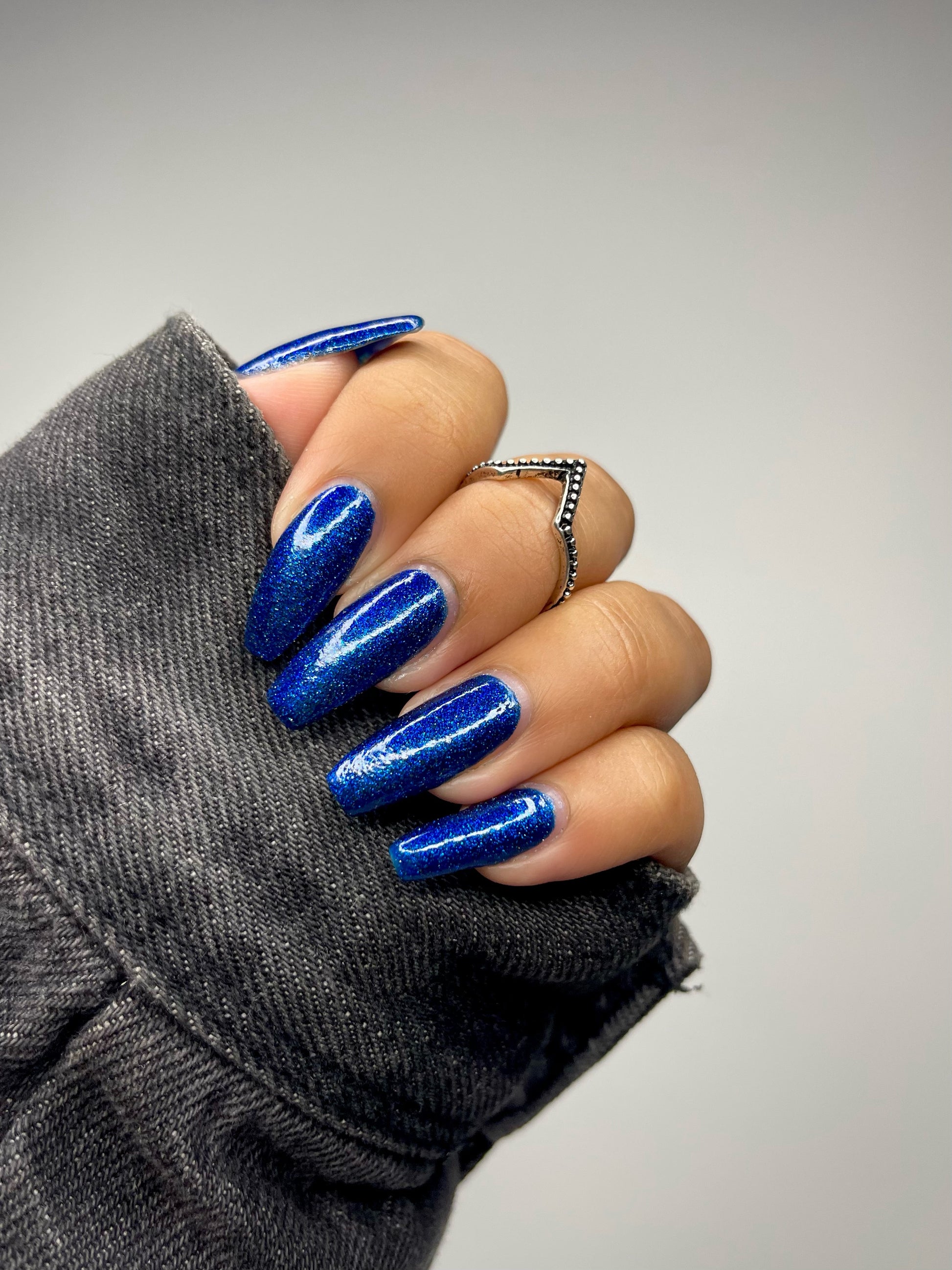 A rich cobalt base with a warm blue aurora shimmer that shifts to purple and bronze light reflective glitter