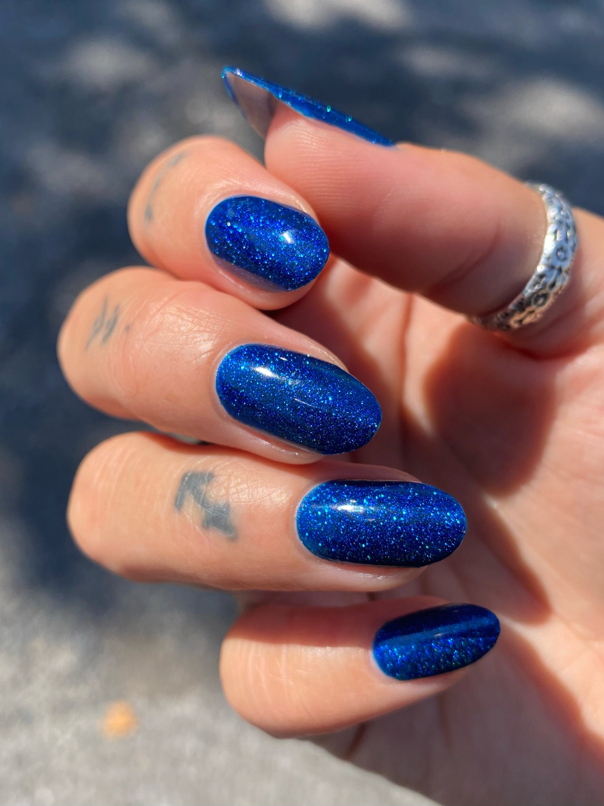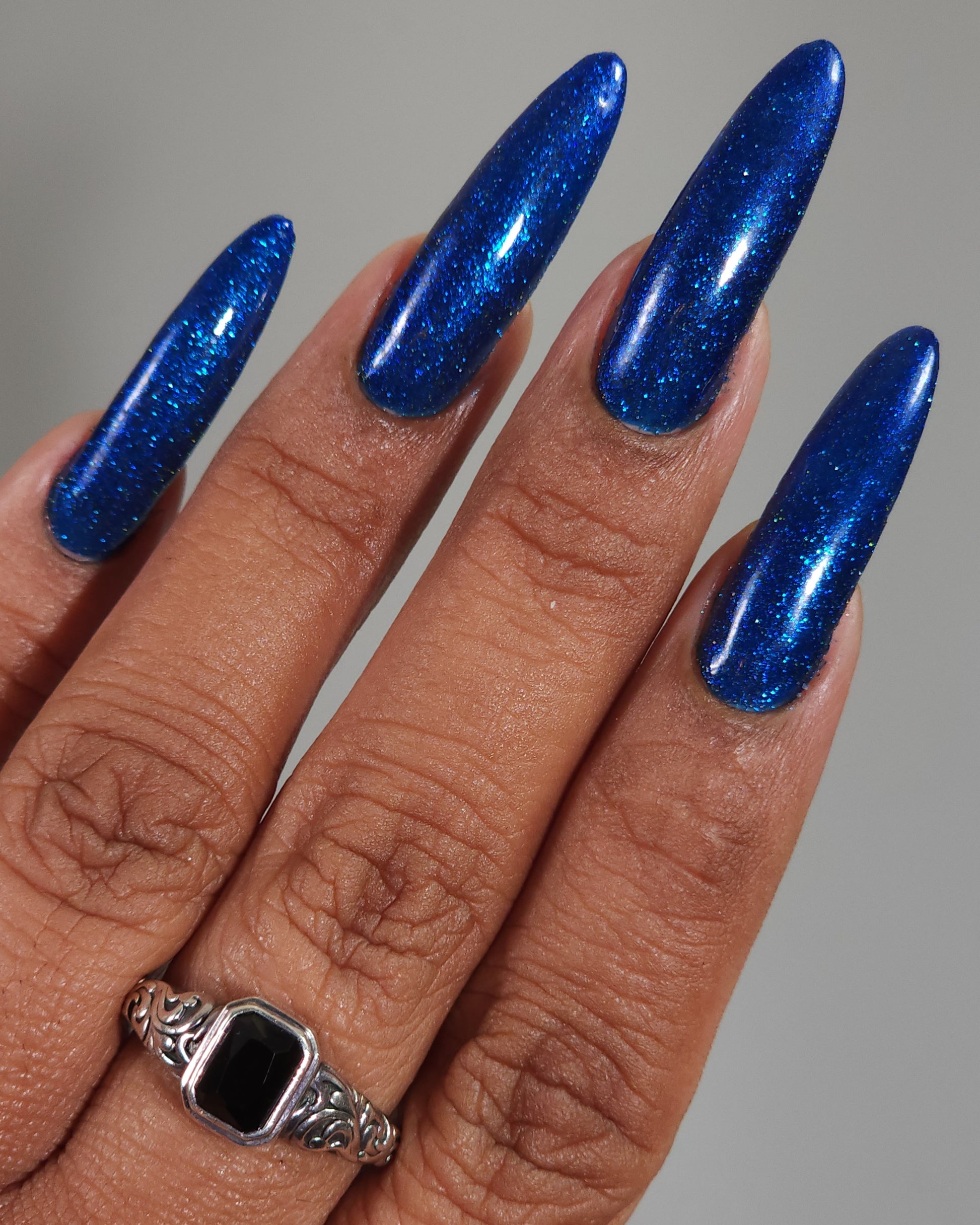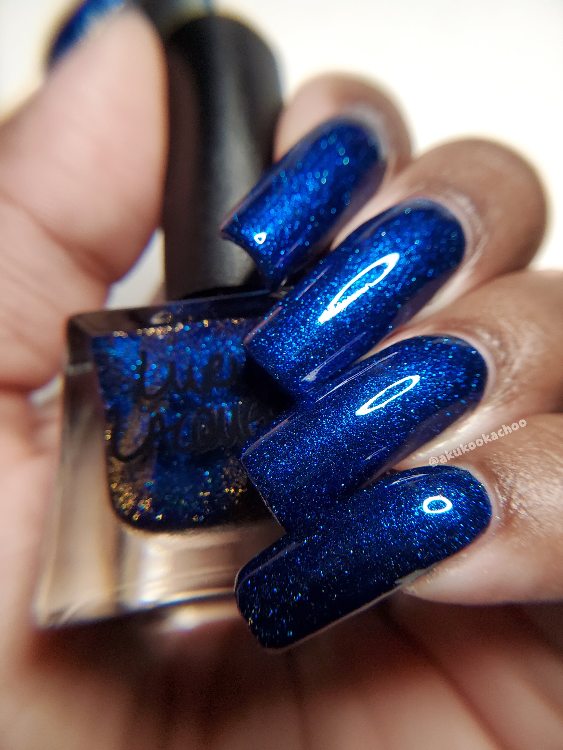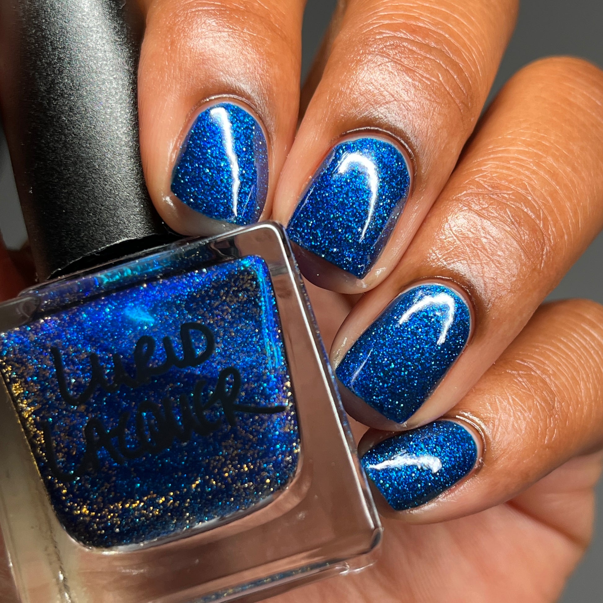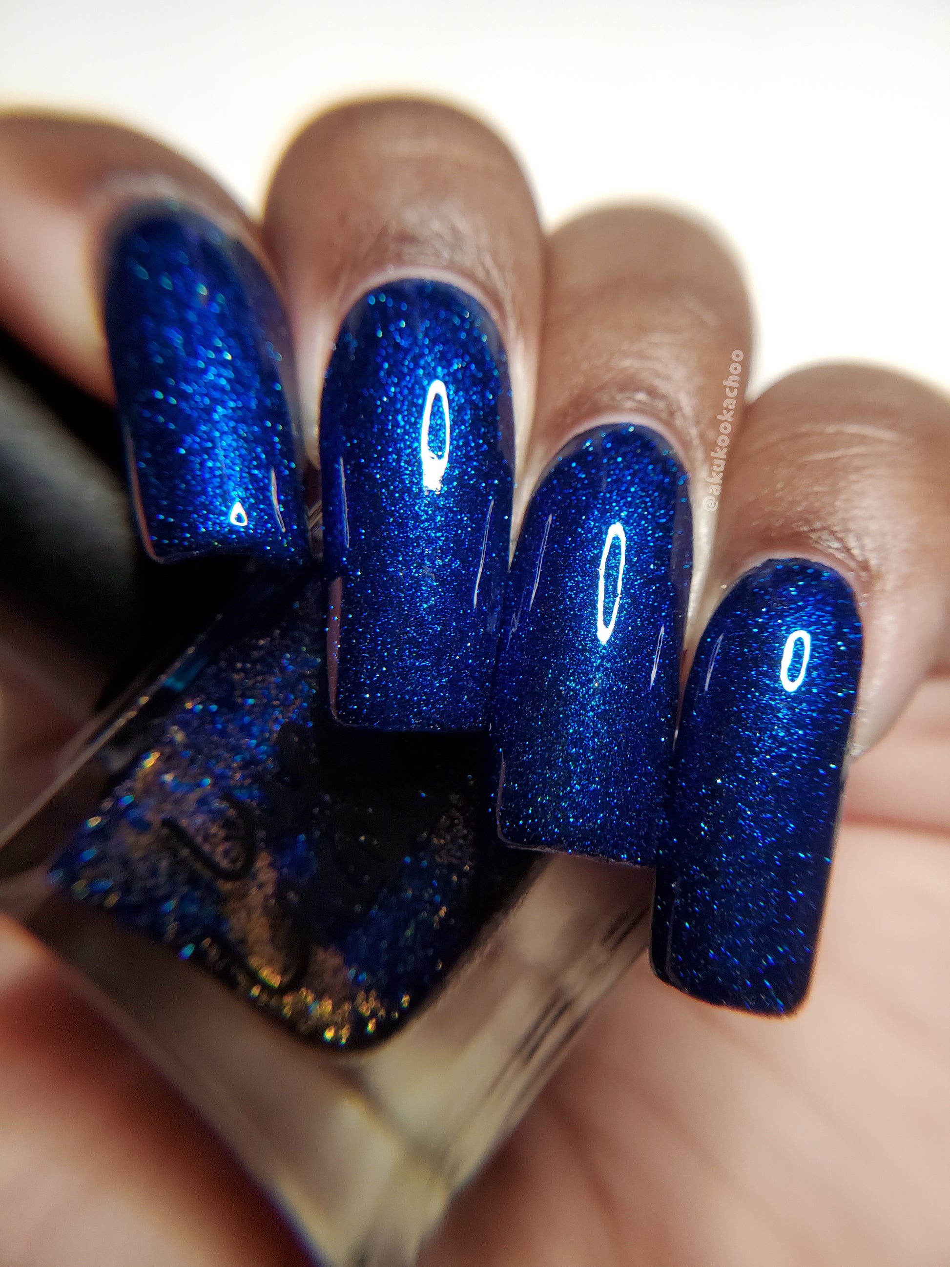 A rich cobalt base with a warm blue aurora shimmer that shifts to purple and bronze light reflective glitter