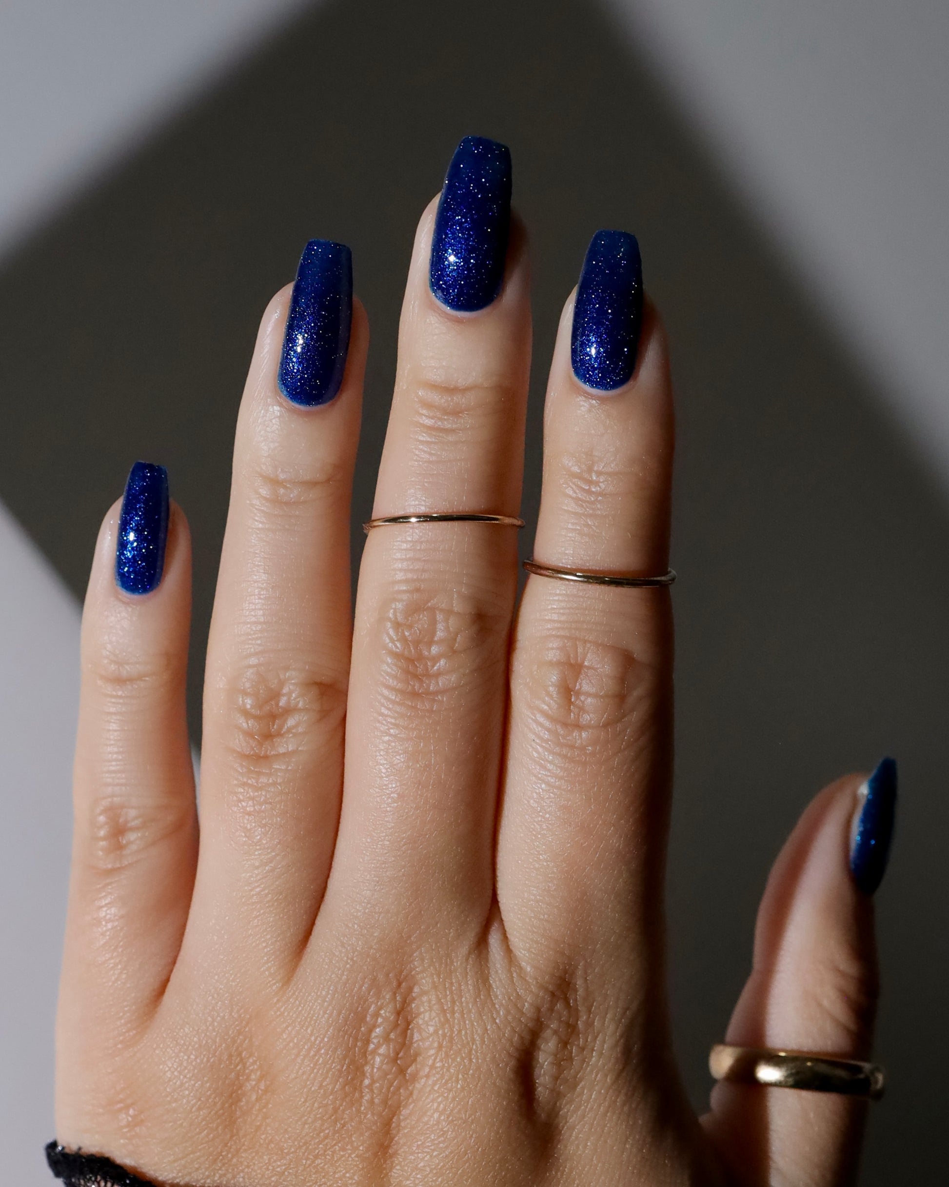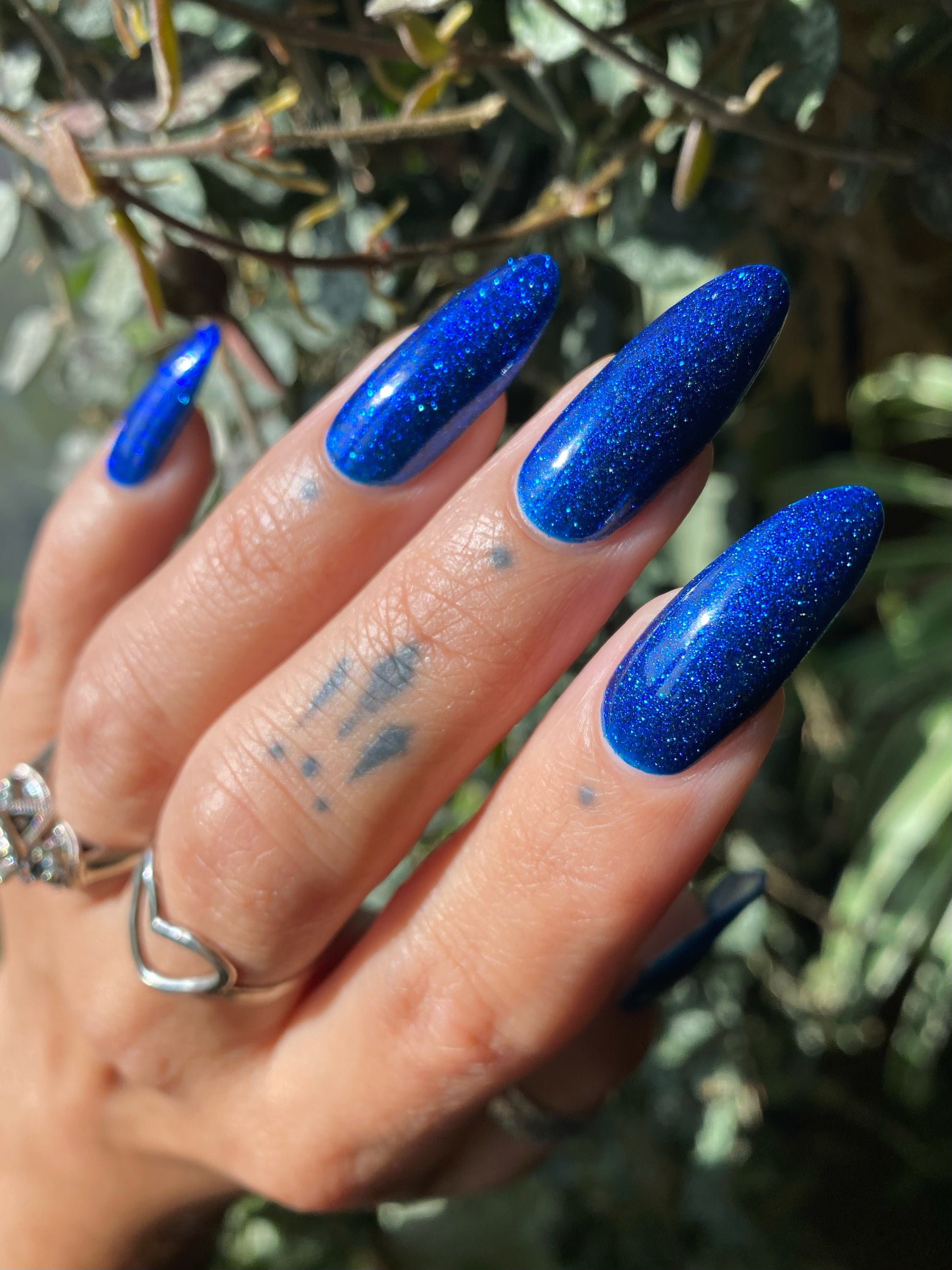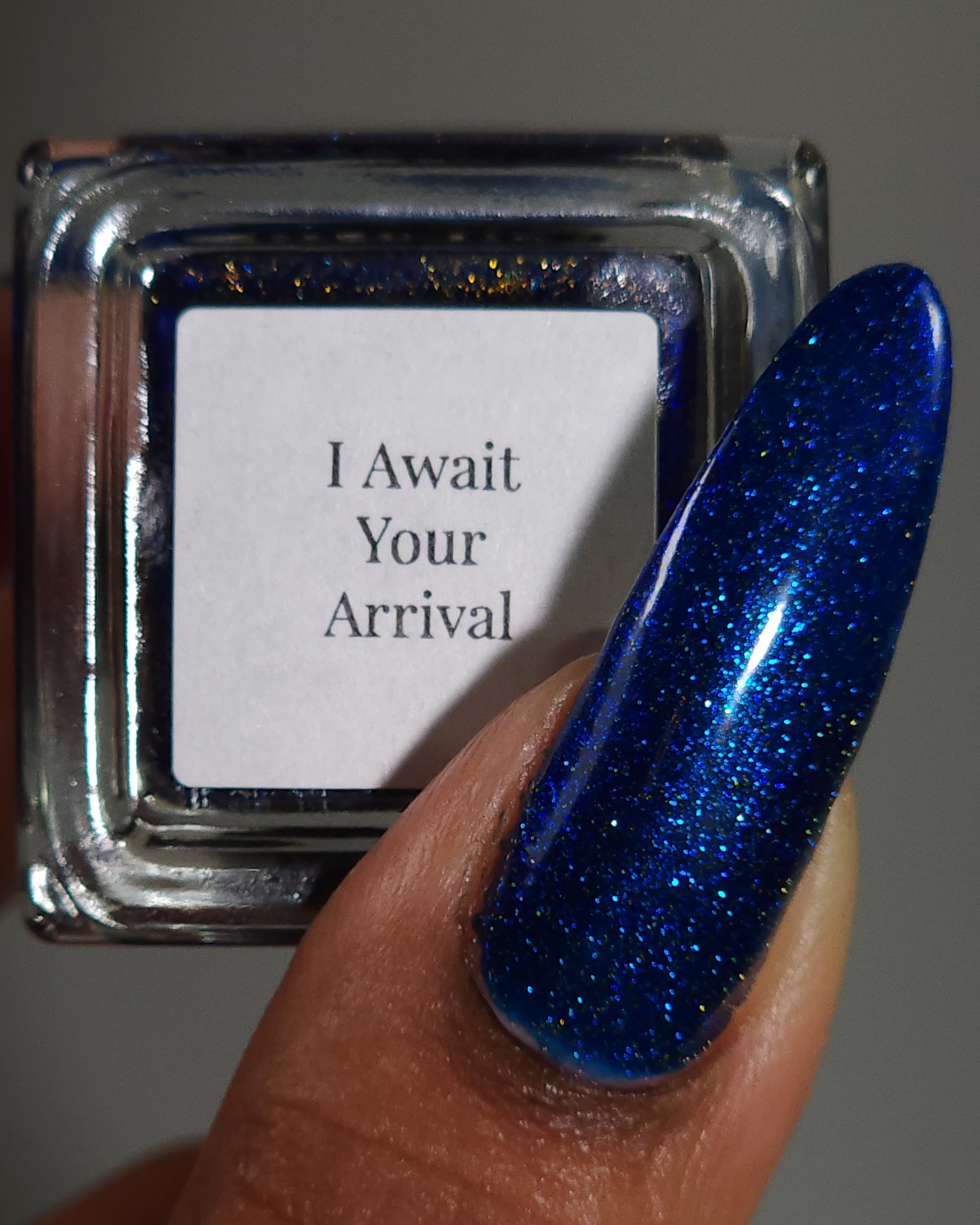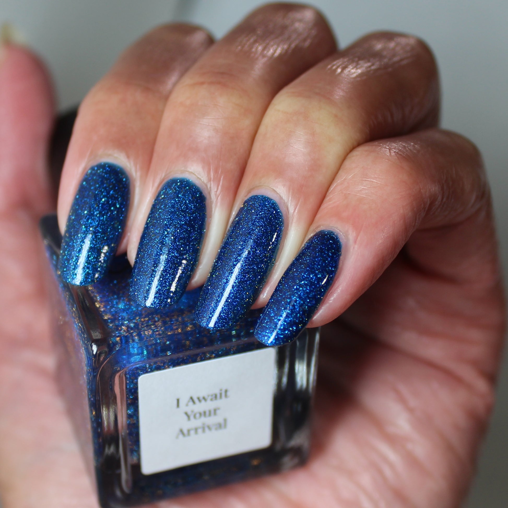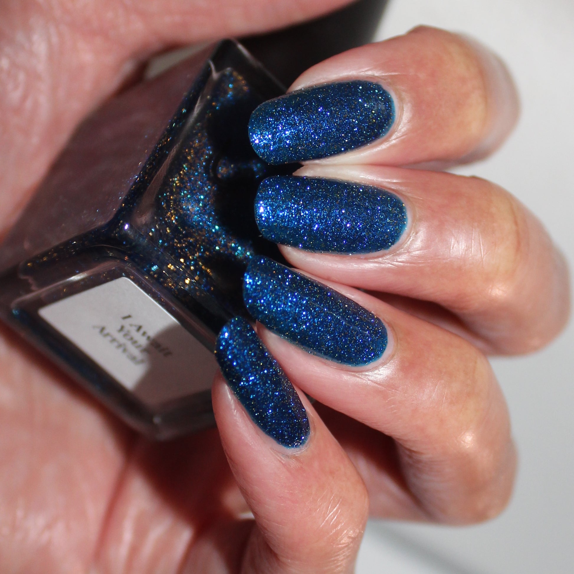 A rich cobalt base with a warm blue aurora shimmer that shifts to purple and bronze light reflective glitter