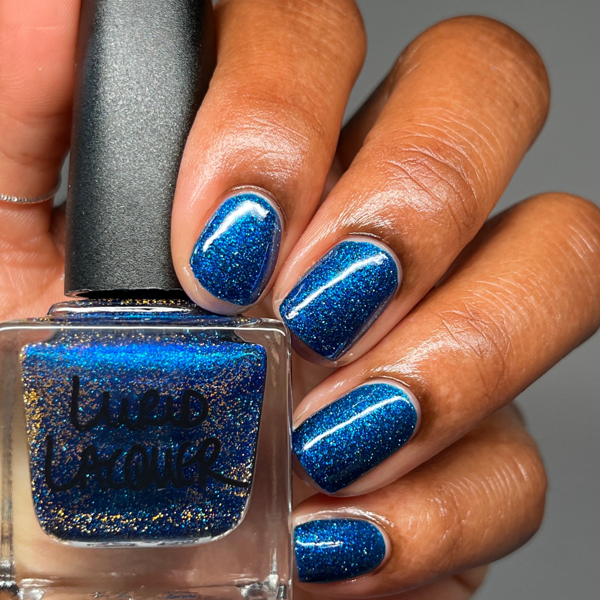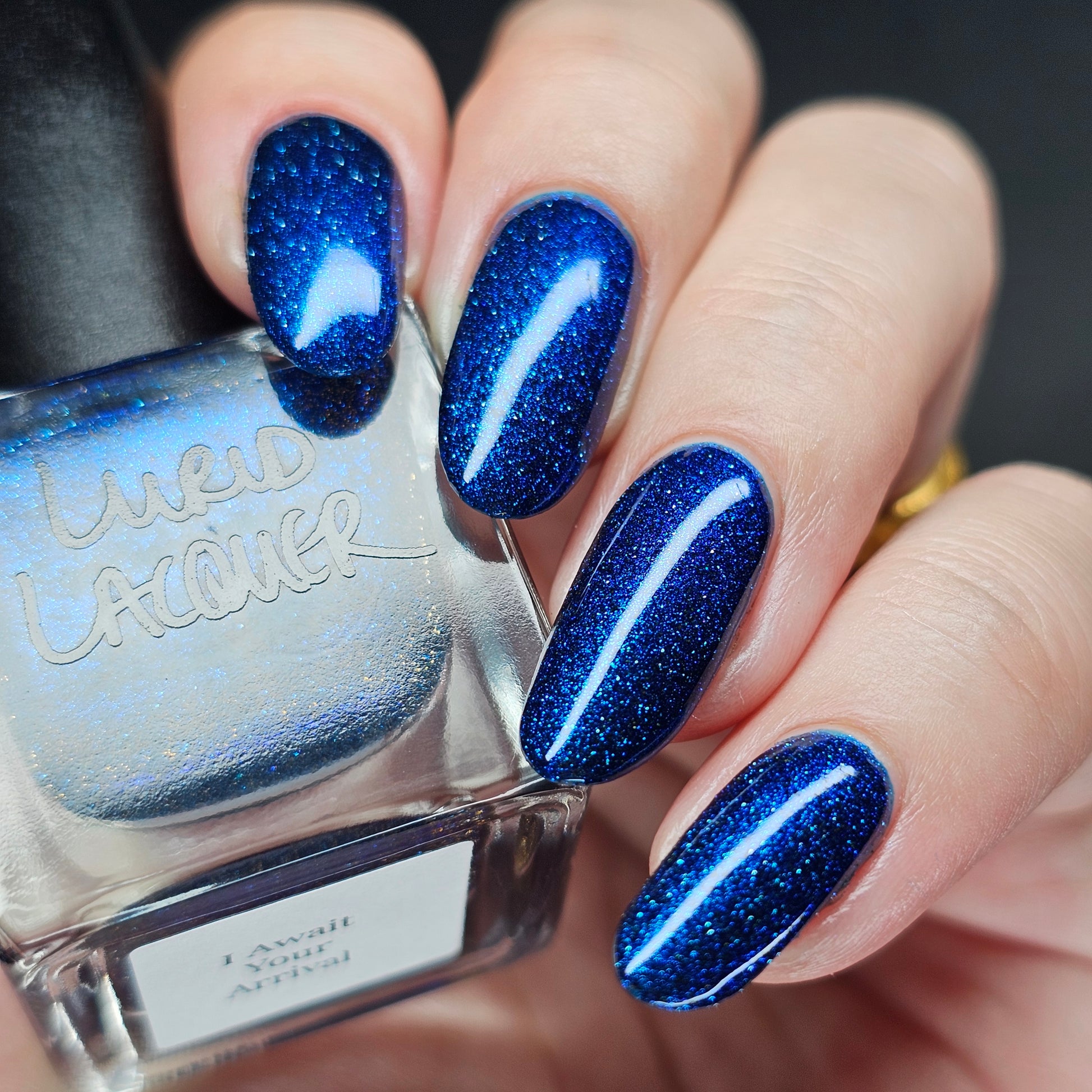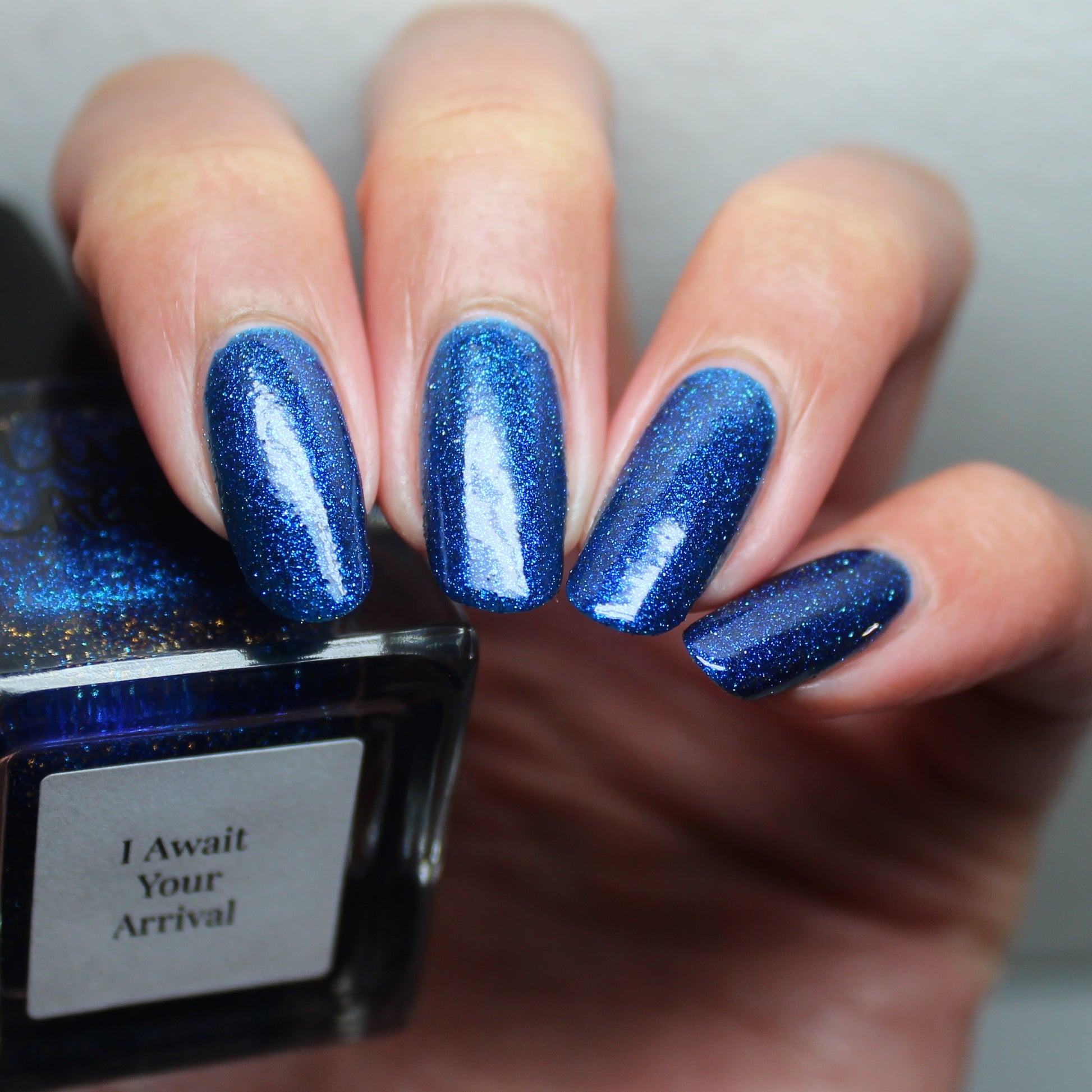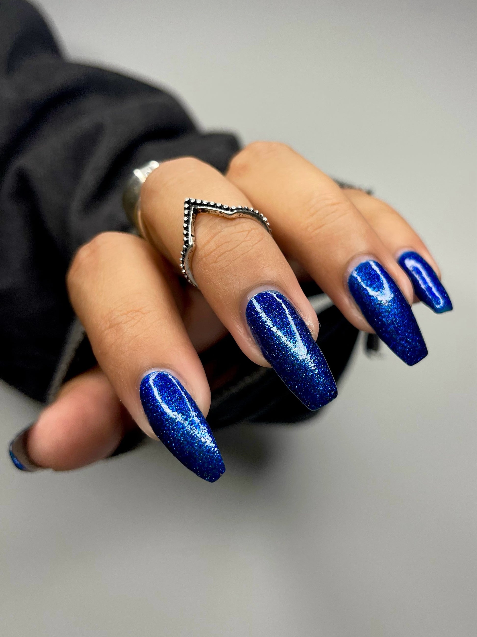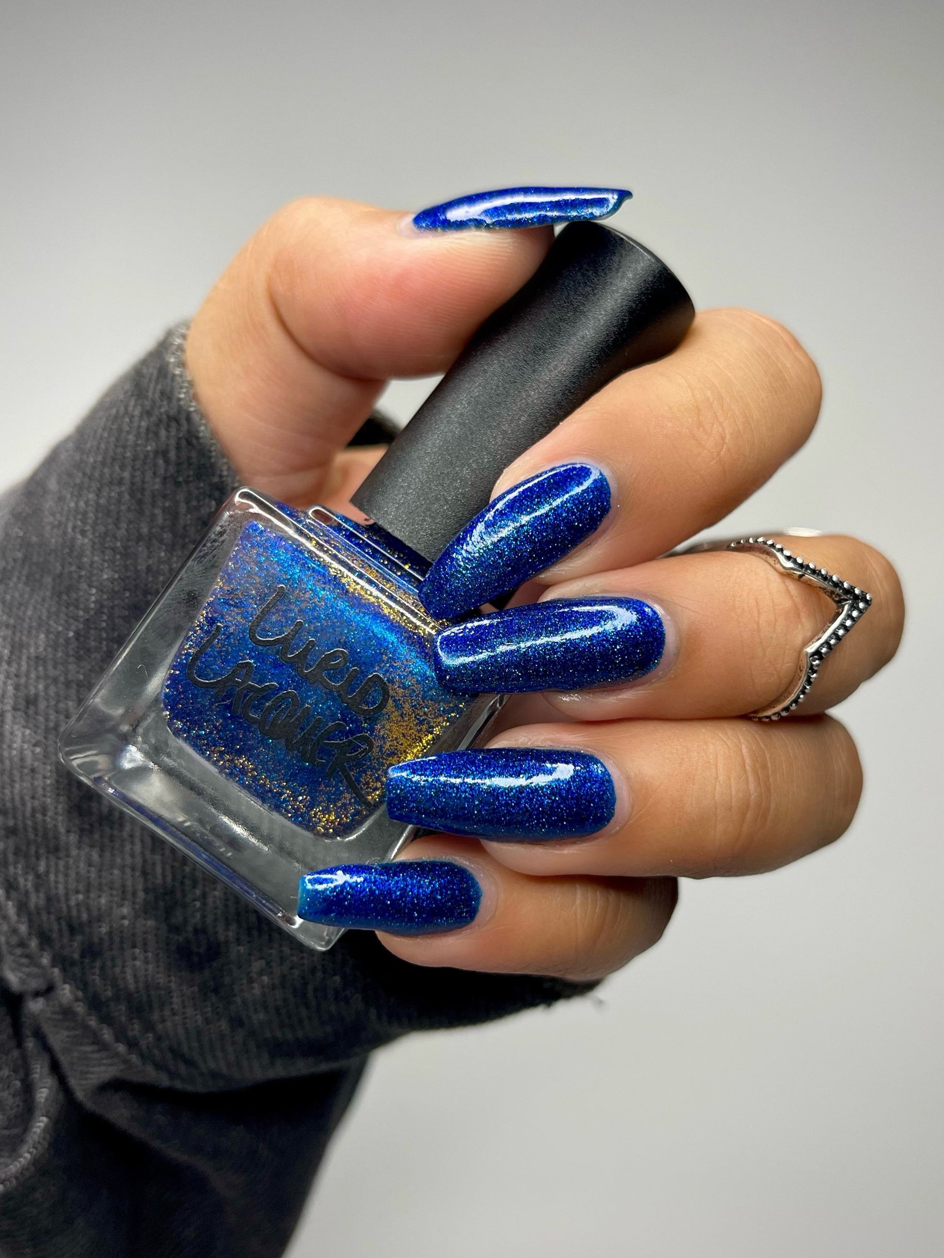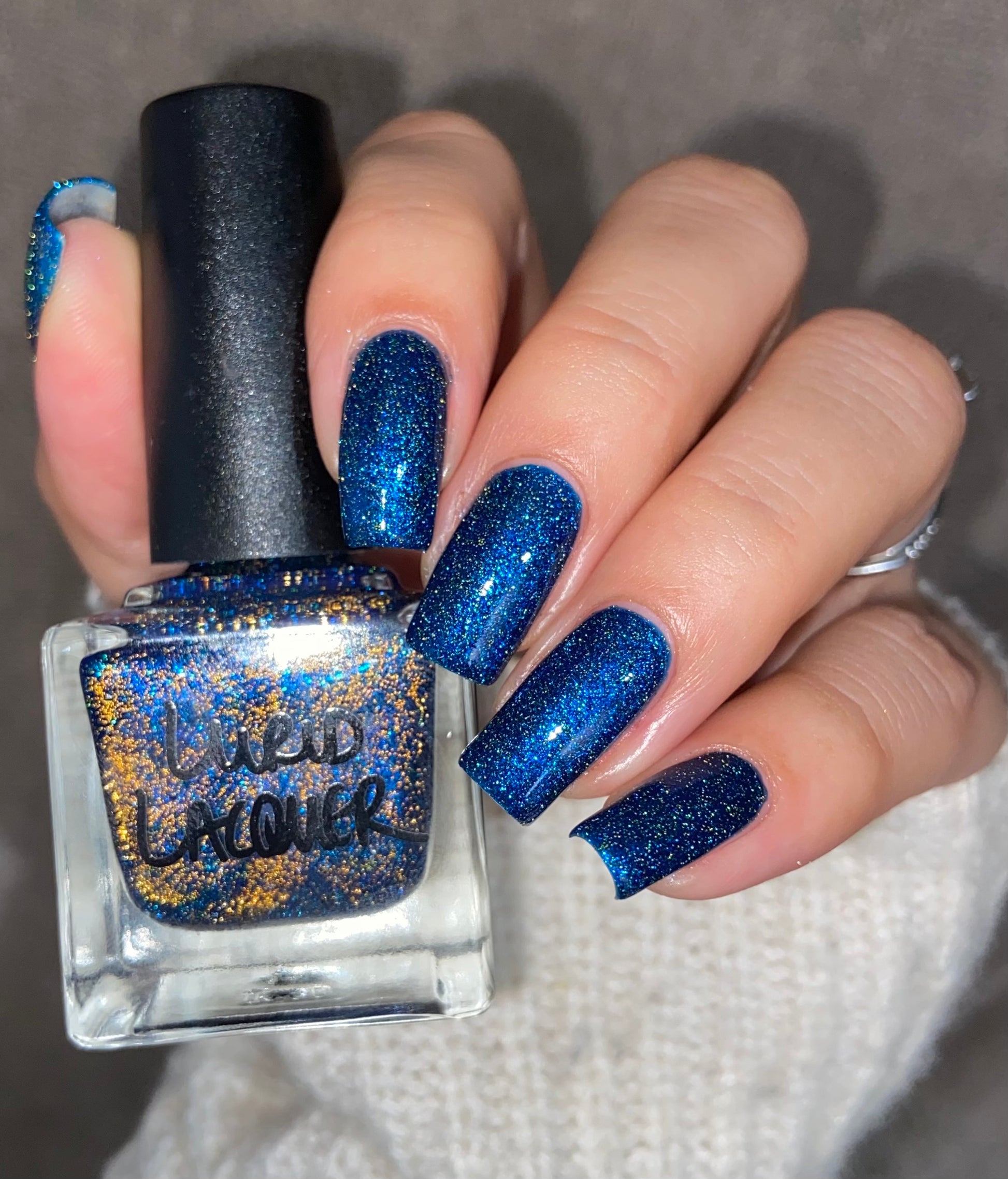 A rich cobalt base with a warm blue aurora shimmer that shifts to purple and bronze light reflective glitter