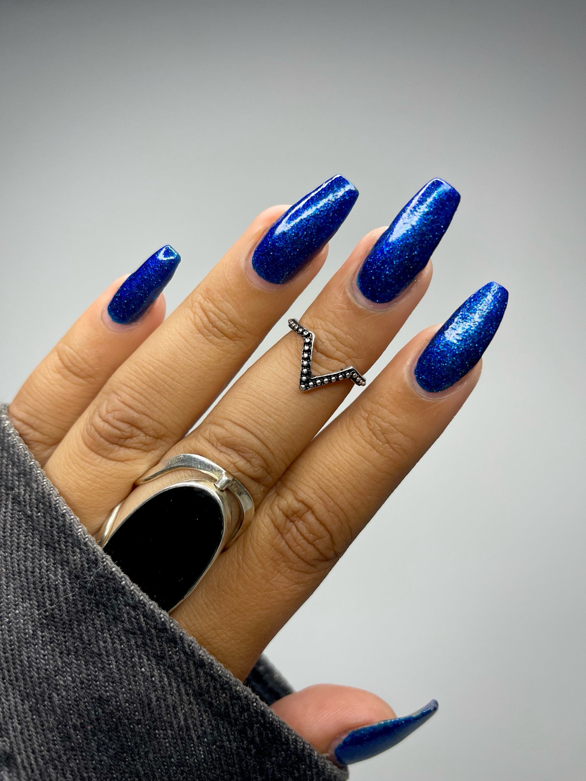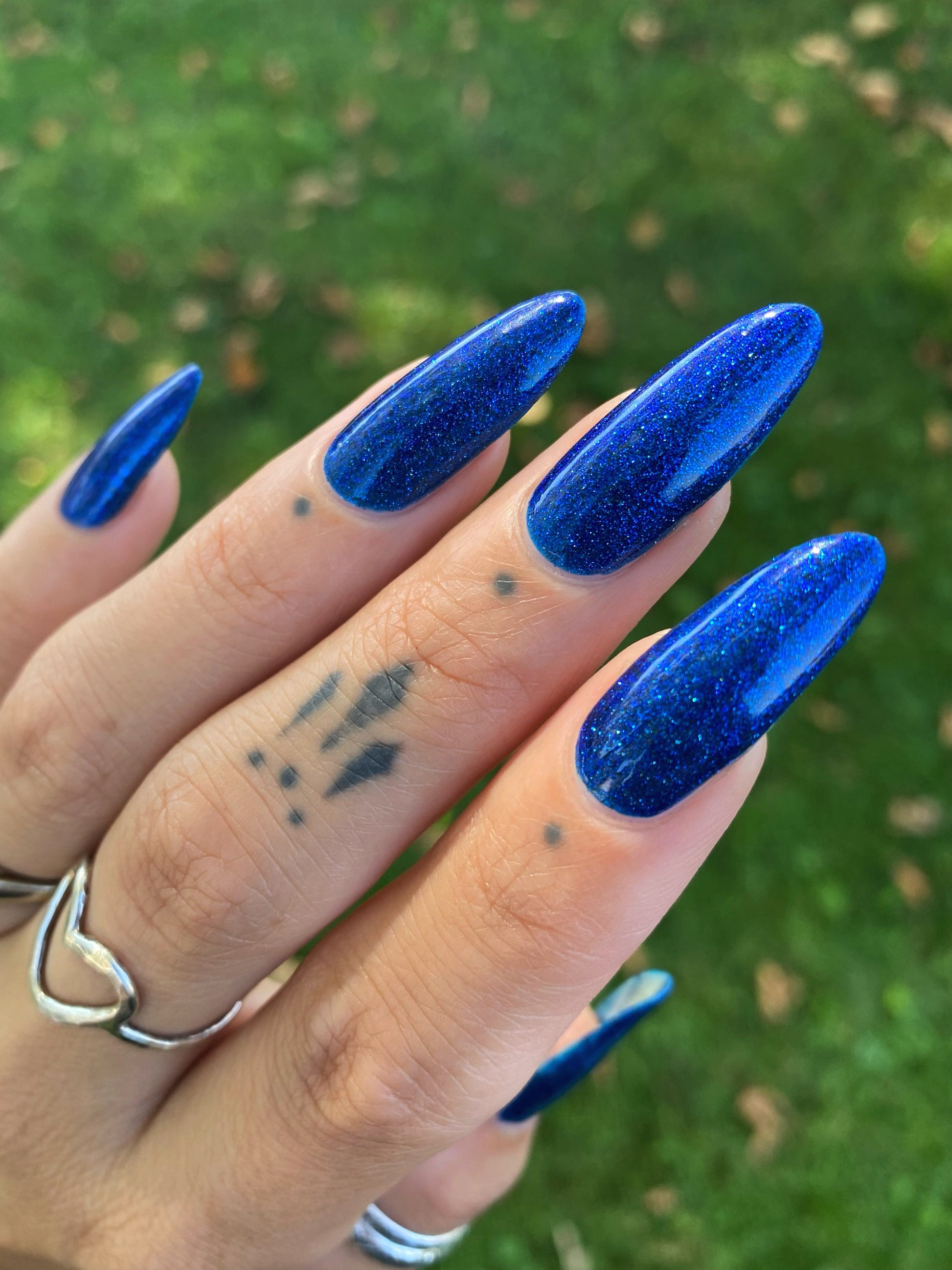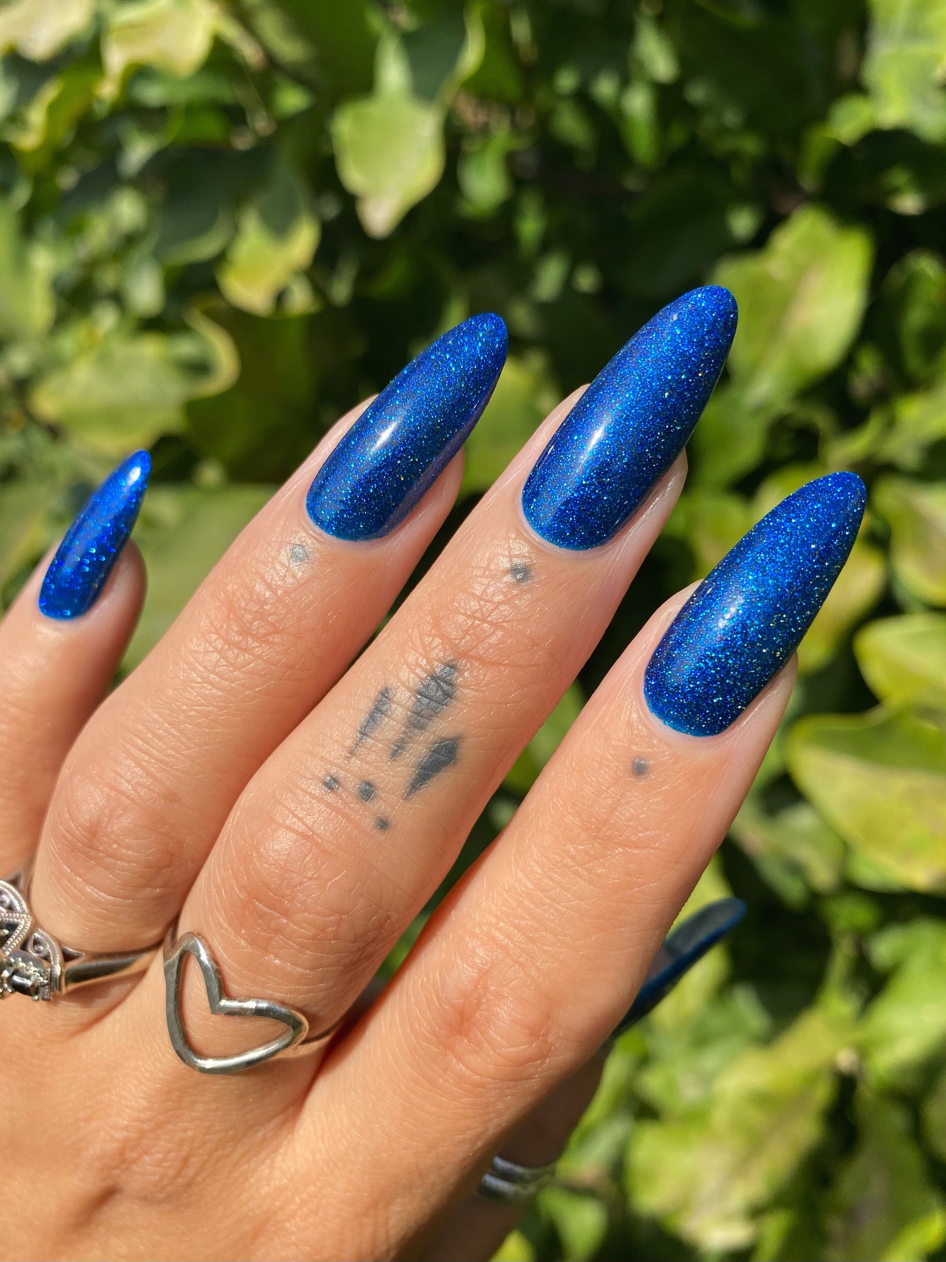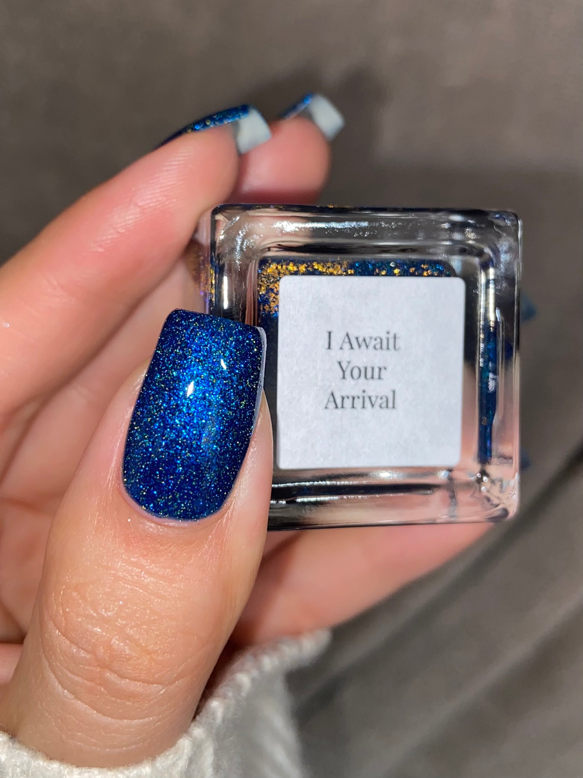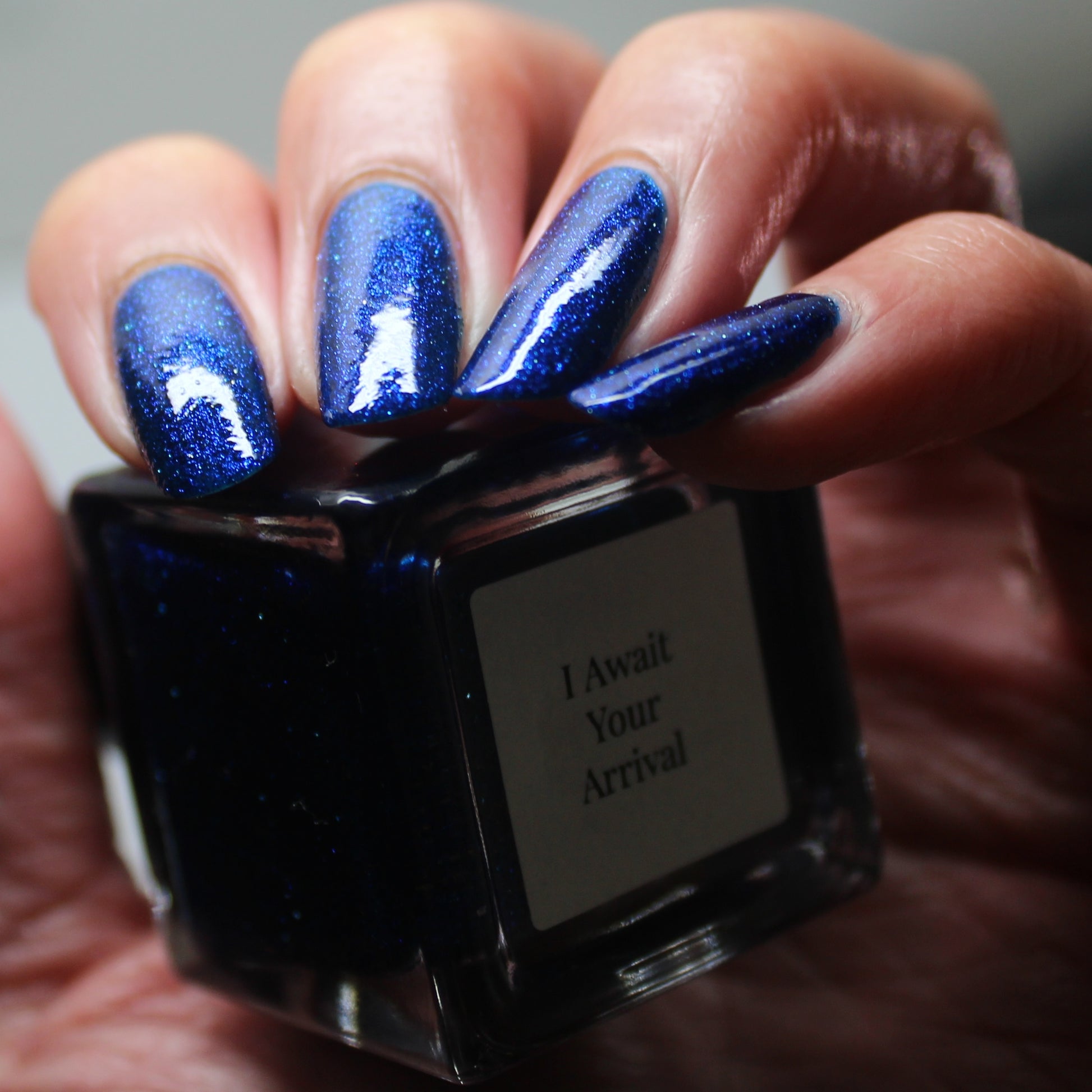 A rich cobalt base with a warm blue aurora shimmer that shifts to purple and bronze light reflective glitter
