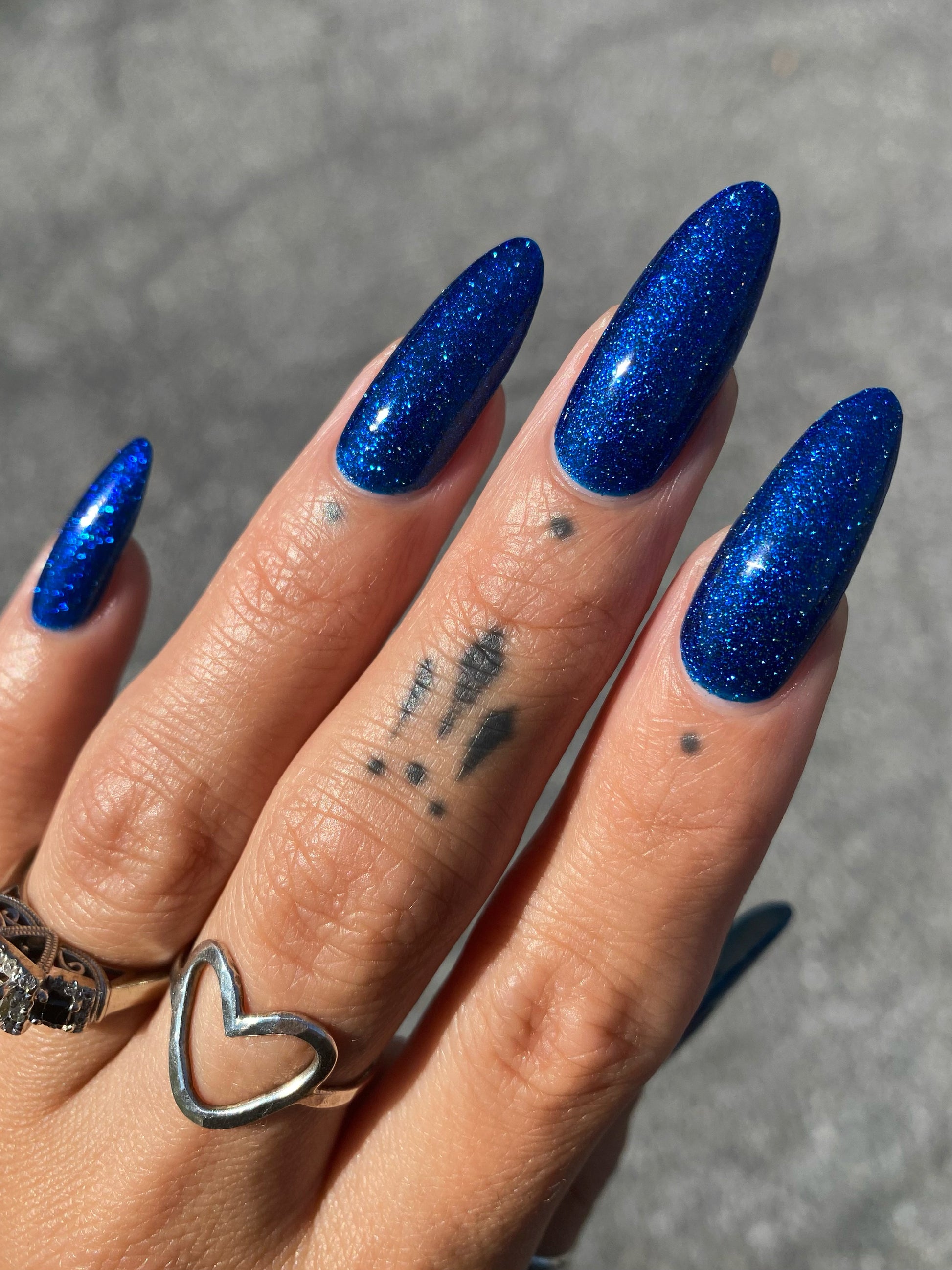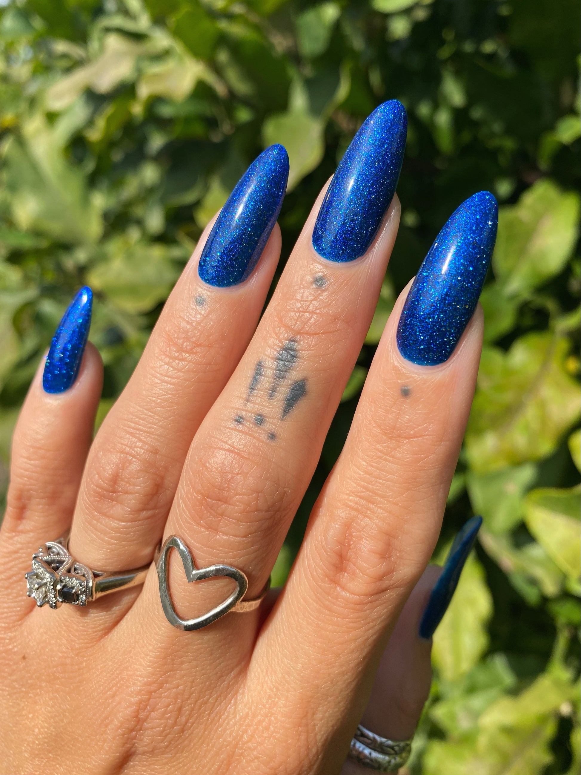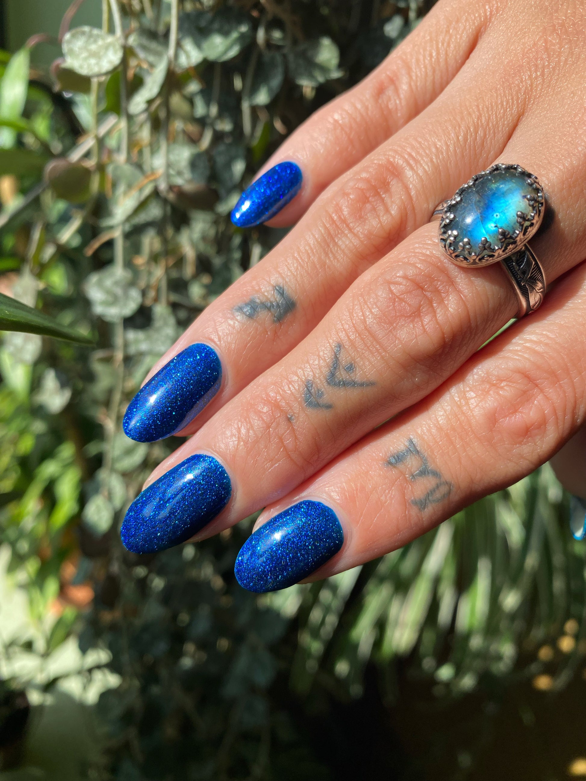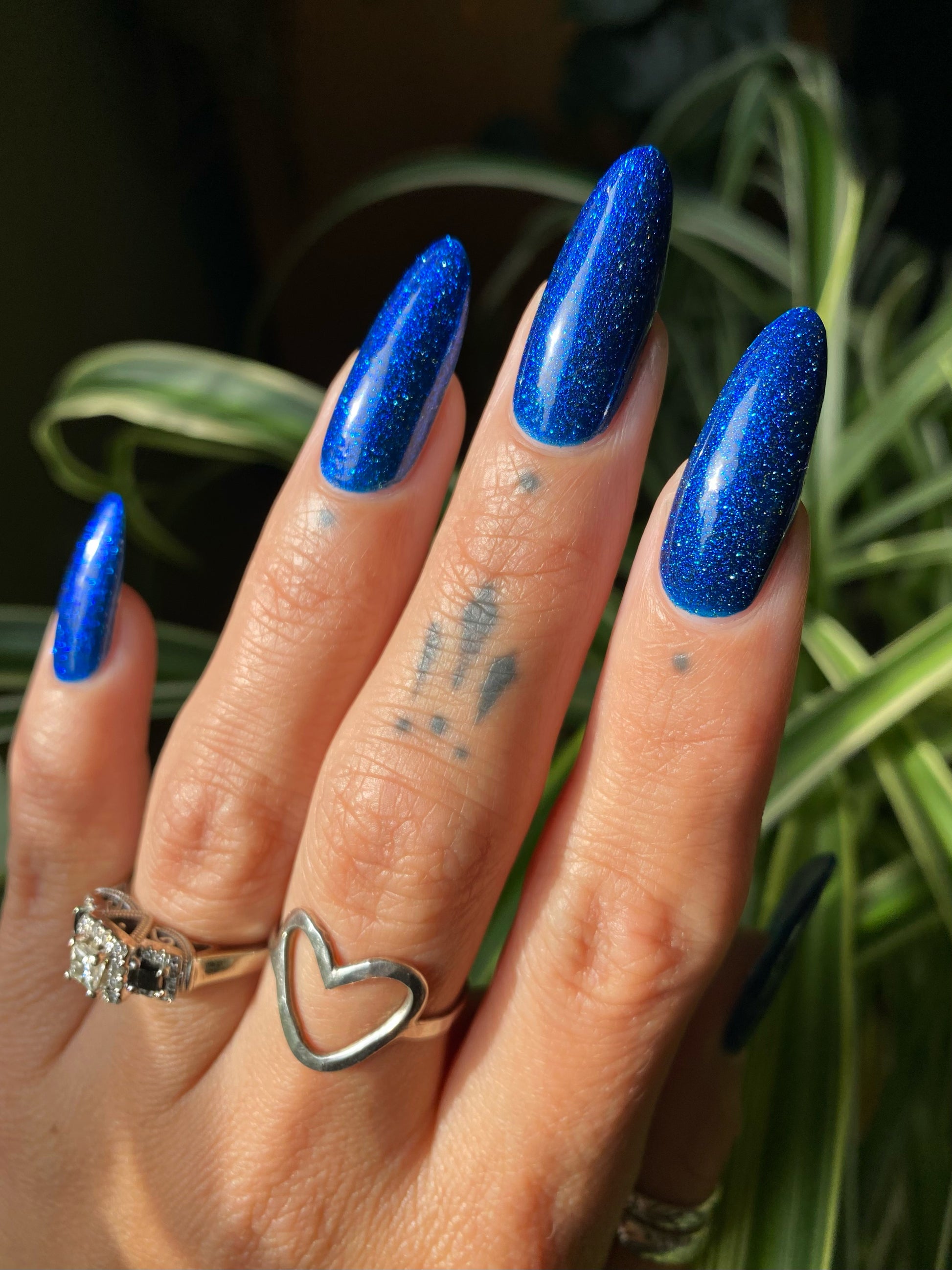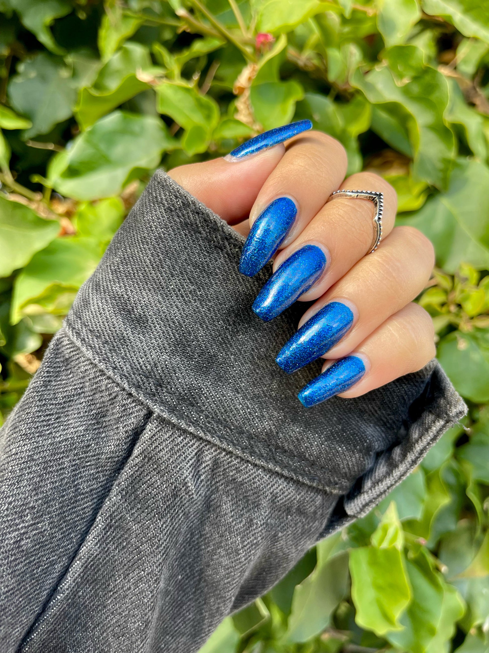 A rich cobalt base with a warm blue aurora shimmer that shifts to purple and bronze light reflective glitter