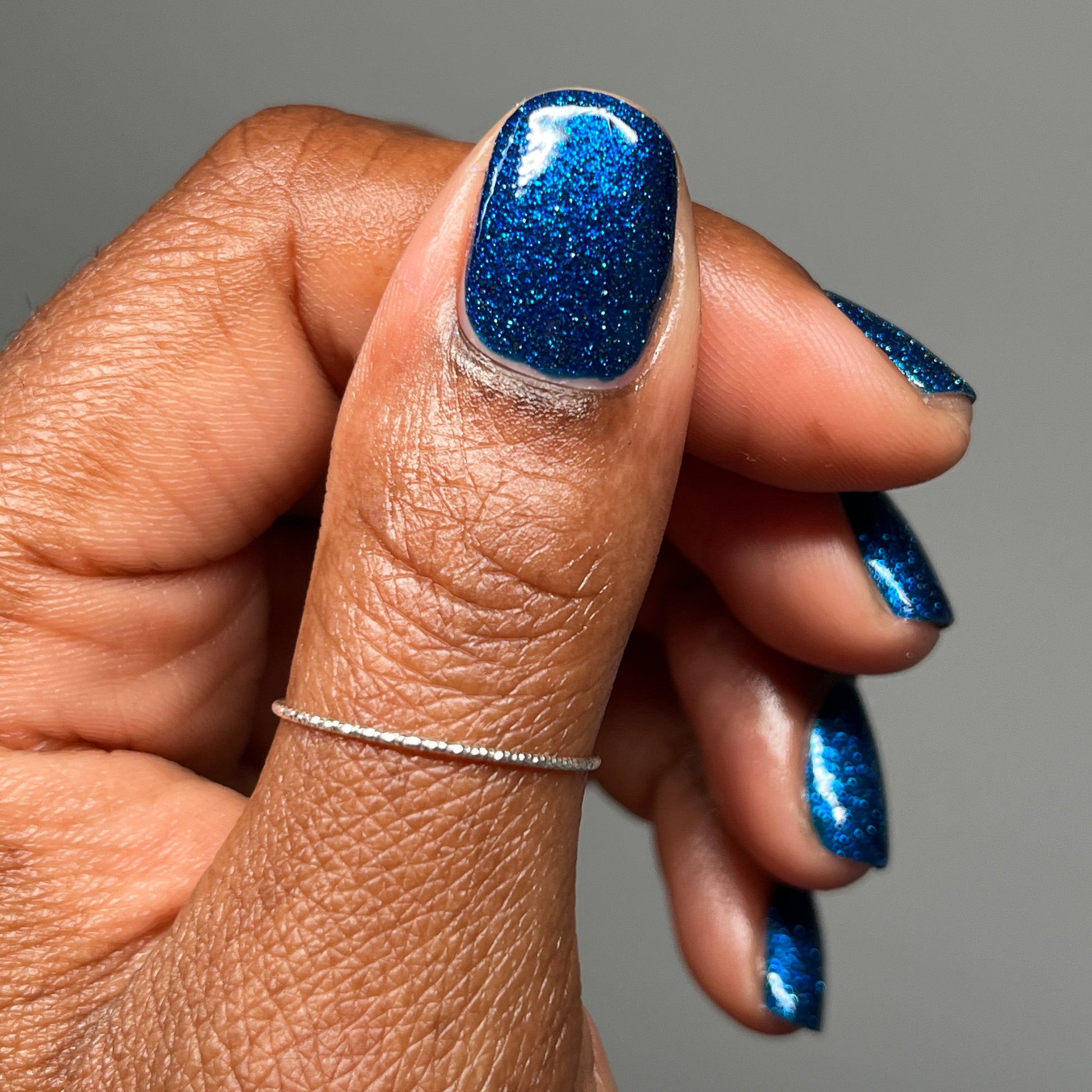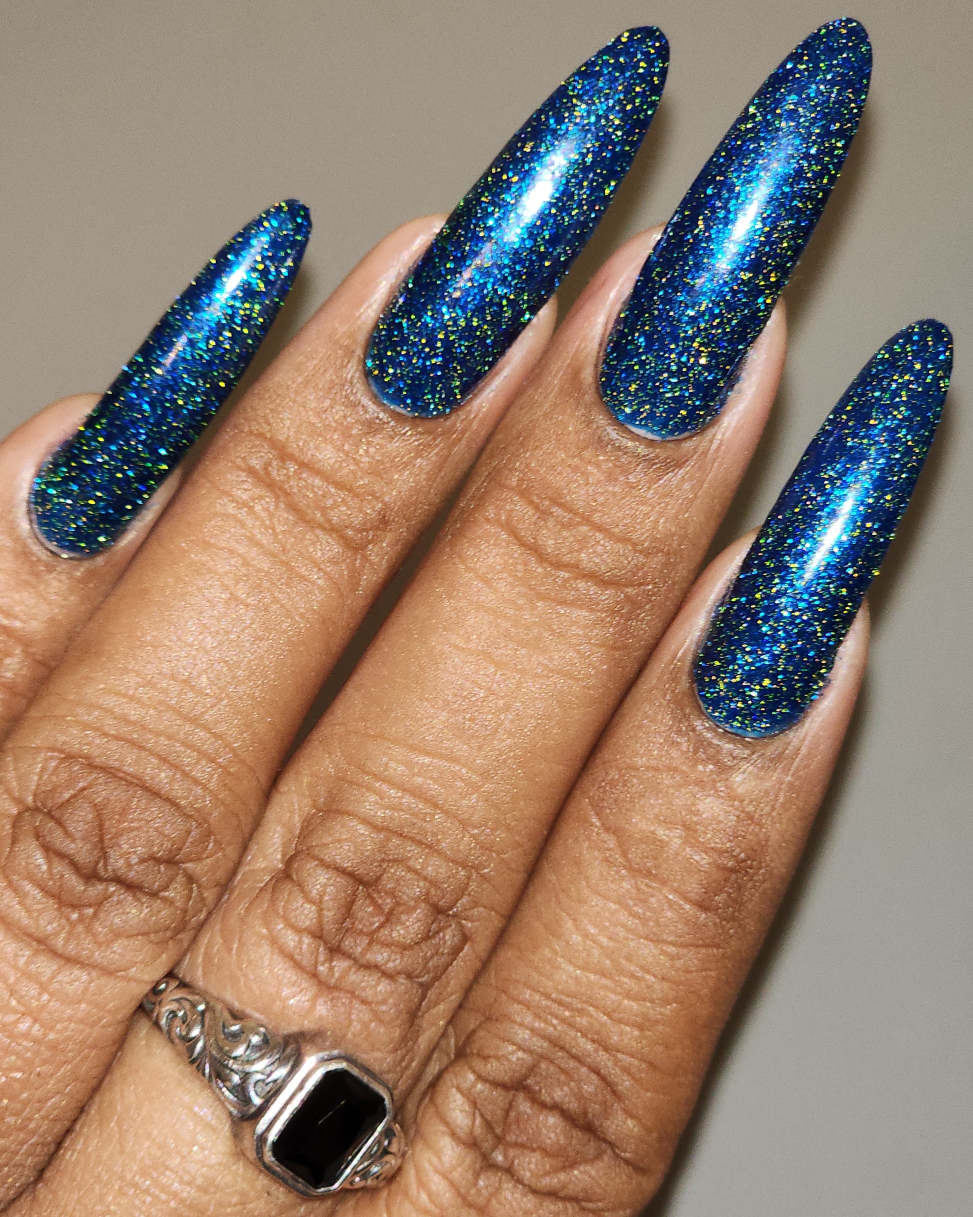 Please note: Reflective glitter polishes are textured and dry down with a gritty, sandpaper feeling. To make them look smooth and glossy, I recommend applying 2-3 coats of the polish, then applying one coat of a glitter smoother, followed by one coat of top coat.