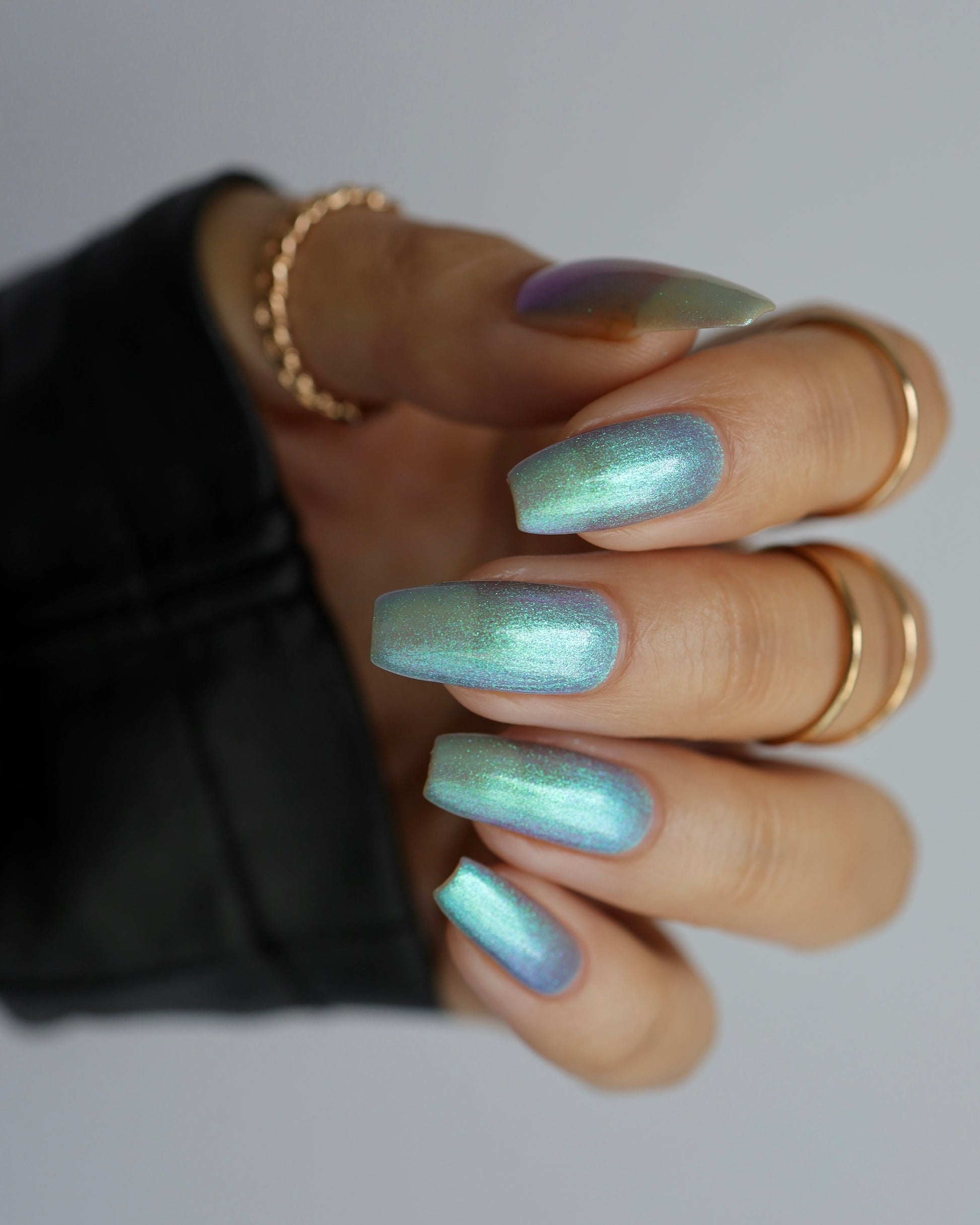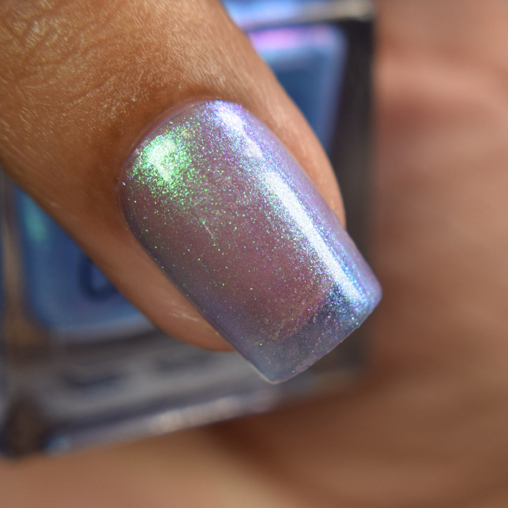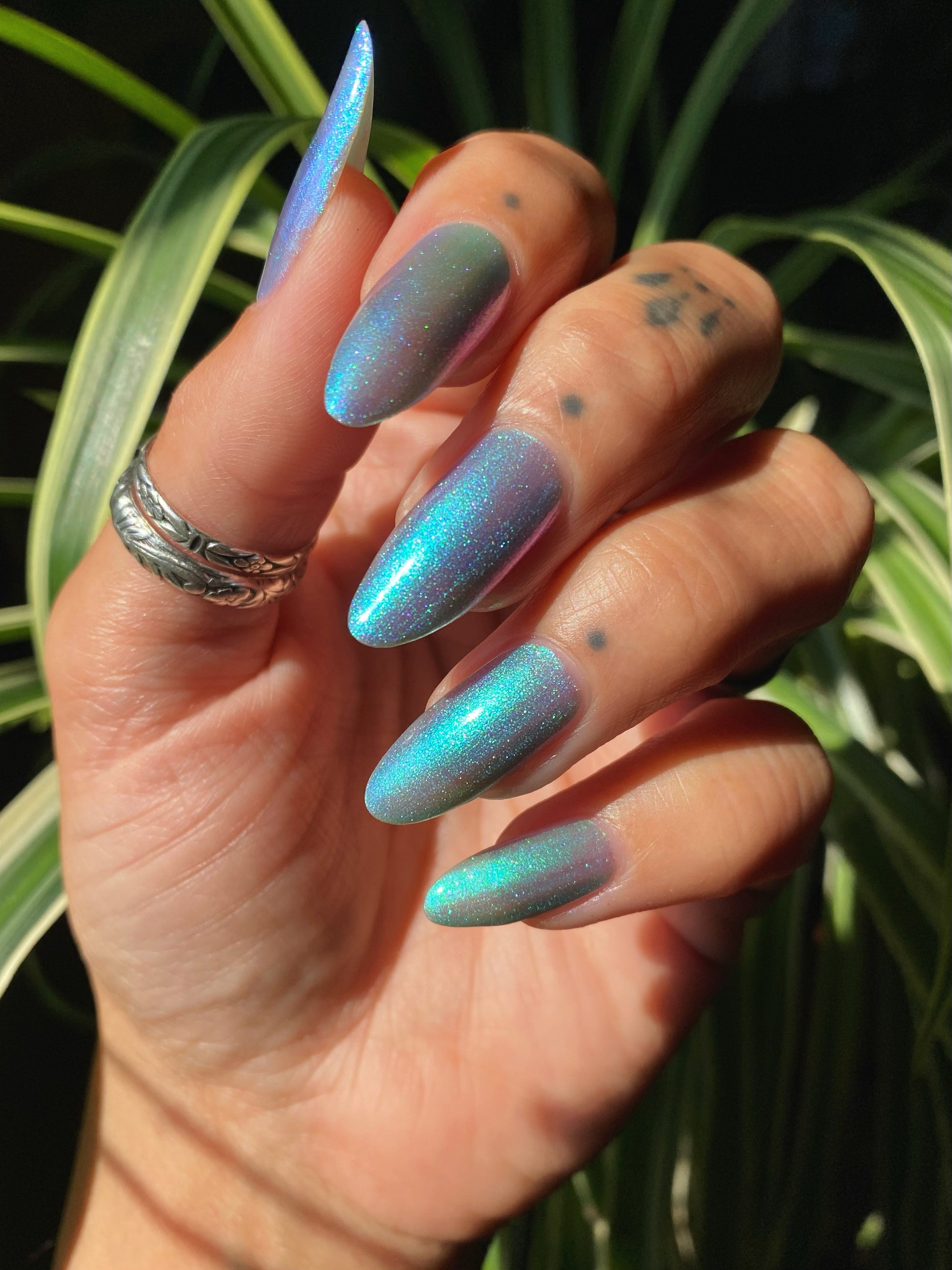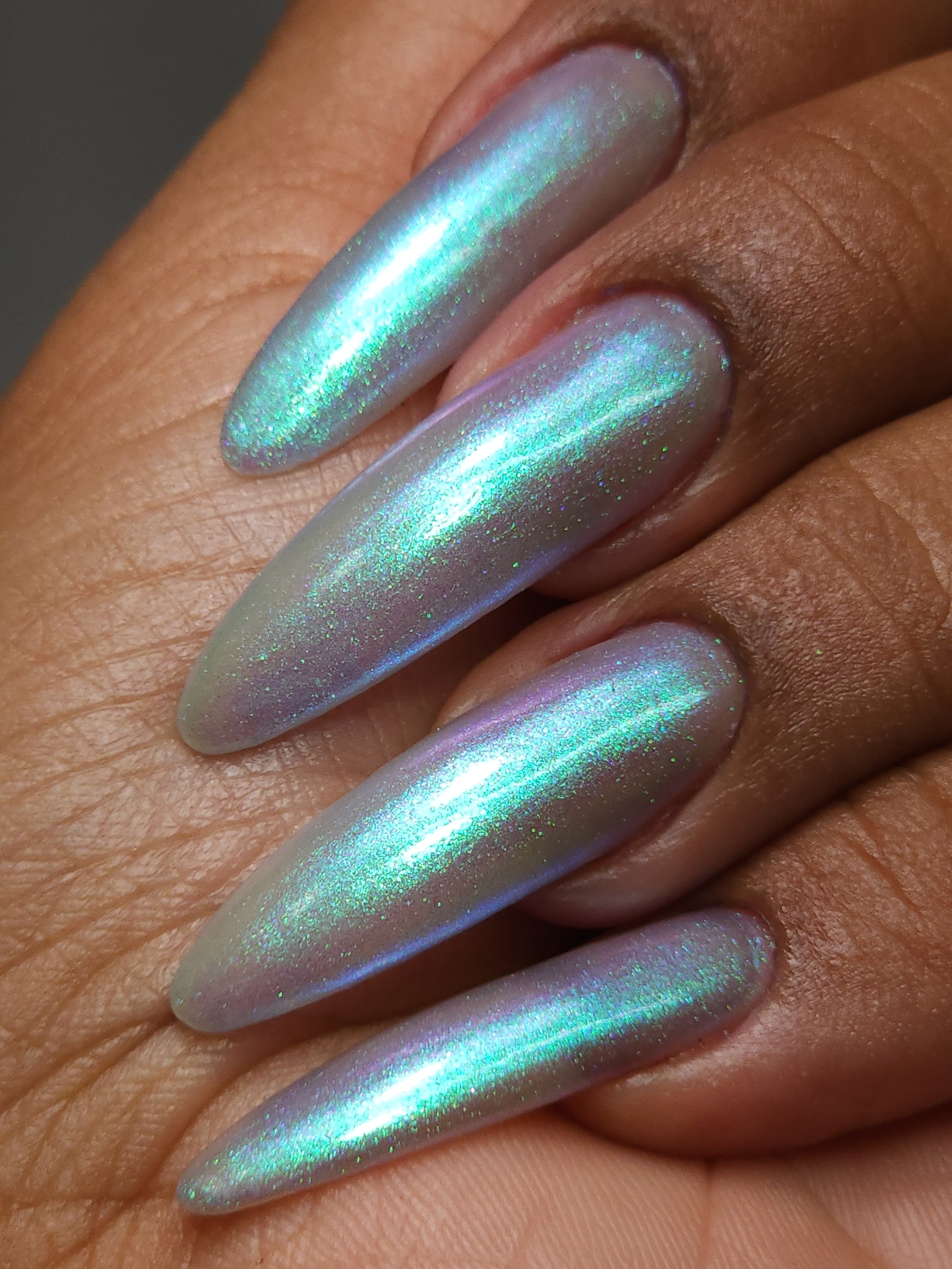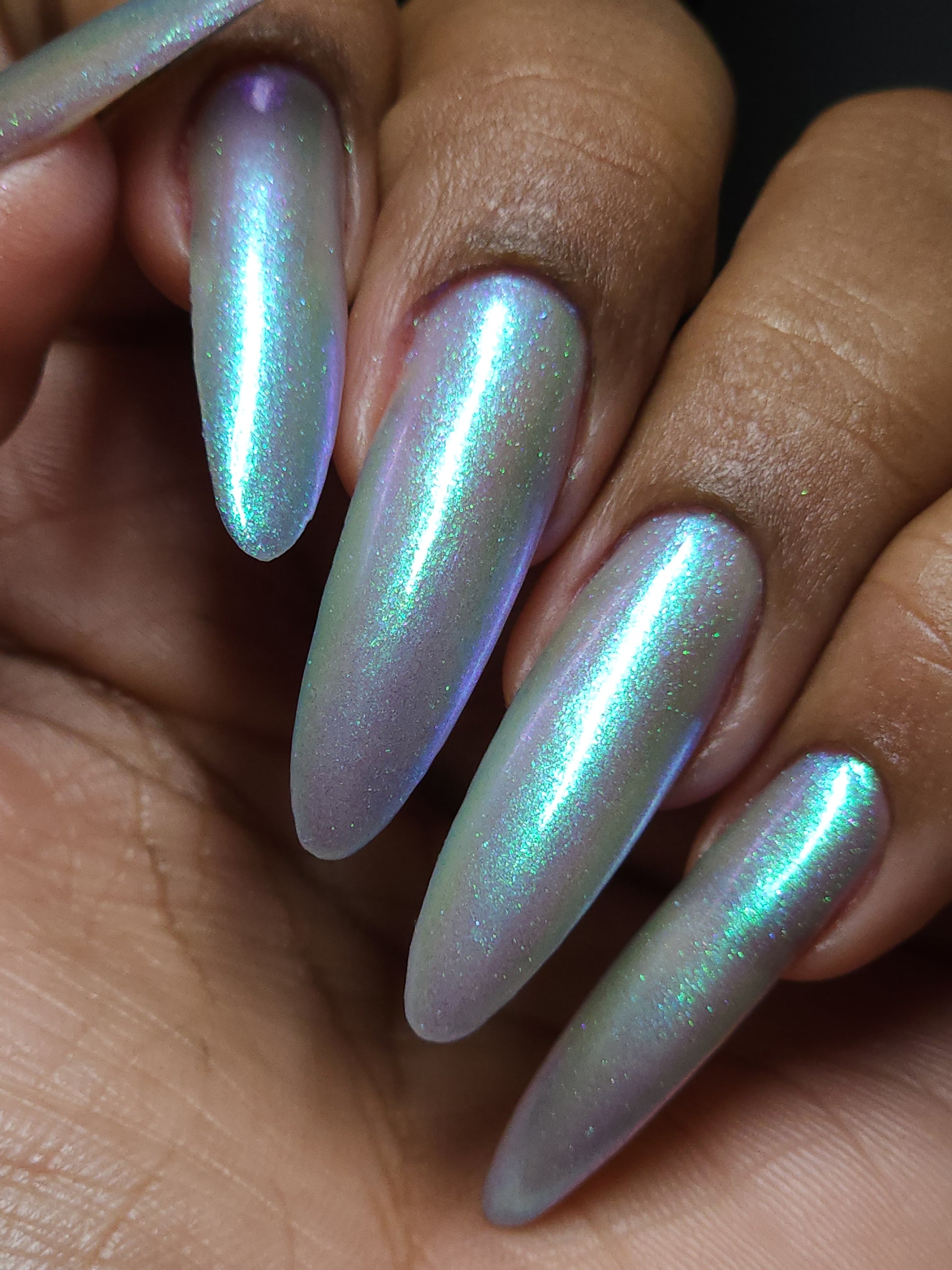 A semi-sheer indigo jelly base with aurora shimmer that shifts green to purple