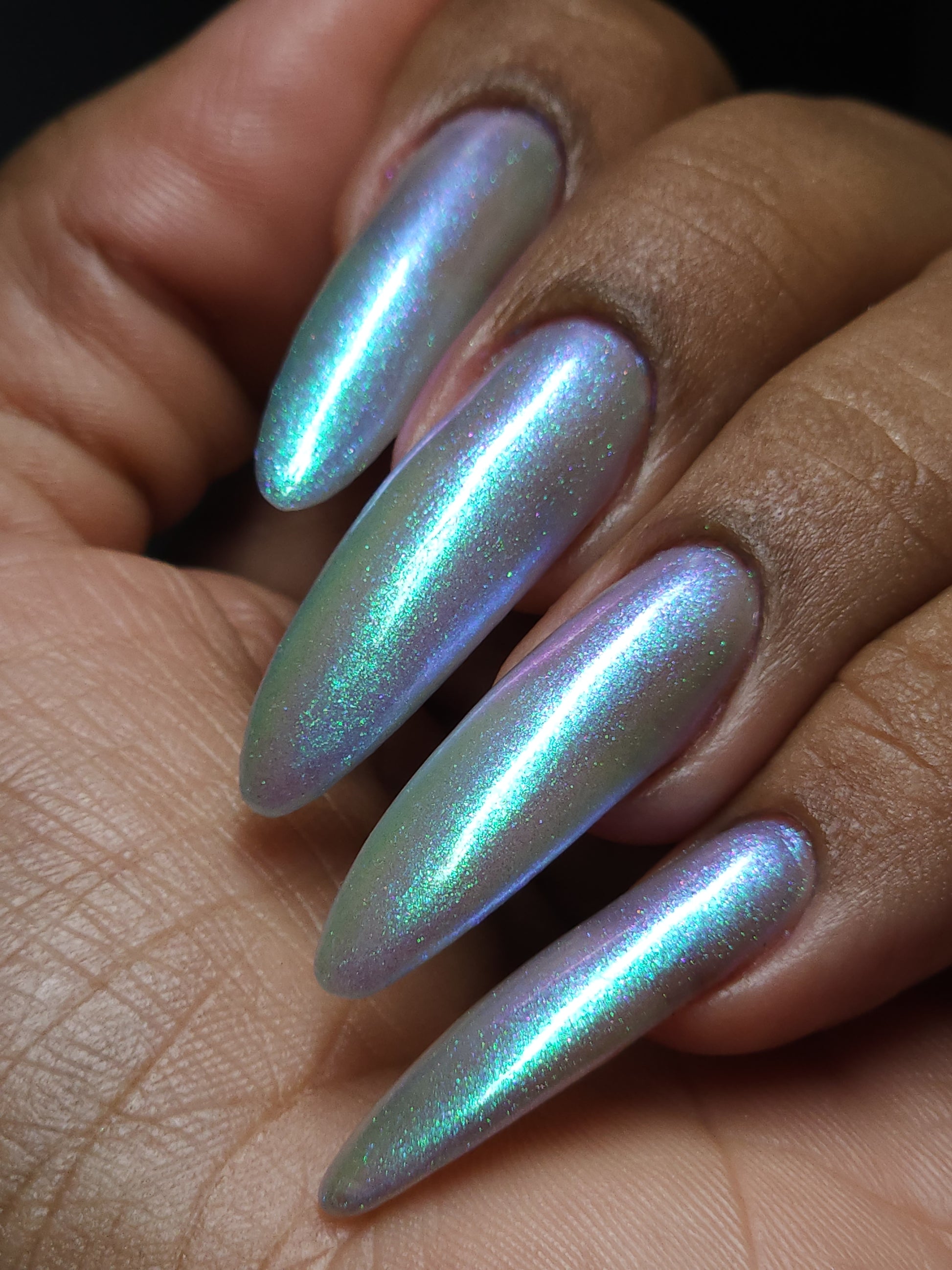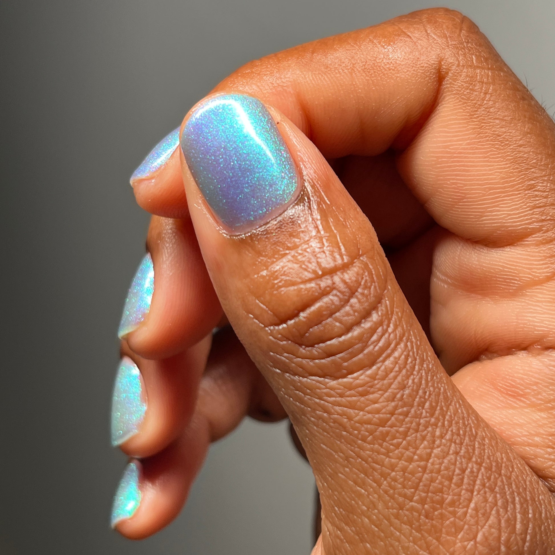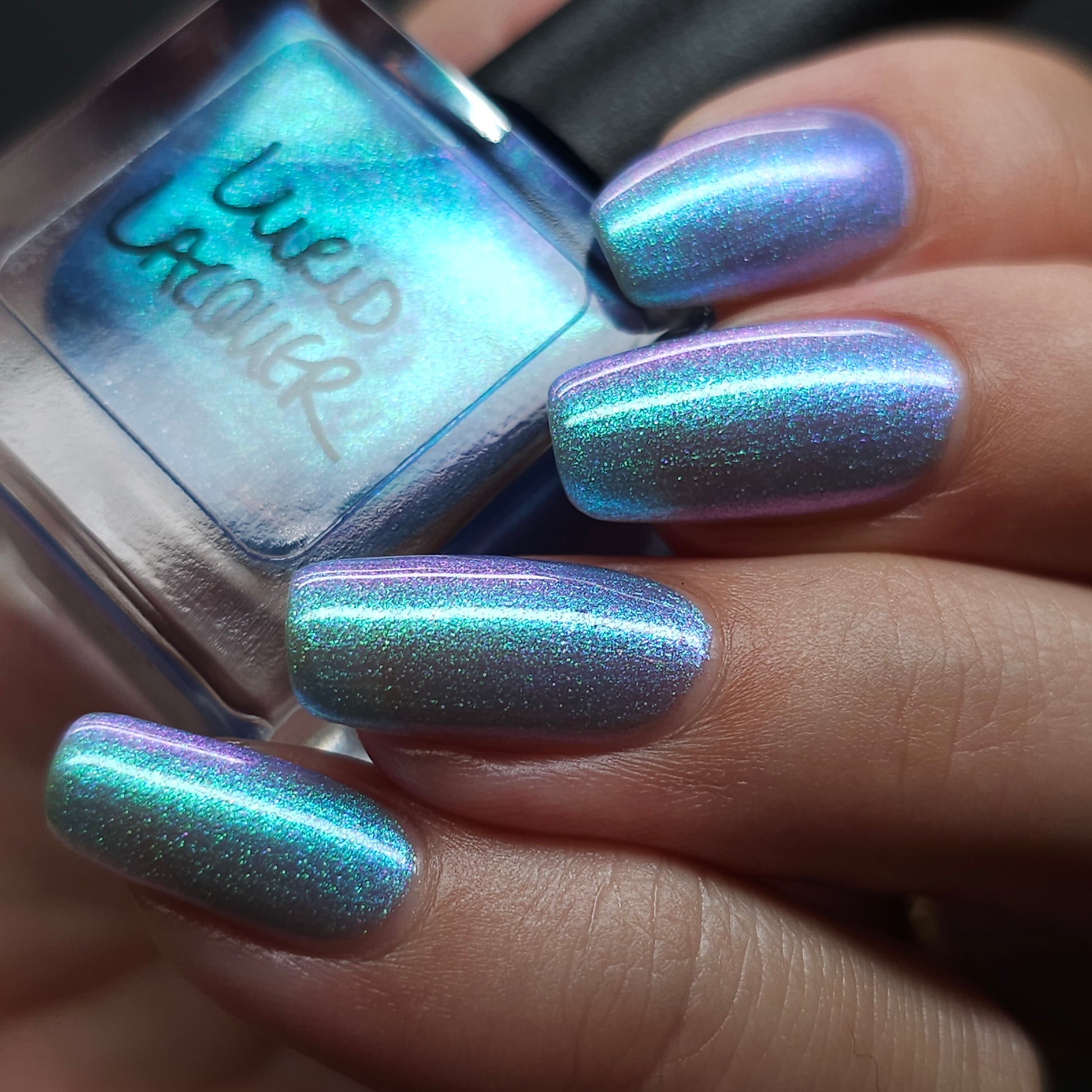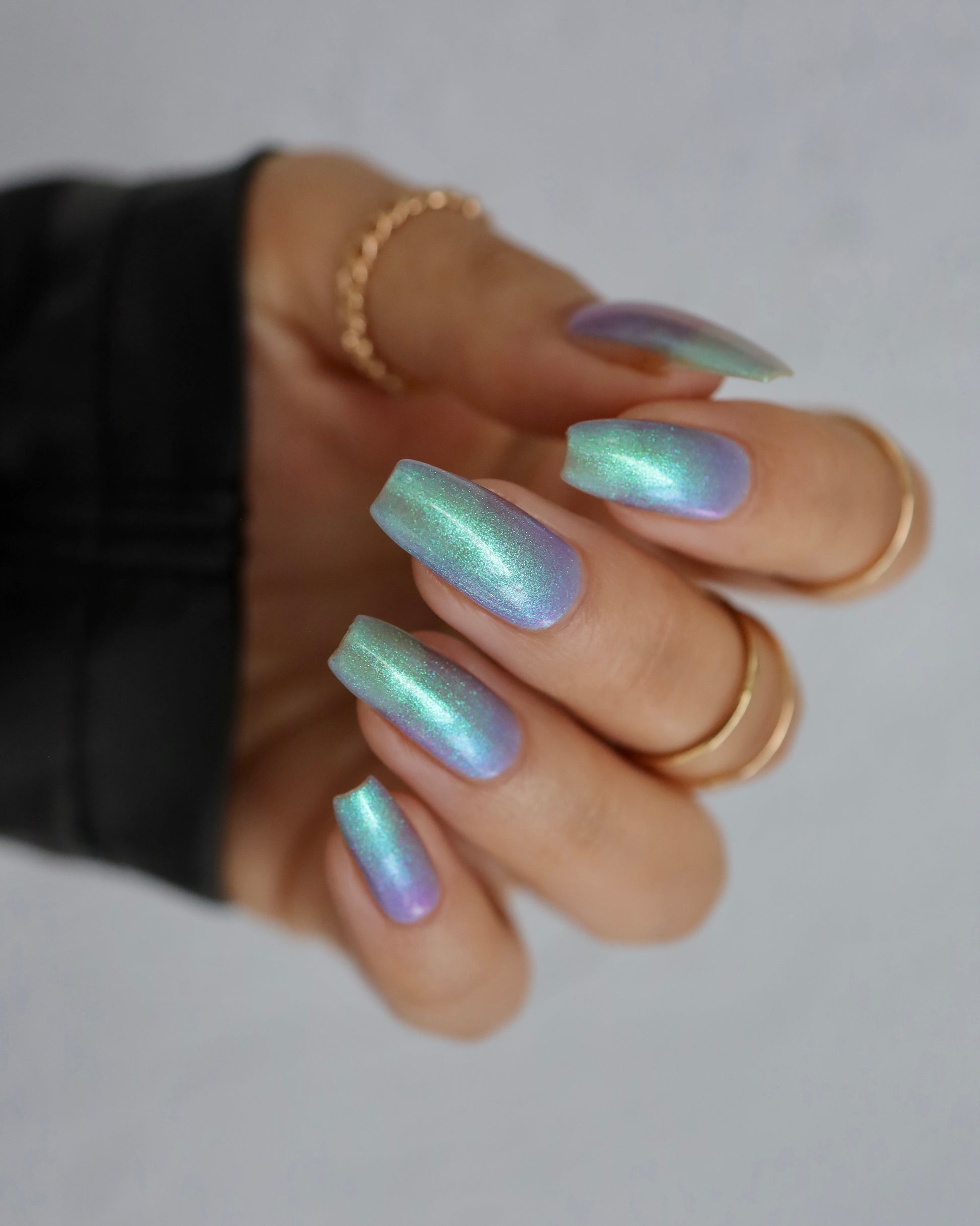 A semi-sheer indigo jelly base with aurora shimmer that shifts green to purple