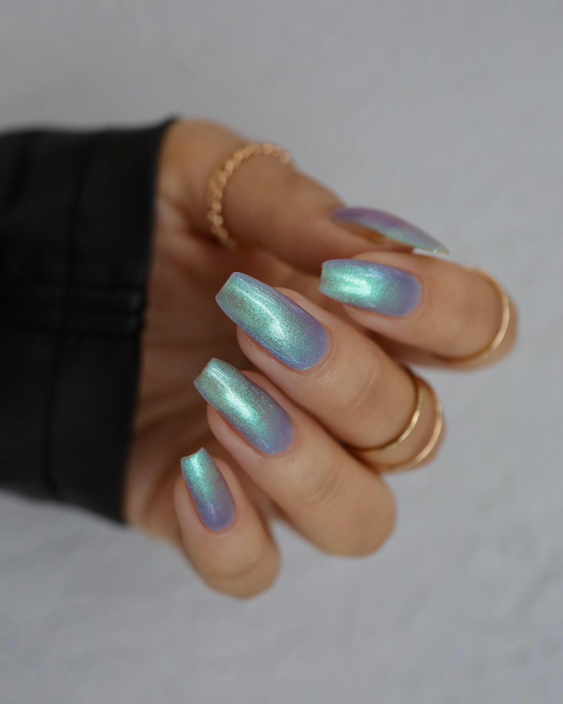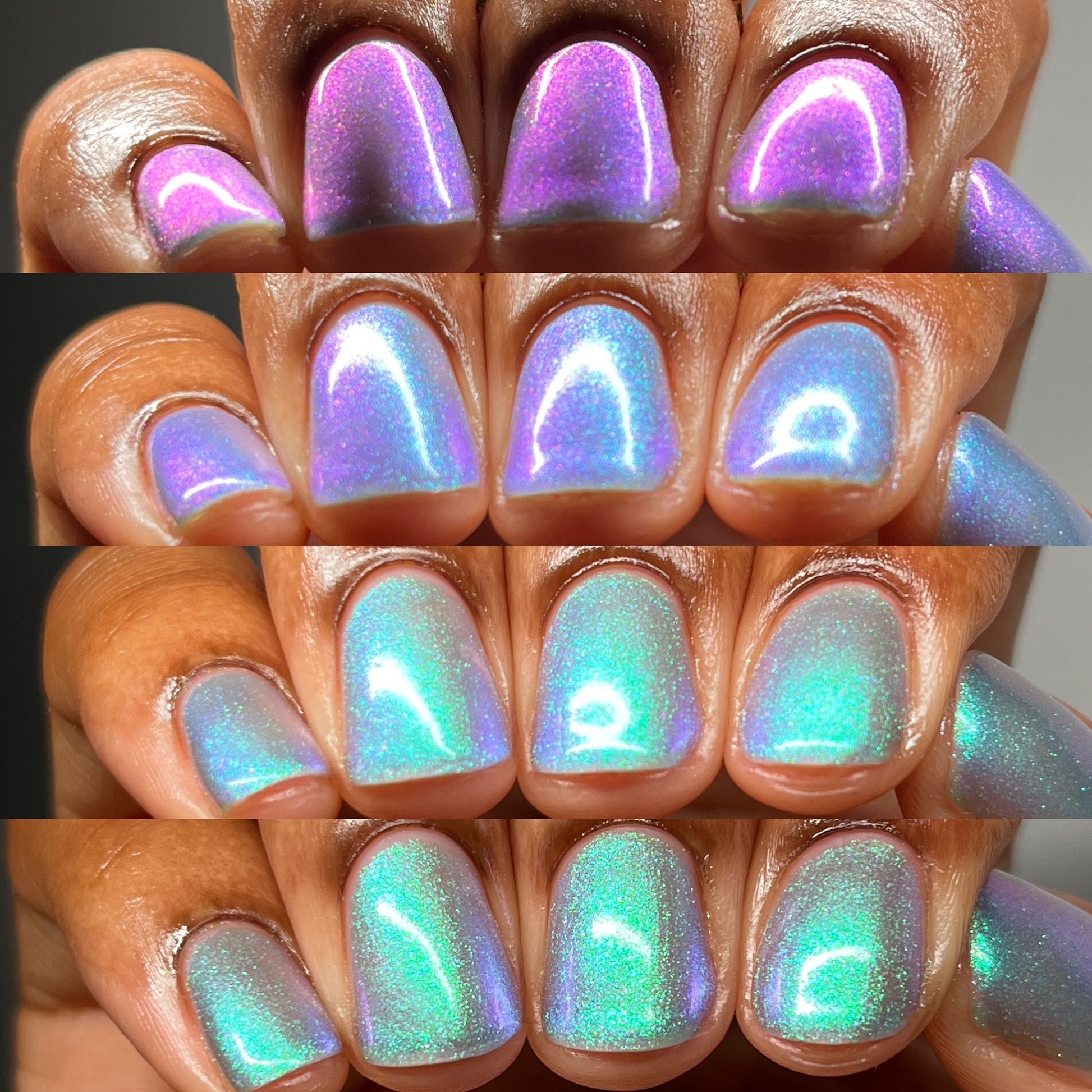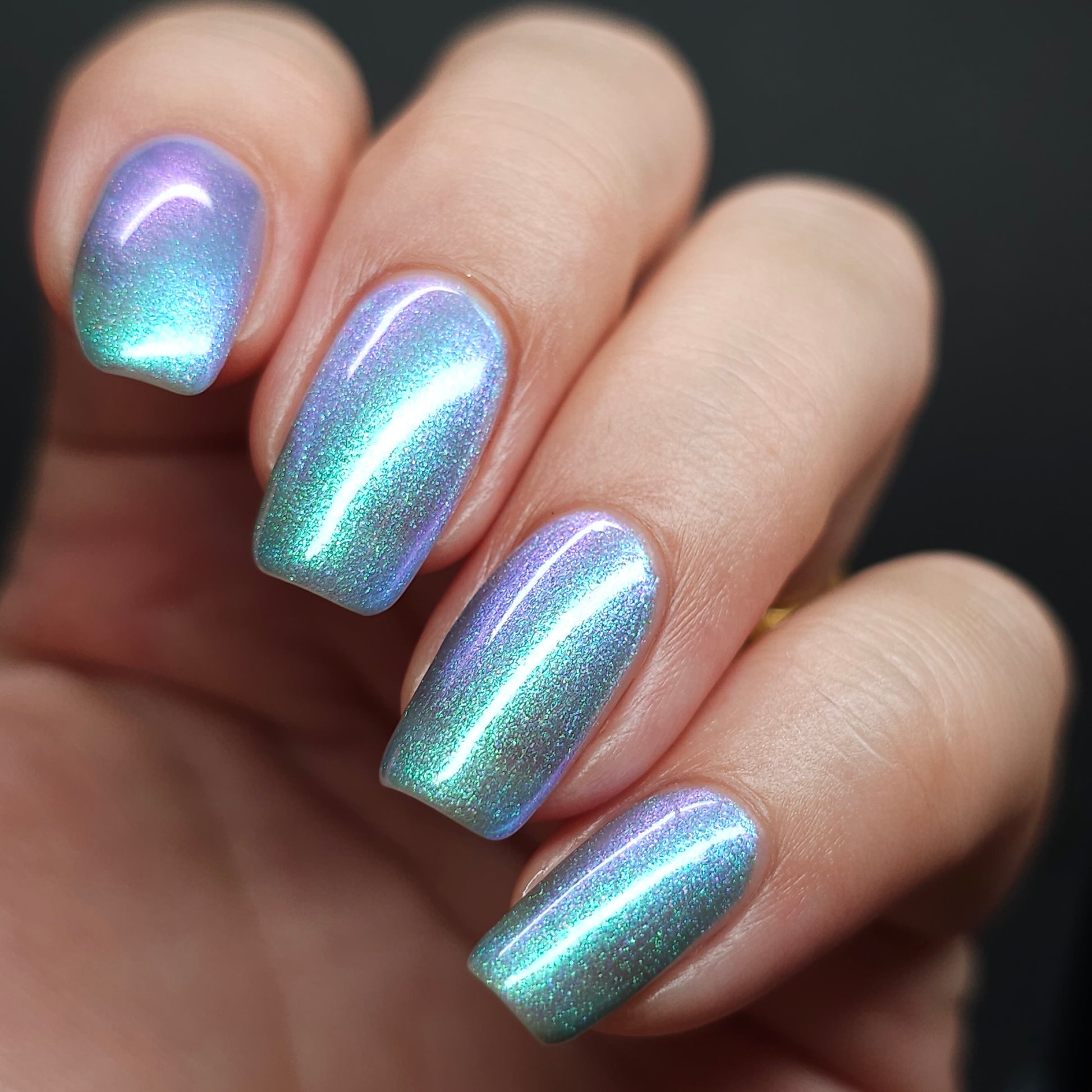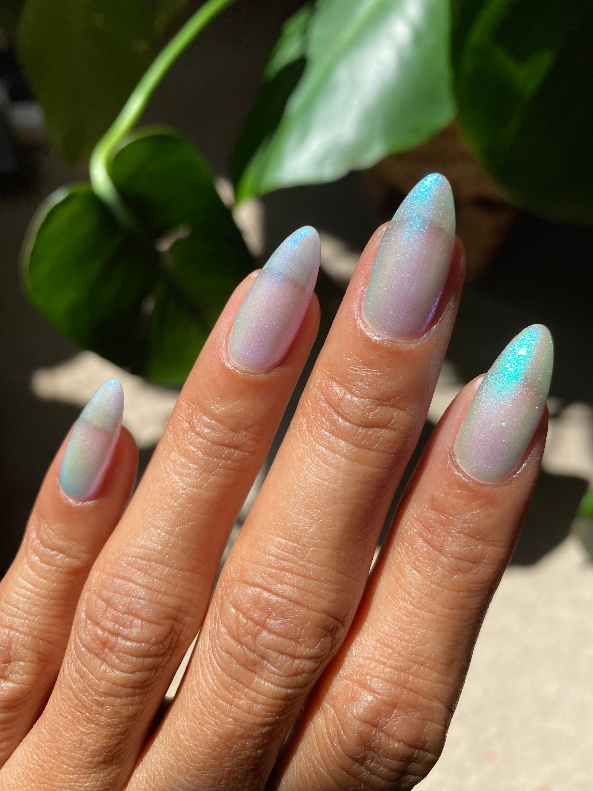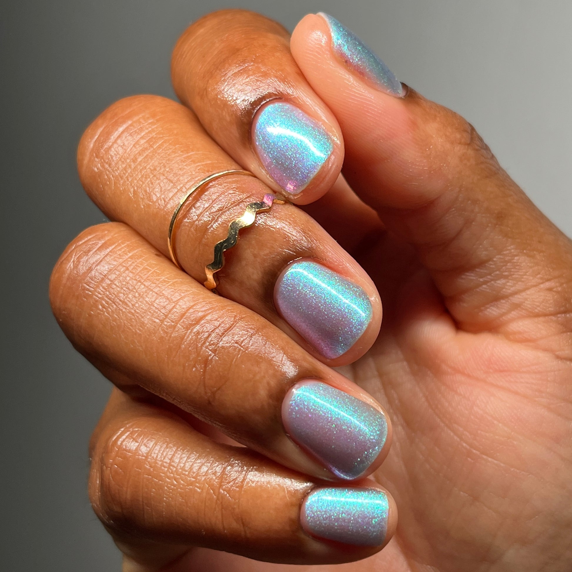 A semi-sheer indigo jelly base with aurora shimmer that shifts green to purple