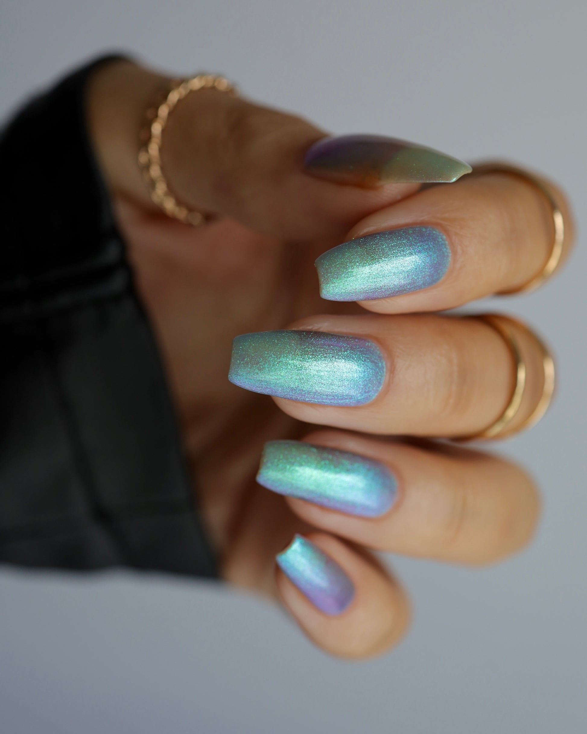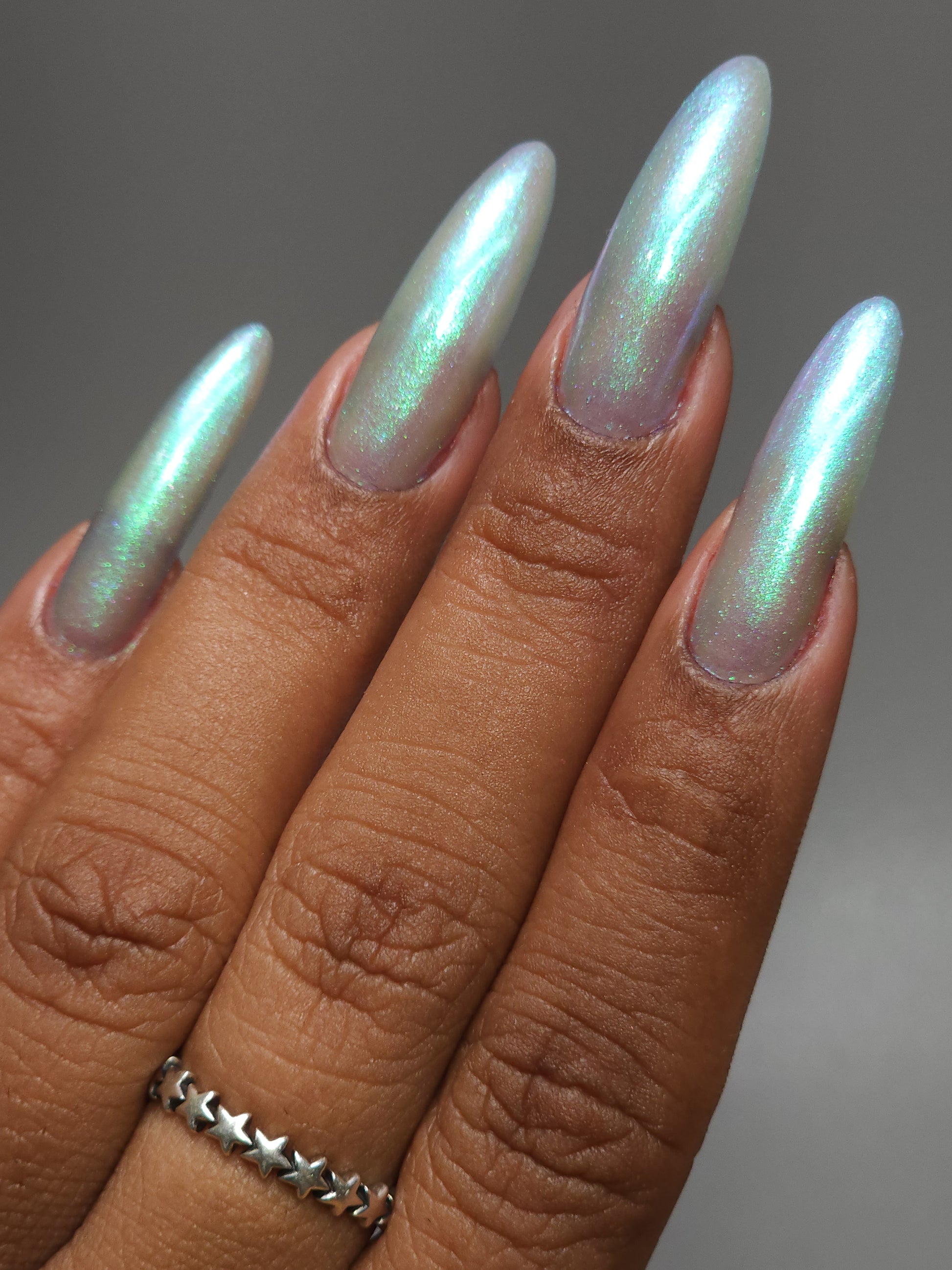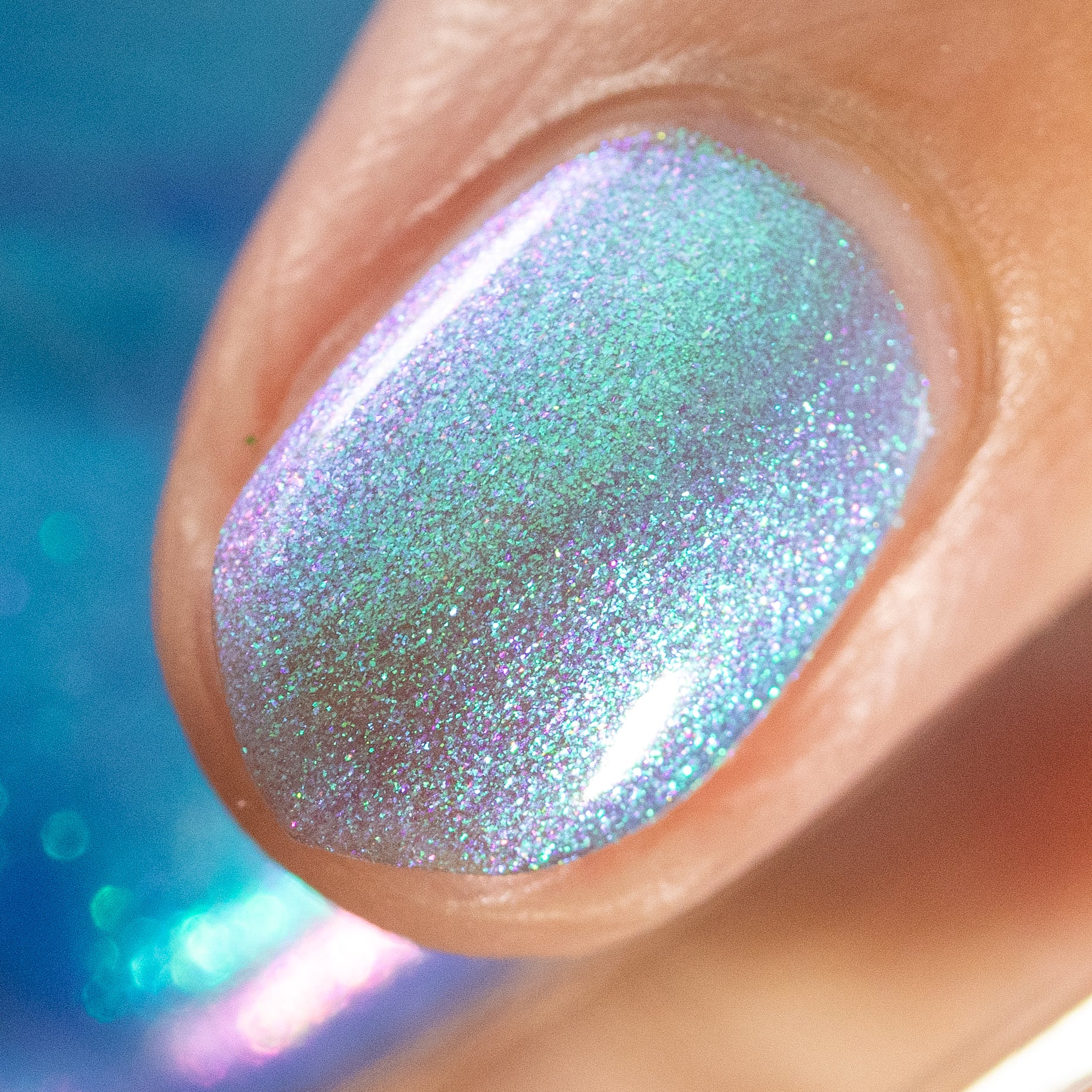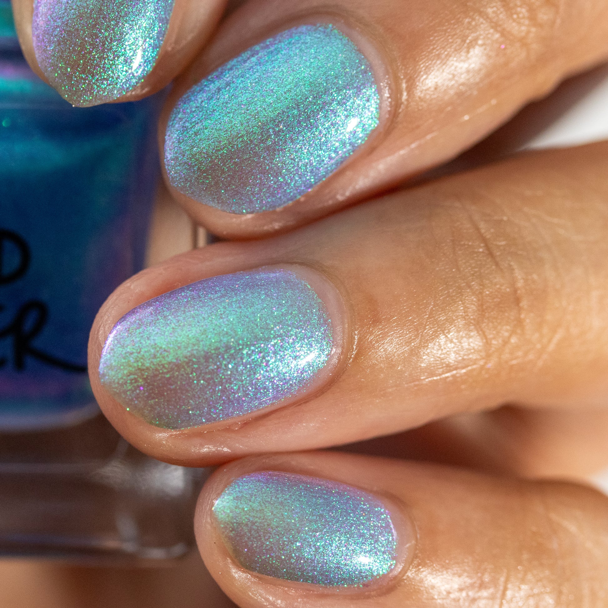 A semi-sheer indigo jelly base with aurora shimmer that shifts green to purple