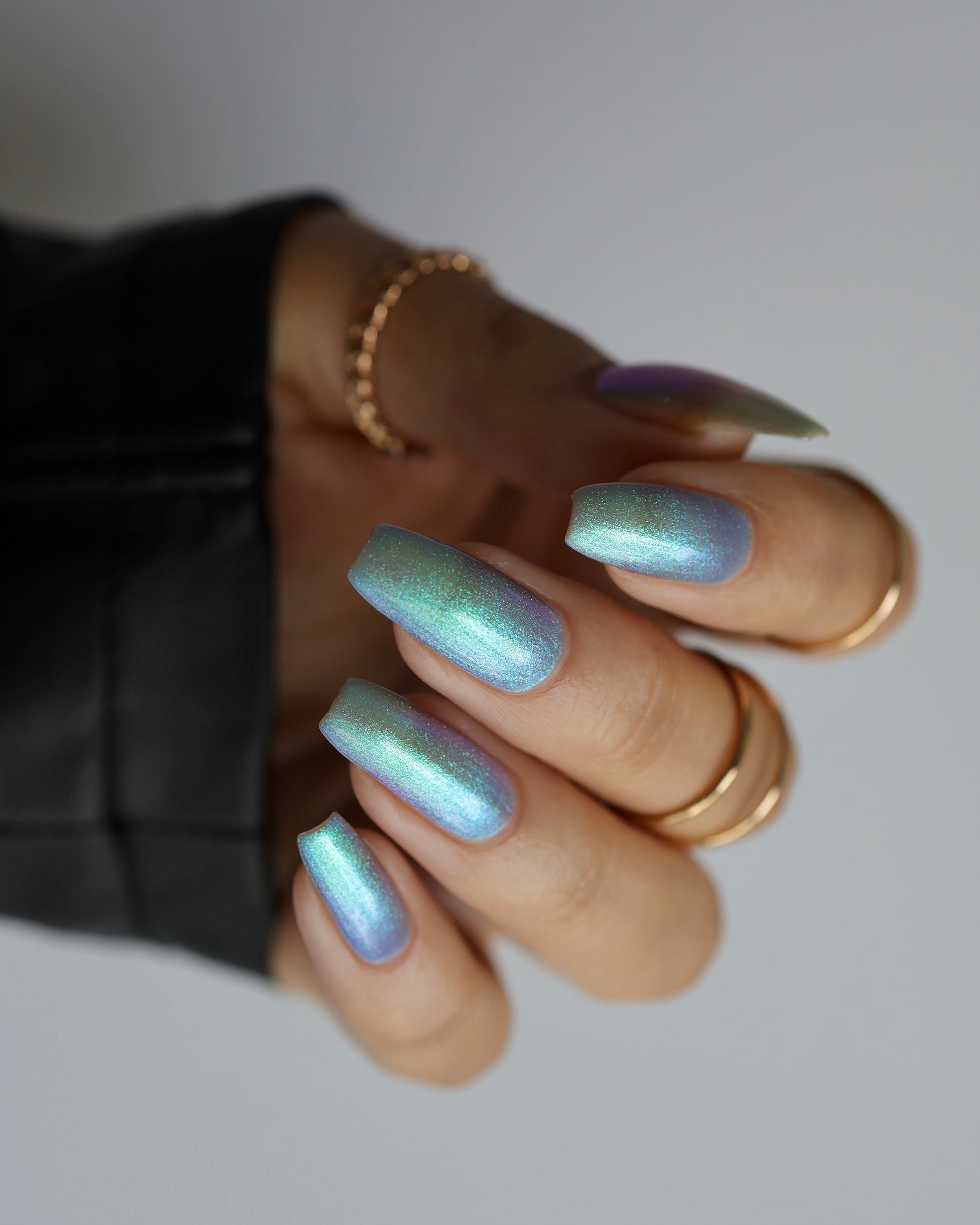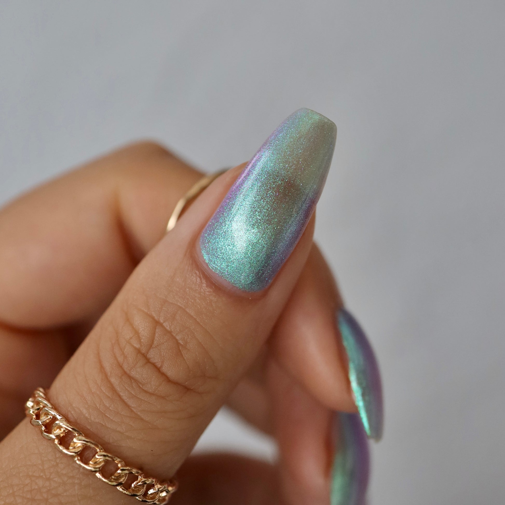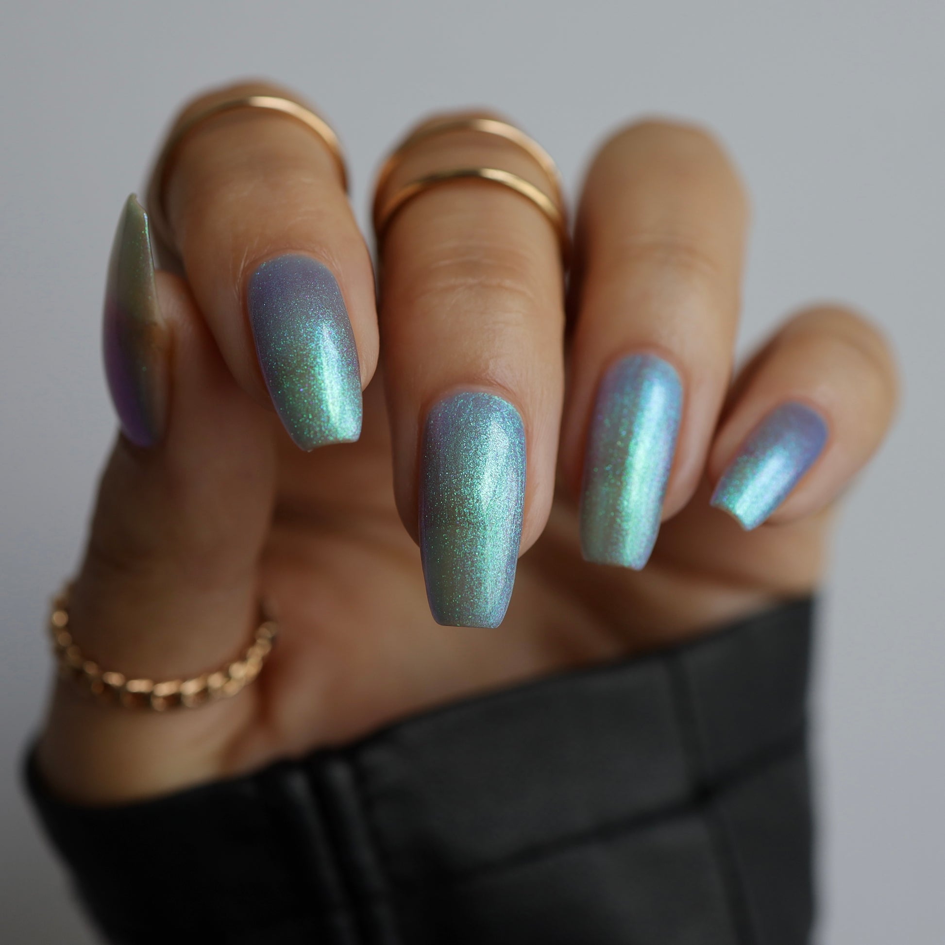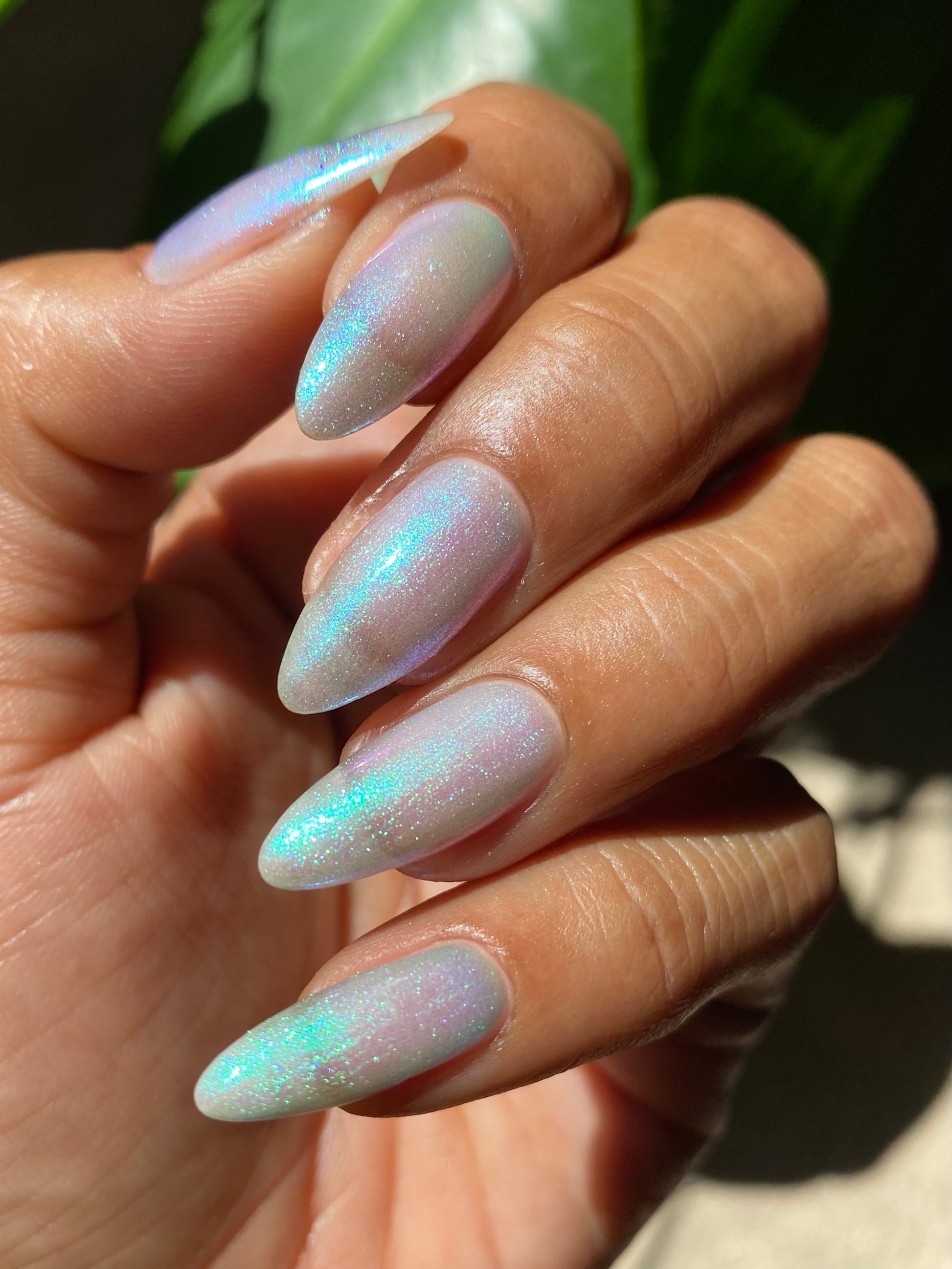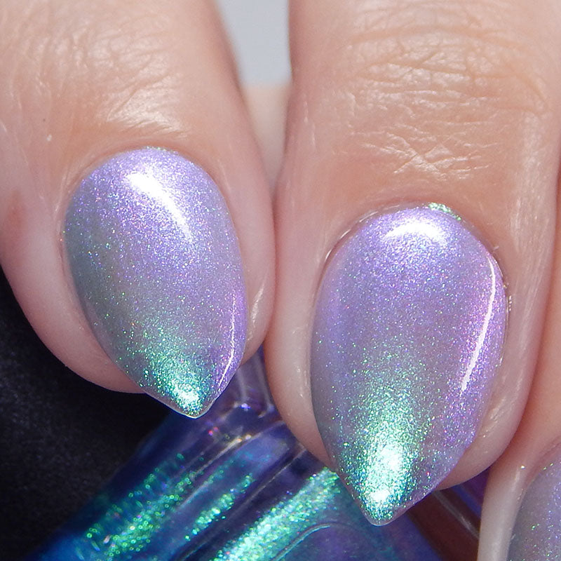 A semi-sheer indigo jelly base with aurora shimmer that shifts green to purple