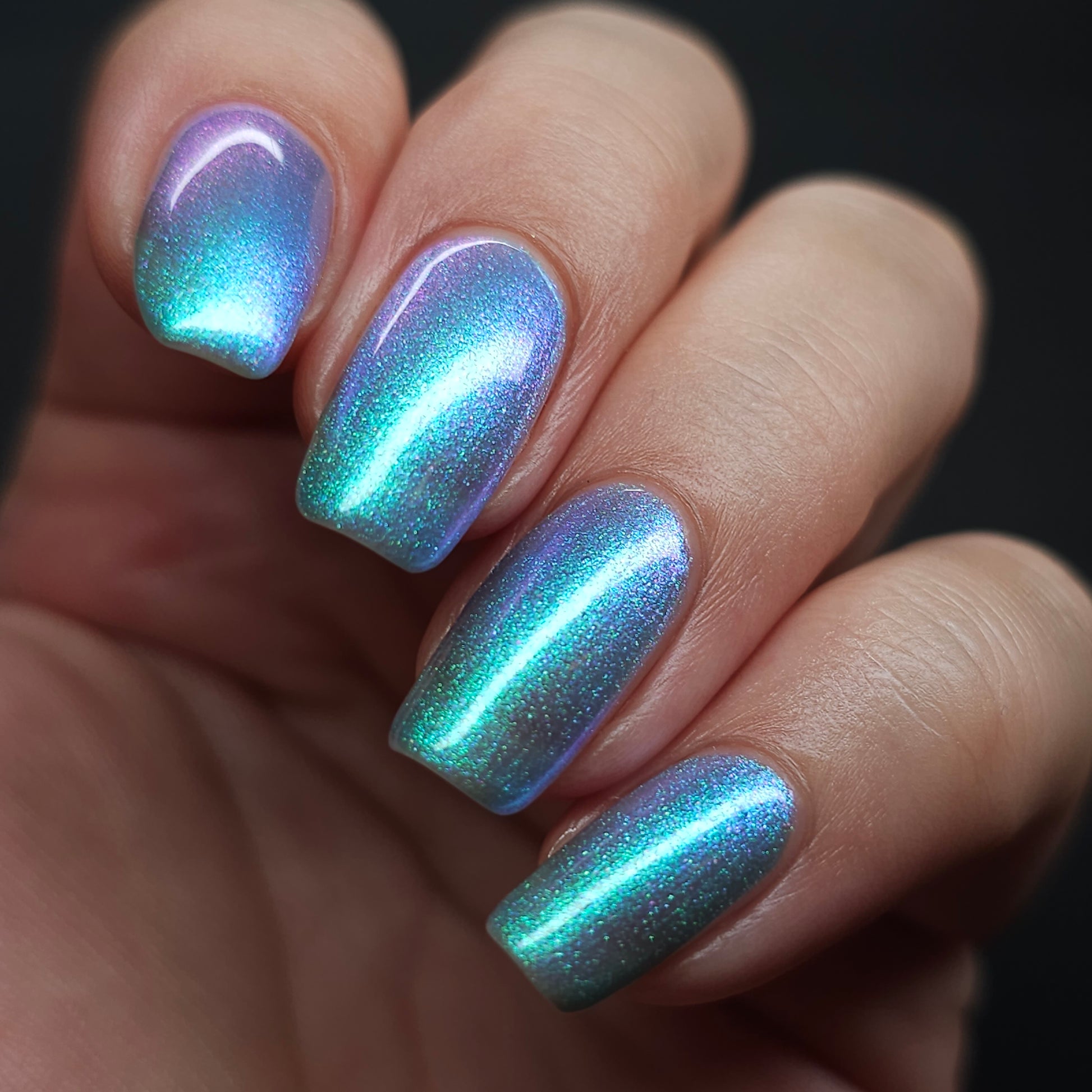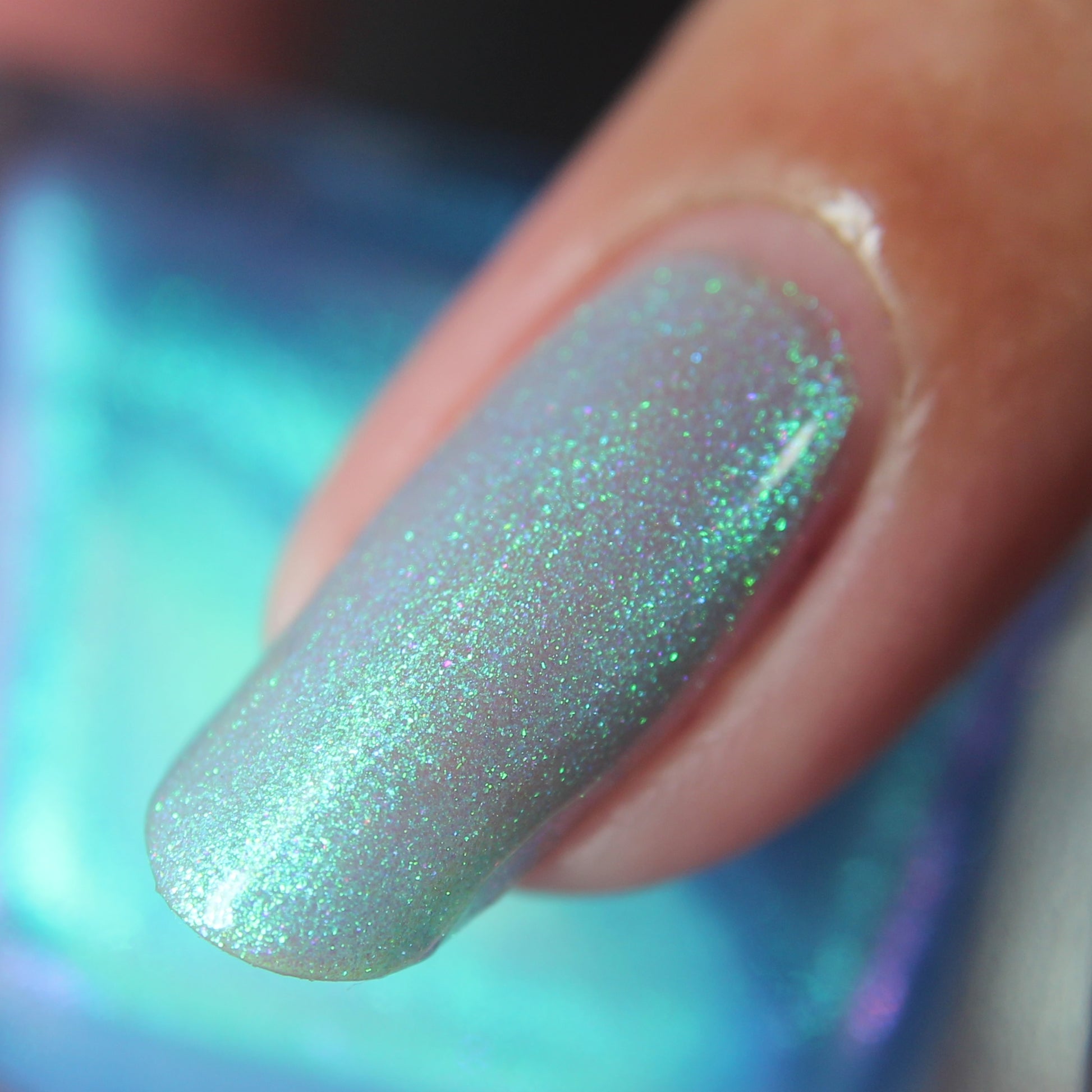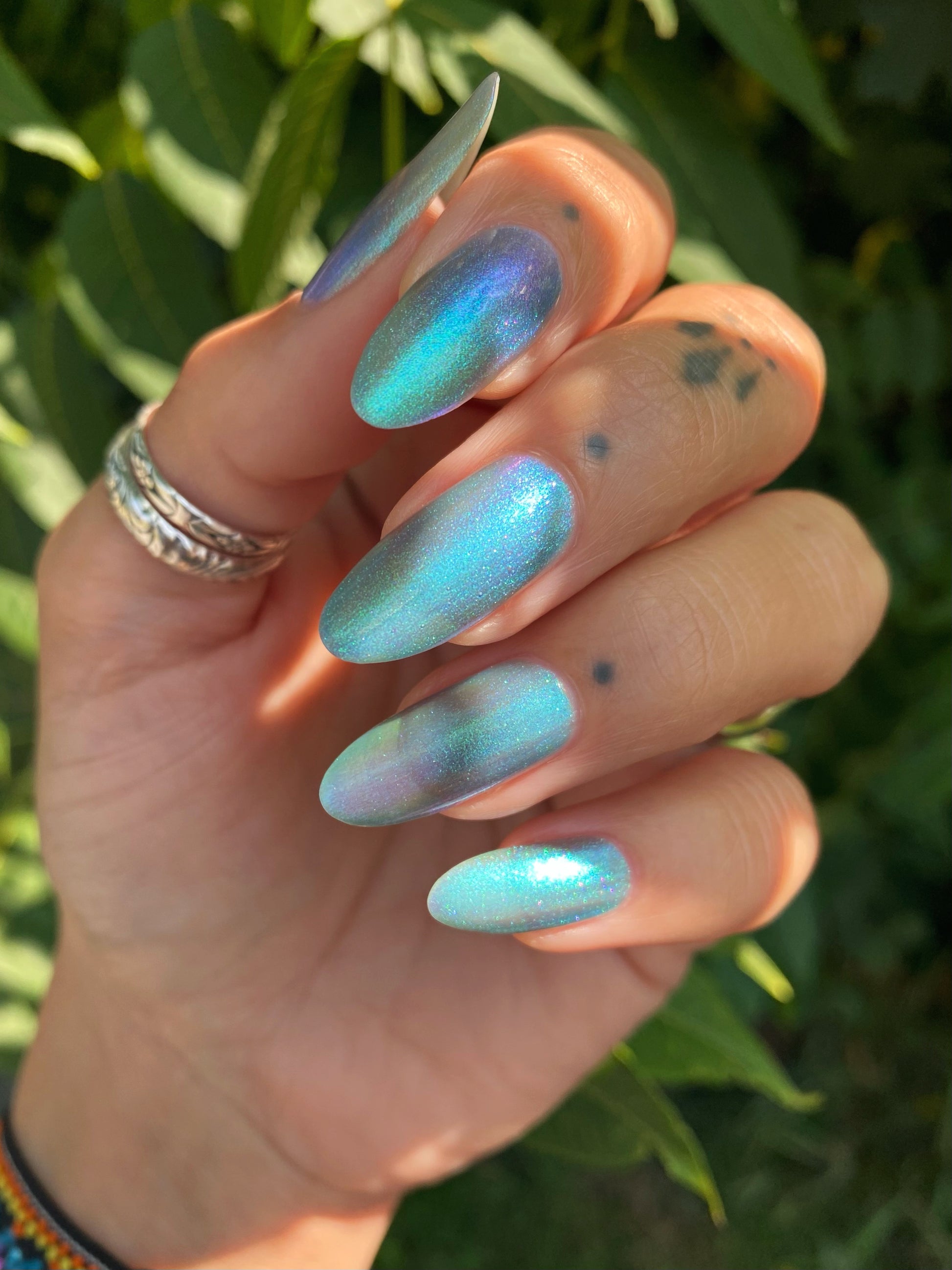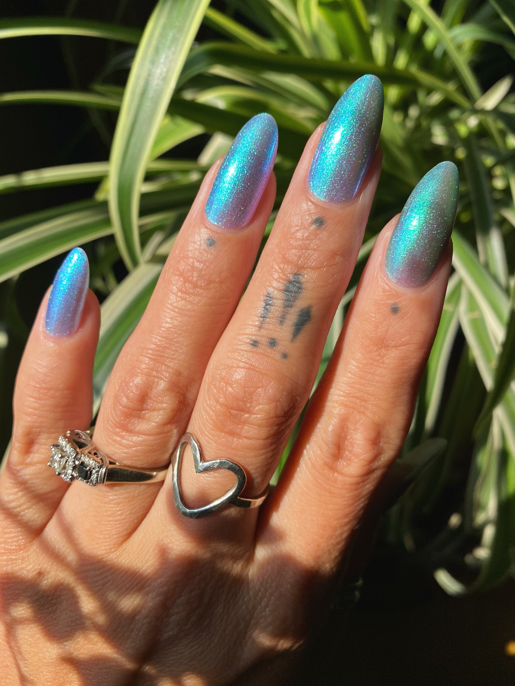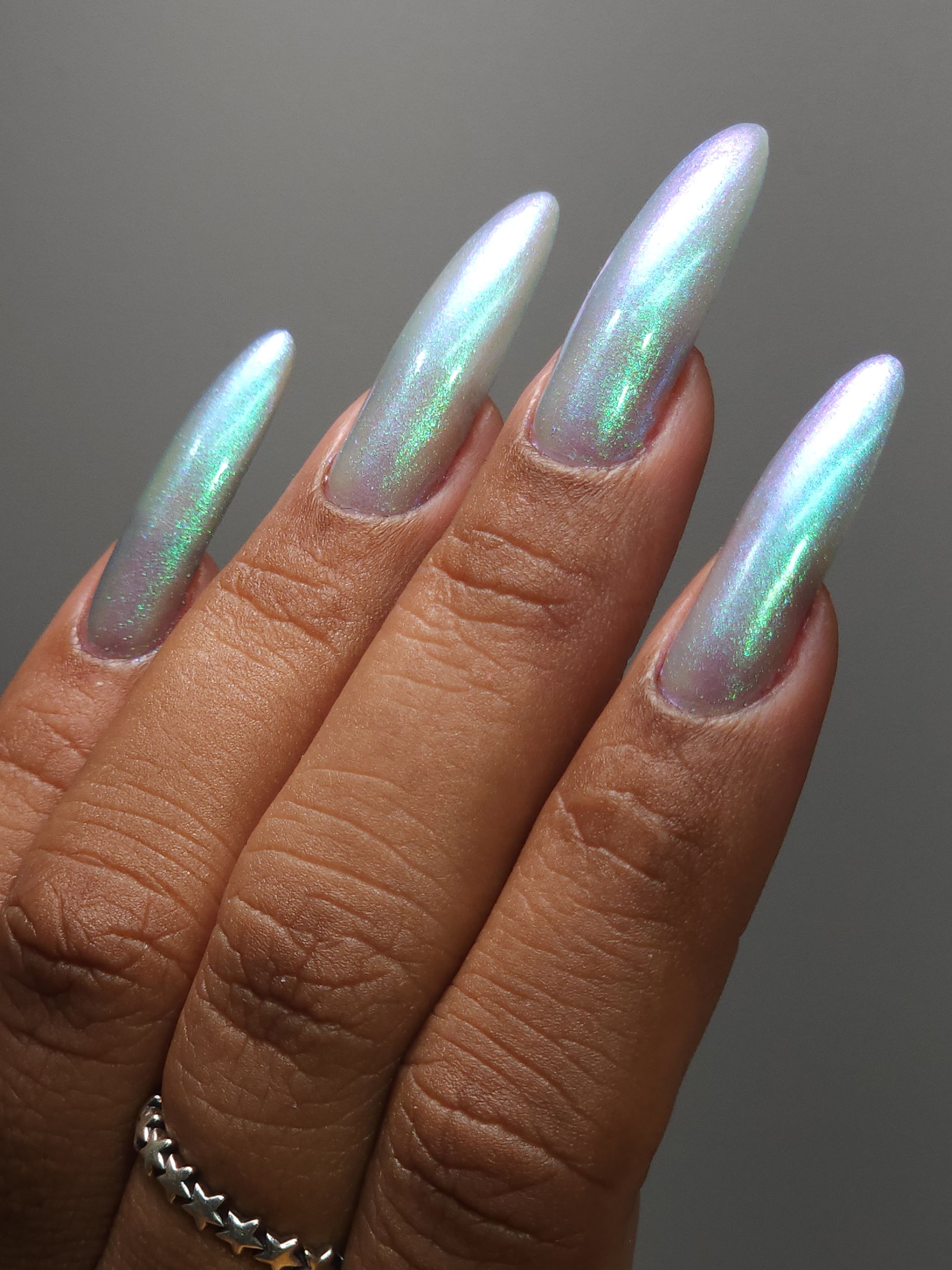 A semi-sheer indigo jelly base with aurora shimmer that shifts green to purple