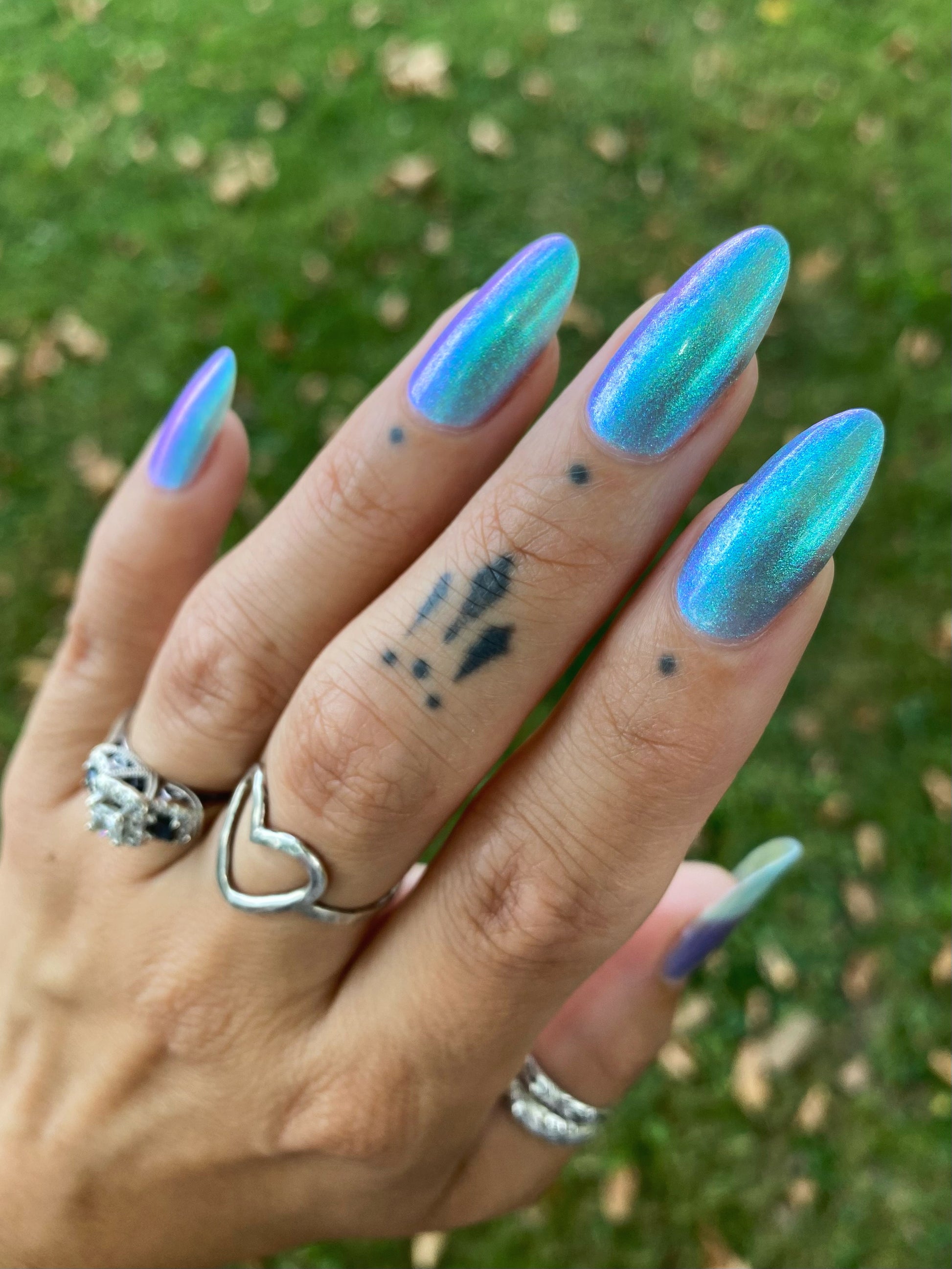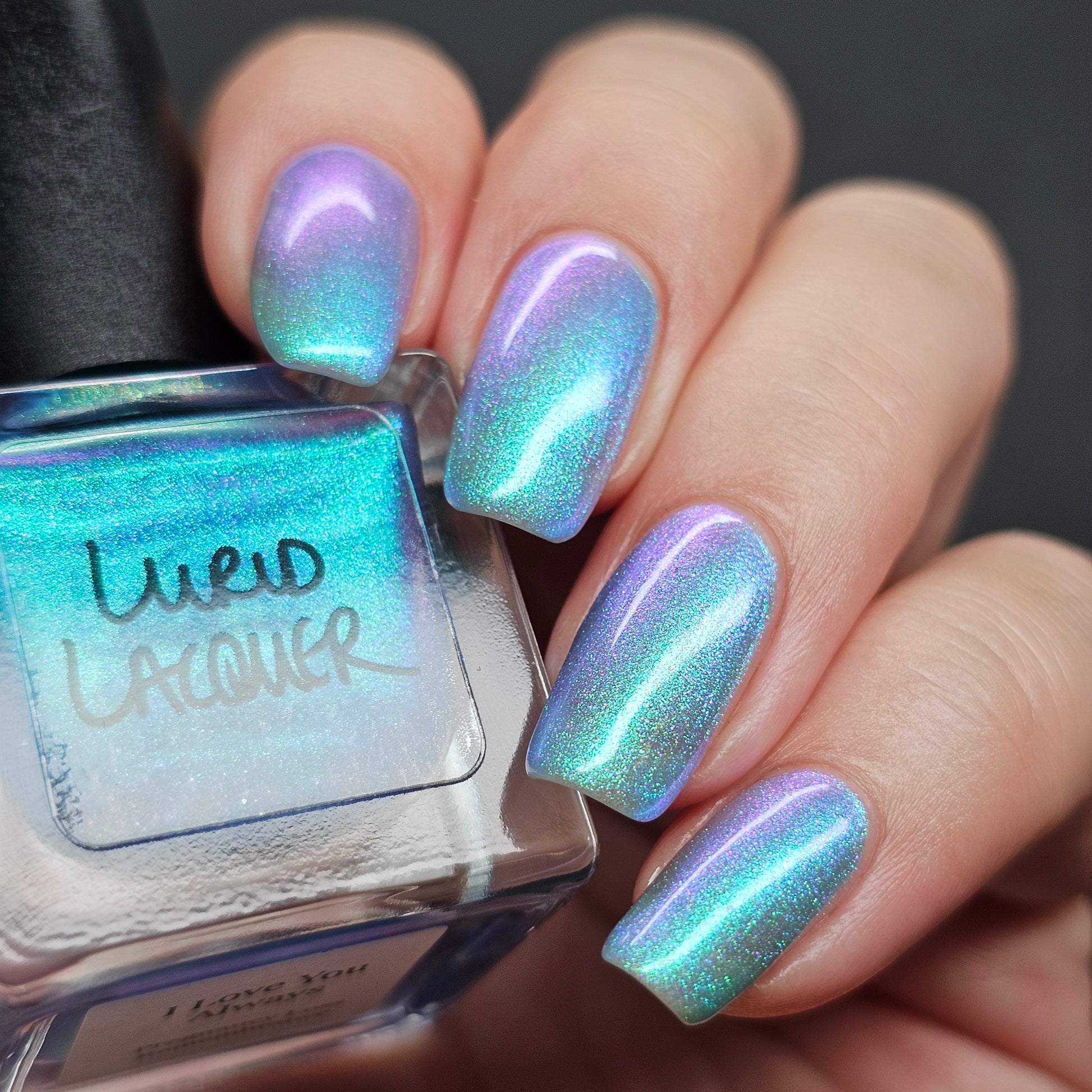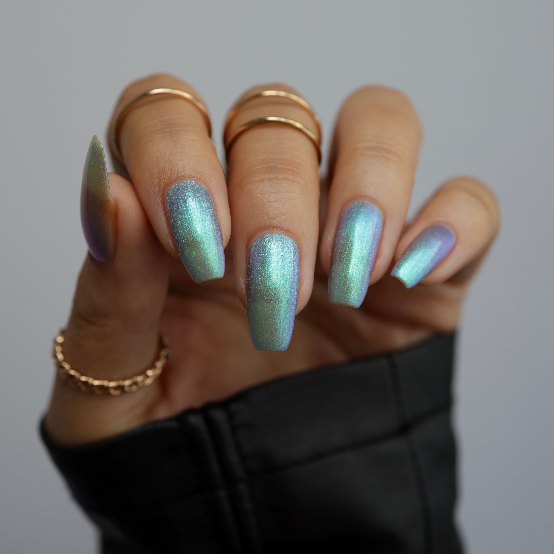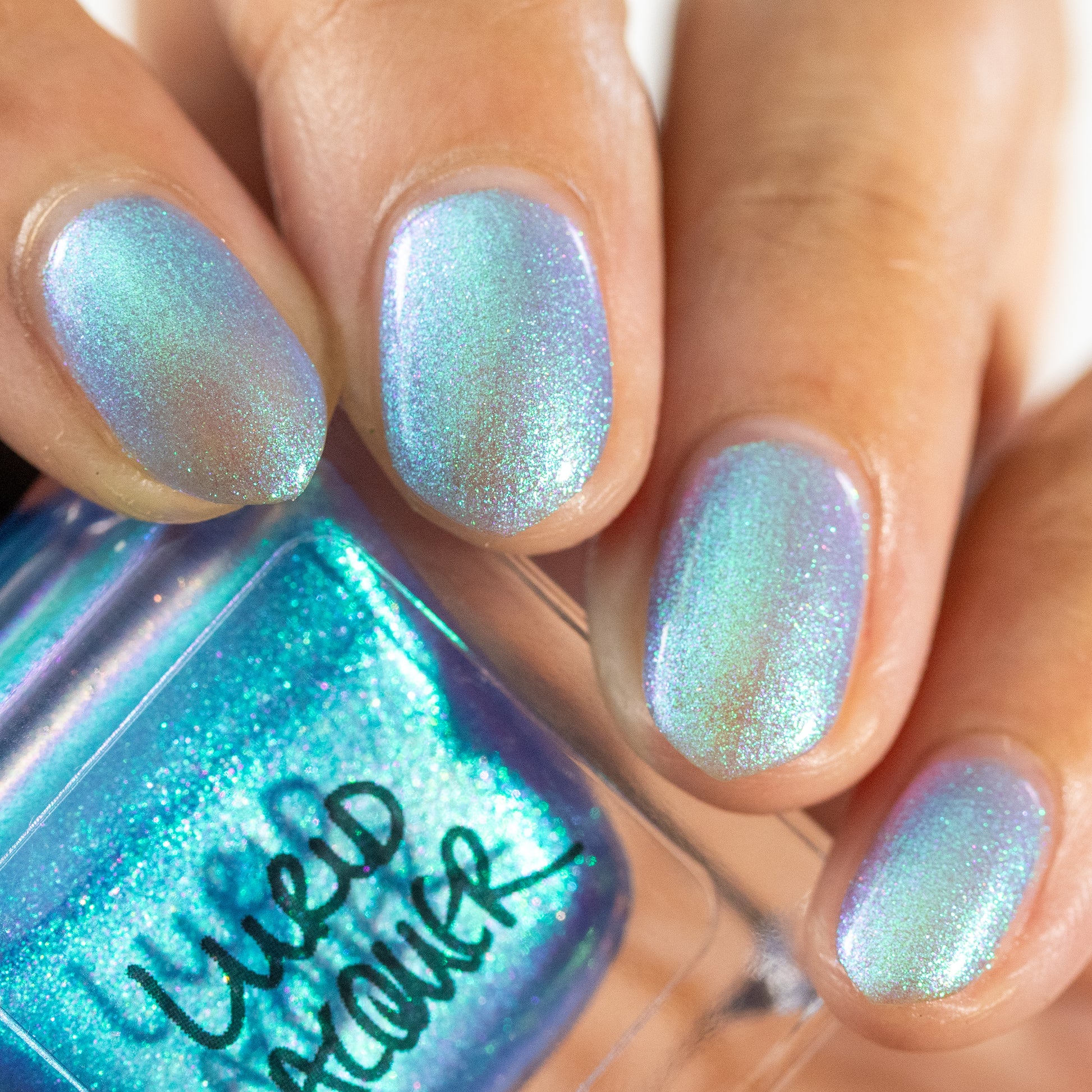 A semi-sheer indigo jelly base with aurora shimmer that shifts green to purple