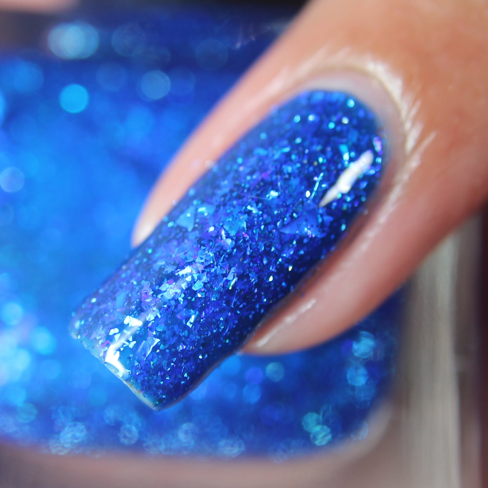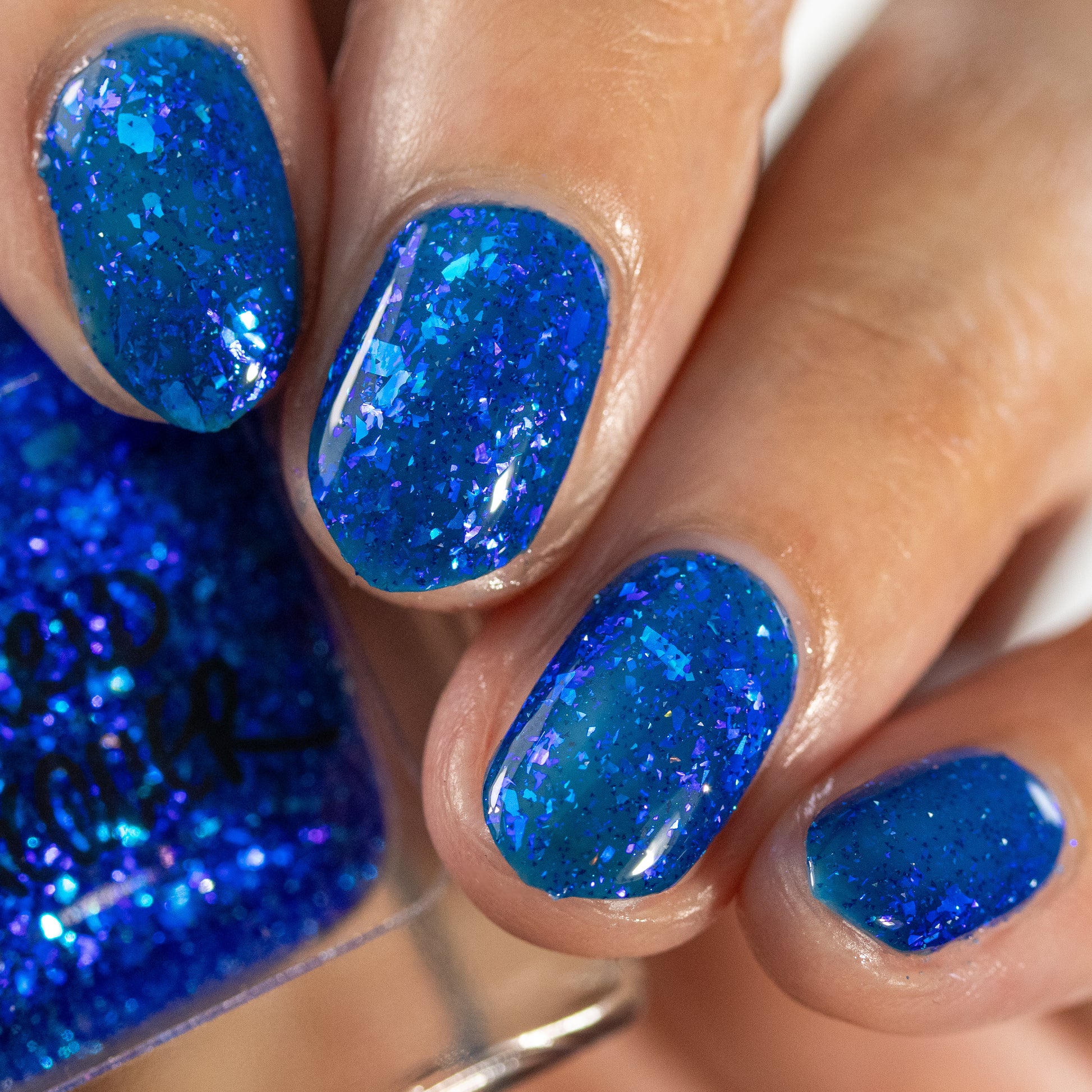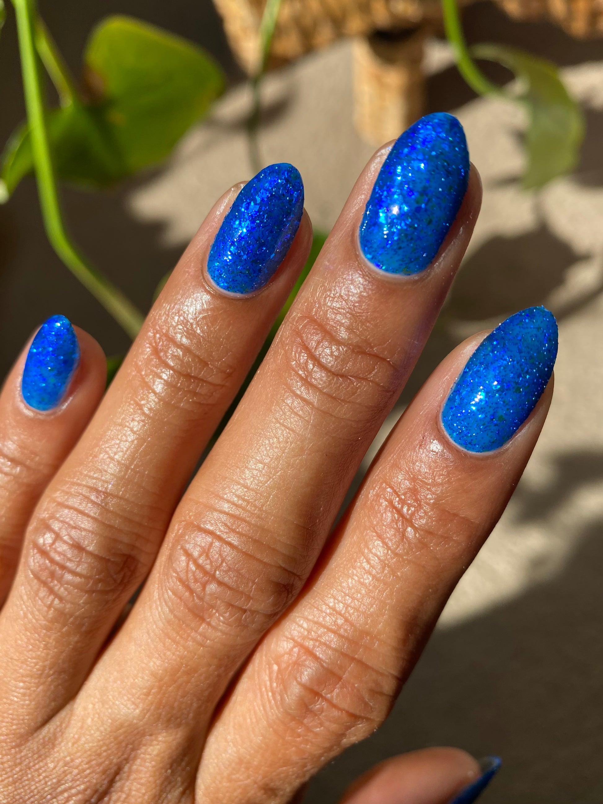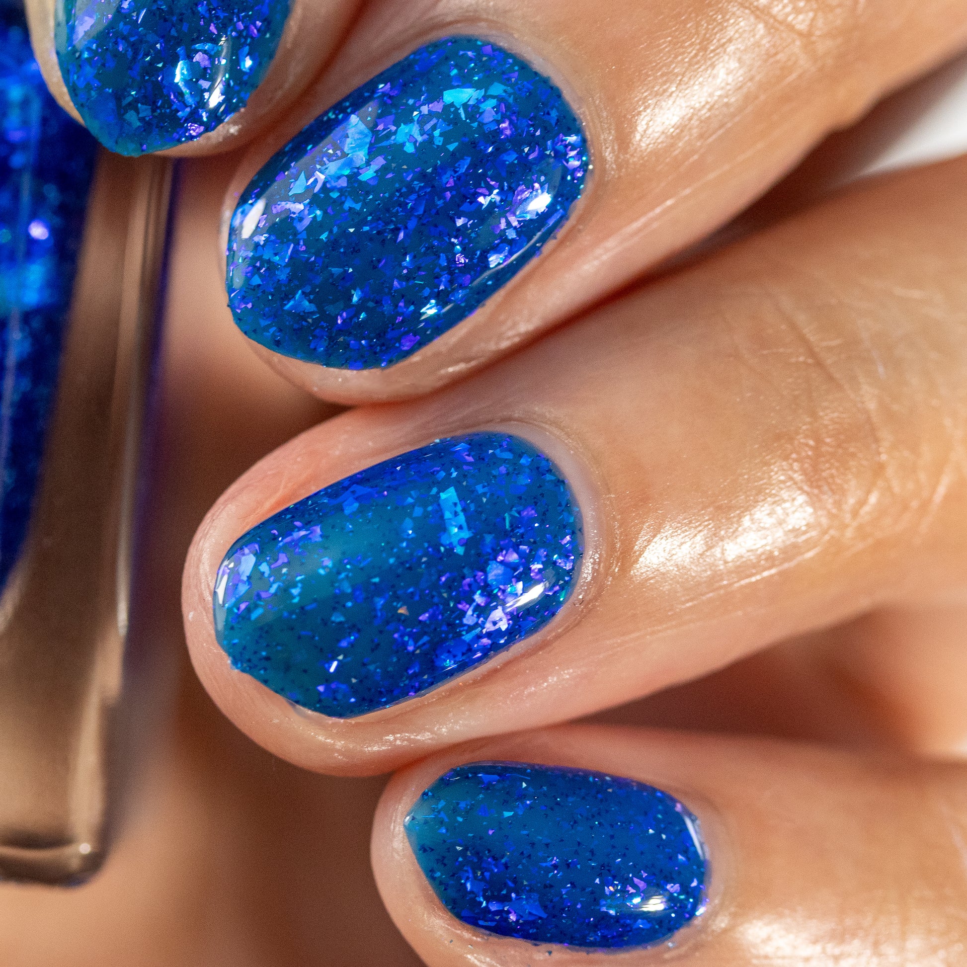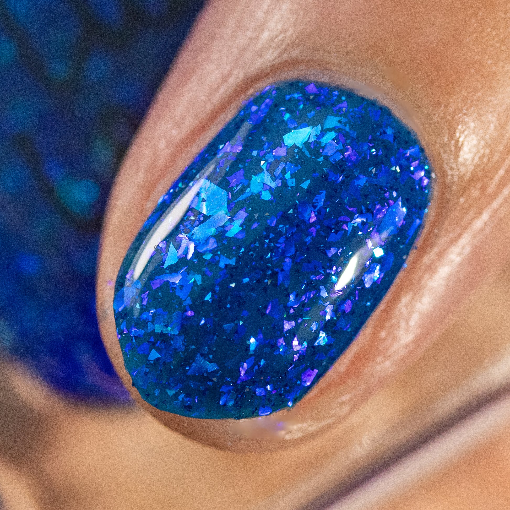 A deep blue jelly base with iridescent flakes that shift from blue to green and blue to purple, and blue light reflective glitter
