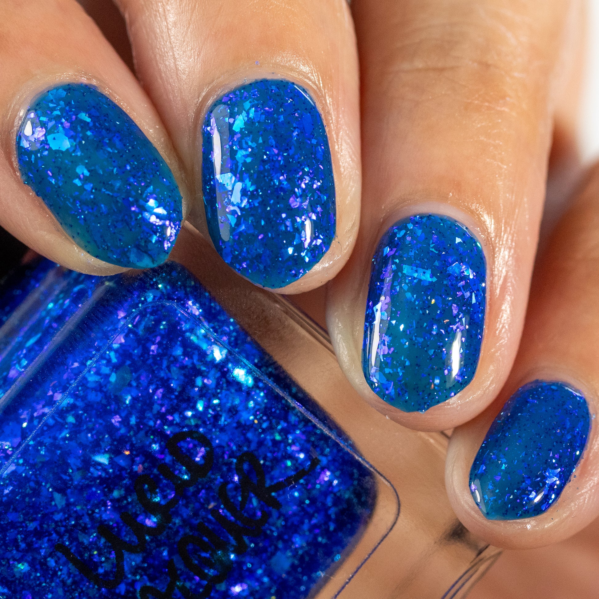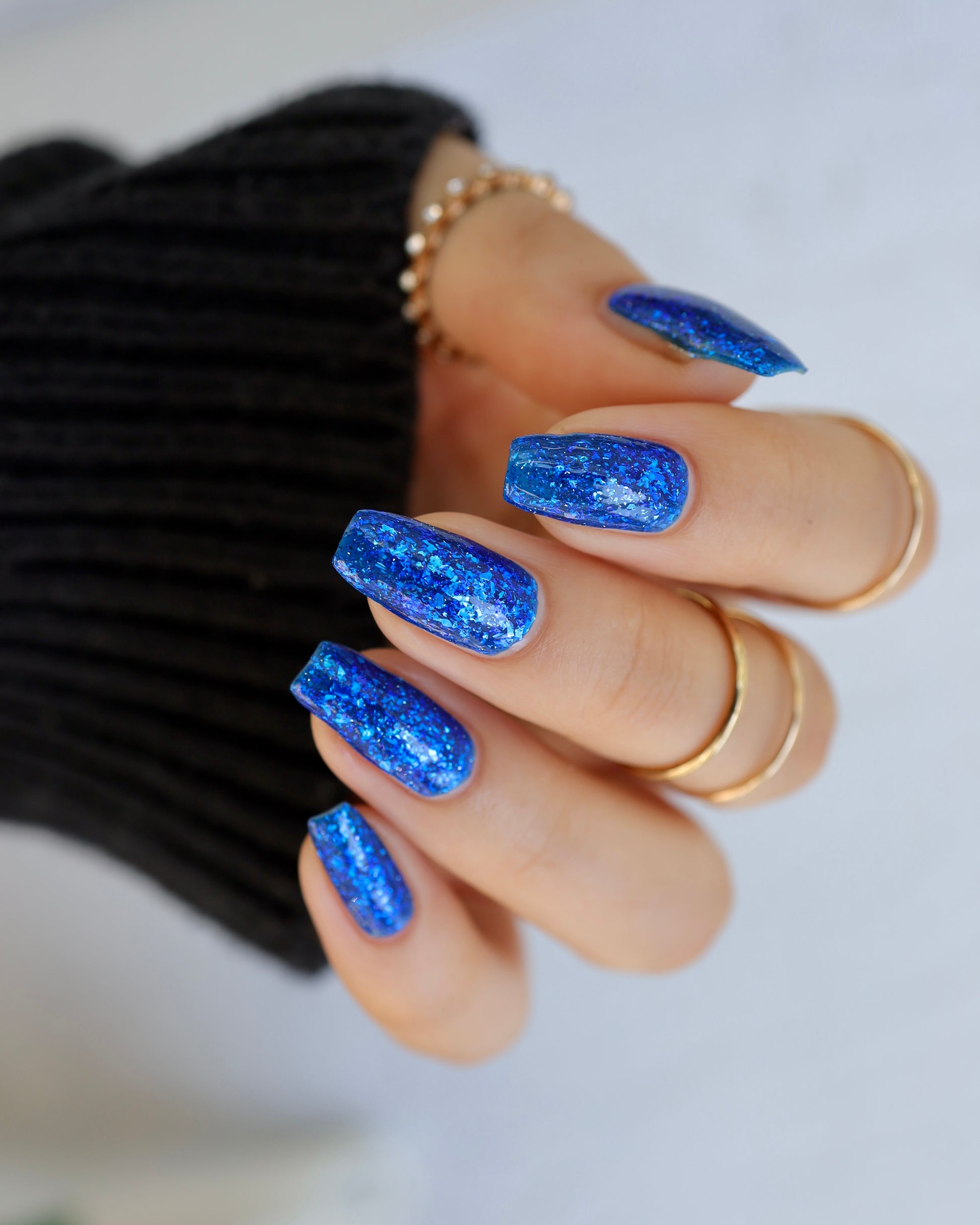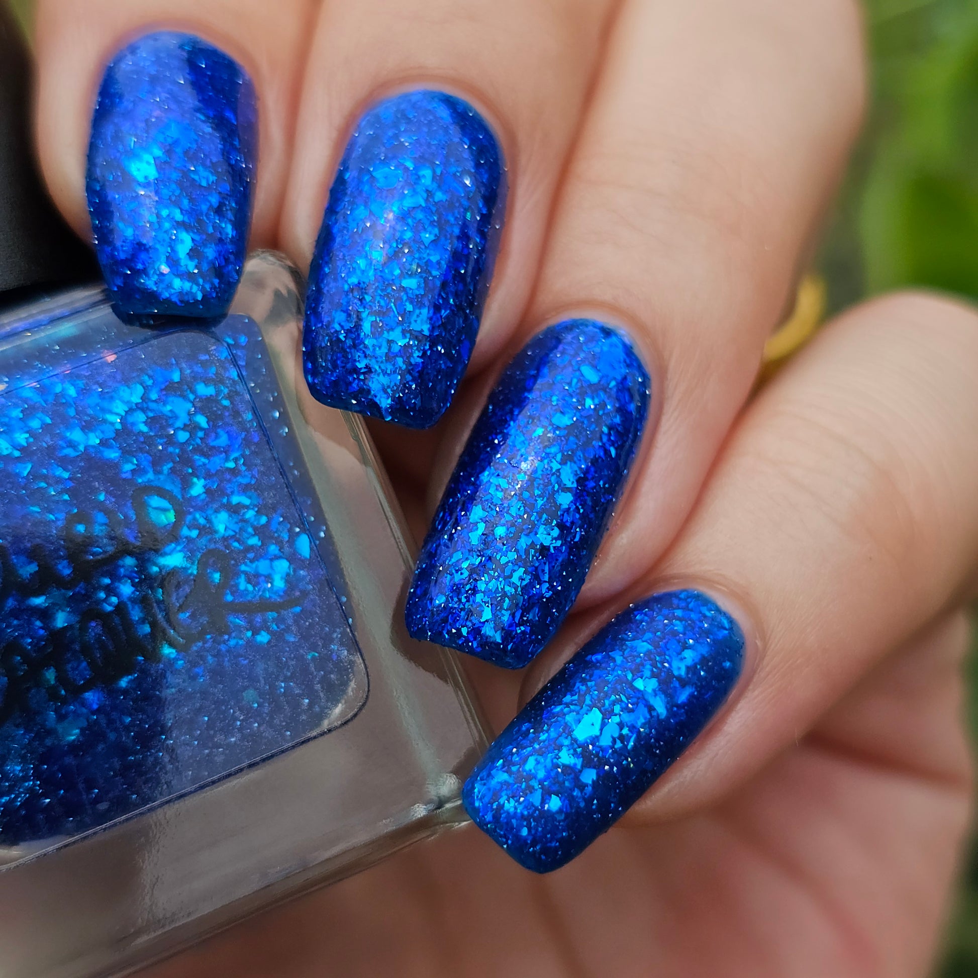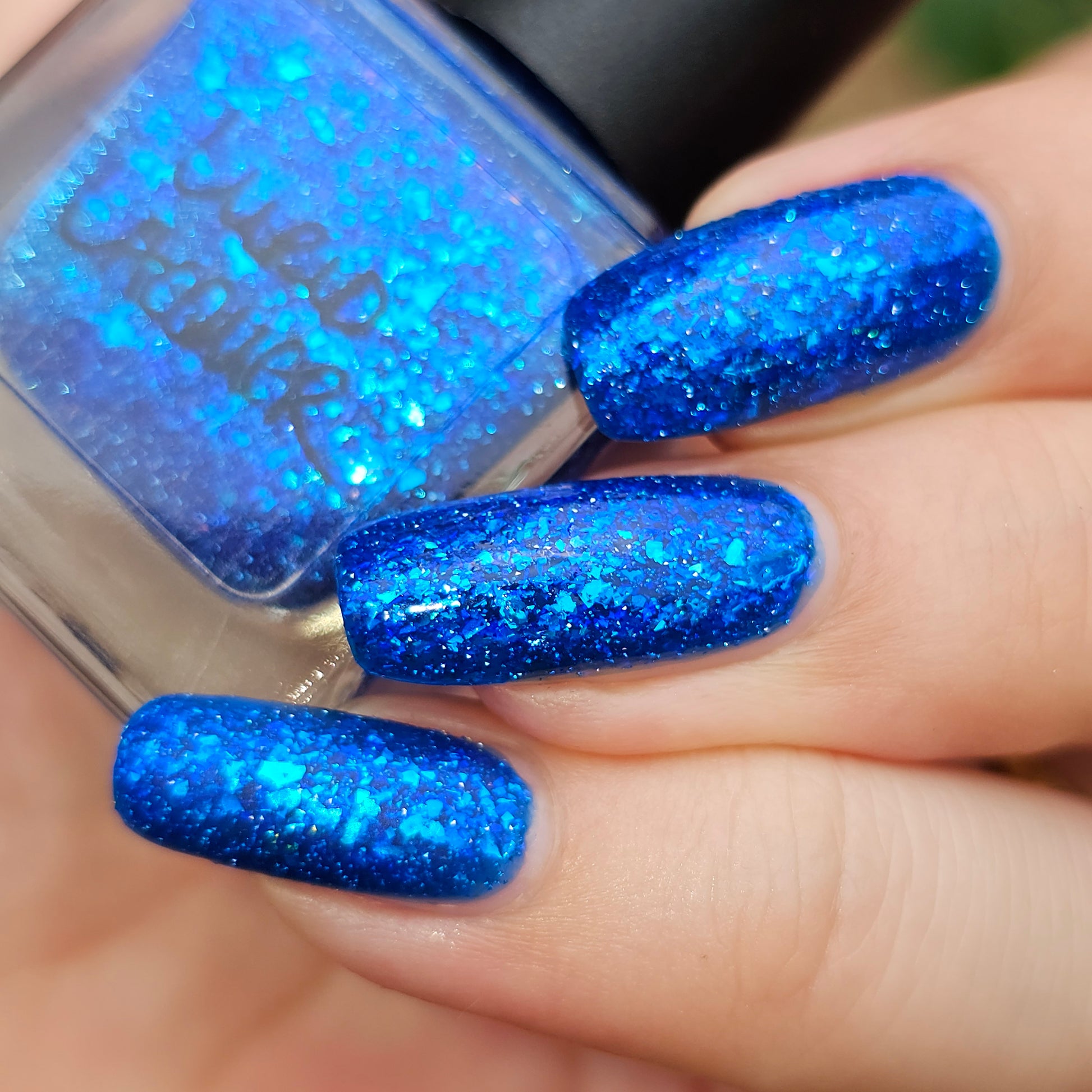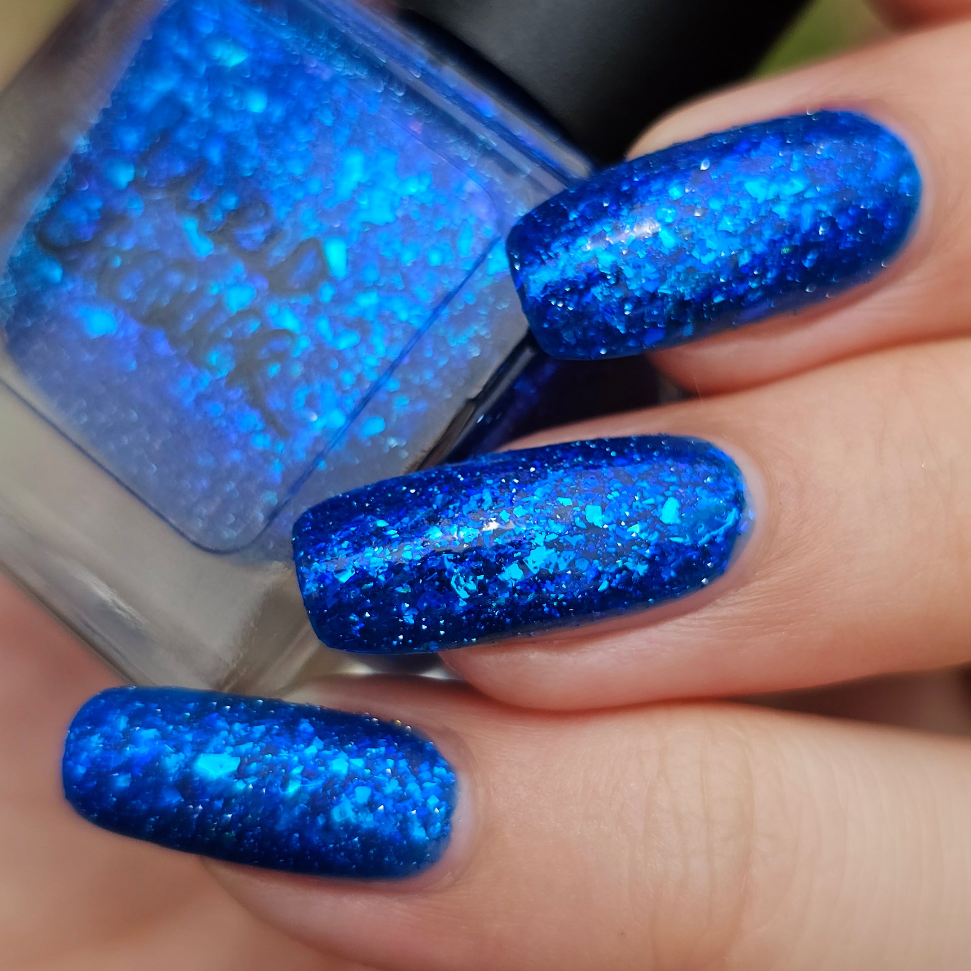 A deep blue jelly base with iridescent flakes that shift from blue to green and blue to purple, and blue light reflective glitter