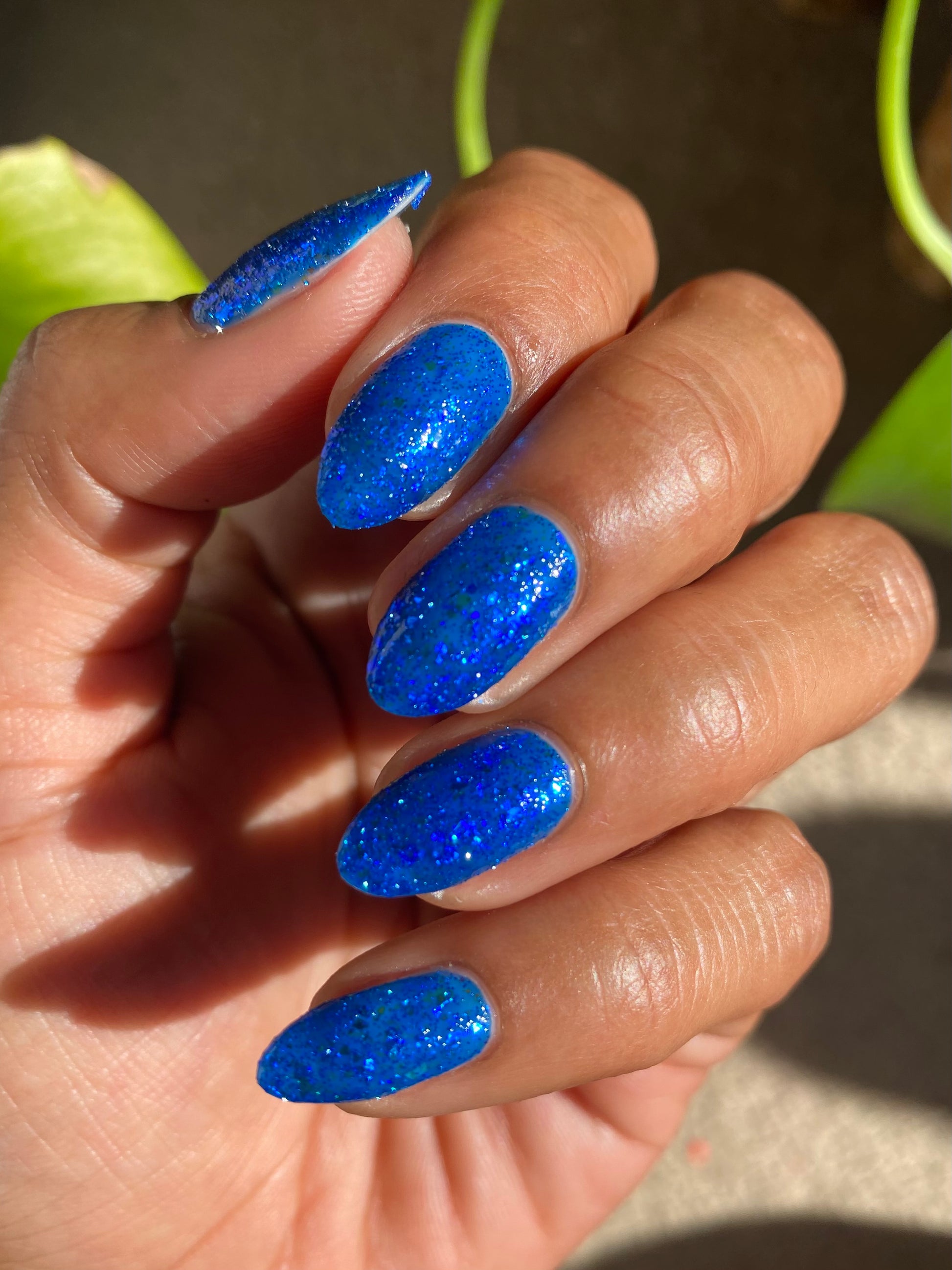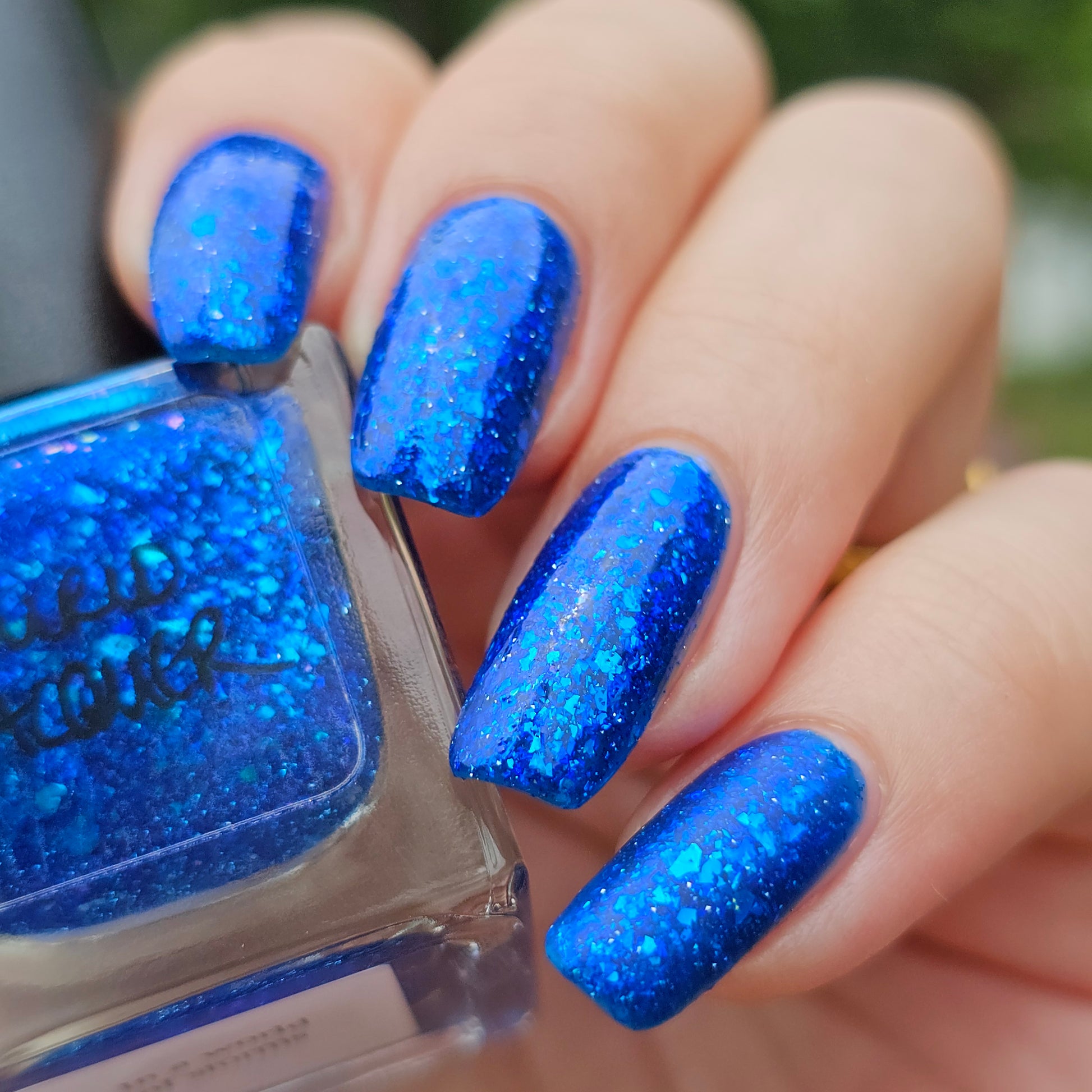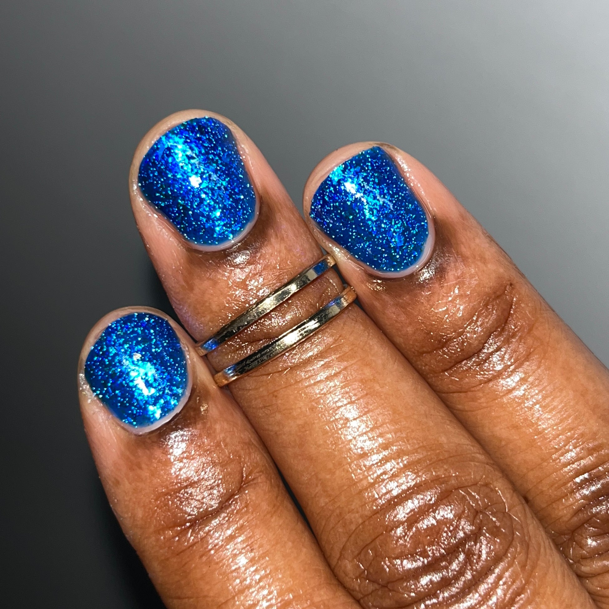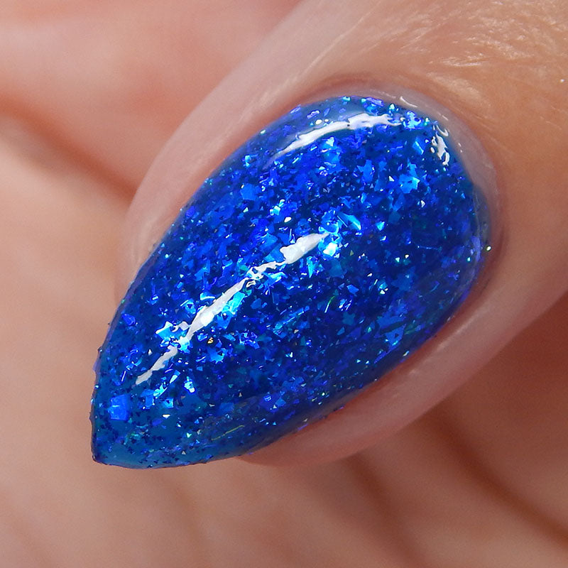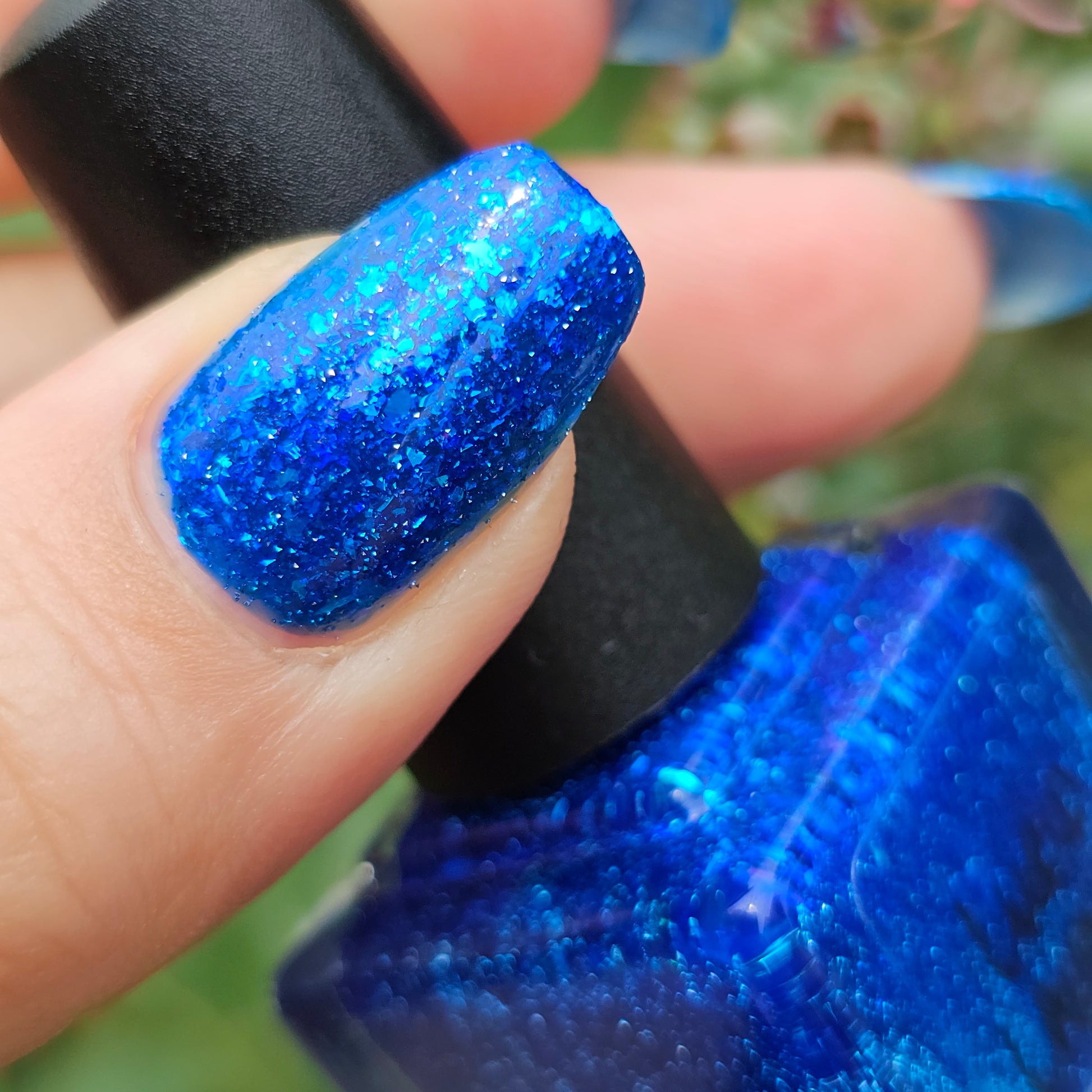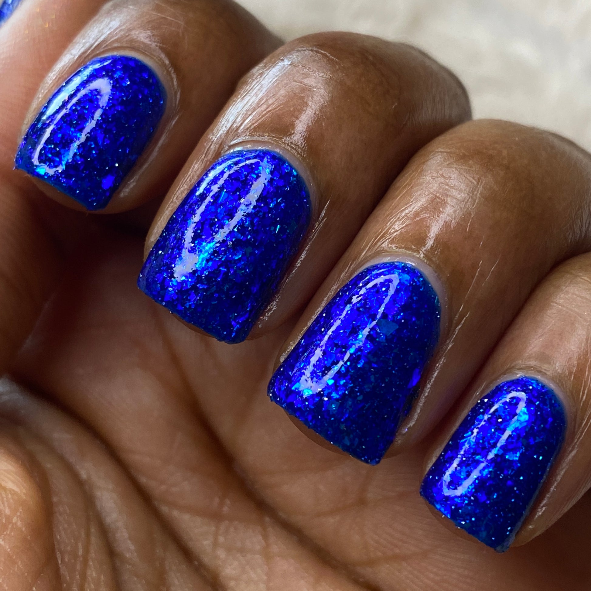 A deep blue jelly base with iridescent flakes that shift from blue to green and blue to purple, and blue light reflective glitter