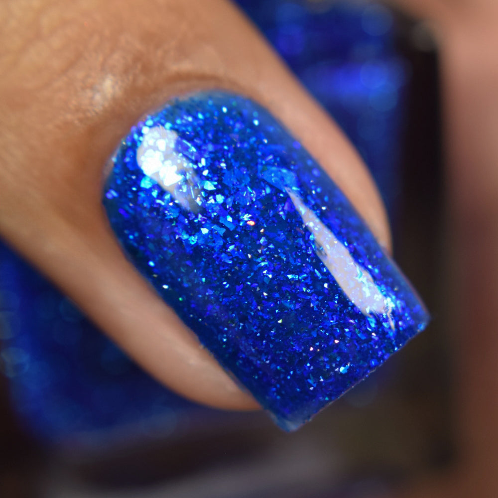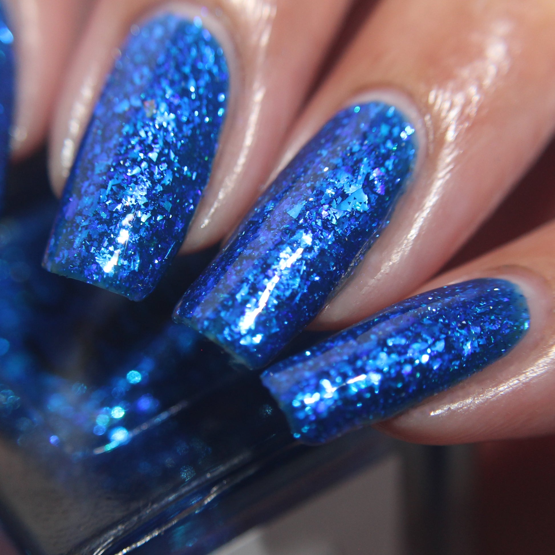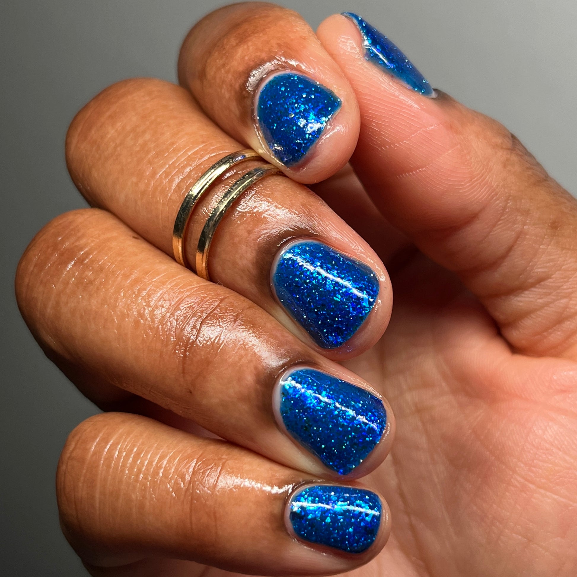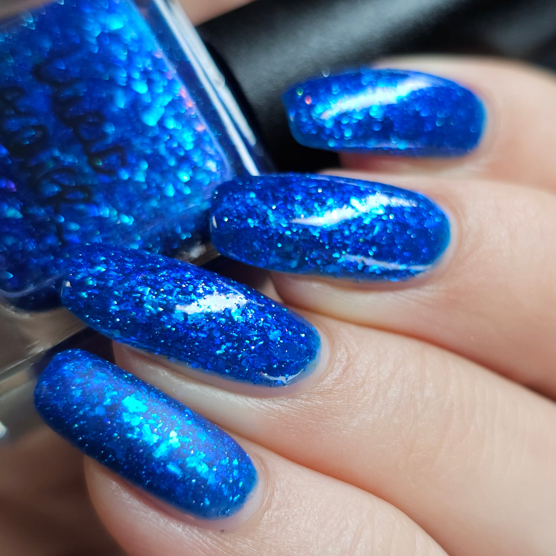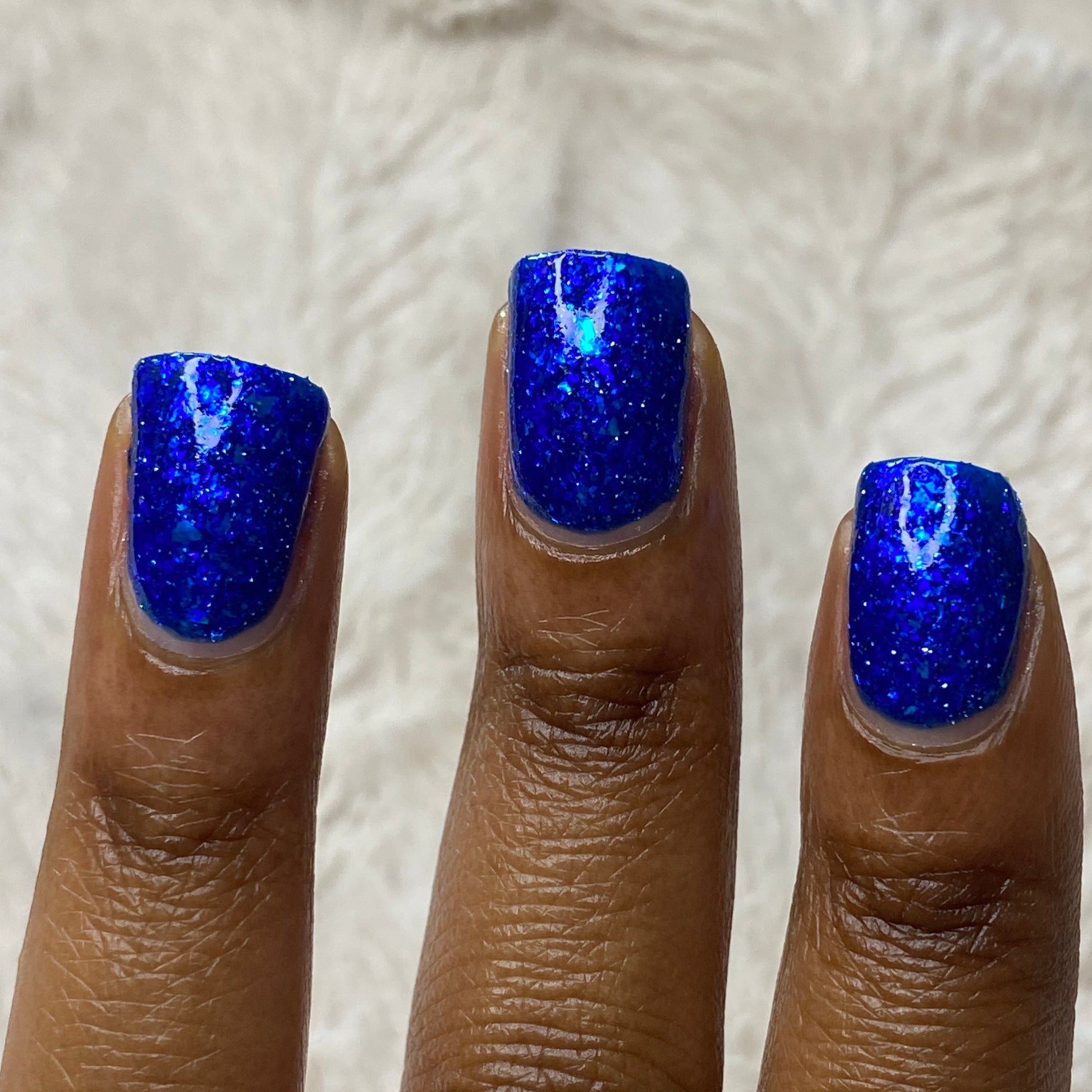 A deep blue jelly base with iridescent flakes that shift from blue to green and blue to purple, and blue light reflective glitter