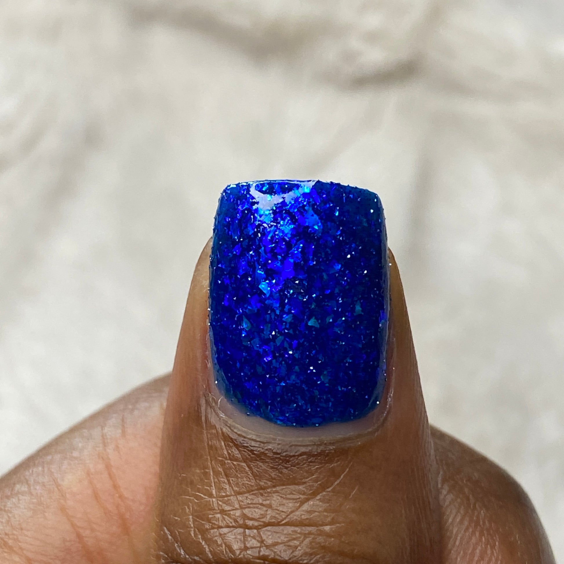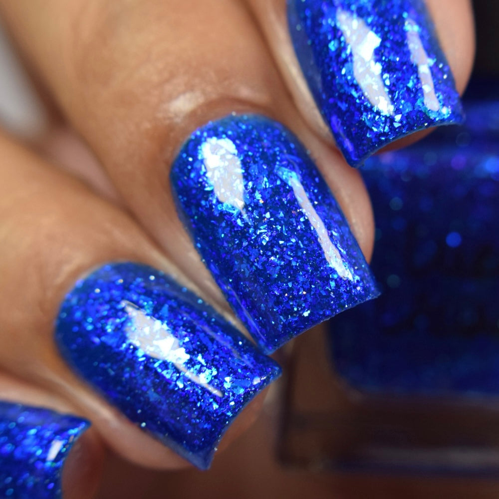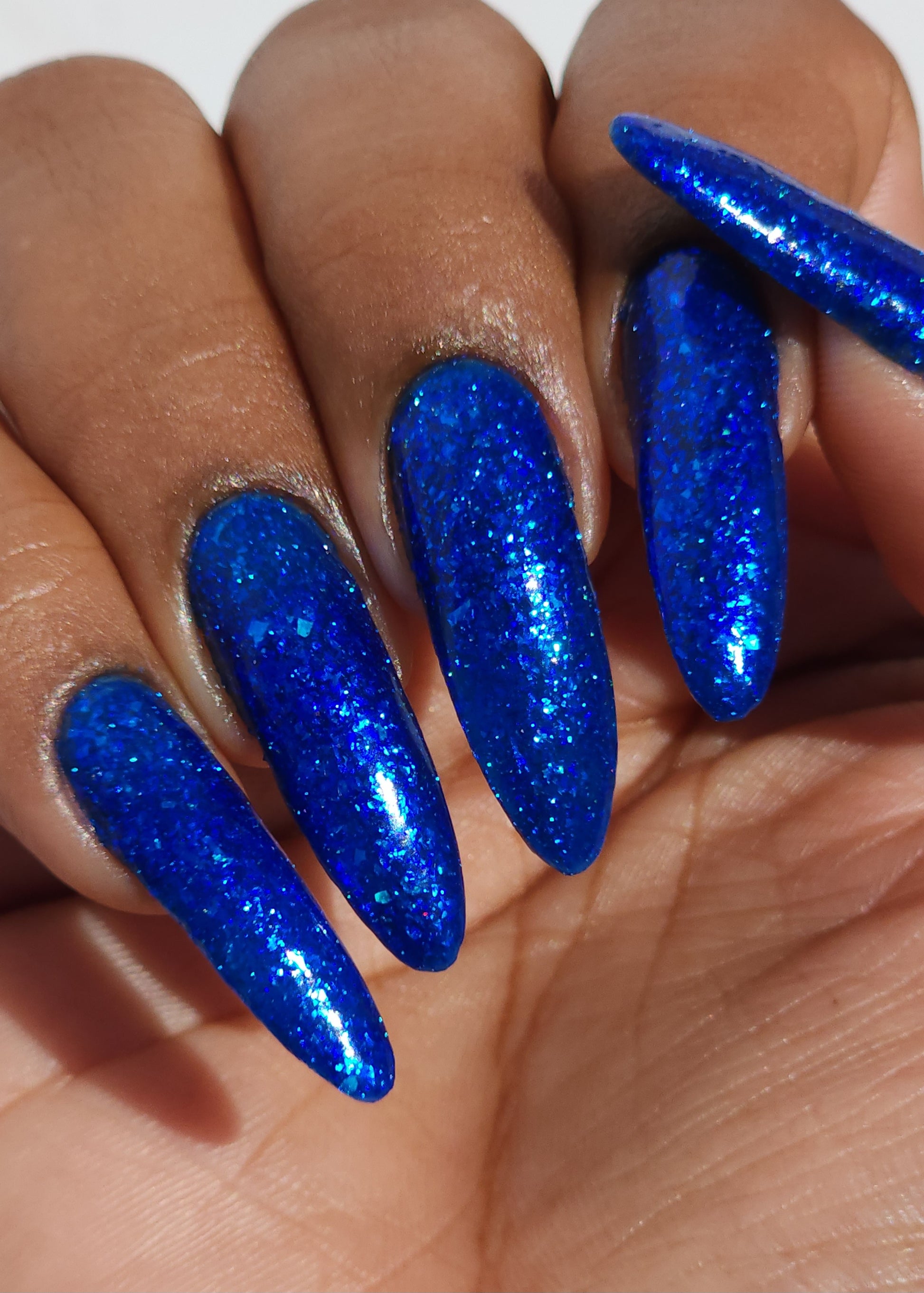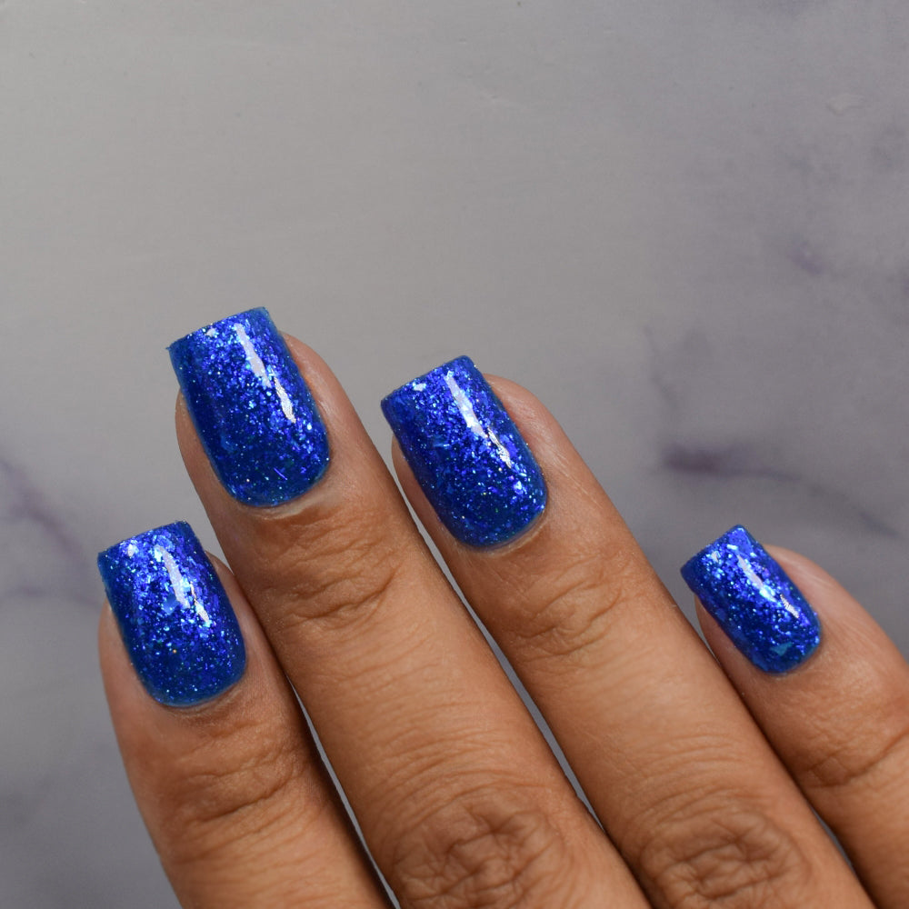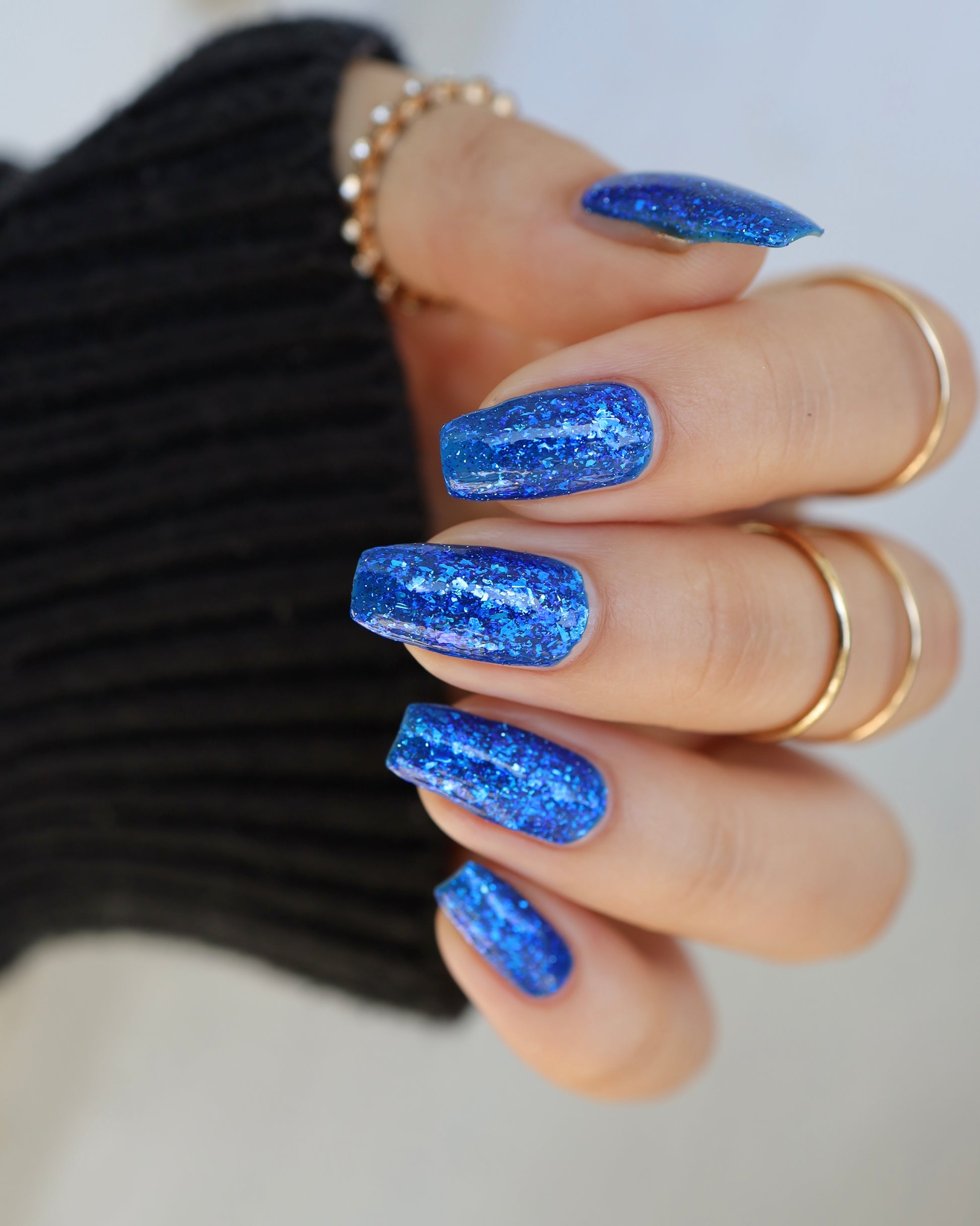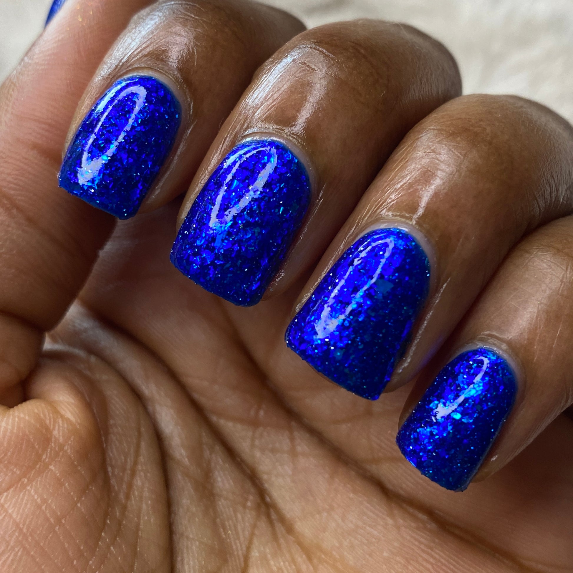 A deep blue jelly base with iridescent flakes that shift from blue to green and blue to purple, and blue light reflective glitter