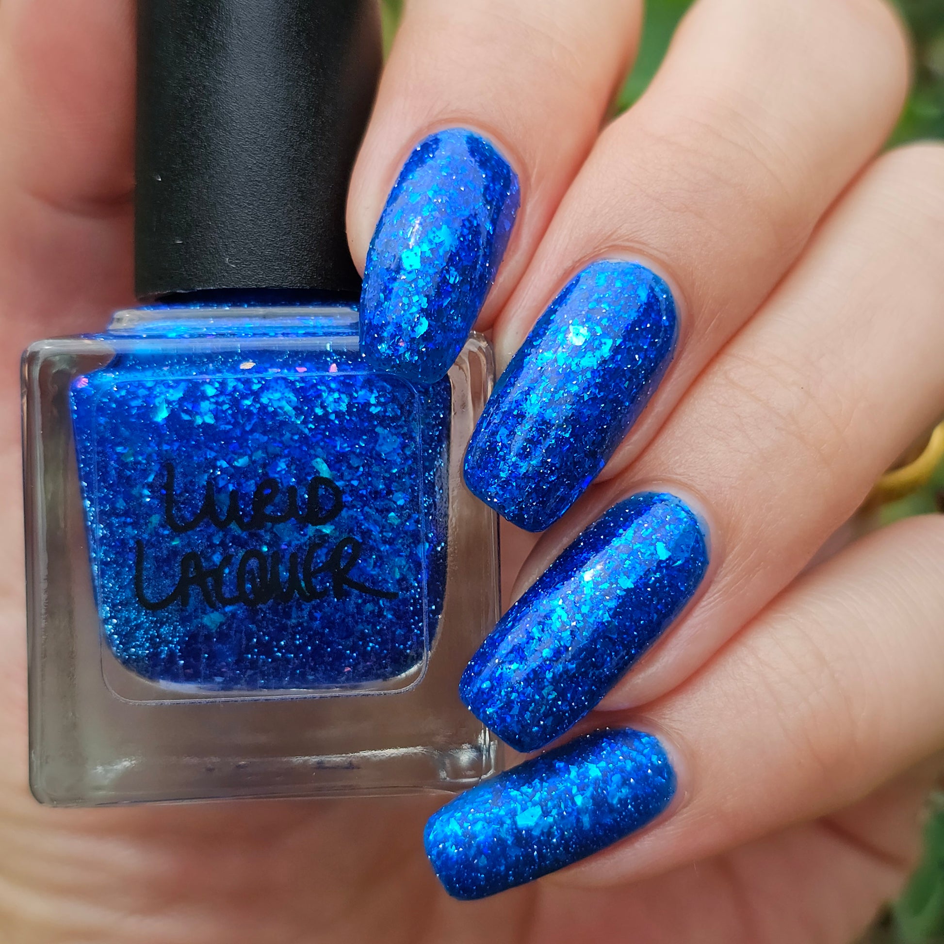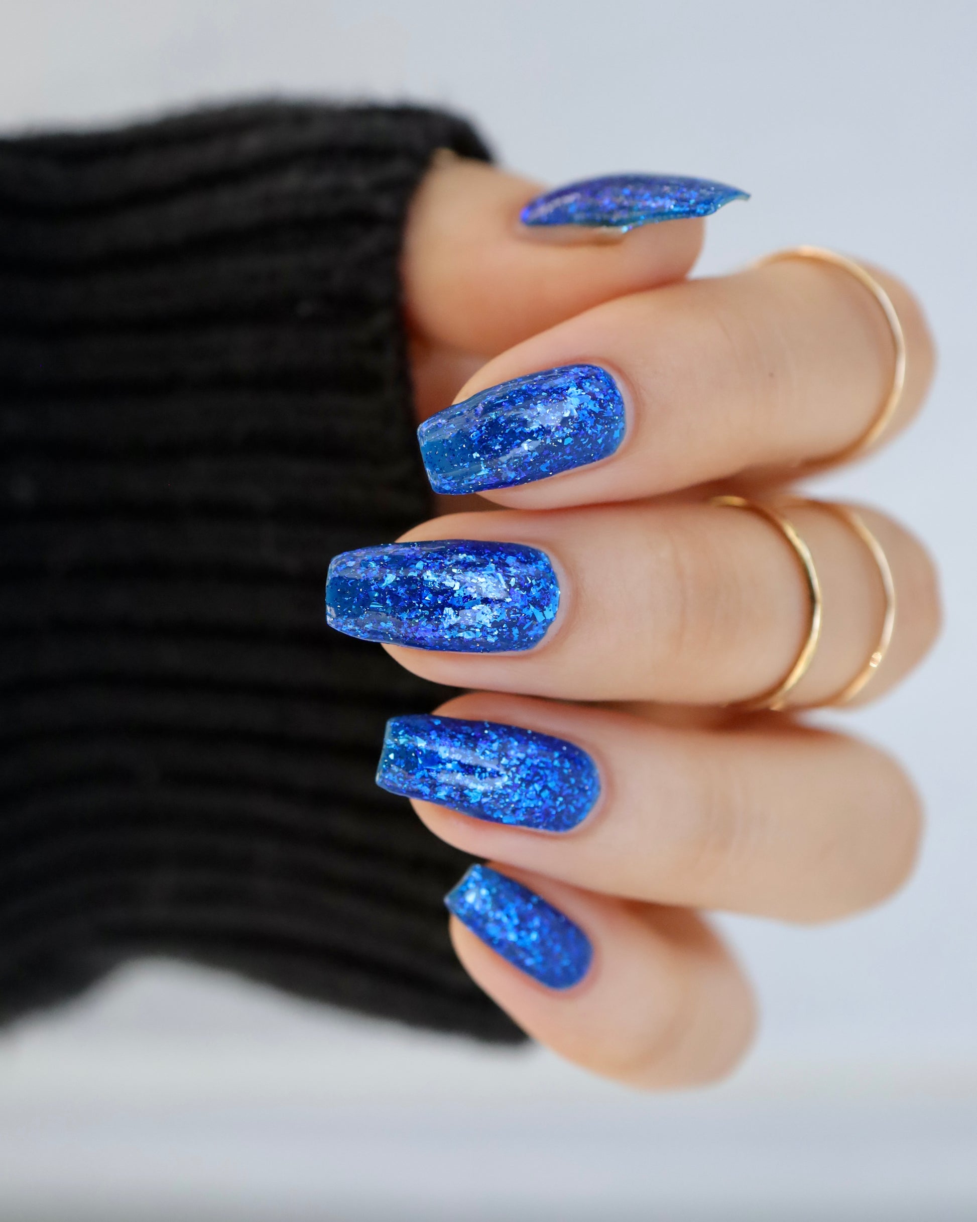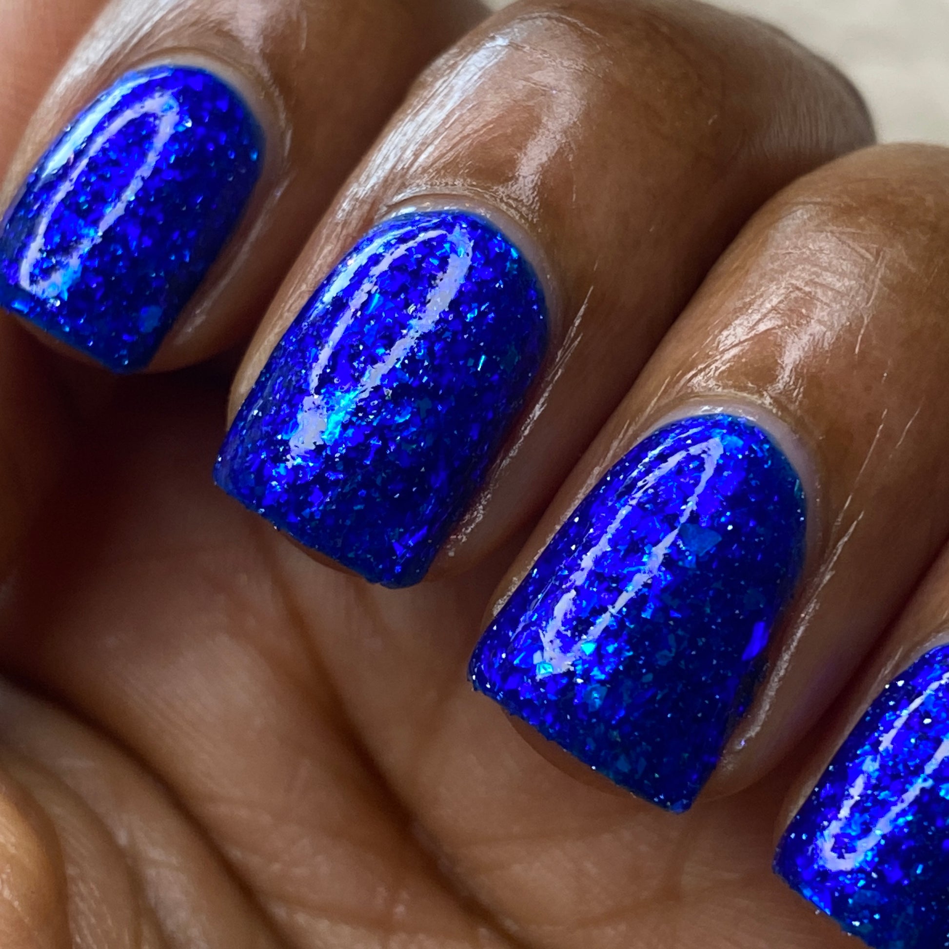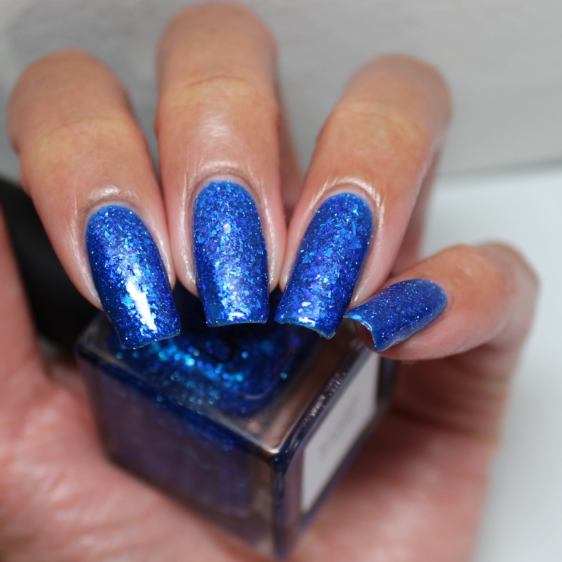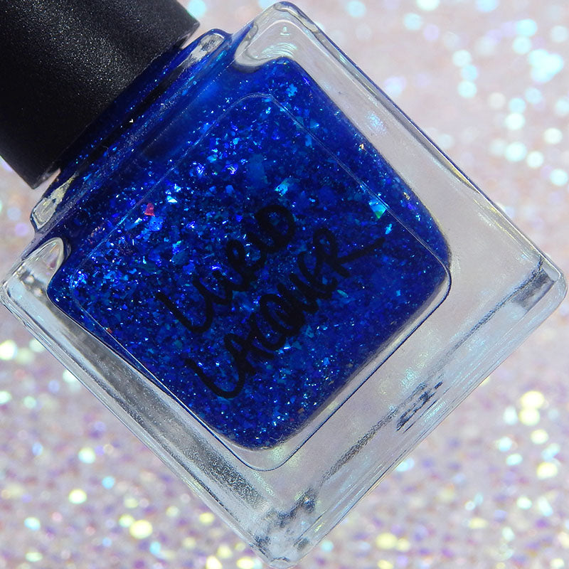 A deep blue jelly base with iridescent flakes that shift from blue to green and blue to purple, and blue light reflective glitter
