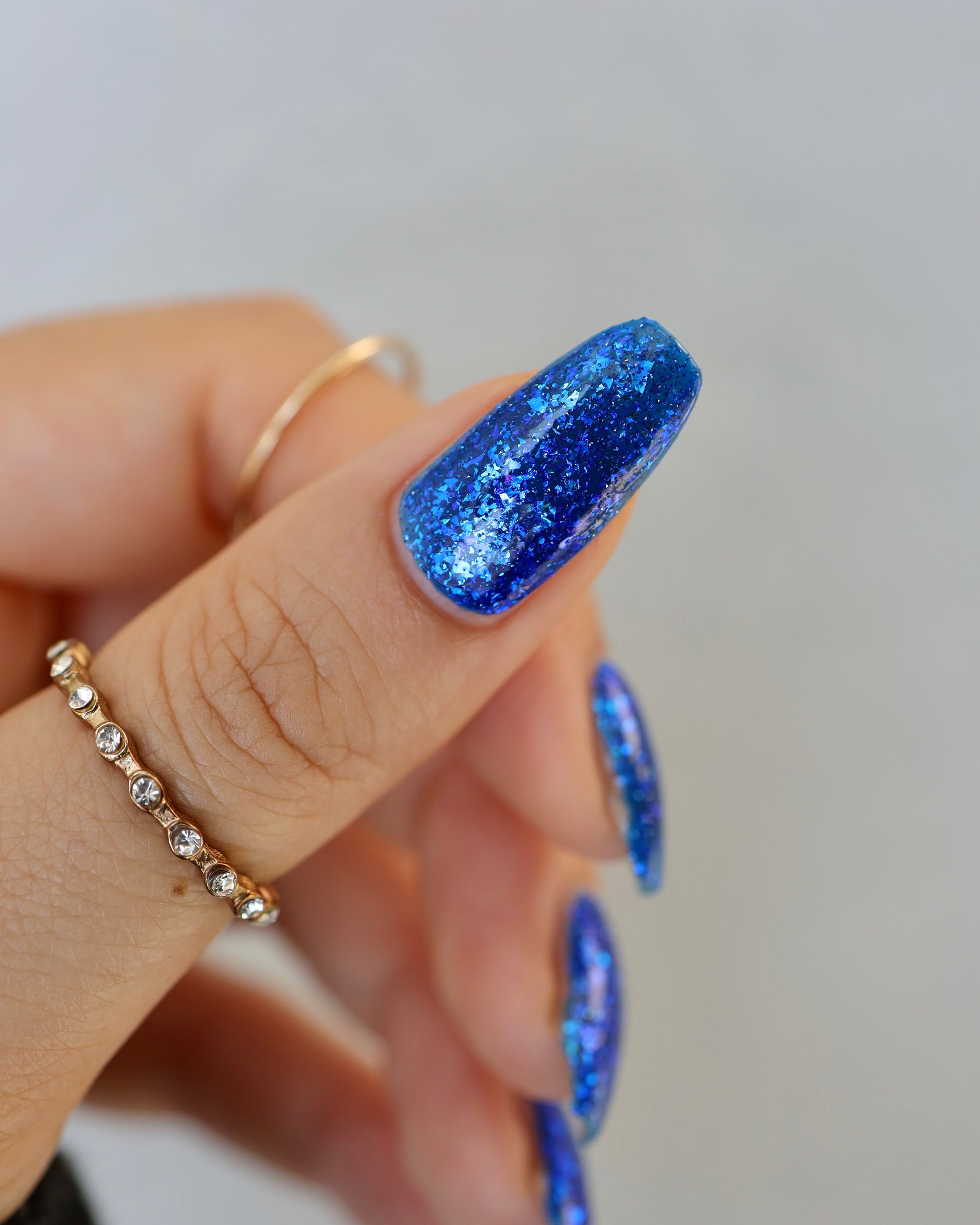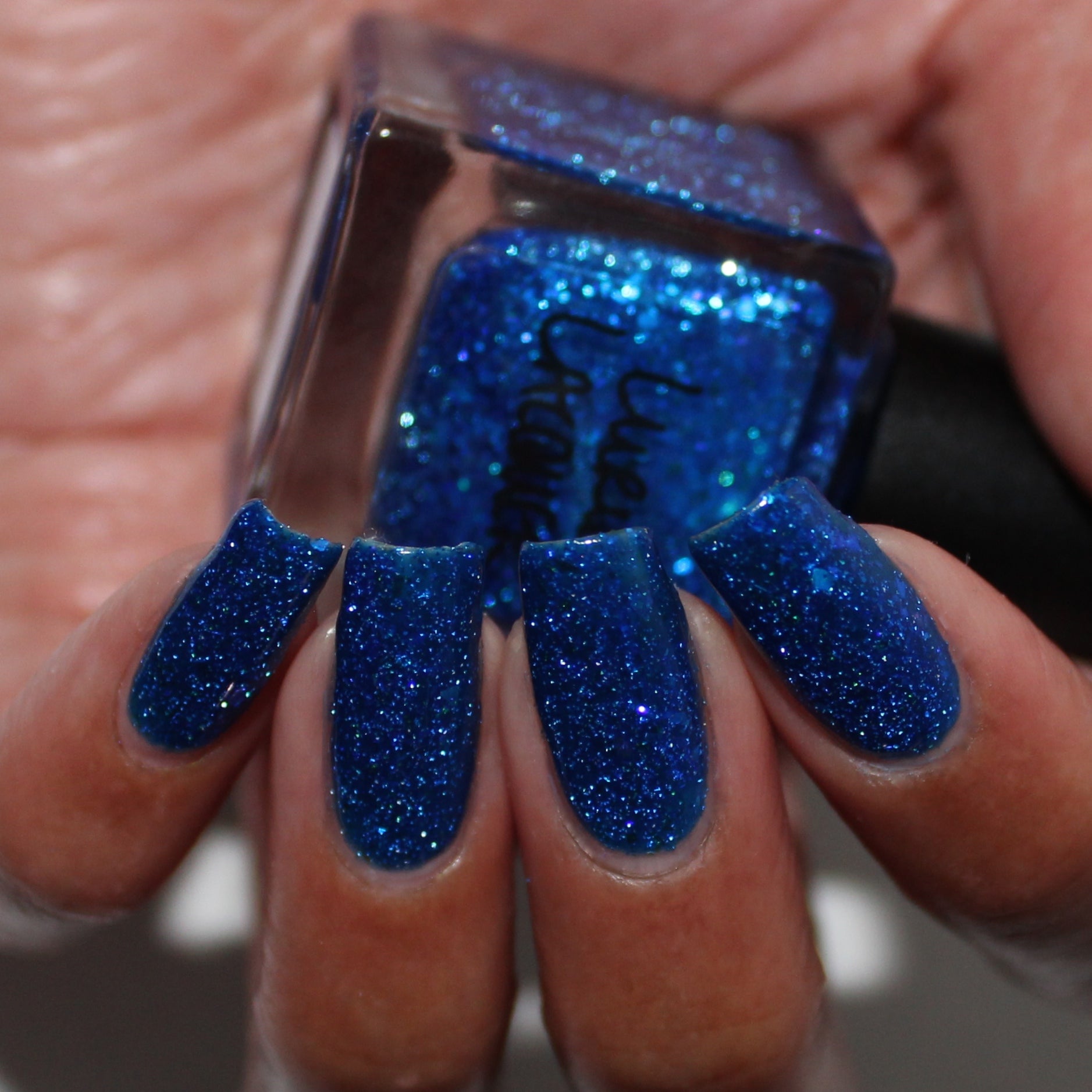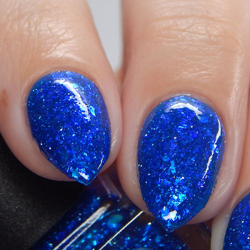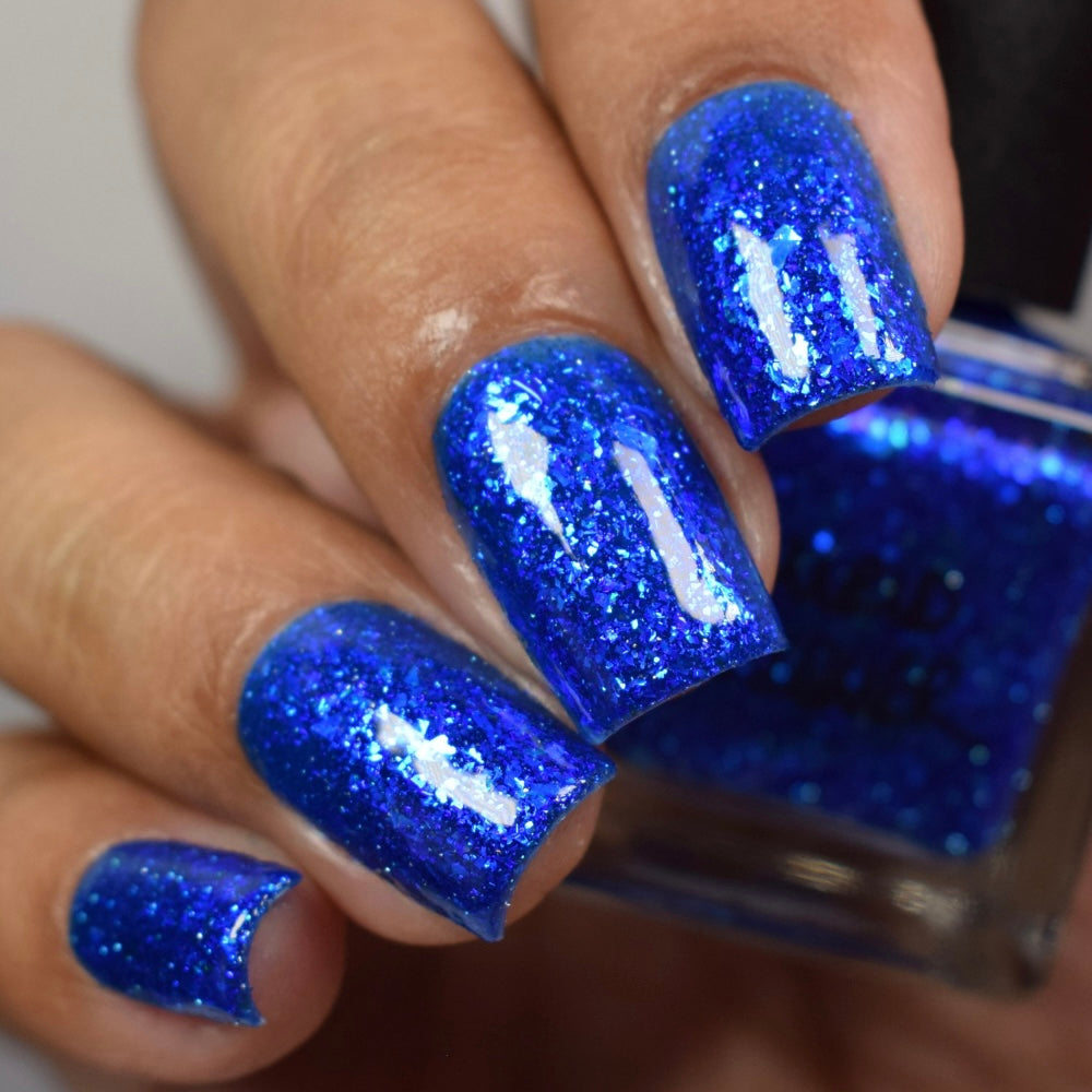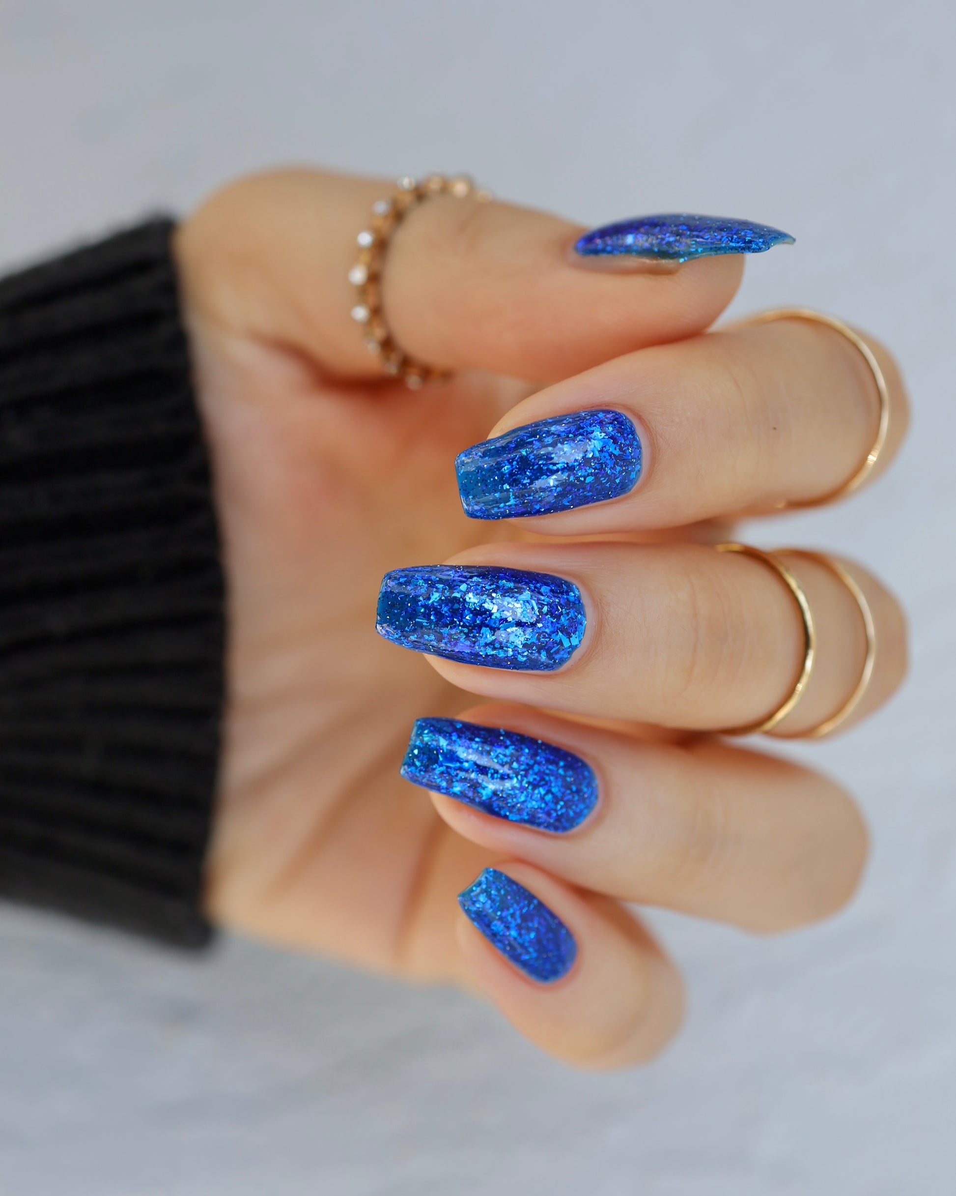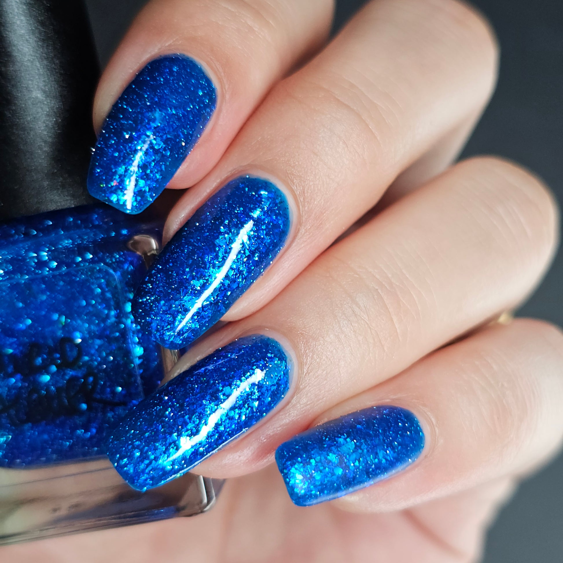 A deep blue jelly base with iridescent flakes that shift from blue to green and blue to purple, and blue light reflective glitter