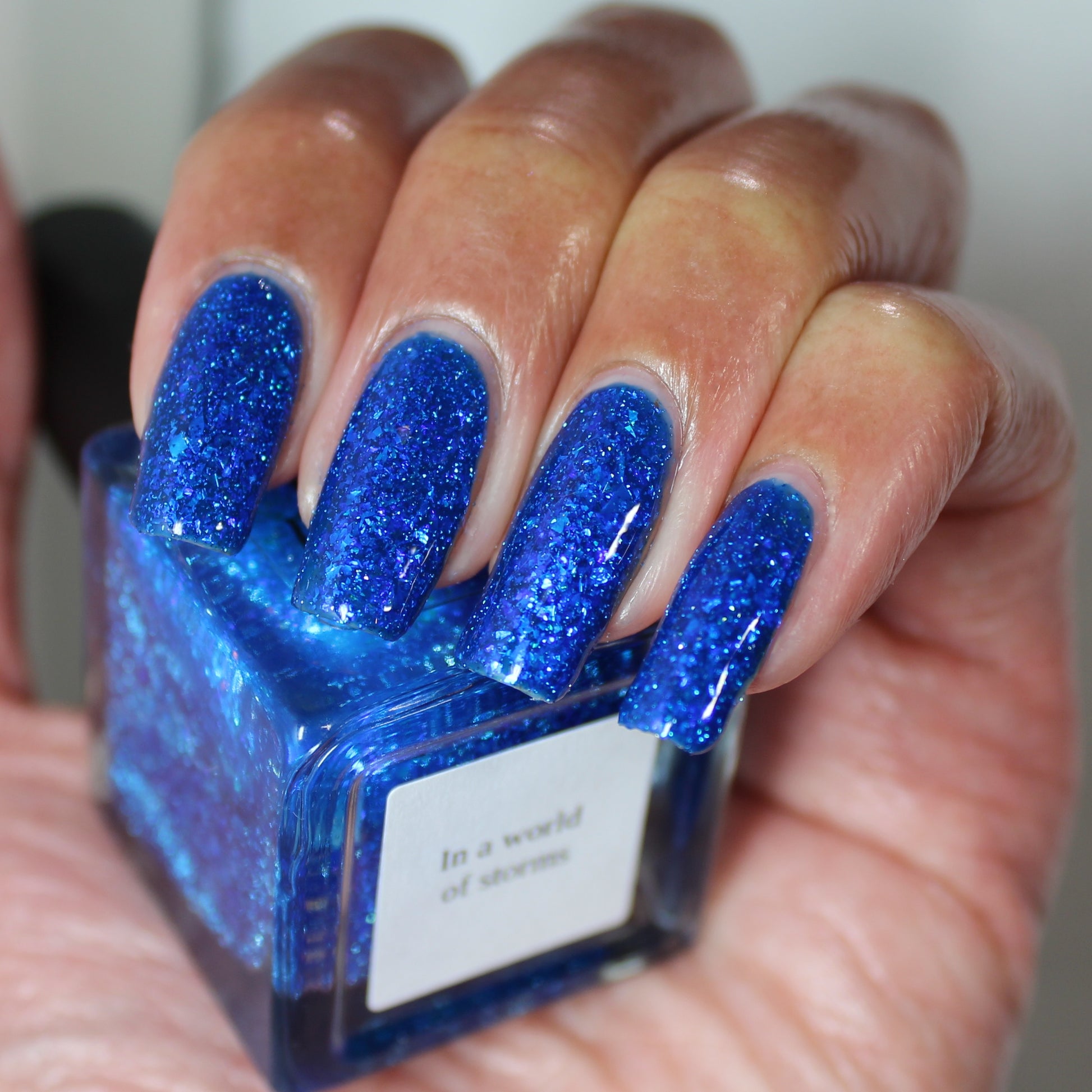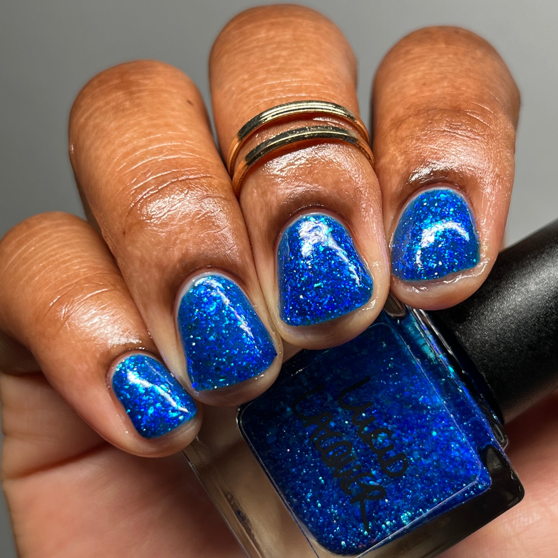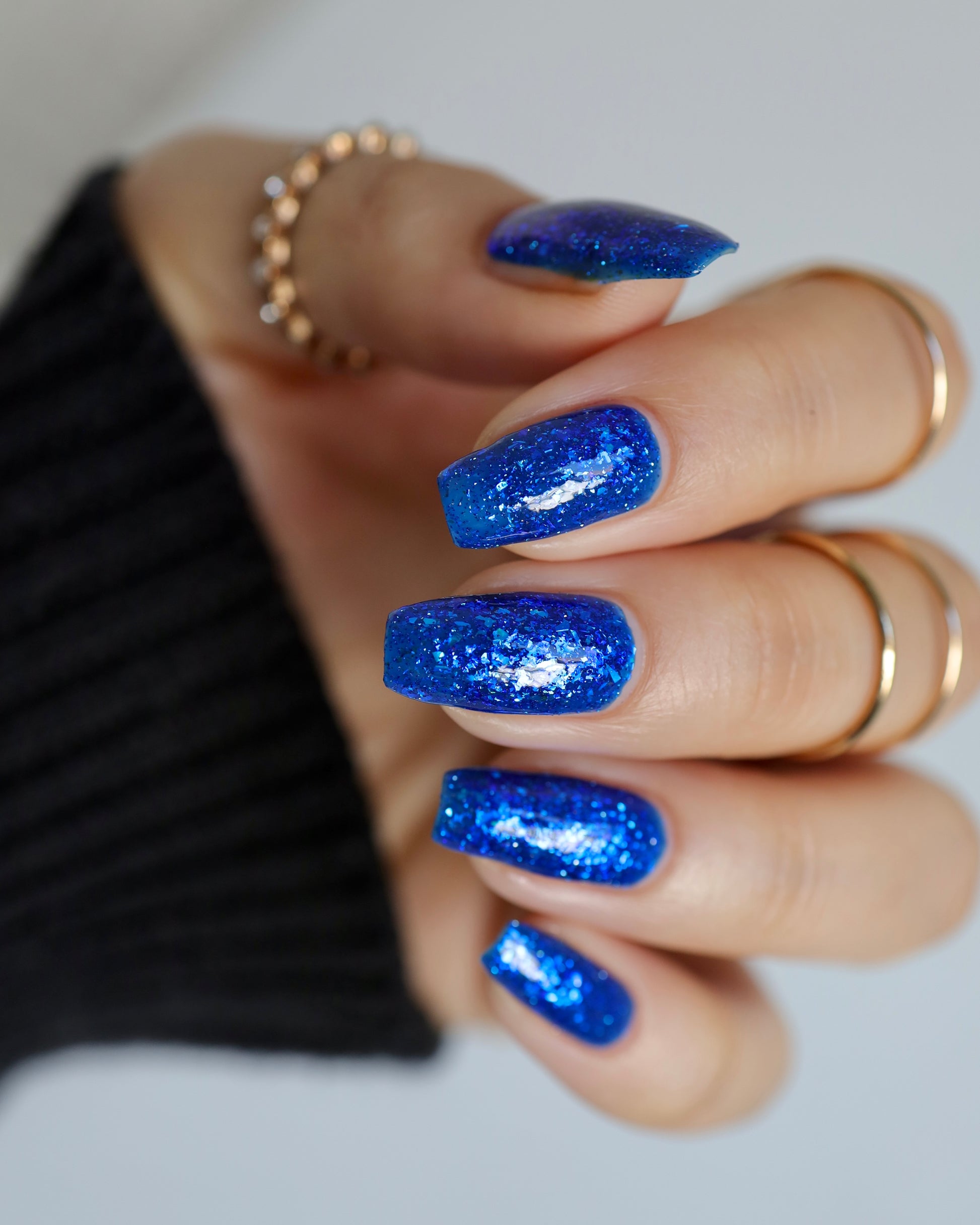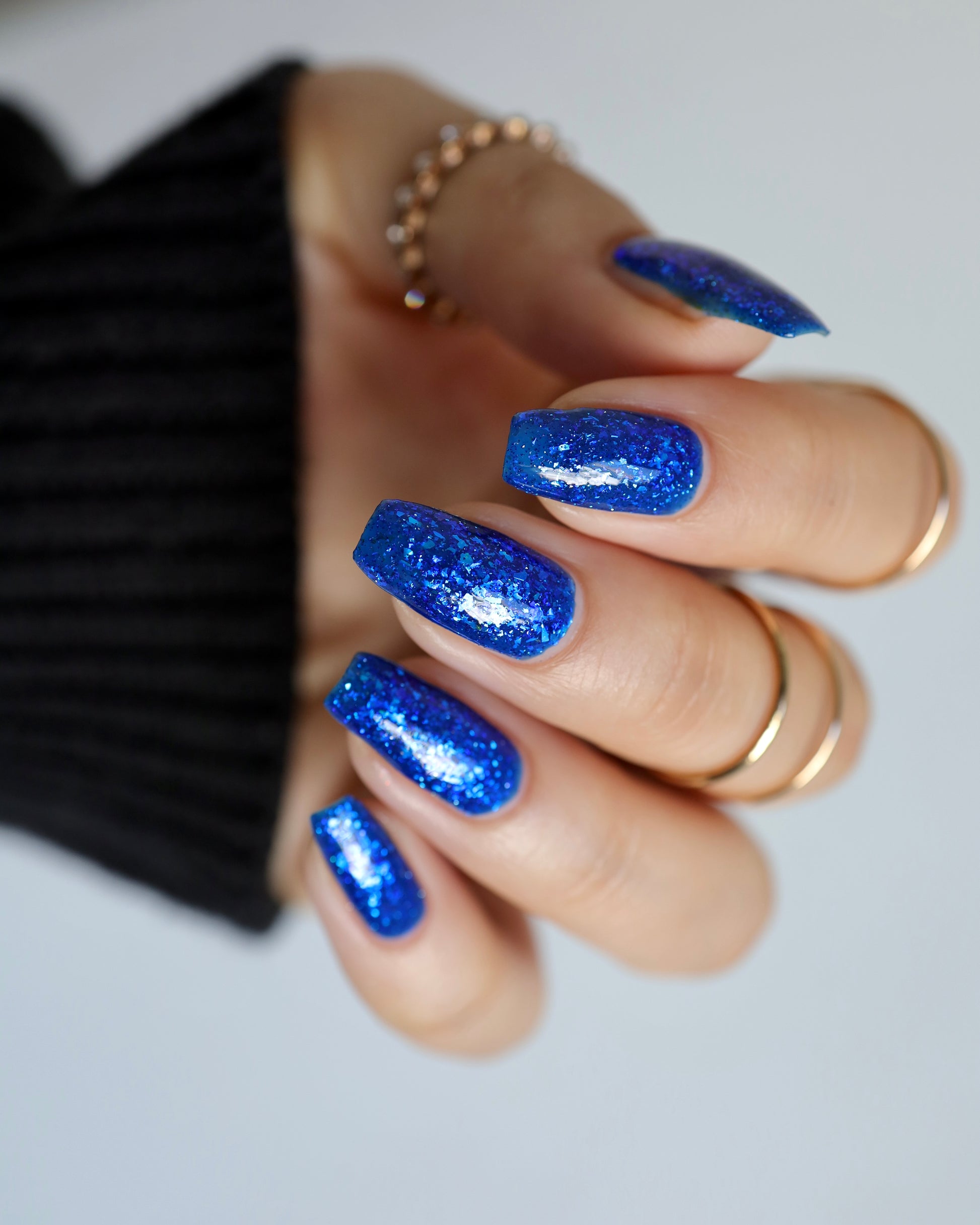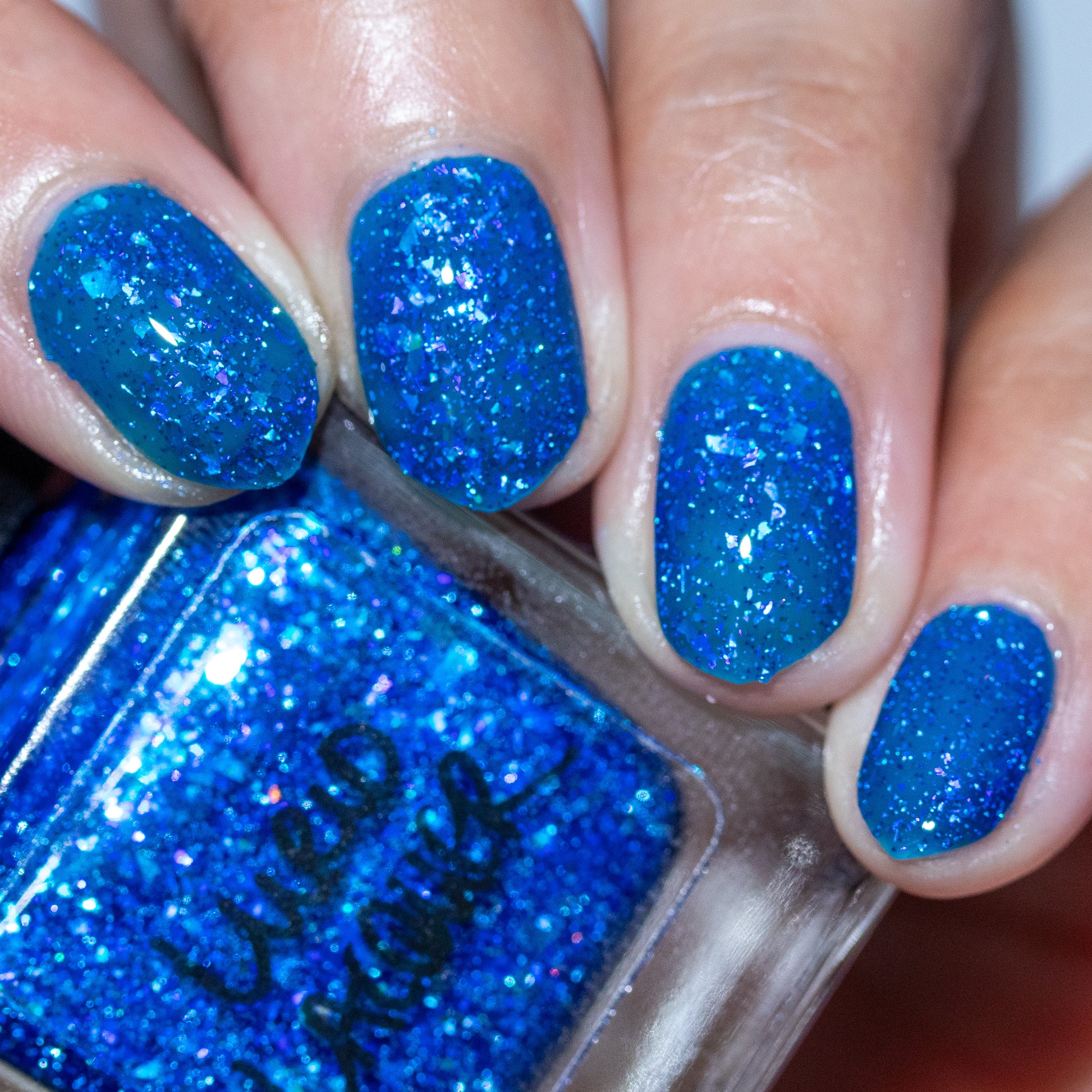 A deep blue jelly base with iridescent flakes that shift from blue to green and blue to purple, and blue light reflective glitter