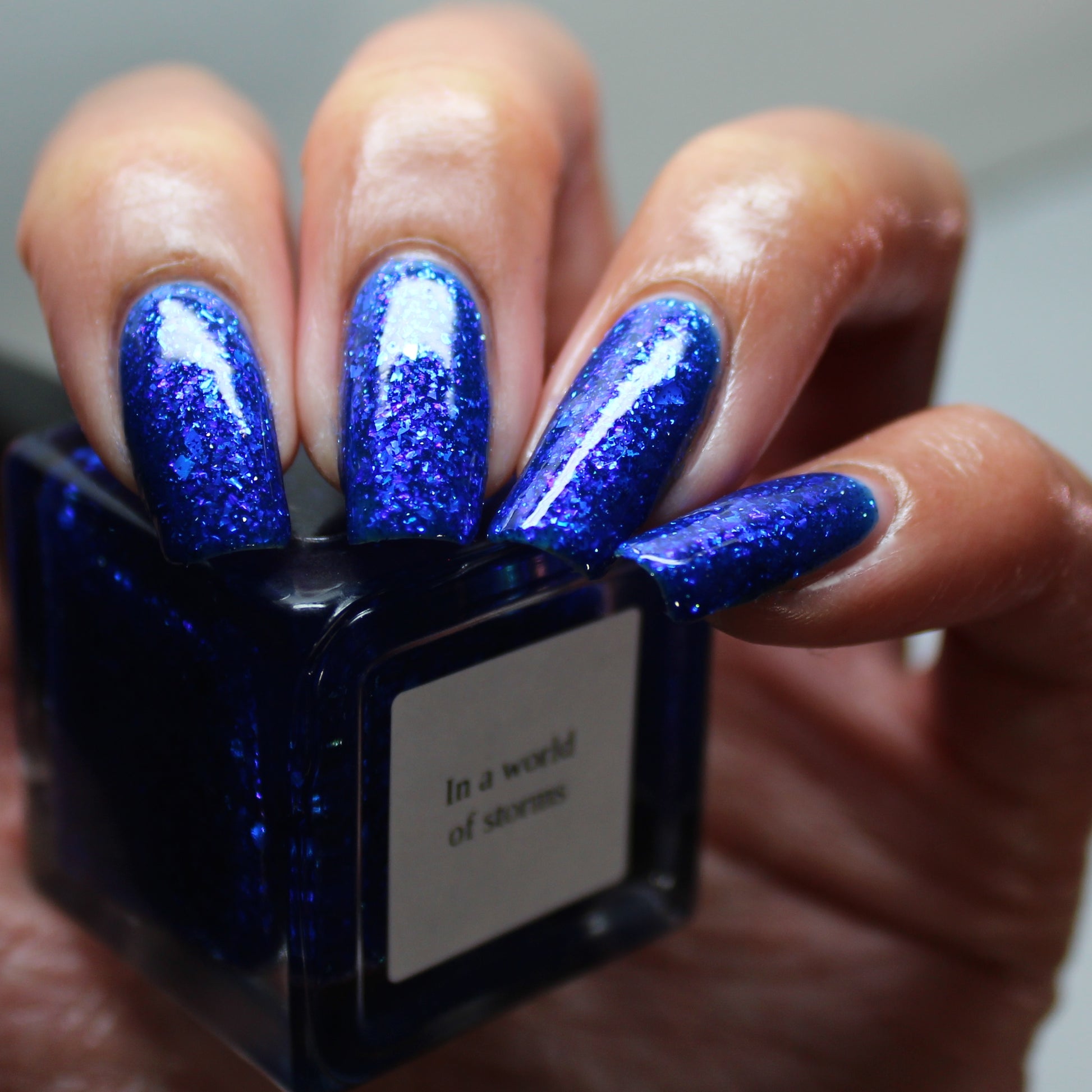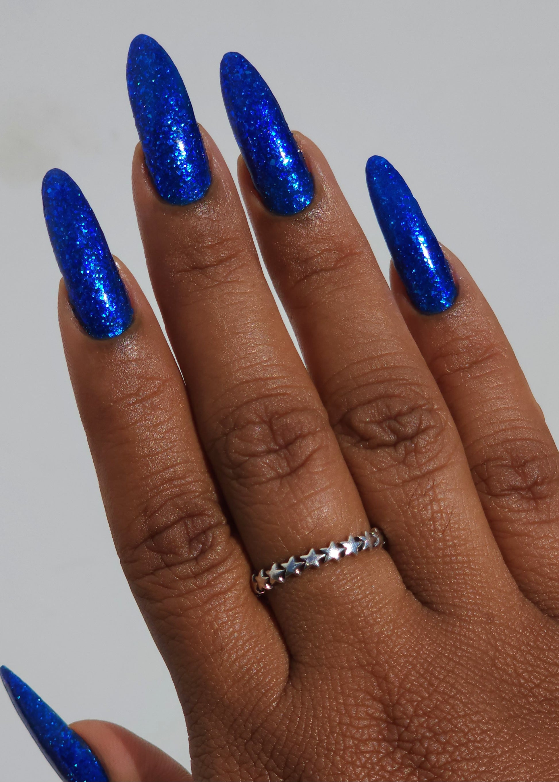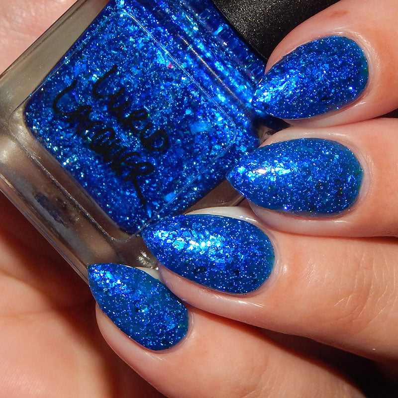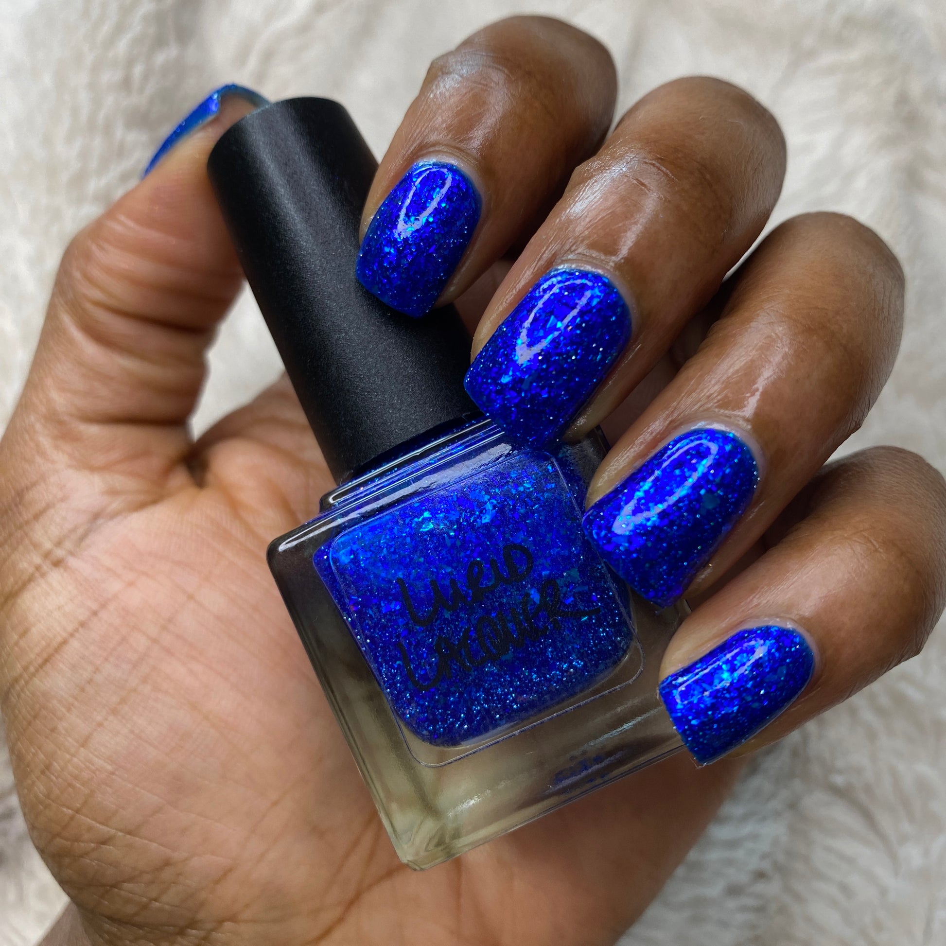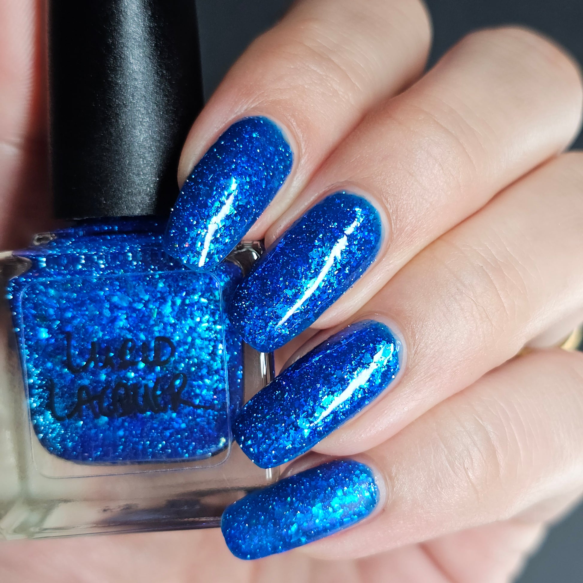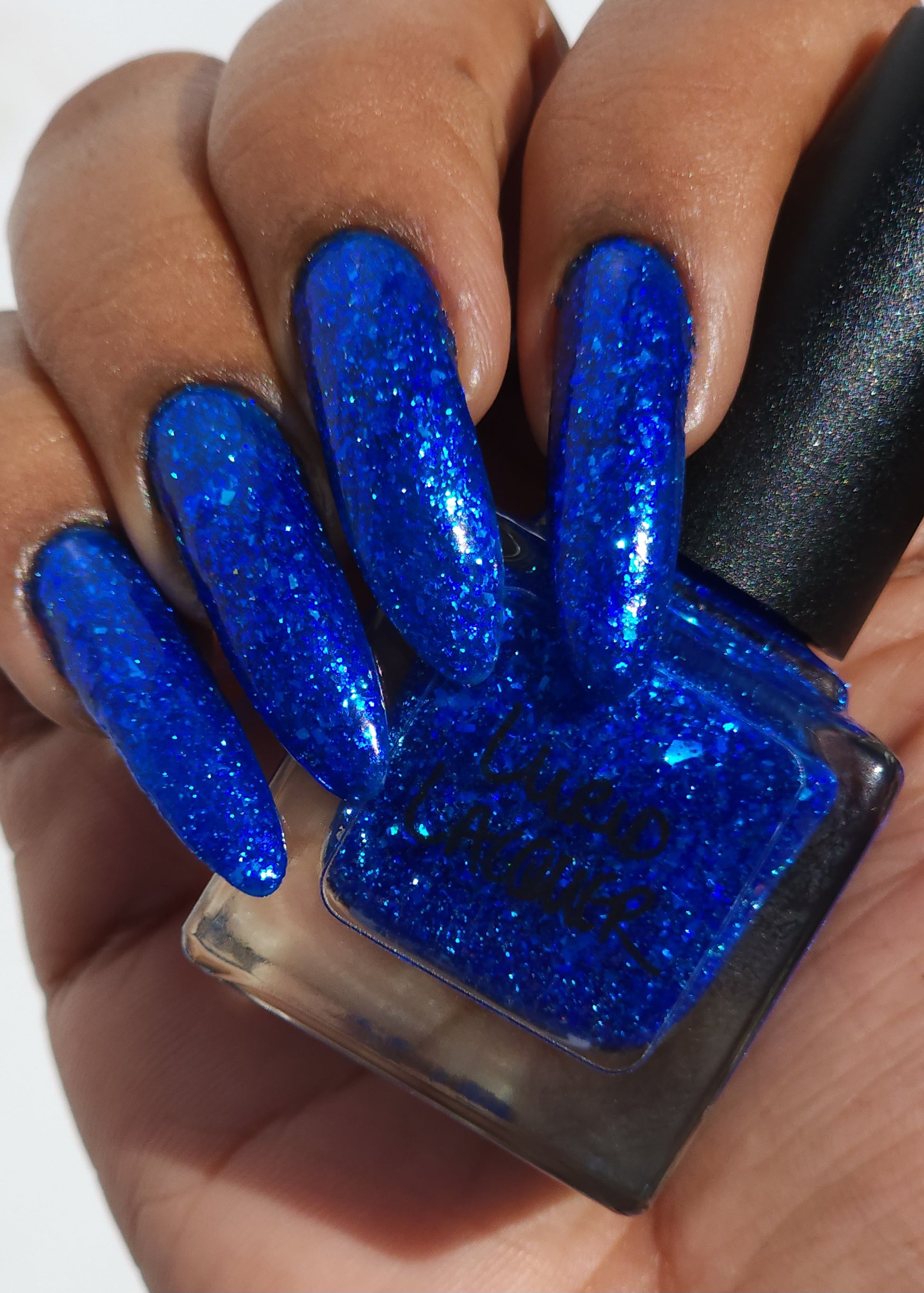 A deep blue jelly base with iridescent flakes that shift from blue to green and blue to purple, and blue light reflective glitter