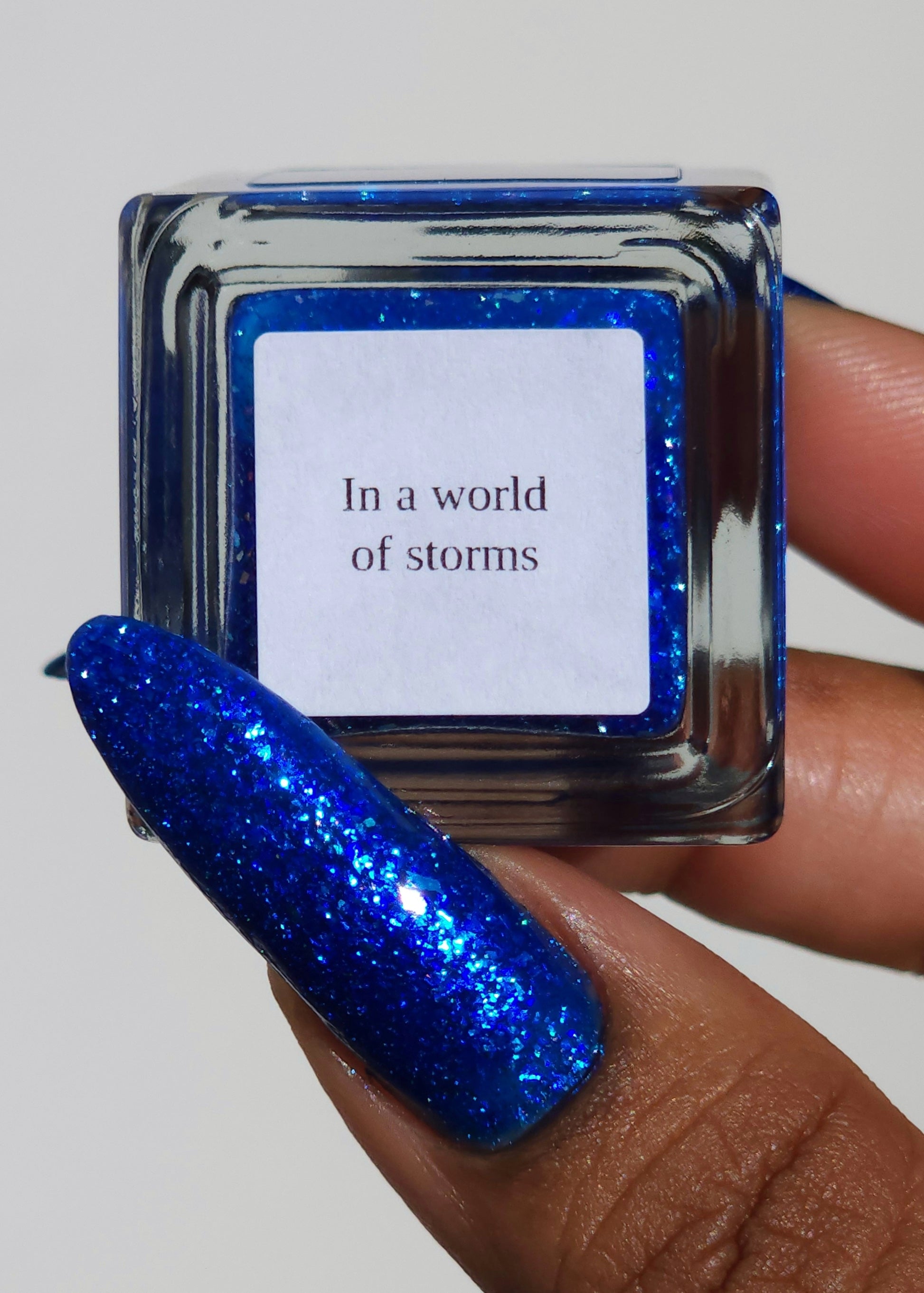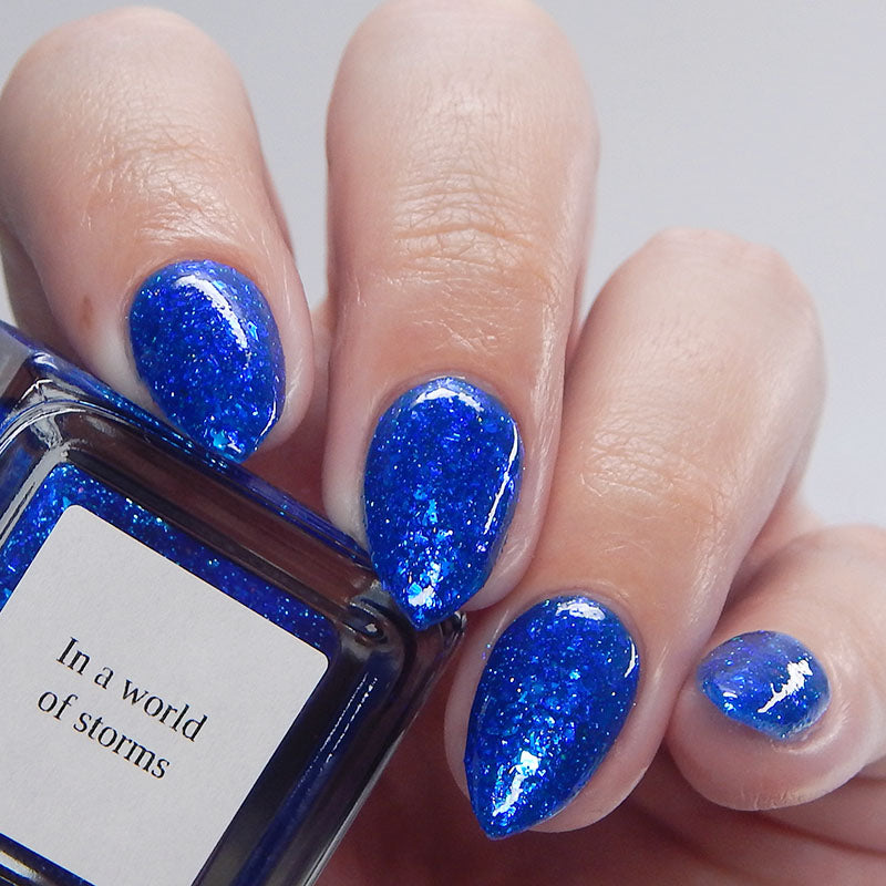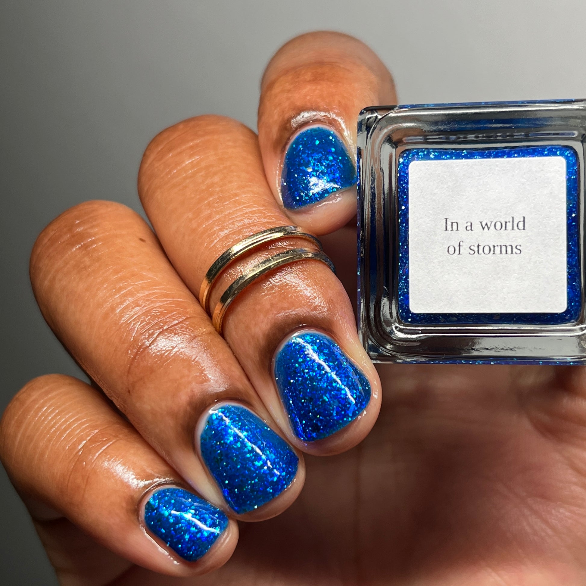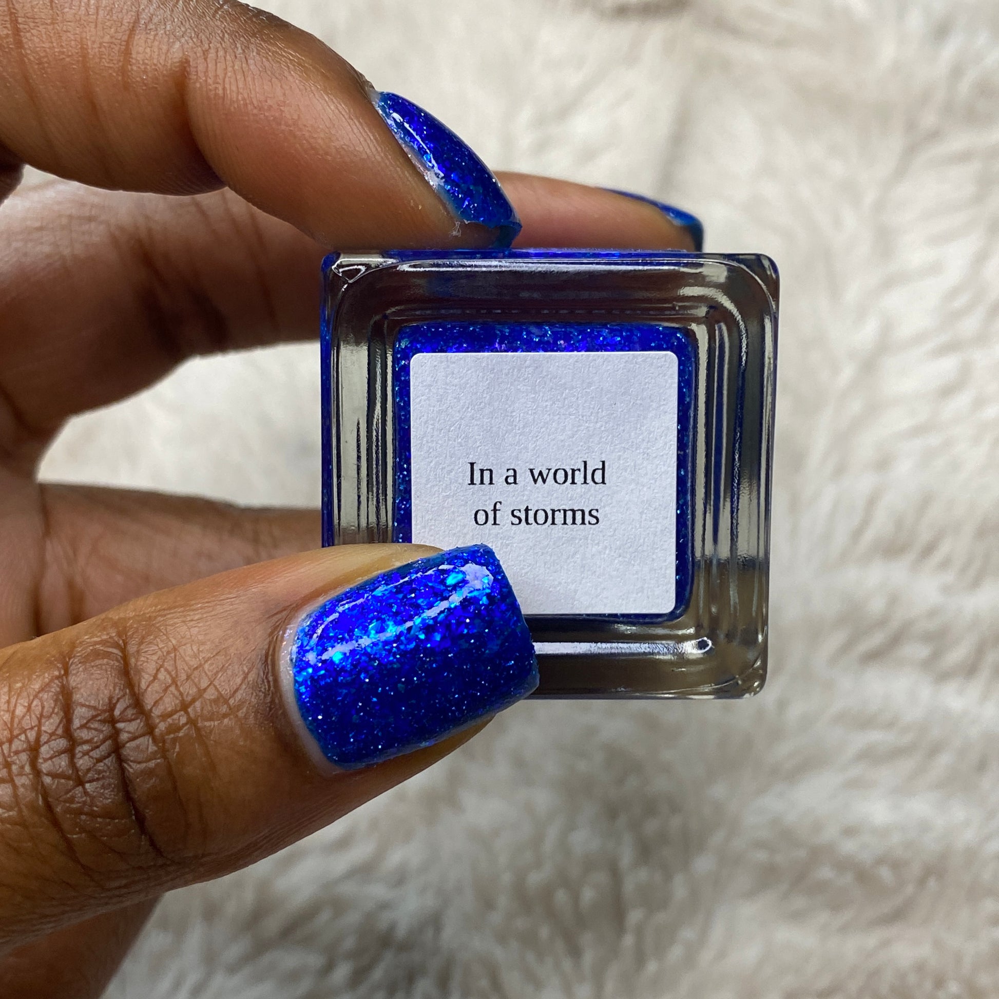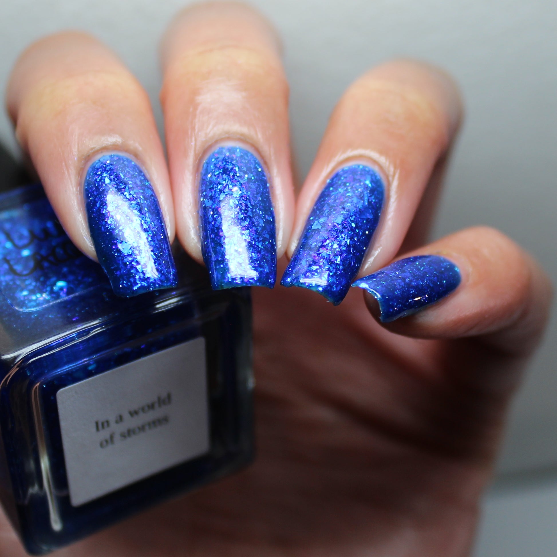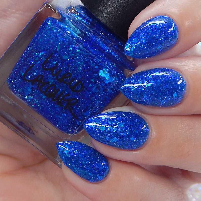 A deep blue jelly base with iridescent flakes that shift from blue to green and blue to purple, and blue light reflective glitter