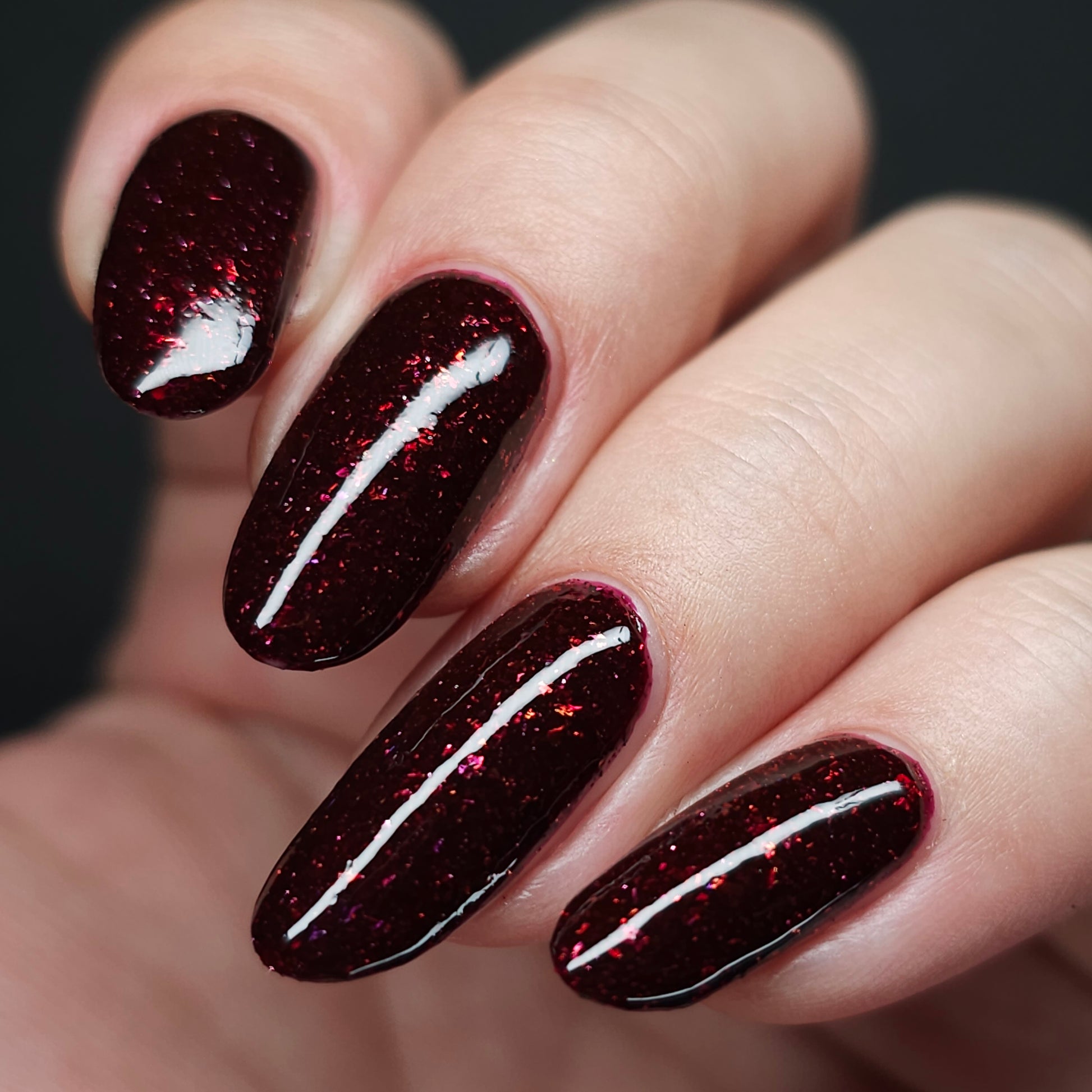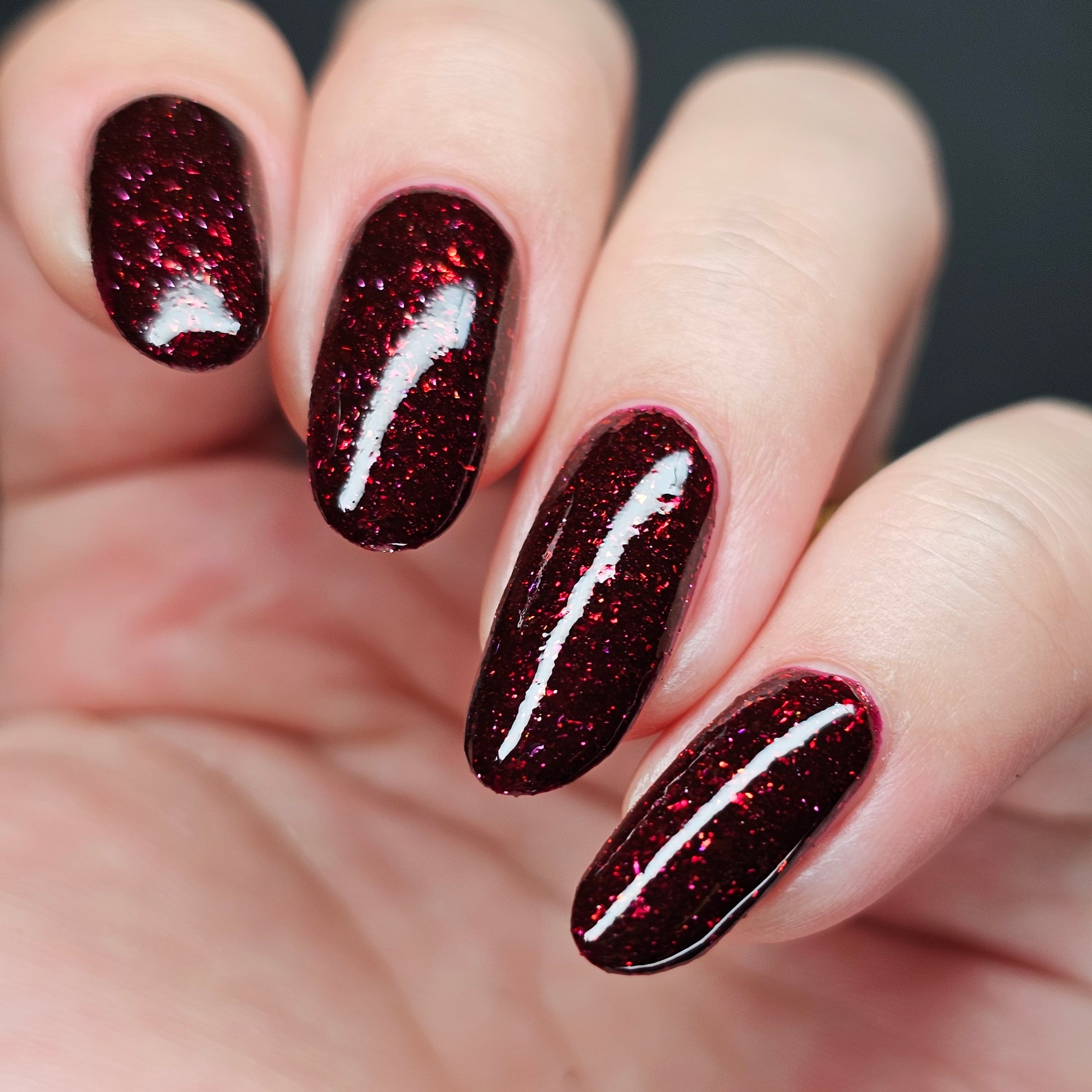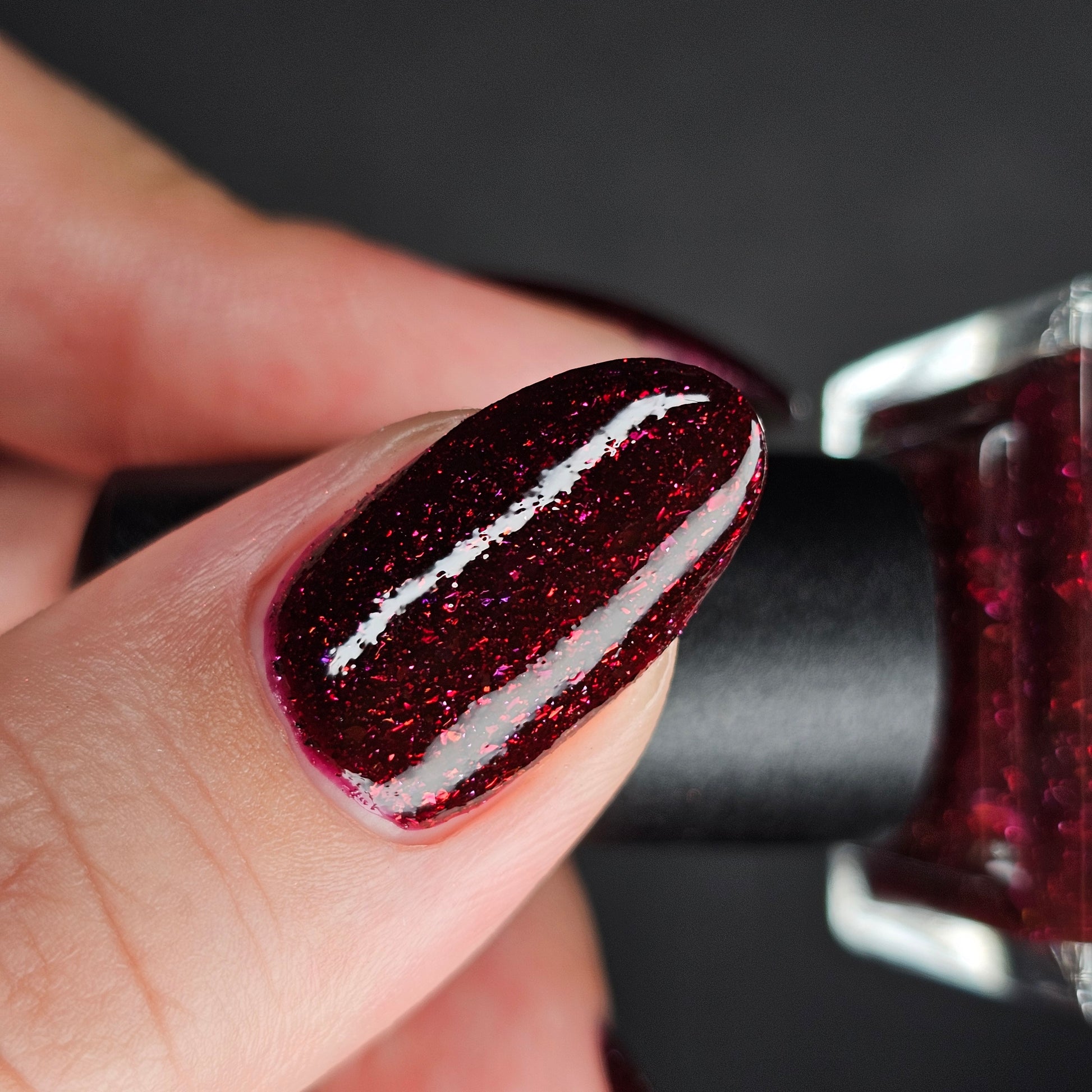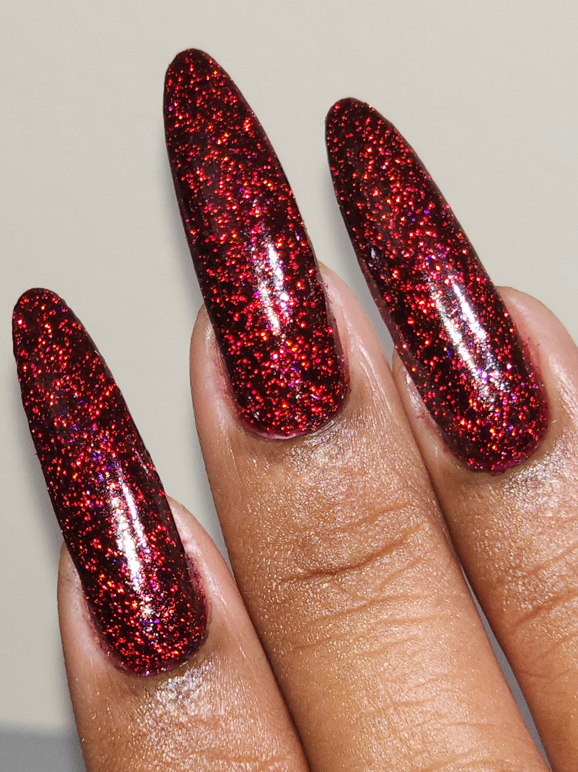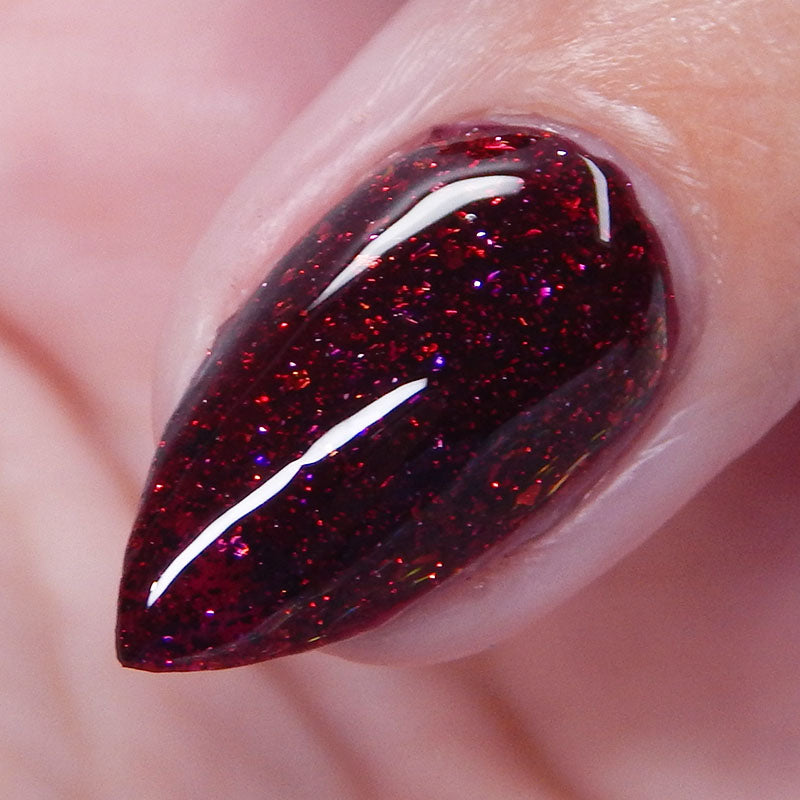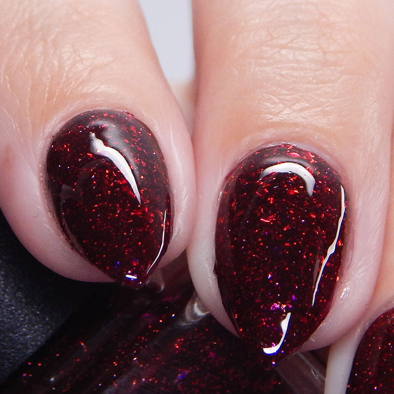 A saturated cool red base with black to red multichrome flakes and red light reflective glitter