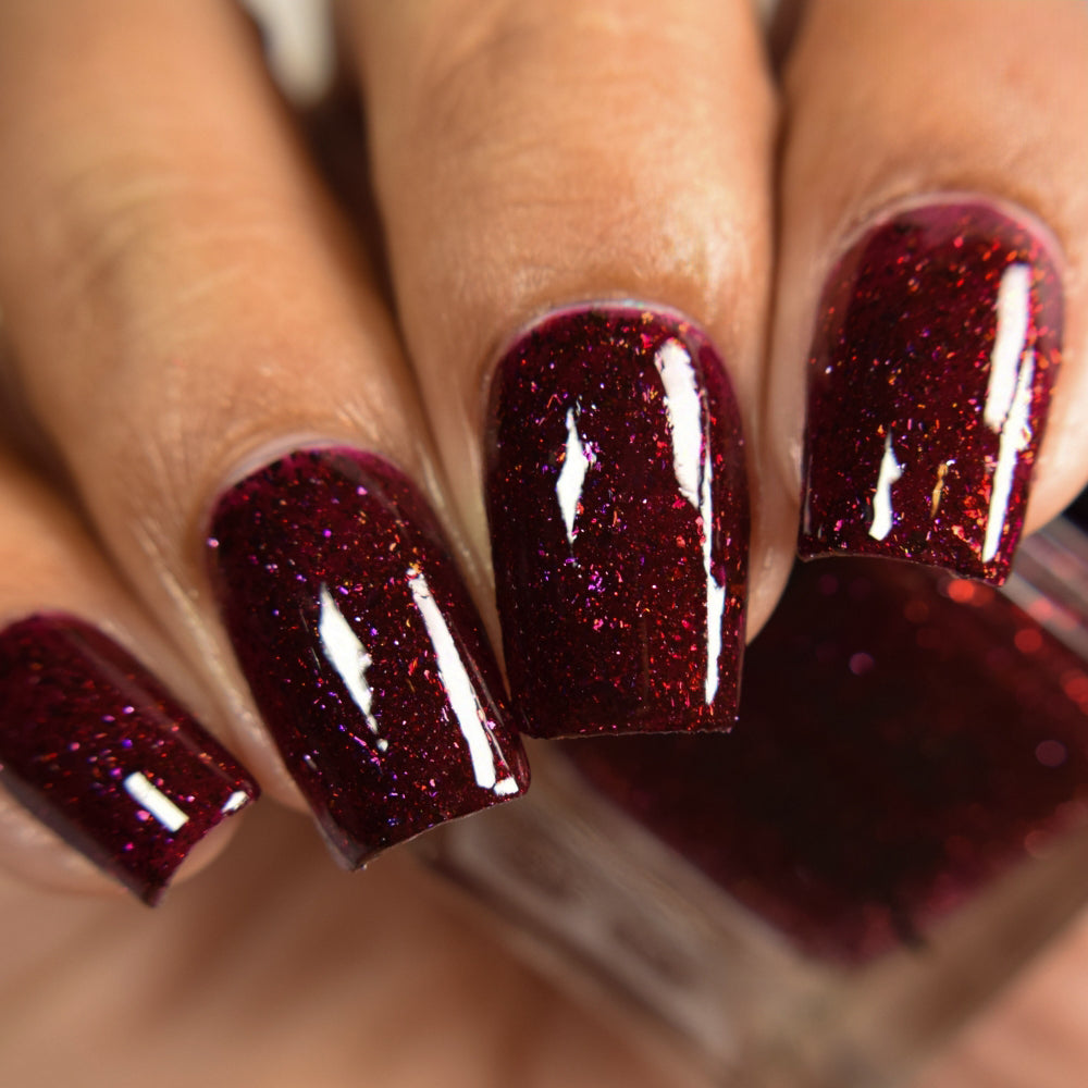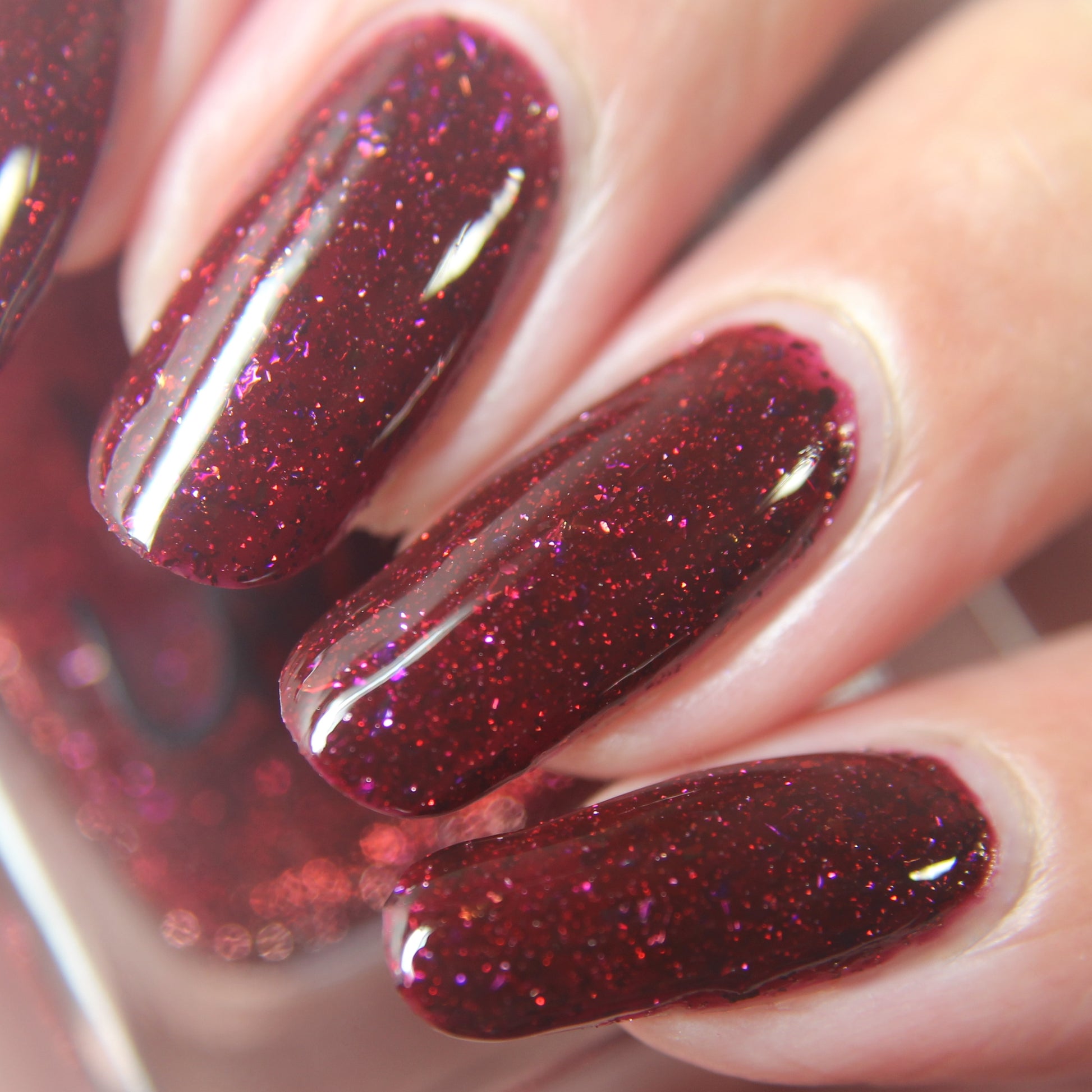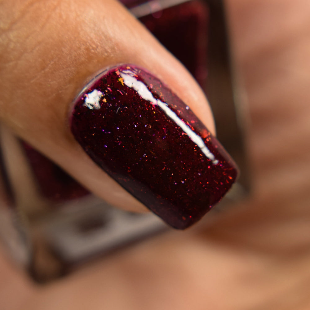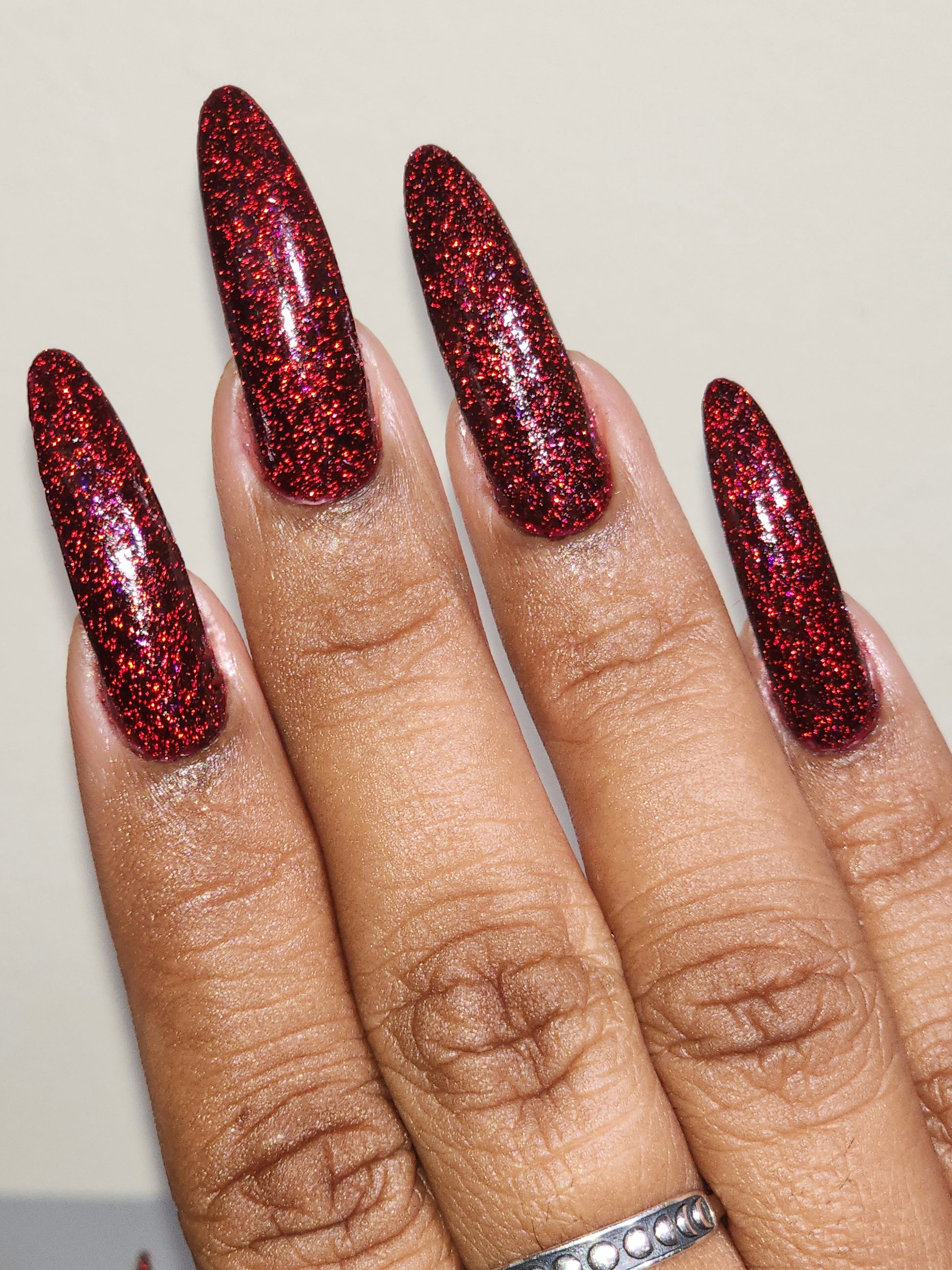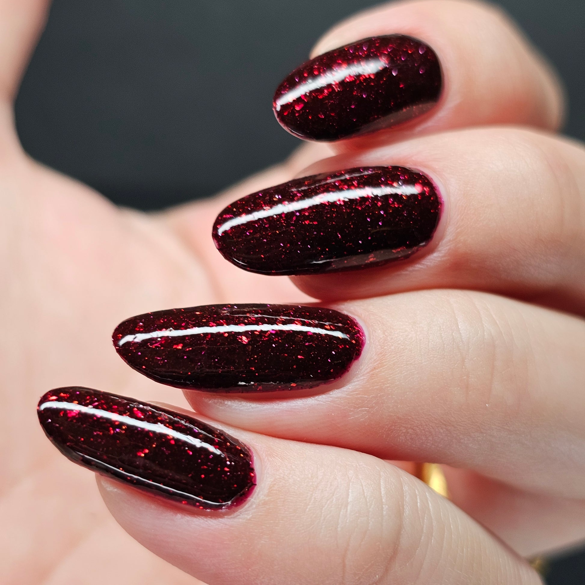 A saturated cool red base with black to red multichrome flakes and red light reflective glitter